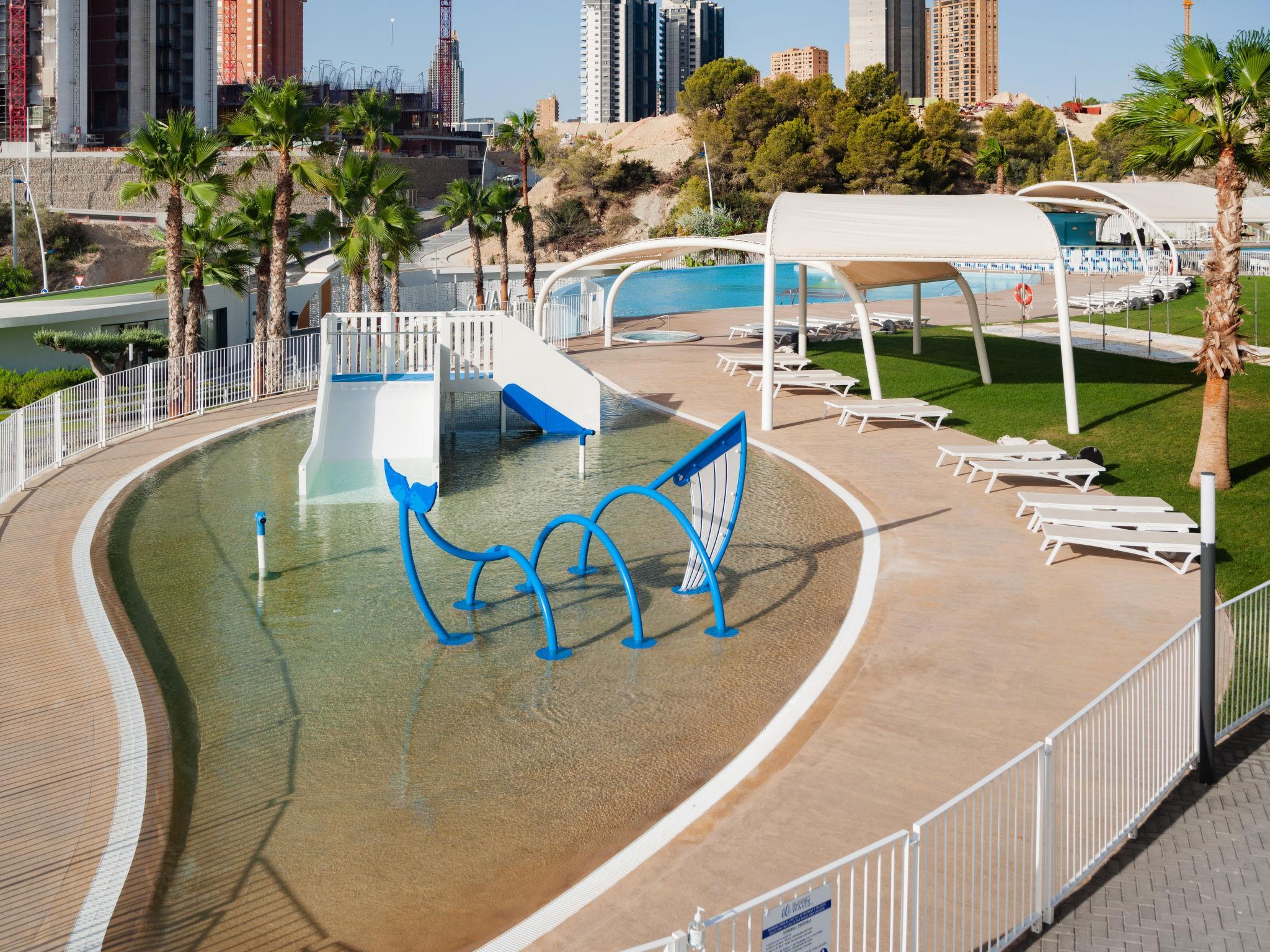 Playa Poniente: Sehr modernes Appartementhaus "Sunset waves", Baujahr 2021. Im Ort, 400 m vom Zentrum von Benidorm, sonnige Lage, 200 m vom Meer, 200 m vom Strand. Zur Mitbenutzung: grosser terrassierter Garten mit Rasen und Bäumen, Schwimmbad (15 x 25 m, 50 - 200 cm tief, saisonale Verfügbarkeit: 01.Jan. - 31.Dez.). Ungleichmässige Schwimmbadform Dusche/WC im Poolbereich, Kinderspielplatz. Im Hause: Fahrstuhl. Parkplatz auf dem Grundstück. Supermarkt, Bar, Bushaltestelle 300 m. Nahe gelegene Sehenswürdigkeiten: Aqualandia 6 km, Mundomar 6 km, Terra Mitica 4 km, Terra Natura 4 km, Alicante 45 km, Aeropuerto Alicante 58 km. Jugendgruppen nur auf Anfrage. Die Nachbarschaft ist sehr lärmempfindlich. Ruhe und gutes Benehmen wird erwartet.