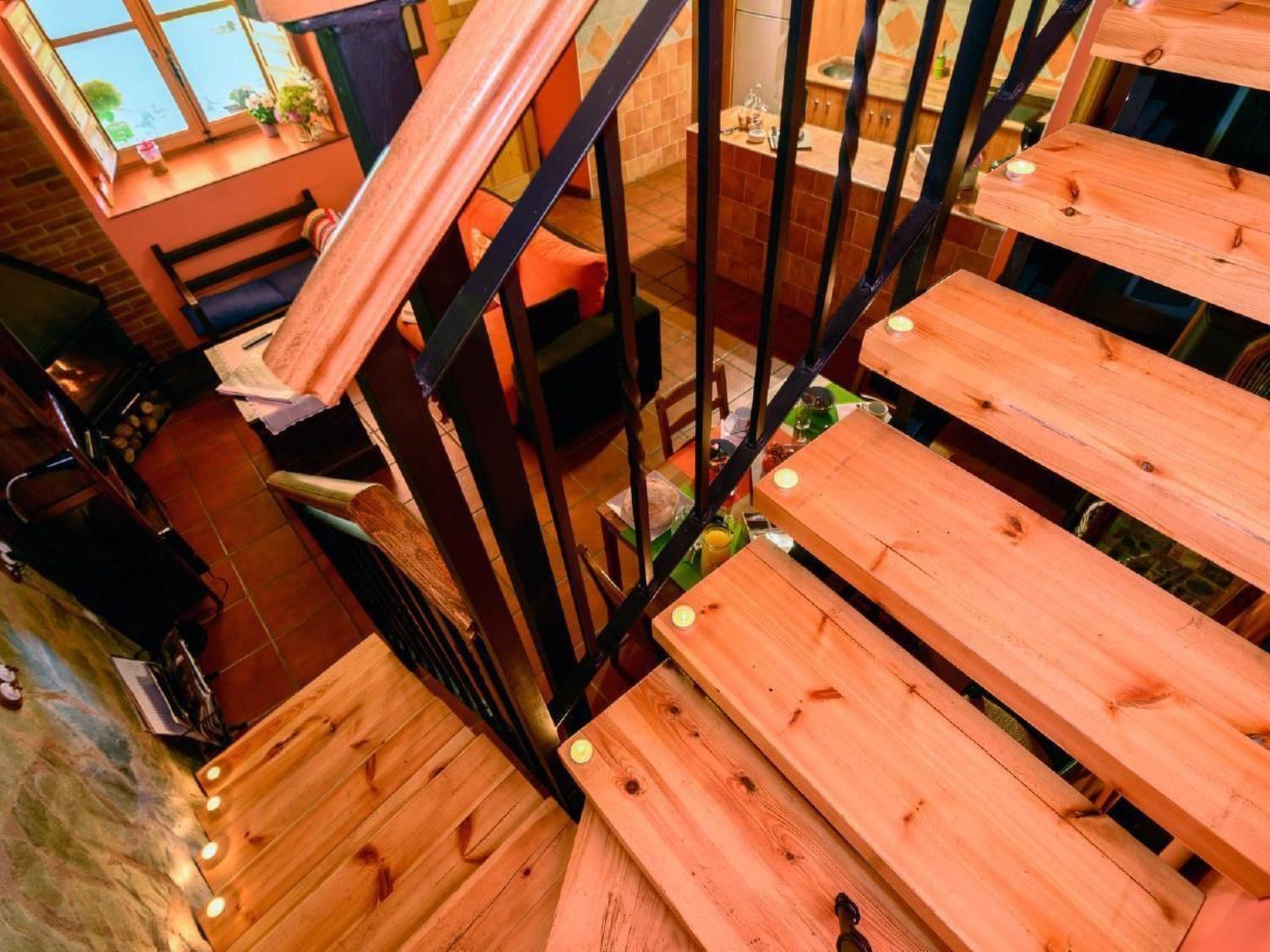 Die Küche verfügt über Waschmaschine, Kühlschrank, Herd, Dunstabzugshaube, Mikrowelle, Toaster, Entsafter, Kaffeemaschine und alle Utensilien für einen komfortablen Aufenthalt. Das Wohnzimmer verfügt über ein großes, komfortables Sofa und einen Kamin, von wo aus Sie eine Treppe aus Schmiedeeisen und Holz nutzen können, die Zugang zum Obergeschoss bietet.
