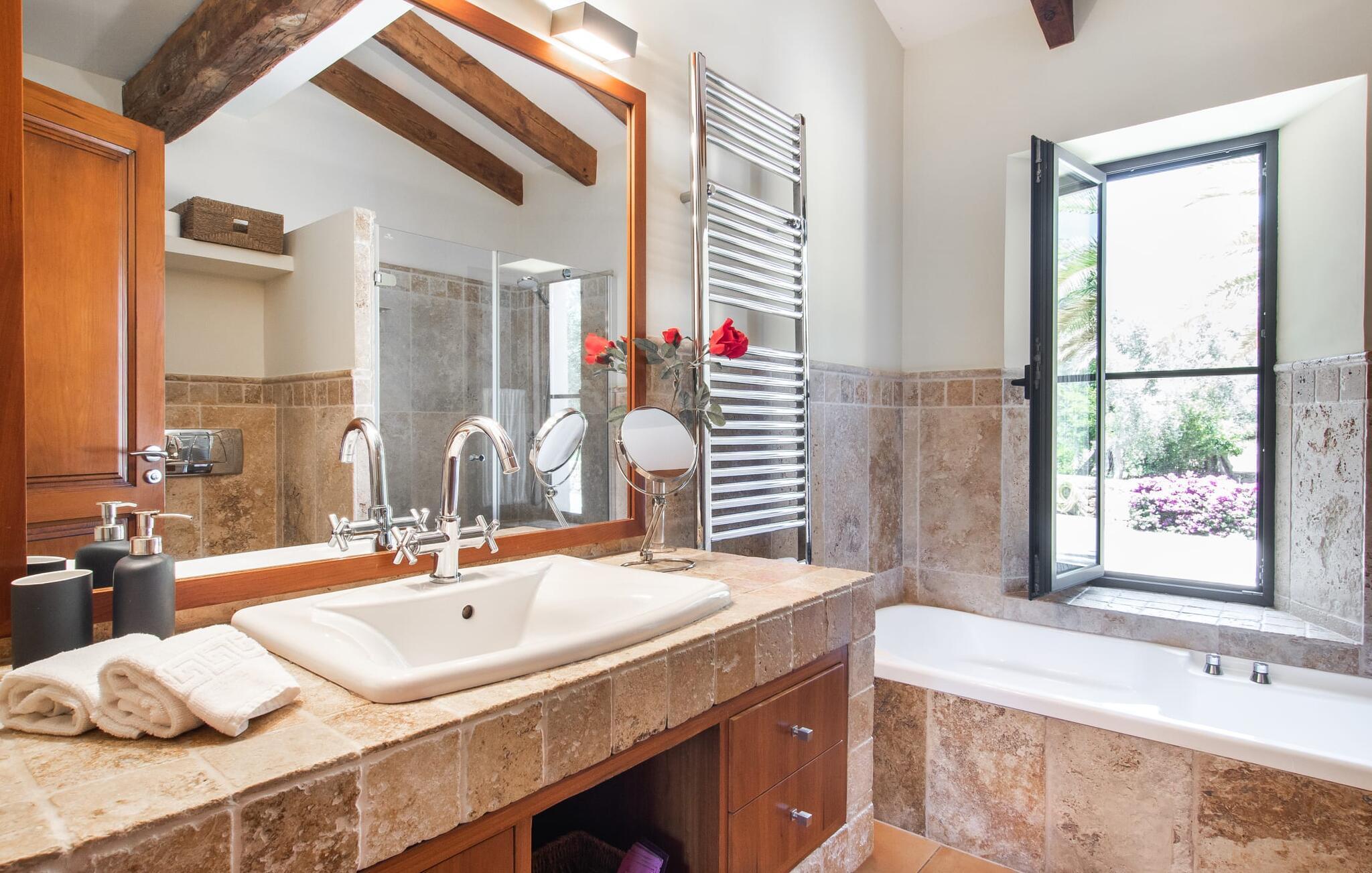 Im großzügigen Haupthaus finden bis zu sechs Personen in drei Doppelzimmern Platz. Hier finden Sie auch das Gemeinschaftswohnzimmer mit Bruchsteinmauerwerk, Holzbalkendecken und Natursteinfliesen sowie die großzügige, voll ausgestattete Wohnküche. Ein offener Kamin sorgt hier für zusätzliche Gemütlichkeit. Praktischerweise gibt es von der Küche aus einen direkten Zugang zur überdachten Terrasse, sodass Speisen und Getränke auf kürzestem Weg nach draußen transportiert werden können. Die Schlafzimmer, die dank der Klimaanlage im Flur angenehm kühl sind, sind geräumig und komfortabel eingerichtet. Direkt gegenüber dem Haupthaus bietet die kleinere Casita Unterkunft für zwei weitere Feriengäste. Es besteht aus einem großen Schlafbereich mit eigenem Bad, Kamin und Klimaanlage. Dieses Ferienhaus ist auch in der Nebensaison ein perfekter Ausgangspunkt für ausgedehnte Wanderungen oder Radtouren im nahegelegenen UNESCO-Weltkulturerbe, der wunderschönen Sierra de Tramuntana. Das Ferienhaus „Binibona“ liegt südlich der Ausläufer des Tramuntana-Gebirges im Norden Mallorcas. Gute Einkaufsmöglichkeiten gibt es im 20 Autominuten entfernten Inca. Der lange Sandstrand von Alcúdia und Playa de Muro ist 22 km entfernt.
