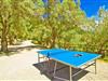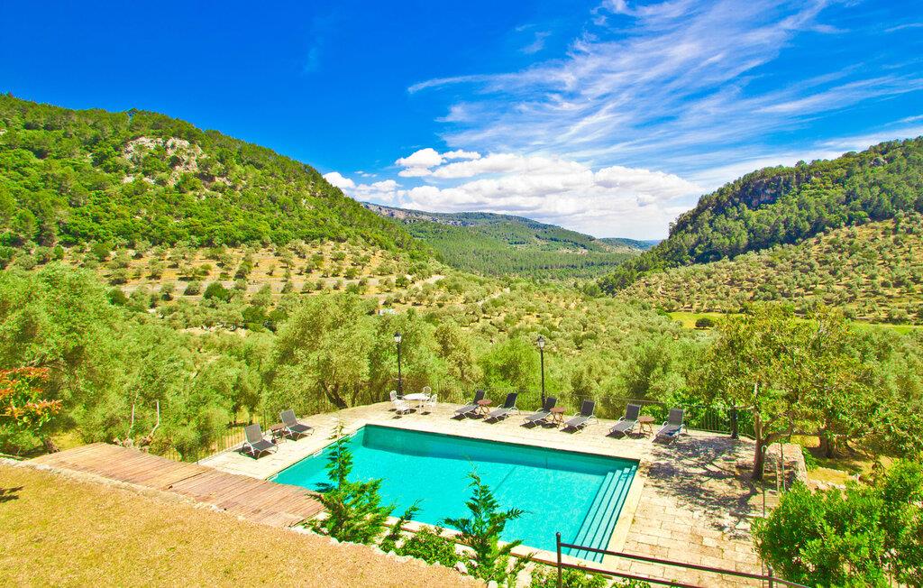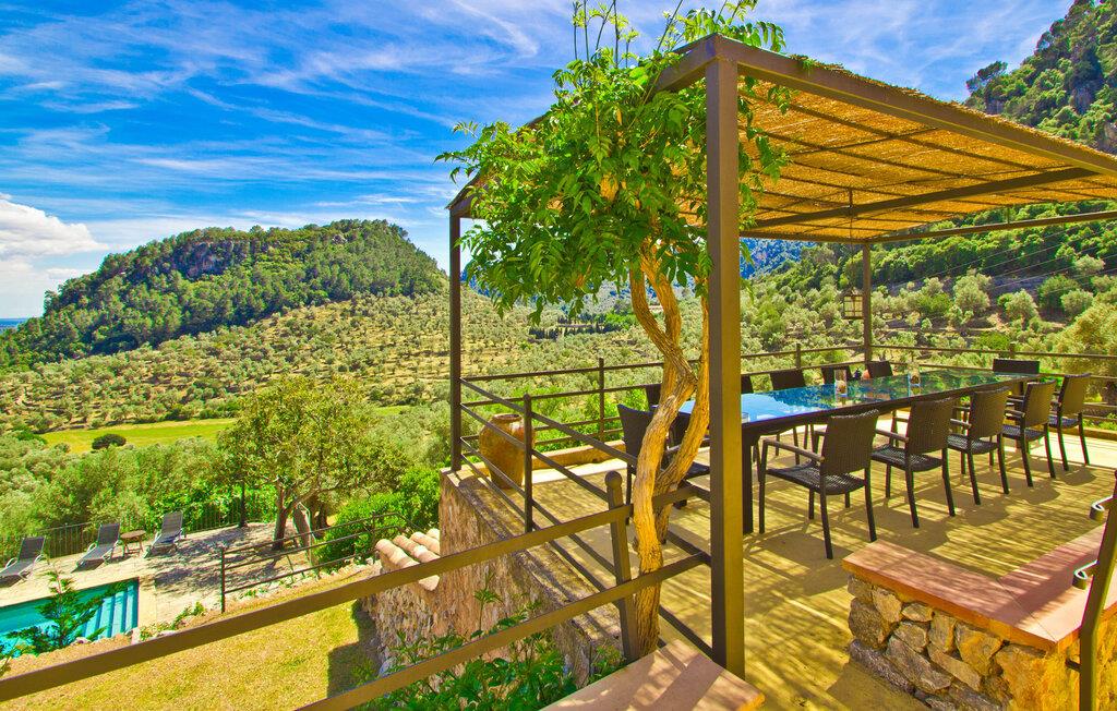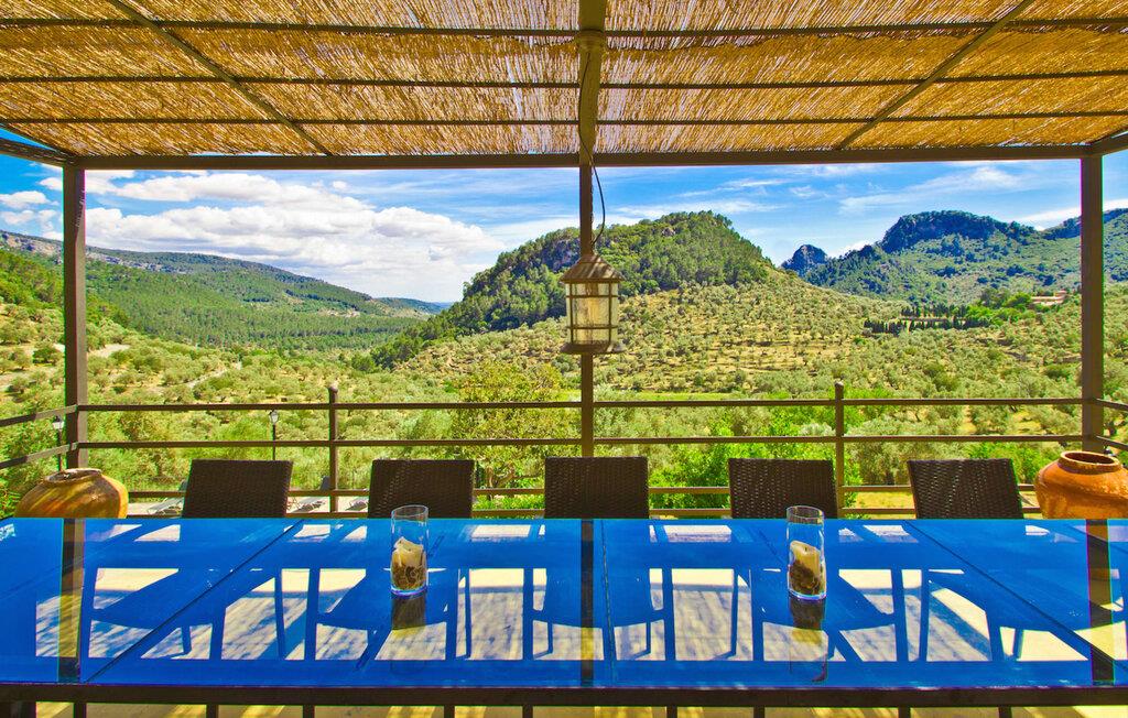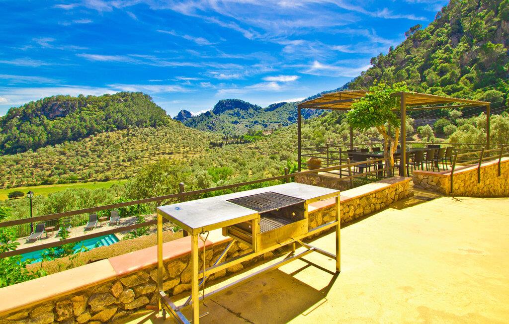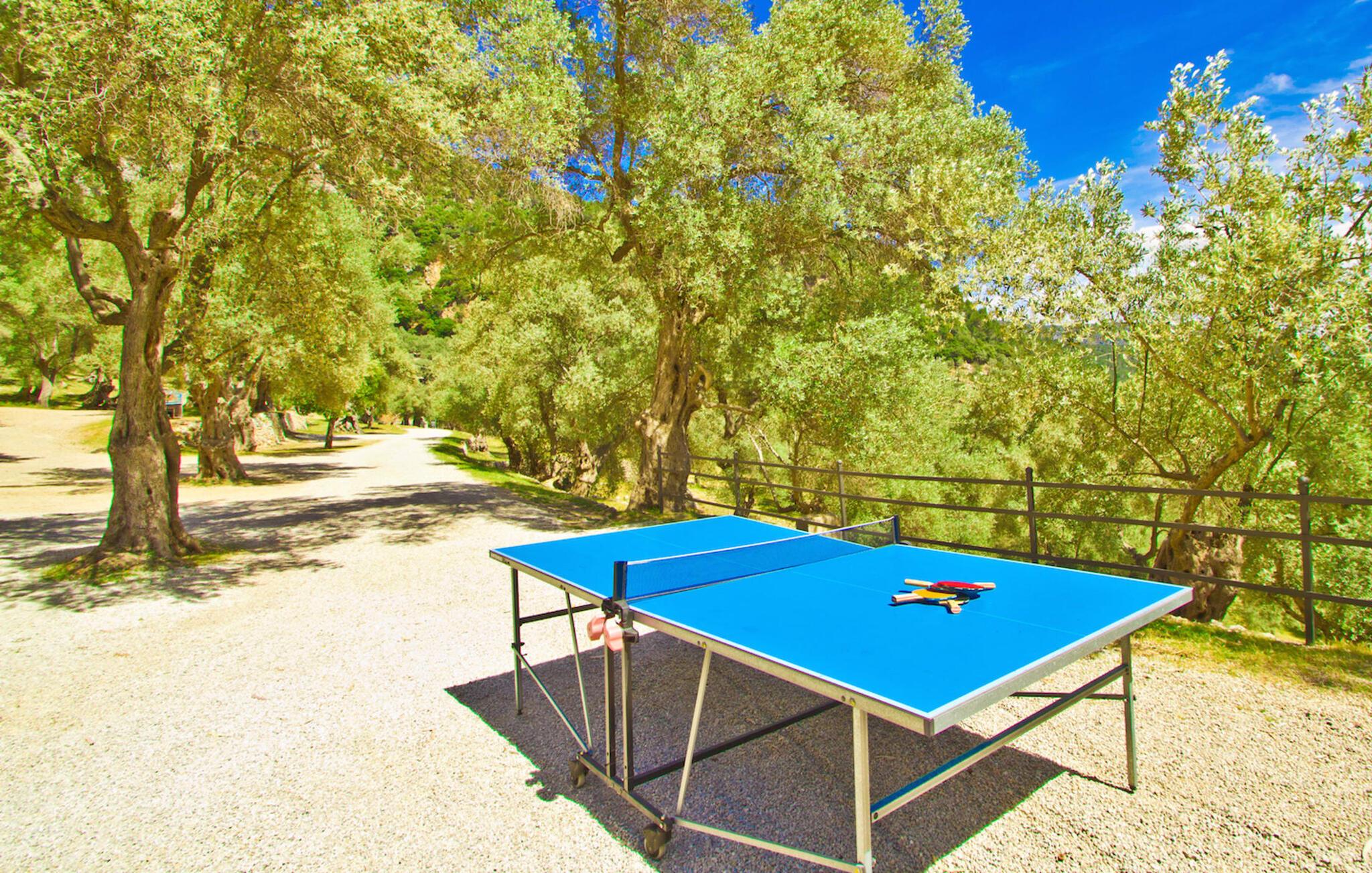 Die Fahrt zur wunderschön gelegenen, rustikalen Finca „Biniforani Nou“ führt uns über die alte Bergstraße, die die Hauptstadt Palma mit der hübschen Kleinstadt Sóller verbindet. Die serpentinenartige Straße wird heute kaum noch befahren, führt Sie aber durch die dramatisch schöne Landschaft des Tramuntana-Gebirges, das zum UNESCO-Weltkulturerbe erklärt wurde. Die Villa liegt inmitten dieser einzigartigen Naturkulisse auf einem riesigen Grundstück, in der Nähe einer der größten Städte Mallorcas, Sóller. Absolut ruhig, absolut uneinsehbar und umgeben von grünen Hügeln, die eine tolle Aussicht bieten, die Sie von unzähligen Stellen des Anwesens aus genießen können. Ein idealer Urlaubsort für Gäste, die in einer großen Gruppe reisen und zum Beispiel zum Wandern kommen und ihren Urlaub zudem völlig ungestört in einer komfortablen, großzügig angelegten Finca verbringen möchten. Der Außenbereich der Finca bietet ebenso viel wie der Innenbereich der rustikalen Finca. Neben dem großen, überdachten Essbereich, der einer Panoramaterrasse gleicht, steht ein eingebauter Grill. Auch von hier aus genießt man den einzigartigen Ausblick in die Natur, der einfach nicht zu überbieten ist. Etwas unterhalb der zuvor beschriebenen Panoramaterrasse mit Essbereich finden Sie den Pool und seine Umgebung. Rund um den Pool stehen 16 bequeme Liegen zur Verfügung, die durch Teilüberdachungen oder mit einem Sonnenschirm flexibel Schatten finden können. Wenn Sie Lust haben, können Sie an Ihren Tischtennisfähigkeiten feilen und Freunde oder Familie zu einem kleinen Match einladen.