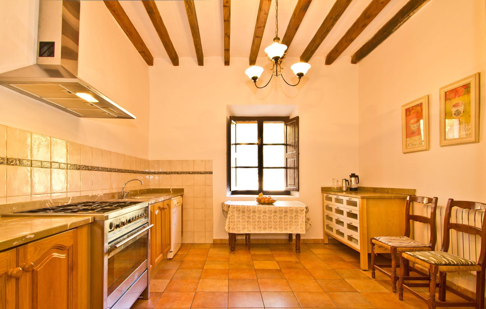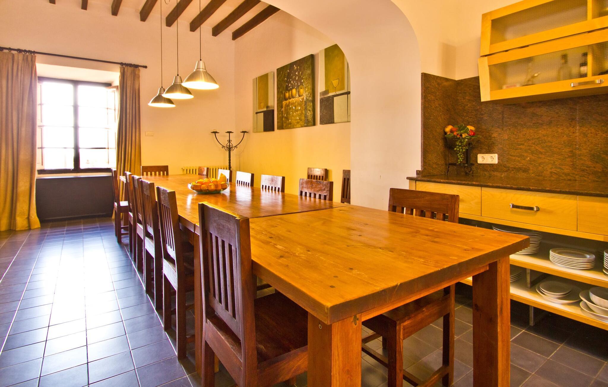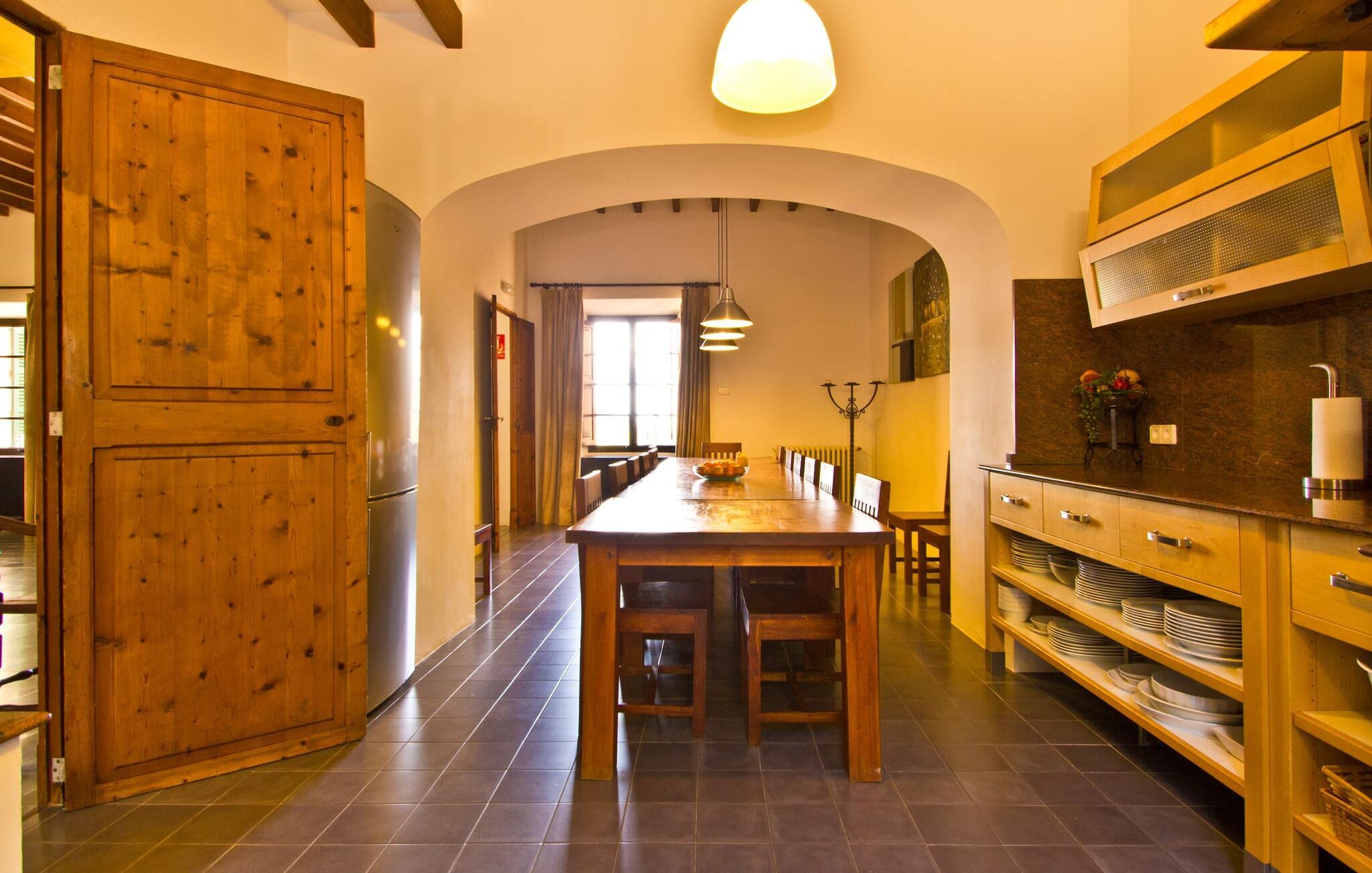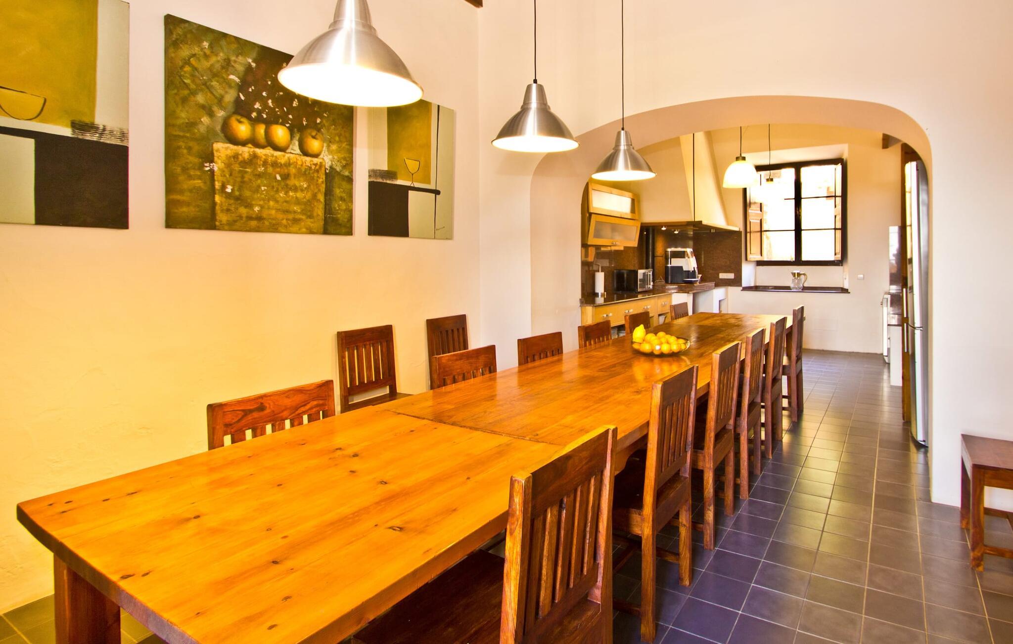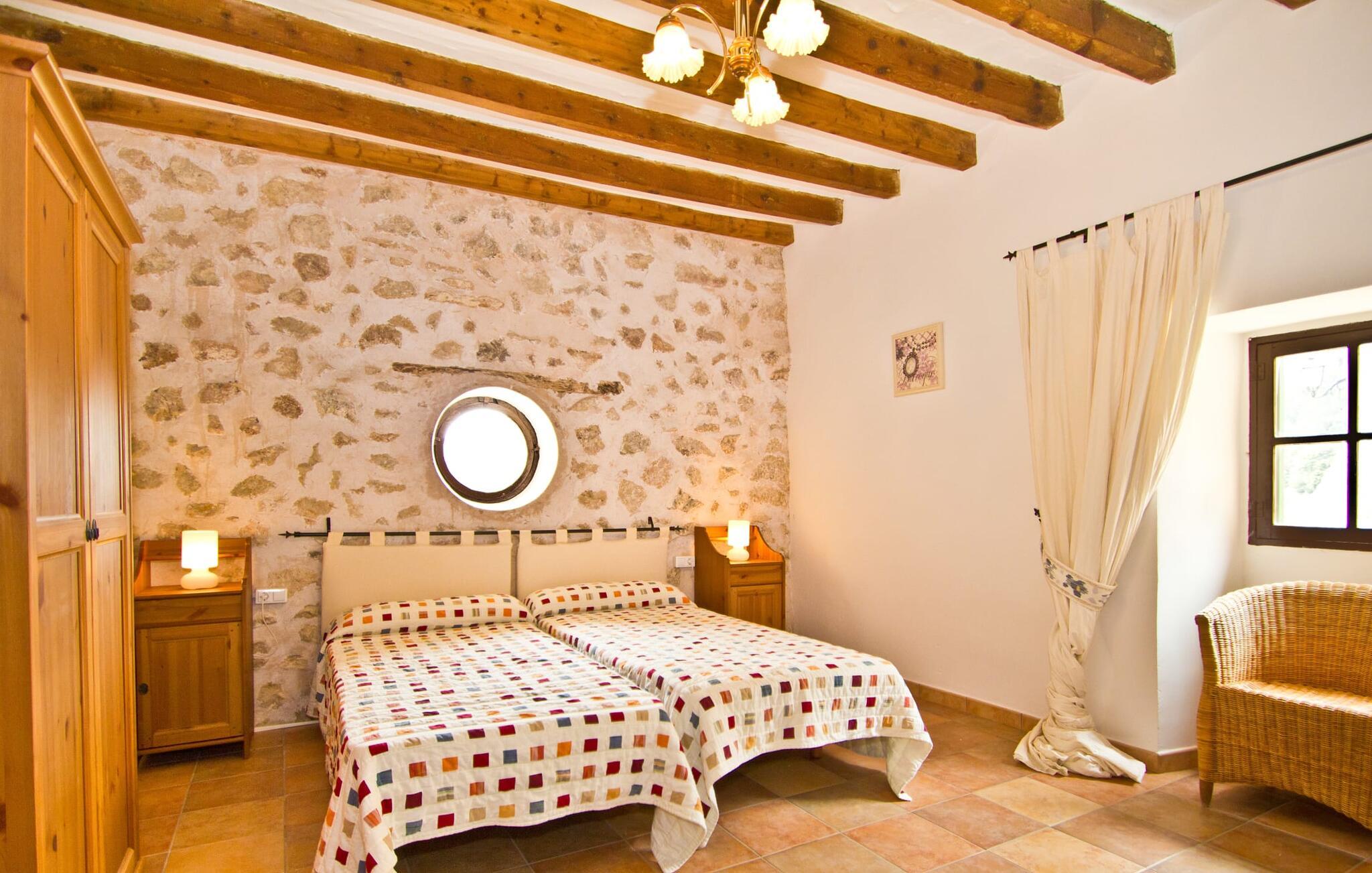 Die Bruchsteinfinca ist in eckiger Form erbaut. Ein kleines Eisentor öffnet sich in den Innenhof, von dem aus die einzelnen Gebäudeteile zugänglich sind. Auf der Terrasse ist ein wunderbar geschützter, fröhlich bunter Sitzbereich eingerichtet, wo Sie mit einer großen Gruppe von Menschen die Ruhe rund um die Villa genießen können. Das Haus selbst empfängt uns mit großen, offenen Räumen und Wohnräumen. In der schicken Küche steht ein langer Tisch, der ausreichend Platz für die gesamte Gruppe bietet. Da die Villa großen Wert auf den Komfort der Gäste legt, ist es kaum verwunderlich, dass jedes der gemütlichen Schlafzimmer, von denen einige mit antiken Bettgestellen ausgestattet sind, über ein eigenes Badezimmer (mit Dusche oder Badewanne) verfügt. Da es genügend Platz für Gäste gibt, kann jedes Paar hier trotzdem seine Privatsphäre genießen. Selbstverständlich sind auch Haustiere als Gäste herzlich willkommen.
