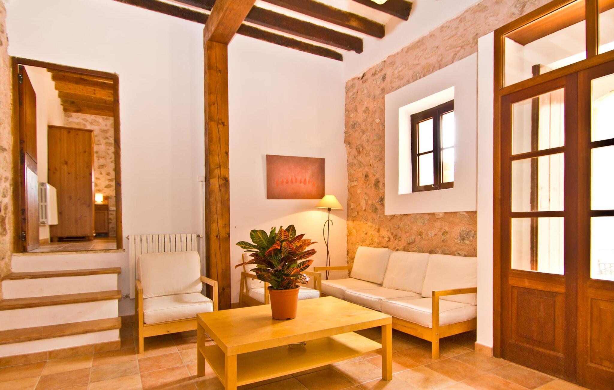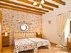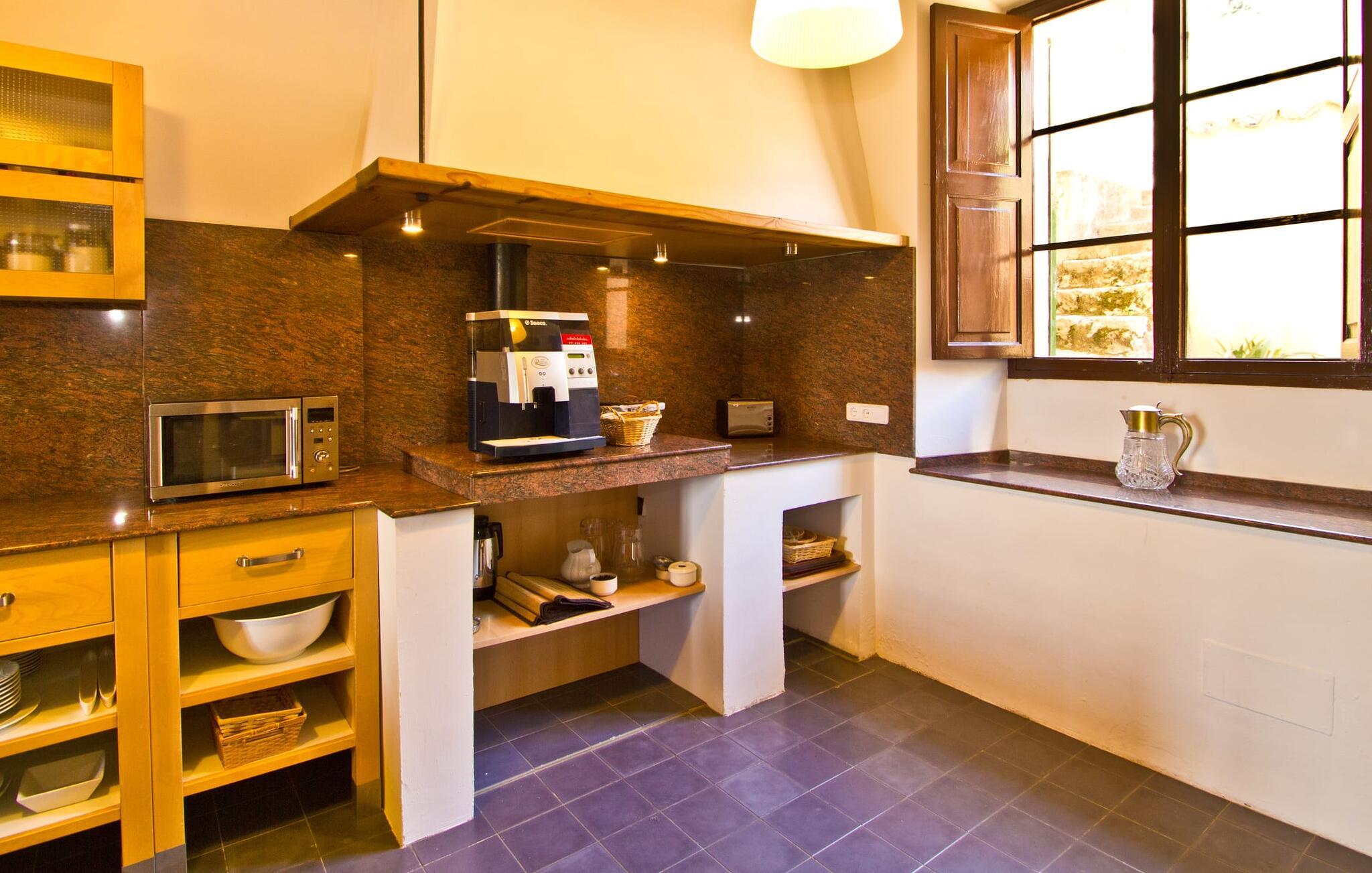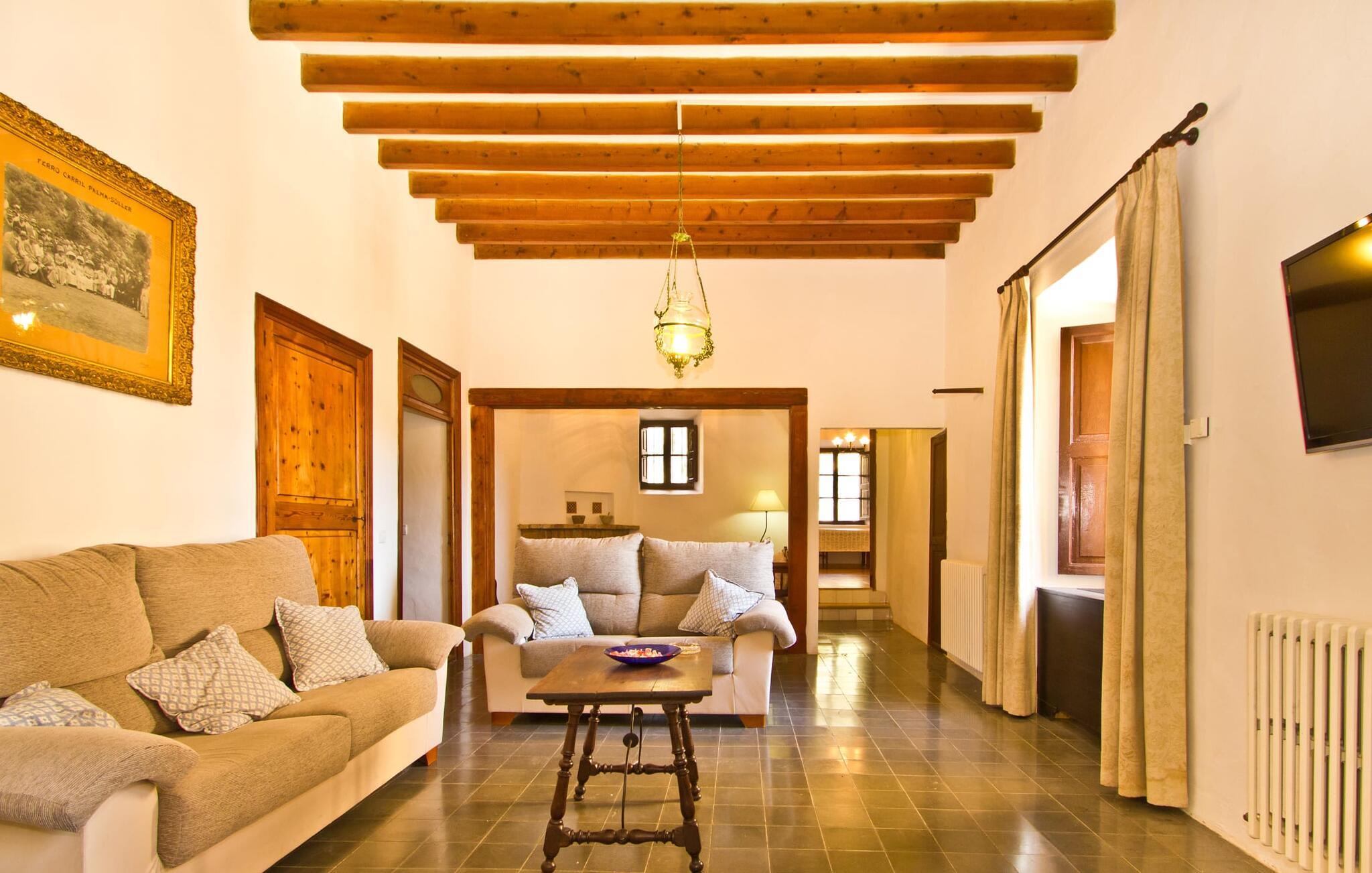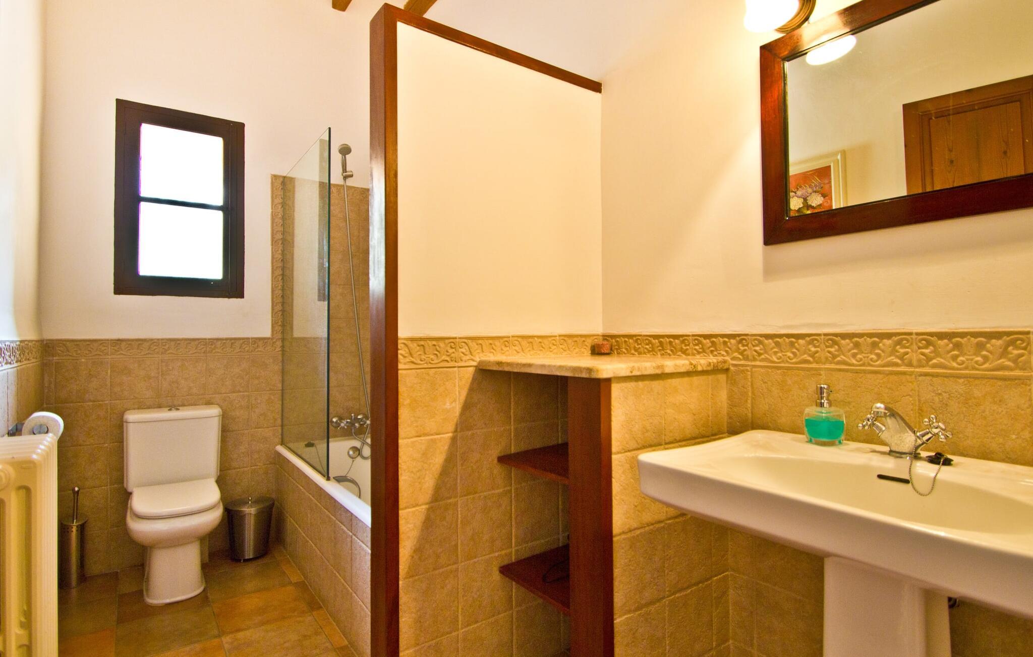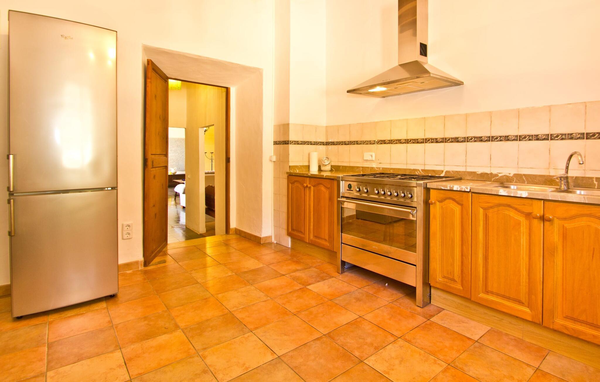 Die Bruchsteinfinca ist in eckiger Form erbaut. Ein kleines Eisentor öffnet sich in den Innenhof, von dem aus die einzelnen Gebäudeteile zugänglich sind. Auf der Terrasse ist ein wunderbar geschützter, fröhlich bunter Sitzbereich eingerichtet, wo Sie mit einer großen Gruppe von Menschen die Ruhe rund um die Villa genießen können. Das Haus selbst empfängt uns mit großen, offenen Räumen und Wohnräumen. In der schicken Küche steht ein langer Tisch, der ausreichend Platz für die gesamte Gruppe bietet. Da die Villa großen Wert auf den Komfort der Gäste legt, ist es kaum verwunderlich, dass jedes der gemütlichen Schlafzimmer, von denen einige mit antiken Bettgestellen ausgestattet sind, über ein eigenes Badezimmer (mit Dusche oder Badewanne) verfügt. Da es genügend Platz für Gäste gibt, kann jedes Paar hier trotzdem seine Privatsphäre genießen. Selbstverständlich sind auch Haustiere als Gäste herzlich willkommen.