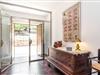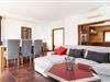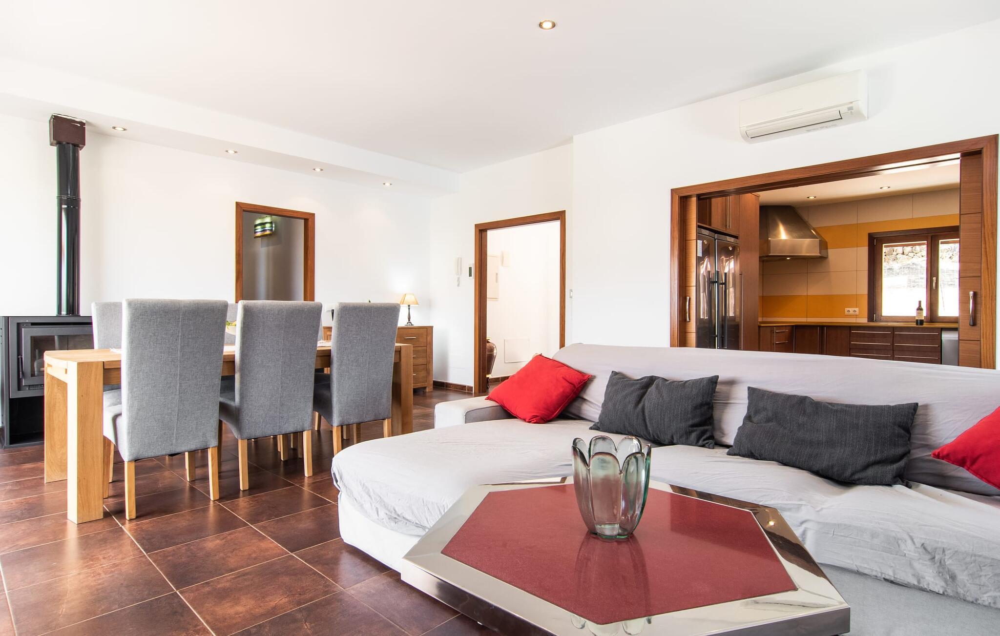 Die ebenerdige Villa präsentiert dem Besucher bereits beim Betreten ihr ästhetisches Interieur und das damit einhergehende edle Flair. Im kombinierten, sehr fröhlich gestalteten Wohn- und Essbereich setzen Brauntöne sehr gelungene Kontraste zu den strahlend hellen Decken und Wänden. Große Fenster lassen viel Licht herein. Hier können Sie Zeit beim Lesen, Spielen oder Fernsehen verbringen und bleiben dabei immer mitten im Geschehen. Wer über das Internet mit der Außenwelt verbunden bleiben möchte, kann die schnelle WLAN-Internetverbindung nutzen. Der Essbereich ist in den Wohnraum integriert und bietet ausreichend Platz für alle Reisenden. Vom großen Holztisch aus eröffnet sich Ihnen durch den offenen Zugang zur Terrasse ein Blick auf die Berge. In der großzügigen Küche sorgen moderne und hochwertige Geräte dafür, dass das Kochen auch im Urlaub zum Vergnügen wird. Zur Vollausstattung gehören ein Wasserkocher und eine Filterkaffeemaschine. Ganz unterschiedliche Schlafzimmer, alle liebevoll dekoriert, bieten eine ideale Grundlage für einen erholsamen Schlaf. Es stehen vier Betten mit der Größe 0,90 x 2,00 m sowie eines mit der Größe 1,80 x 2,00 m zur Verfügung. Die lichtdurchfluteten Badezimmer bestechen durch ein supermodernes und geschmackvolles Design und verfügen über eine Badewanne oder Dusche. Ein Bügeleisen und ein Haartrockner sind im Haus vorhanden, sodass Sie diese nicht selbst mitbringen müssen.