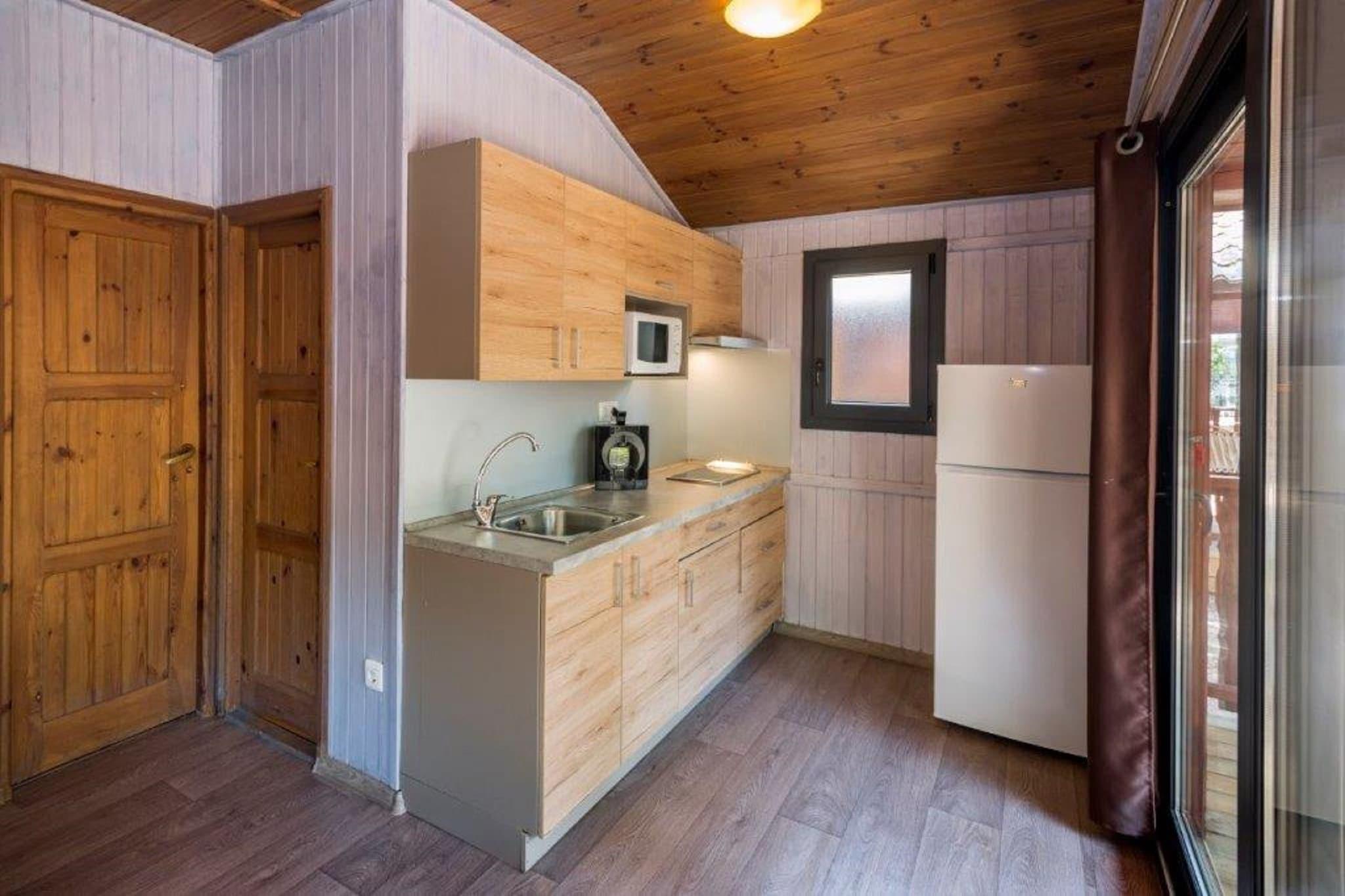 Die gepflegt eingerichteten Chalets und Cottages sind entlang kleiner Alleen auf einem separaten Teil des Campings Solmar gelegen. Dieses Chalet verfügt über ein Schlafzimmer mit einem Doppelbett. Es gibt auch ein Schlafzimmer mit 2 Einzelbetten oder zwei Schlafzimmer mit einem Einzelbett. Das Wohnzimmer verfügt über ein Doppelschlafsofa. Jedes Chalet hat eine Terrasse mit Gartenmöbeln sowie einen Parkplatz für ein Fahrzeug.