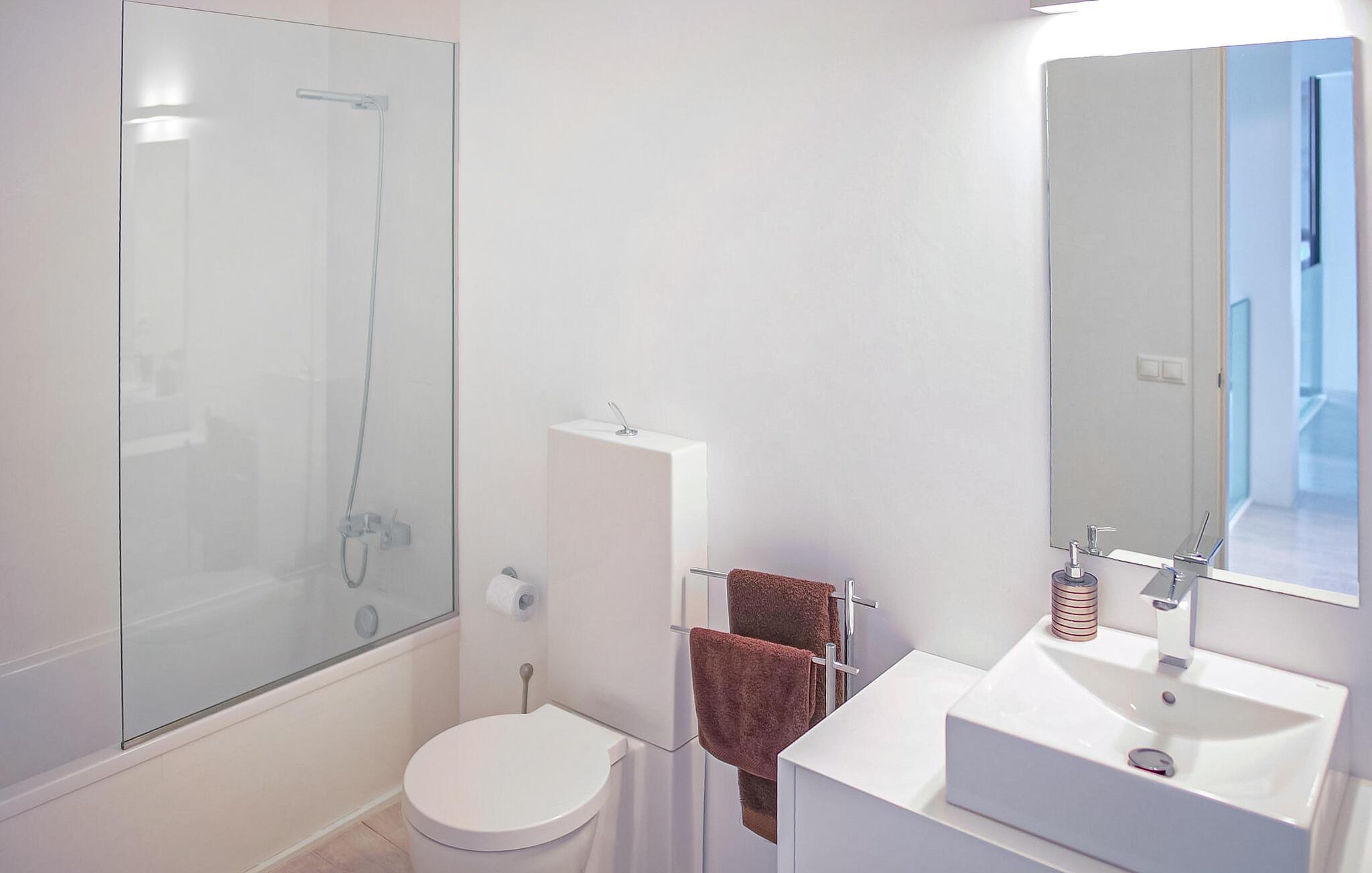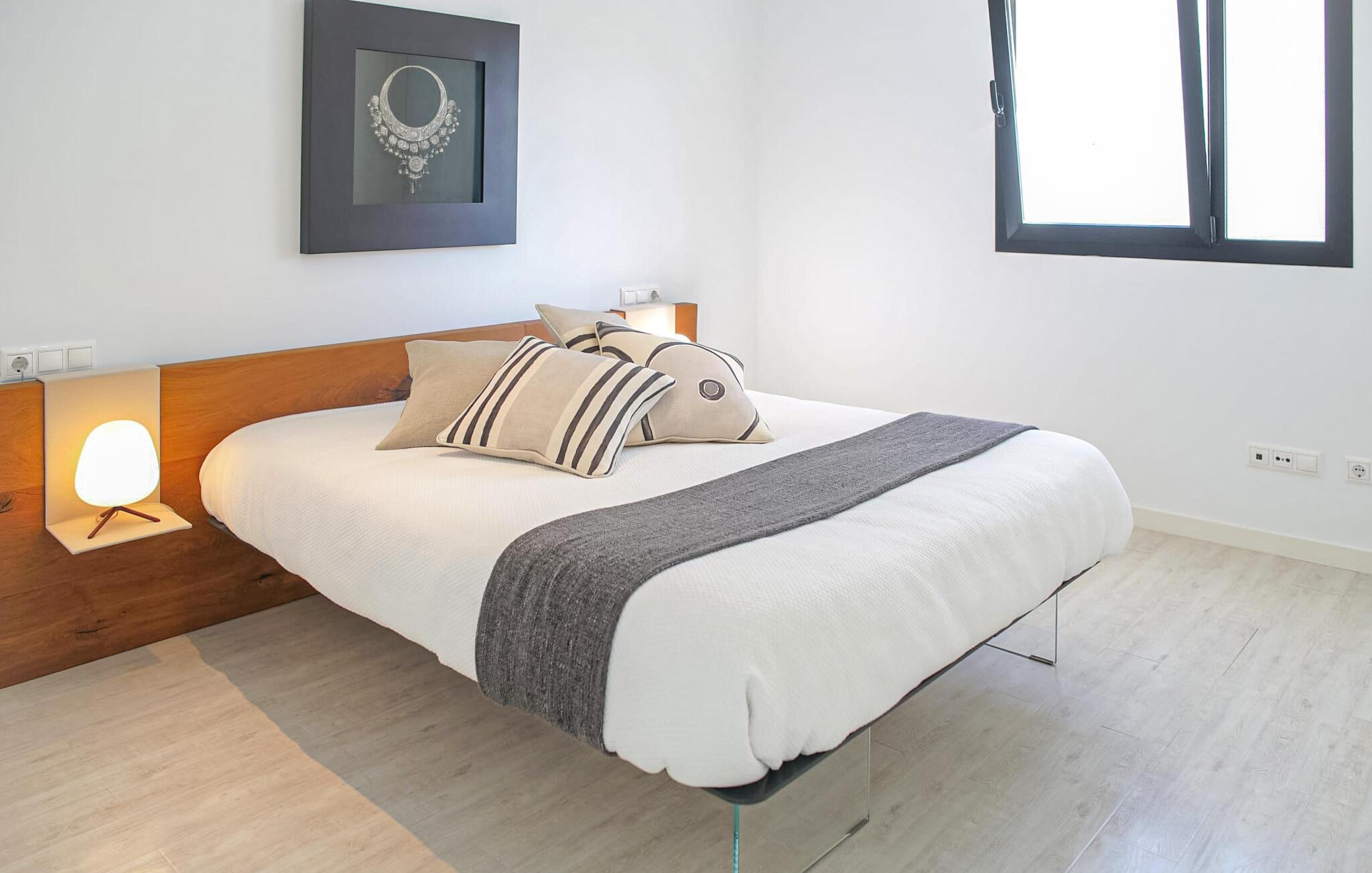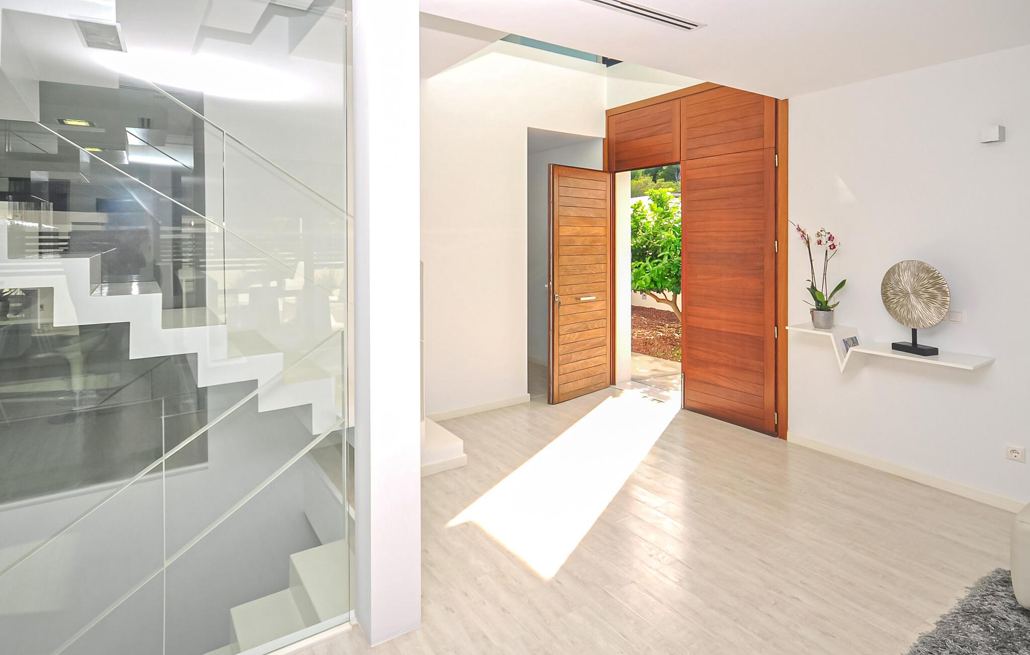 Oder gibt es das? Nur ein paar Schritte entfernt warten die schicken Innenmöbel darauf, von Ihnen entspannt zu werden. Sein minimalistisches Design und der ästhetisch dosierte Einsatz von Farben verleihen dem Innenraum des Hauses ein besonders ästhetisches Ambiente. Das Wohnzimmer mit seinen Glastüren, die auf die Terrasse führen, wirkt fast loftartig und lässt viel Raum zum Atmen. Machen Sie es sich auf dem exklusiven Sofa gemütlich, genießen Sie einen Film auf dem Flachbildfernseher, der zwar freistehend, aber dennoch unaufdringlich wirkt, und genießen Sie das Licht, das durch die gläserne Treppe auf der rechten Seite einfällt. Direkt daneben steht der Esstisch; Mit seiner originellen Tischplatte aus Holz und den üppigen Kugelleuchten aus Naturfaser ist es einem Essbereich im Freien durchaus ebenbürtig, mit dem zusätzlichen Vorteil, dass die integrierte, hochmoderne Küche mit allen modernen Notwendigkeiten nicht weit entfernt ist. Möchten Sie während Ihres Aufenthalts arbeiten? Gehen Sie dann nach oben in das speziell eingerichtete Büro, das Ihnen einen vollkommen ruhigen Ort bietet, an dem Sie Ihre Arbeit erledigen können. Die eigentlichen Ruheplätze sind natürlich die drei Doppelzimmer, alle geschmackvoll eingerichtet und eines sogar mit offenem Bad. Vier Badezimmer sorgen dafür, dass niemand warten muss, bis er an der Reihe ist – und wenn Sie Lust haben, im Fitnessstudio im Erdgeschoss zu trainieren, steht Ihnen gleich nebenan sogar ein eigenes Gäste-WC zur Verfügung.