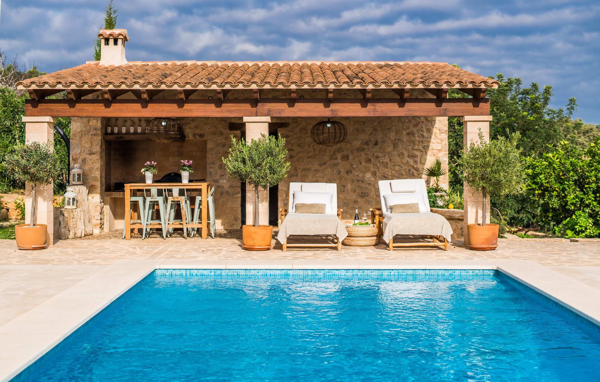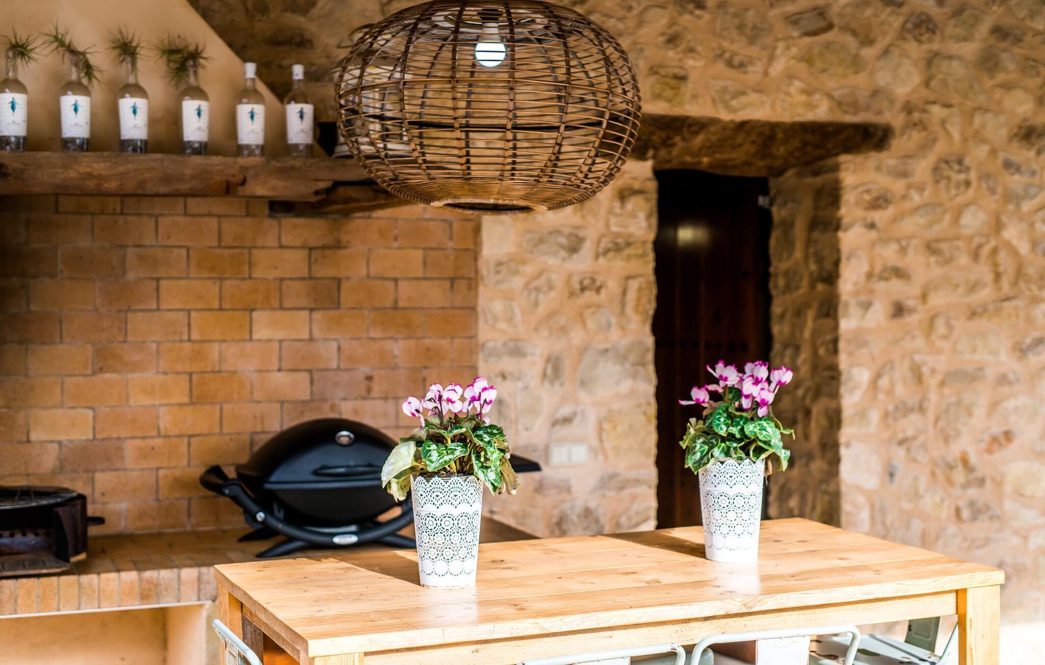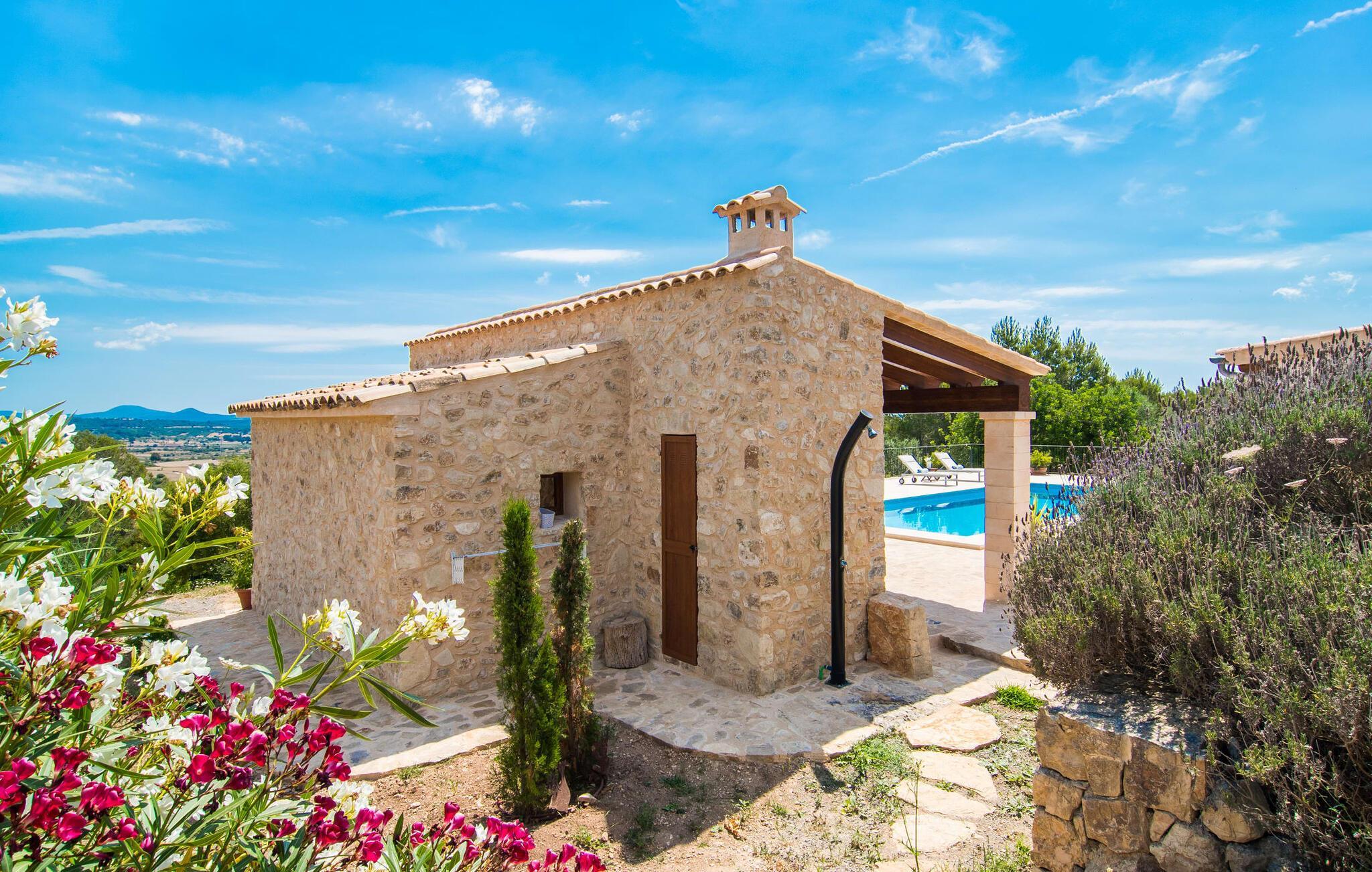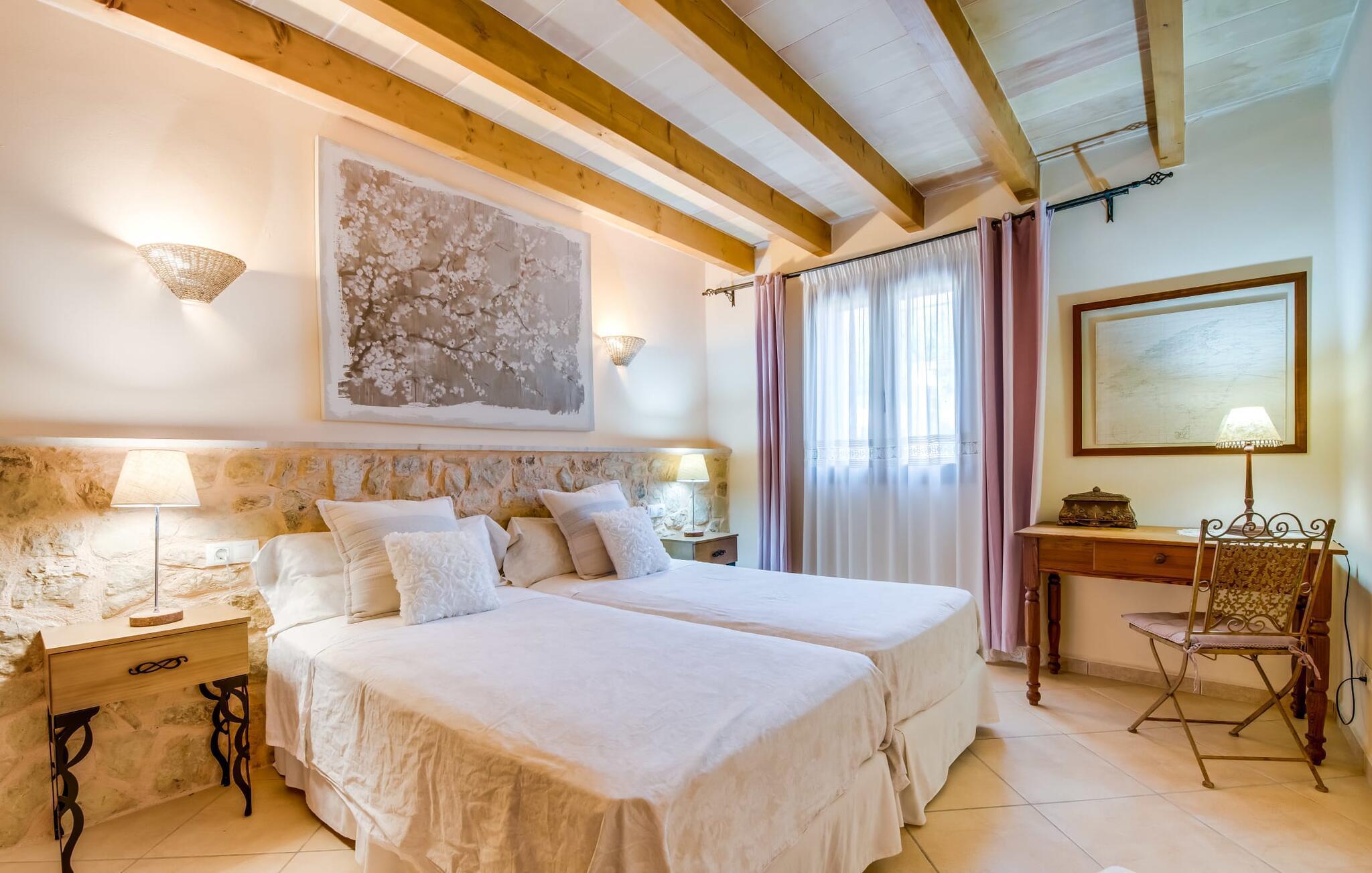 Von der überdachten Terrasse gelangen wir in das Innere der Villa; Es ist eine angenehme Überraschung, dass uns dieses so filigran wirkende Bruchsteinhaus mit einer so üppigen und hellen Innenausstattung empfängt. Gehen wir ins Wohnzimmer; Die enorm hohe Decke verleiht dem gesamten Wohnbereich eine schöne Atmosphäre der Bewegungsfreiheit. Auf der linken Seite, hinter einem Paravent, befindet sich die gemütliche beige Sofaecke neben dem heimeligen Kamin und dem modernen LCD-TV. Die abstrakten und dennoch subtilen Bilder verleihen diesem lichtdurchfluteten Raum eine zeitgemäße, moderne Atmosphäre. Ein großer, mit Sandstein verkleideter Korbbogen führt in den leicht abgetrennten Küchenbereich. Eine voll ausgestattete Landhausküche aus rustikalem Holz empfängt uns; Genau das, was Sie sich erhofft hatten, um Ihnen in Ihrem Villenurlaub eine entspannte Selbstversorgung zu ermöglichen. Dieses Zimmer ist unter anderem mit einem großen Herd und einem antiken Kachelofen ausgestattet. In der Mitte des Raumes steht ein Esstisch aus Holz. Die Küche verfügt außerdem über eine Tür, die zum Außenbereich führt – besonders praktisch, um Mahlzeiten im Freien einzunehmen. Insgesamt gibt es drei komfortable, geräumige Schlafzimmer; Ihre Einbauschränke mit Massivholztüren bieten ausreichend Stauraum für Ihre gesamte Urlaubsgarderobe. Die gemütlichen Schlafzimmer sind entweder mit zwei Einzelbetten in der Größe 1,05 x 2 m oder 1 x 2 m oder einem Doppelbett mit einer Breite von 1,80 m ausgestattet. Das Einzelzimmer ist besonders für Kinder geeignet und für unsere kleinsten Gäste stehen auch zwei Babybetten zur Verfügung. Zwei elegante Badezimmer werden von allen Gästen gemeinsam genutzt – eines mit Badewanne und eines mit Dusche. Bei Ihrem Rundgang durch das Innere und Äußere des Hauses werden Sie zahlreiche dekorative Elemente entdecken, die zur Stimmung dieser Finca beitragen. Bis ins kleinste Detail ist alles mit so viel Liebe für die Gäste arrangiert, dass Sie sich beim Betreten sofort wie zu Hause fühlen und die Ruhe und den harmonischen Charme von „Bon Any“ genießen können.