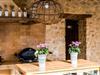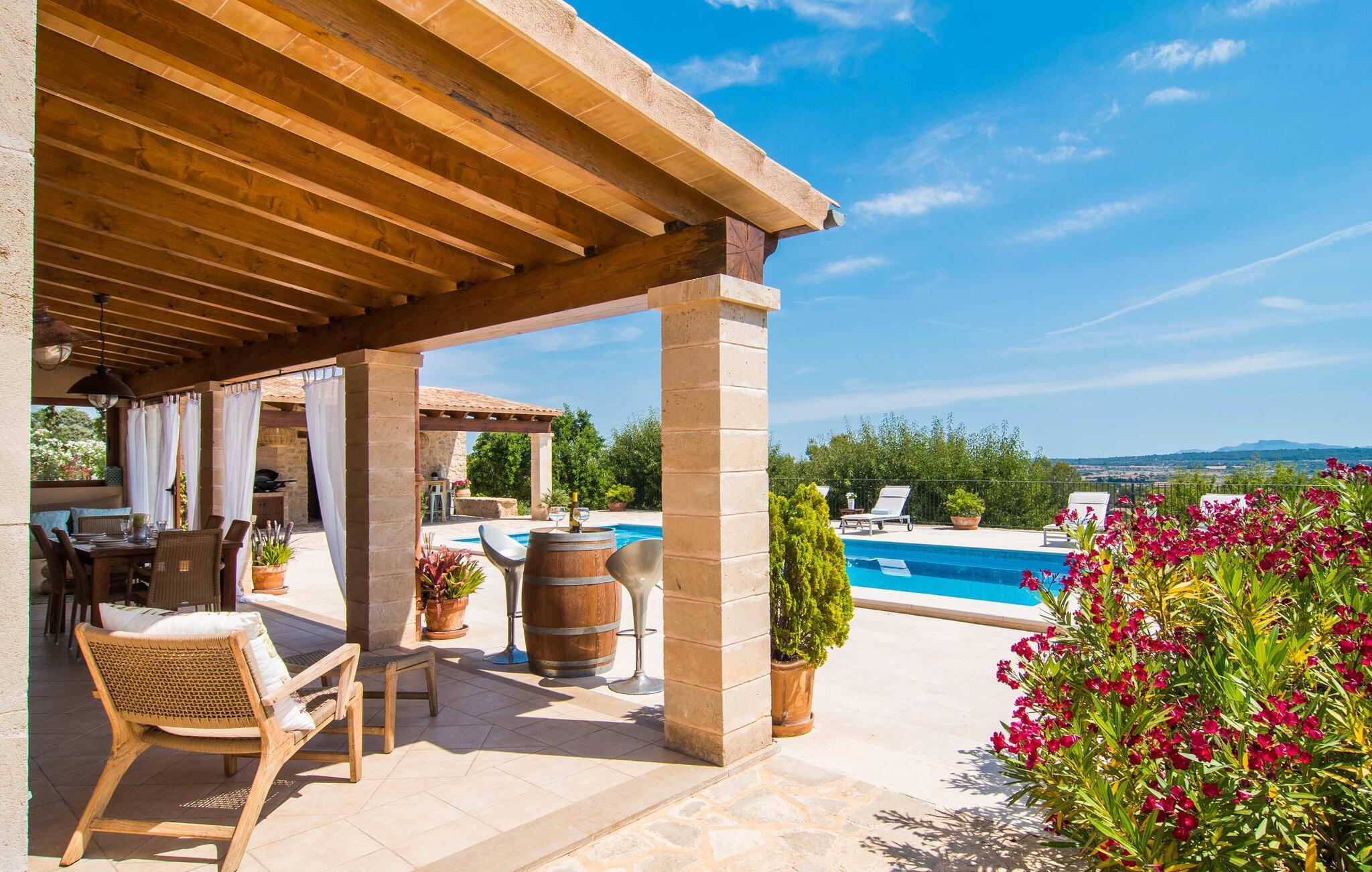 Über gut ausgebaute Villenstraßen statten wir heute der Villa „Bon Any“ einen Besuch ab. Wir laden Sie ein, uns auf einem Rundgang durch dieses atemberaubende Anwesen zu begleiten. Auf den ersten Blick wirkt die Bruchsteinkonstruktion sehr traditionell; Wir können Ihnen versichern, dass es sich um eine Neubauvilla in hervorragender Lage handelt, die sich jedoch stark an den traditionellen mallorquinischen Baustil hält. Das Haus liegt auf einem großzügigen 30.000 m² großen Grundstück in erhöhter Berglage. Die Bauherren konnten die Lage optimal ausnutzen und sowohl den Poolbereich als auch die überdachten Terrassen so positionieren, dass Sie diesen unvergesslichen Weitblick in vollkommener Ruhe, umgeben von der ganzen Schönheit der mediterranen Natur, genießen können . Der große Pool liegt auf einer wunderschönen hellen Terrasse und ist von einem Abhang zum umliegenden Gelände mit zahlreichen Oliven- und Johannisbrotbäumen abgegrenzt. Sechs hochwertige Sonnenliegen aus Aluminium stehen für Ihr tägliches Sonnenbad bereit. Wenn es Ihnen in der Sonne zu warm ist, schieben Sie die Sonnenliege einfach unter den Schatten des mit Bambus bespannten „Toldo“ oder Baldachins – dort finden mindestens fünf Liegen Platz. Wenn Sie Lust auf eine Partie Backgammon haben, gibt es am anderen Ende des Pools einen kleinen Tisch und Stühle im Bistrostil. Der mit Mosaiken ausgekleidete Pool selbst bietet einen breiten, flachen und kinderfreundlichen Stufenzugang. Nun verlassen wir den Pool und begeben uns auf die überdachte Terrasse neben dem Haus. Wenn Sie gemeinsam am Esstisch mit seinen bequemen Korbstühlen sitzen und Ihr Abendessen genießen, können Sie den Blick über den Pool schweifen lassen und den Blick auf die Ebene um Petra genießen – ein Blick, der bis zur Bergkette am Horizont reicht. Neben dem Essbereich befindet sich ein integrierter Loungebereich, der auf seinen weichen Sitzkissen zum Entspannen einlädt. Ein idealer Ort für ein gutes Glas Wein mit Freunden am Abend oder einen Morgenkaffee, um den Tag in der Ruhe der Natur beginnen zu lassen.