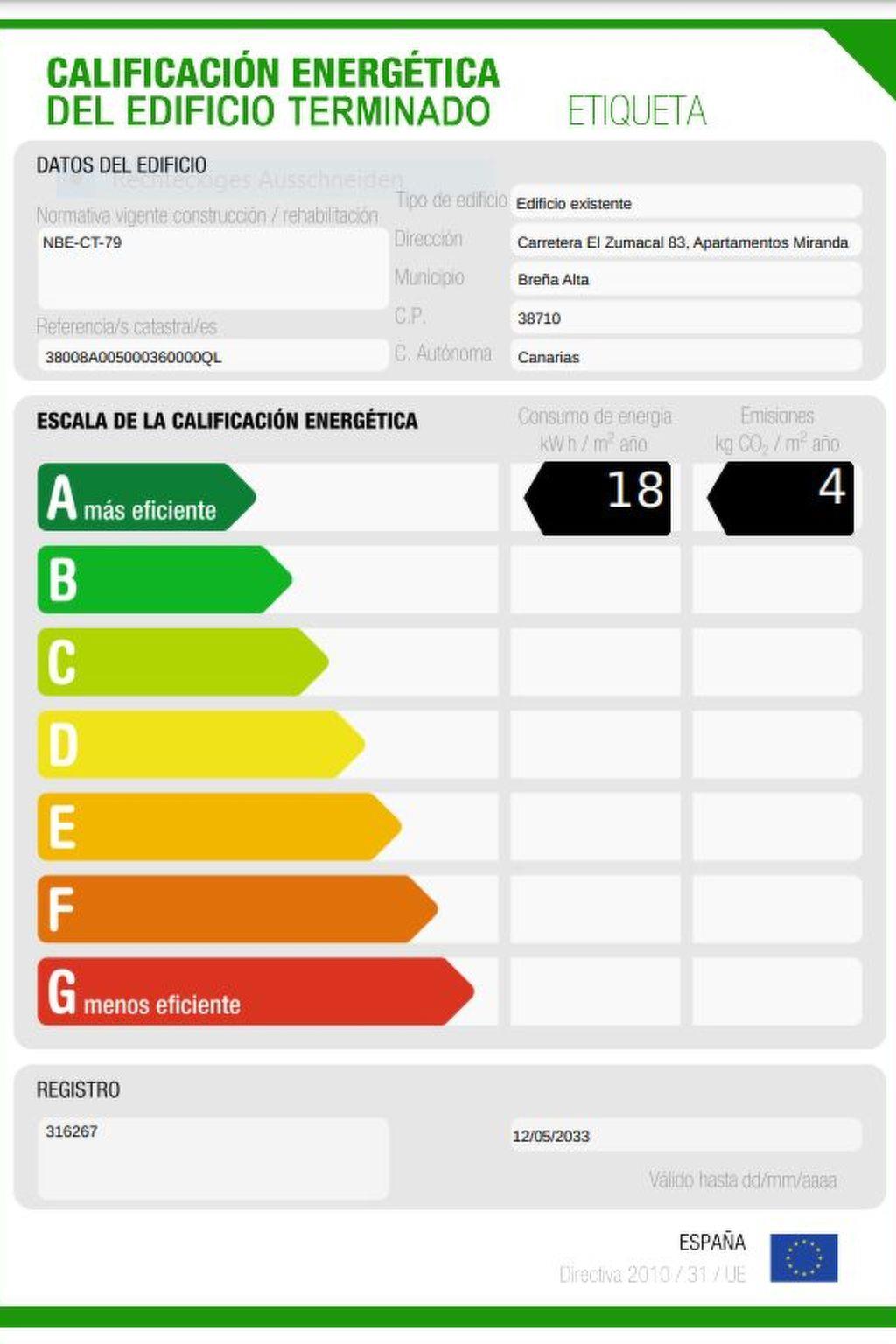 Dieses Objekt hat ein Gebäude-Energieeffizienz-Etikett (Energie-Label) der Klasse A erhalten. Ausgestellt und erteilt wurde es 2023 von der Generaldirektion der Regierung der kanarischen Inseln.