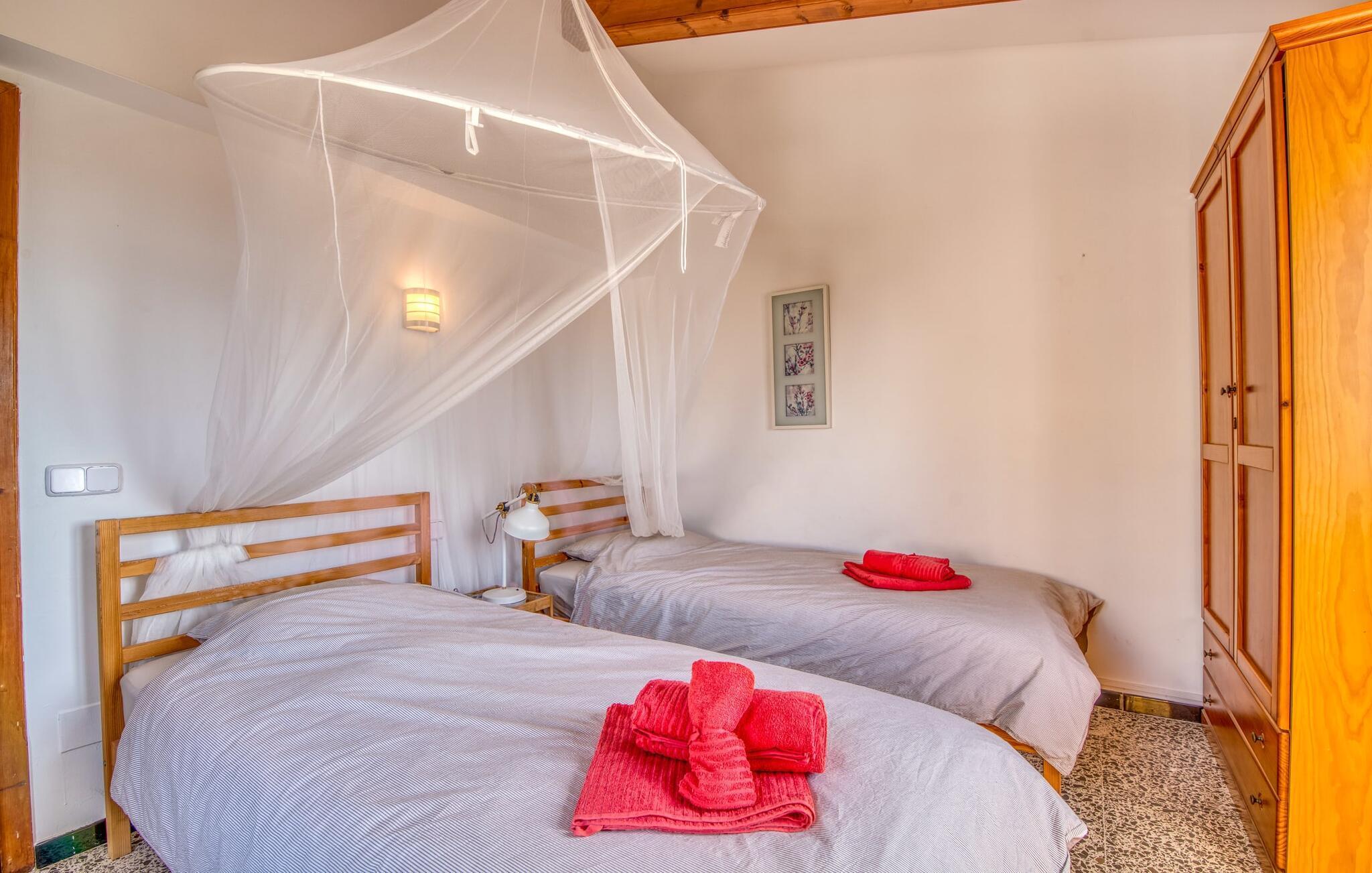 Aber auch die Atmosphäre in dieser kompakten Villa ist sehr stimmig. Herzstück ist der offene Wohn- und Essbereich mit absolut gemütlichen Sofasitzen im hellen Beach-Stil. Dies wird durch die Kombination aus hochwertigem Natursteinboden, warmem Holz und typisch mallorquinischer Rustikalität gekonnt ergänzt. Das Ergebnis ist ein bezaubernd traditionelles und dennoch modernes Ferienhaus. Die voll ausgestattete Küche ist über einen Rundbogen mit dem Essbereich verbunden. Auch hier sind Landhaus-Look und Gemütlichkeit perfekt vereint. Die Villa mit Meerblick ist ideal für bis zu sechs Personen oder zwei Familien. Auf zwei Etagen finden Sie gemütliche Schlafzimmer, wahlweise mit einem Doppelbett oder zwei kindergerechten Einzelbetten. Für Ihren Komfort finden Sie über den Bettgestellen Baldachine, die auch als Moskitonetze dienen. Zwei individuell geflieste Duschbäder runden das Ensemble ab. Die fabelhafte Villa „Buena Vista de Cala Pi“ eignet sich nicht nur für einen Urlaub auf Mallorca im Sommer, sondern auch in der Nebensaison – und das zu sehr attraktiven Mietpreisen in wunderschöner Lage.