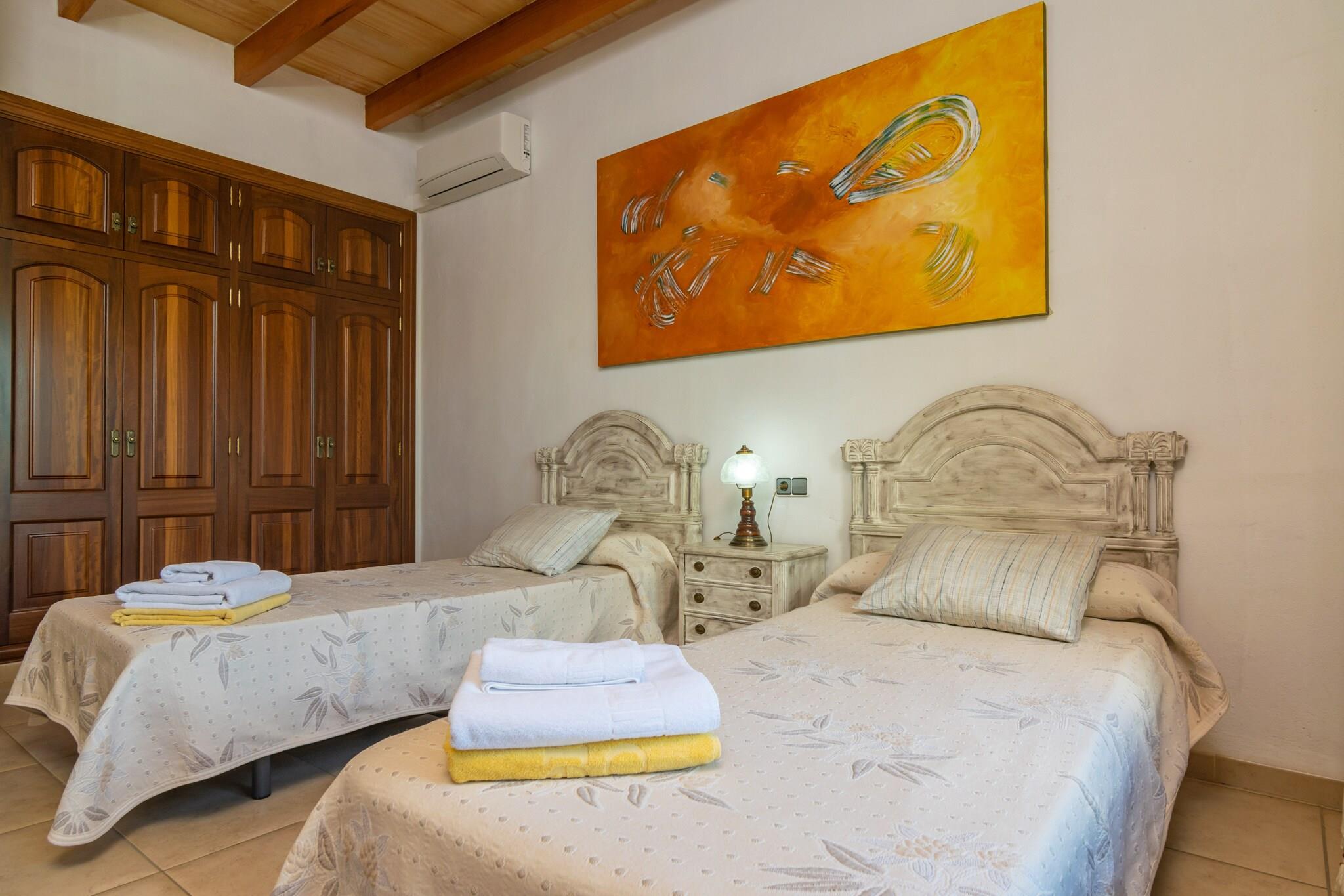 Der sehr große Chlorpool hat eine Größe von 16 m x 8 m und eine Tiefe von 0.7 m bis 2.2 m. Er ist umgeben von einem mediterranen, sehr gut gepflegten Garten, in dem Sie auf den sechs Liegestühlen sich sonnen können, einen Aperitif unter der Markise genießen oder sich unter der Außendusche erfrischen können. Wenn es Ihnen gefällt draußen zu kochen, auf der möblierten Veranda finden Sie einen Steingrill. Es gibt eine weitere Veranda mit Poolblick, ein idealer Ort zu frühstücken. Je nach Jahreszeit gibt es verschiedene Obstbäume, wie Orangen, Zitronen und Pfirsich. Diese Finca ist absolut privat und hat keine direkten Nachbarn. Von außen, wie auch von innen ist diese Finca ein Juwel. Ein großes Wohn-/ Esszimmer, dekoriert mit rustikalen Elementen und komplett ausgestattet mit Klimaanlage, DVD- Player und SAT- TV lässt Sie wie zu Hause fühlen. In der Nebensaison ist es sehr schön eine Tasse Tee neben dem Kamin zu trinken. Die separate Küche ist komplett ausgestattet, damit man wie zu Hause kochen kann. Es gibt ein Schlafzimmer mit Doppelbett und eines mit zwei Einzelbetten, alle mit Klimaanlage und einem Schrank ausgestattet. Es verfügt über zwei Badezimmer, eines mit Dusche und eines mit Badewanne. Die Waschmaschine, das Bügeleisen und Bügelbrett befindet sich in eines der Badezimmer. Für unsere kleinen Gäste stellen wir zwei Babybetten und zwei Hochstühle zur Verfügung. Buger ist ein authentisches Dorf nördlich gelegen von Mallorca und 15 km von der Küste entfernt. Im Ort finden Sie einen Lebensmittelladen und Restaurants. Mehr Annehmlichkeiten und Supermärkte finden Sie im Nachbarort Sa Pobla. In der Umgebung von Buger gibt es viele Feldwege für Fahrradfahrer und Wanderer. Sie können die unterirdischen Quellen von Campanet besuchen, die nach heftigem Regen anfangen zu sprudeln oder einen langen Ausflug zum Kloster Lluc machen. Der nächstgelegene Sandstrand ist Playa de Muro und ist ein ruhiger Strand inmitten von Dünen. Can Picafort und Puerto Alcudia sind lebendiger und verfügen über alle vorstellbaren Annehmlichkeiten. Wenn Sie gerne spazieren gehen, können Sie von Alcudia bis nach Can Picafort laufen, durchqueren ganz Playa de Muro. Eventuelle Nebenkosten müssen beim Anbieter nachgefragt werden. Haustiere sind willkommen. Partys oder ähnliche Veranstaltungen sind nicht gestattet. Es gibt Freiluftparkplätze für 4 Autos. Entfernungen Strand: 15.6 km - Platja de Muro Flughafen: 46.9 km - Aeroport Son Sant Joan Golfplatz: 15.1 km - Golf Pollença Ortsmitte: 2.2 km - Buger Bahnhof: 4.7 km - Sa Pobla Bushaltestelle: 2.2 km - Plaça de la Constitució, Buger Fähre: 22.5 km - Port Alcudia Krankenhaus: 13.6 km - Hospital Comarcal d'Inca Touristen Lizenz: ETV/887Einheitsregister: ESFCTU000007022000335664000000000000000000000ETV/8877Homerti - Central de Reservas CR/33