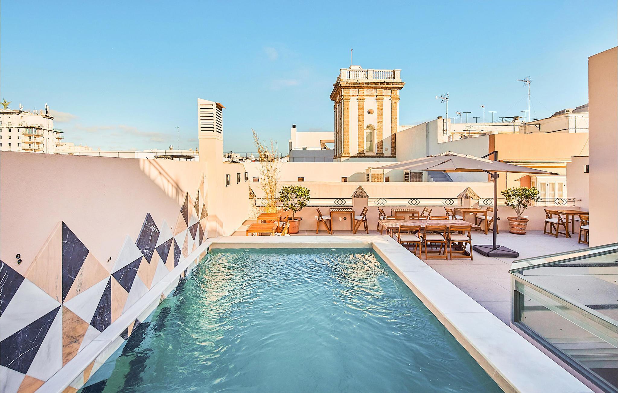 Auf der herrlichen Dachterrasse können Sie mit Blick auf die Dächer der Stadt in vollen Zügen die Sonne genießen, sich im Pool erfrischen und einen unvergesslichen Urlaubstag mit einem Glas Wein ausklingen lassen.