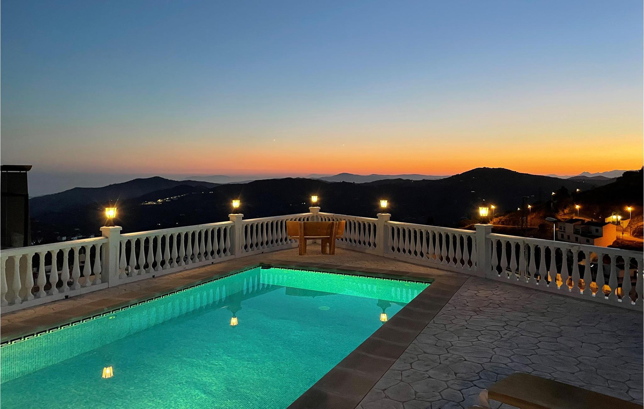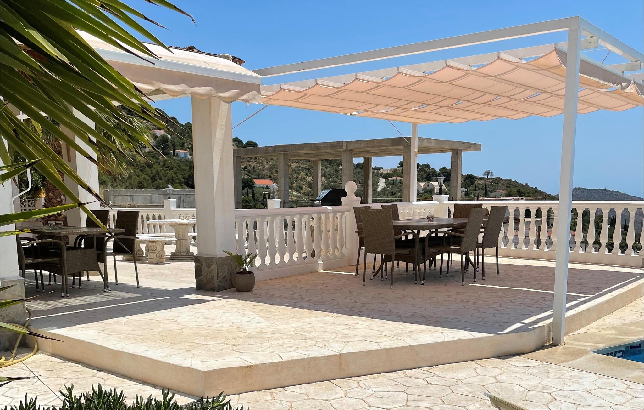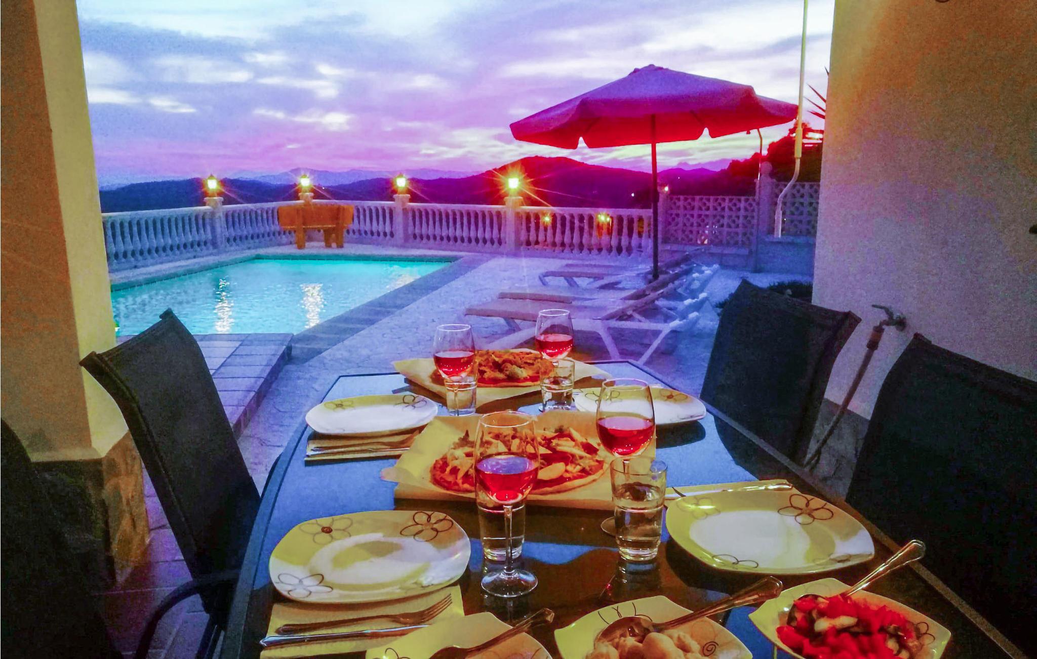 Es verfügt über 3 SZ und 2 BZ und ist verteil über 2 Etagen: Im Erdgeschoss befinden sich ein großes helles Wohnzimmer und eine voll ausgestattete halboffene Küche. Vom Wohnzimmer aus haben Sie Zugang zu 2 geräumigen Schlafzimmern, einem Gemeinschaftsbad und einer Treppe, die uns in den ersten Stock führt, wo wir ein separates Badezimmer, ein Schlafzimmer und eine schöne Terrasse mit hervorragender Aussicht finden, auf der wir viel Ruhe finden und Entspannung. Vom Wohnzimmer aus haben Sie Zugang zu einem überdachten Esszimmer, mehreren Terrassen rund um das Haus und einem 4x8m großen Pool.