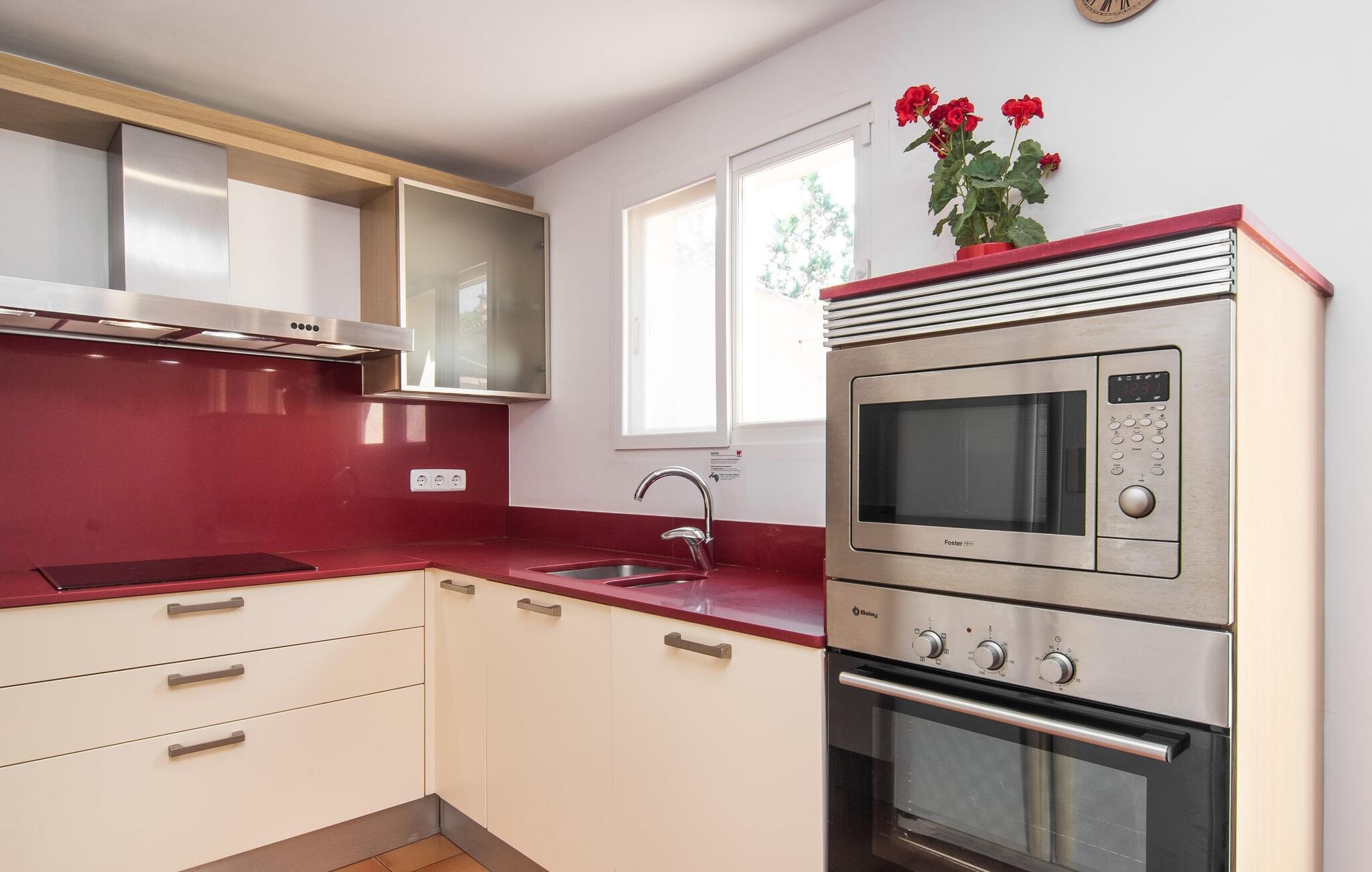 Eine andere Möglichkeit besteht darin, ein gemütliches Plätzchen im großzügigen Innenraum des Hauses zu finden. Das offene Wohn- und Esszimmer mit TV und Kamin bietet mehrere Möglichkeiten. Sie können auch in der angrenzenden Küche Platz nehmen. Darüber hinaus finden Sie eine voll ausgestattete Küche, die sich perfekt für die Selbstversorgung eignet. Der Ausgang zum Balkon ist sehr praktisch. Auf dieser Wohnebene befinden sich außerdem ein Schlafzimmer mit Doppelbett und ein Zimmer mit Kinderbett. Hier befindet sich auch ein Duschbad. Im Obergeschoss befinden sich zwei weitere geräumige Schlafzimmer und ein Badezimmer mit Dusche und Badewanne. Aufgrund der vorhandenen Warm-Kalt-Klimaanlage ist dieses Stadthaus das ganze Jahr über angenehm bewohnbar.