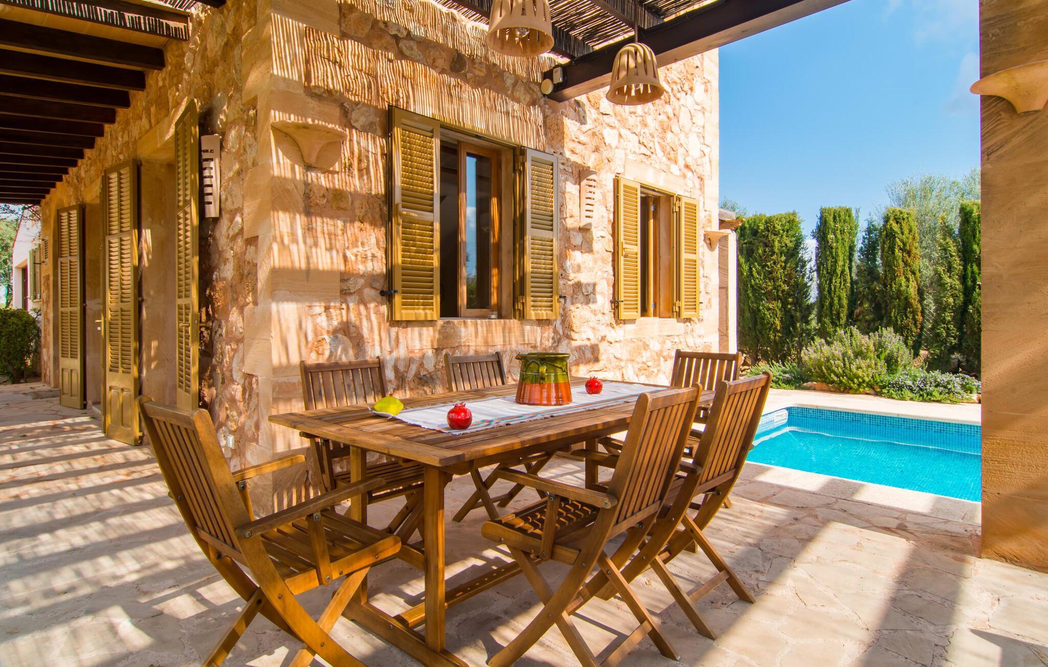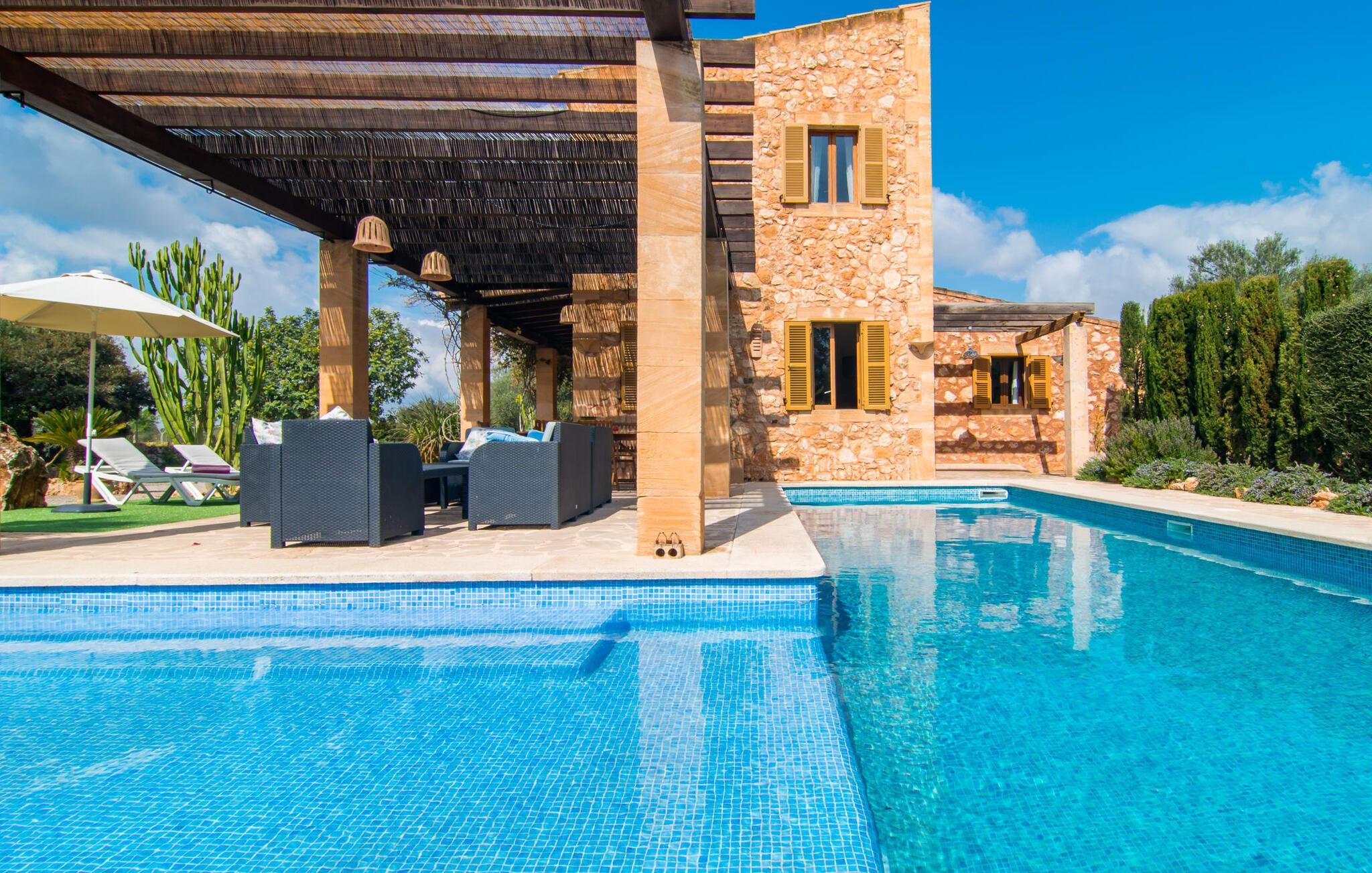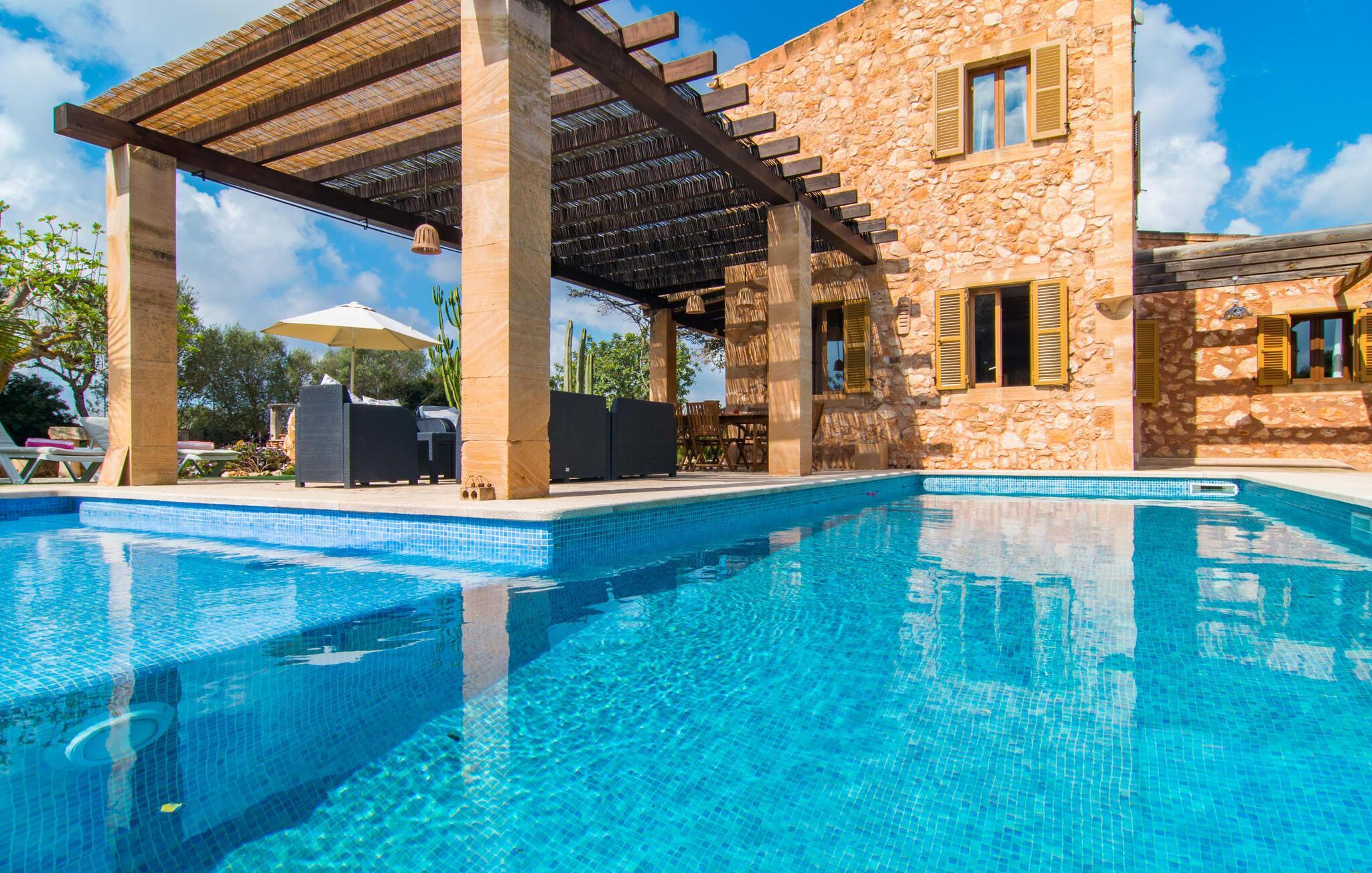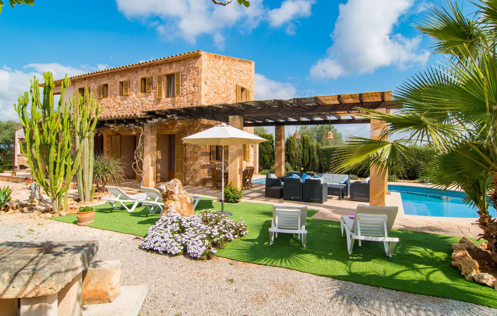 Man könnte fast glauben, dass dieses safrangelbe mediterrane Villenanwesen mit seinen Oliven-, Feigen- und Johannisbrotbäumen, seinen Palmen, Zypressen und Kakteen aus der fruchtbaren Erde von Campos selbst entstanden sei. Neu erbaut im Jahr 2015, so ehrlich, unkompliziert und sonnengereift wie ein guter Wein, stellenweise etwas prickelnd und voller Charakter, schon der erste Vorgeschmack macht Lust auf mehr. Ein einzigartiger halbmondförmiger Pool rund um die überdachte Terrasse bietet alles Wasser, das Sie für Ihr tägliches Bad benötigen – ein echter Hingucker! Hier können Sie den Tag gemütlich ausklingen lassen – bei einem späten Frühstück, einer Zeitschrift oder einem Glas Wein – während die Kinder sicher um Sie herum planschen. Man könnte fast von einem Urlaub im Schwimmbad statt am Pool sprechen und könnte in Versuchung geraten, direkt aus einem der Fenster direkt ins kühle Nass zu springen (aber bitte nicht – das ist leichtsinnig und man verletzt sich). )...aber „Ca Na Carmen“ sorgt dafür, dass Sie nicht den Kopf verlieren.