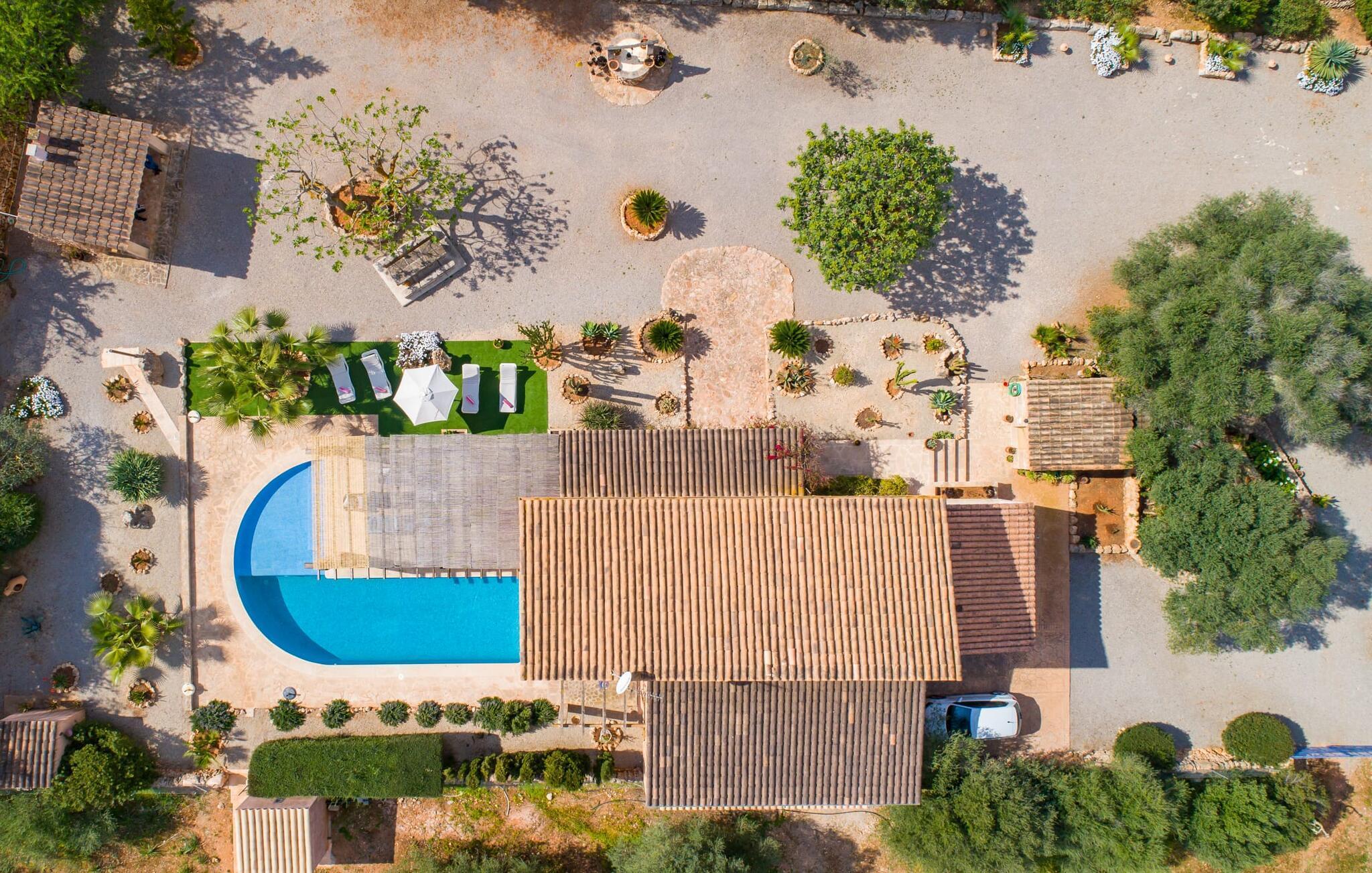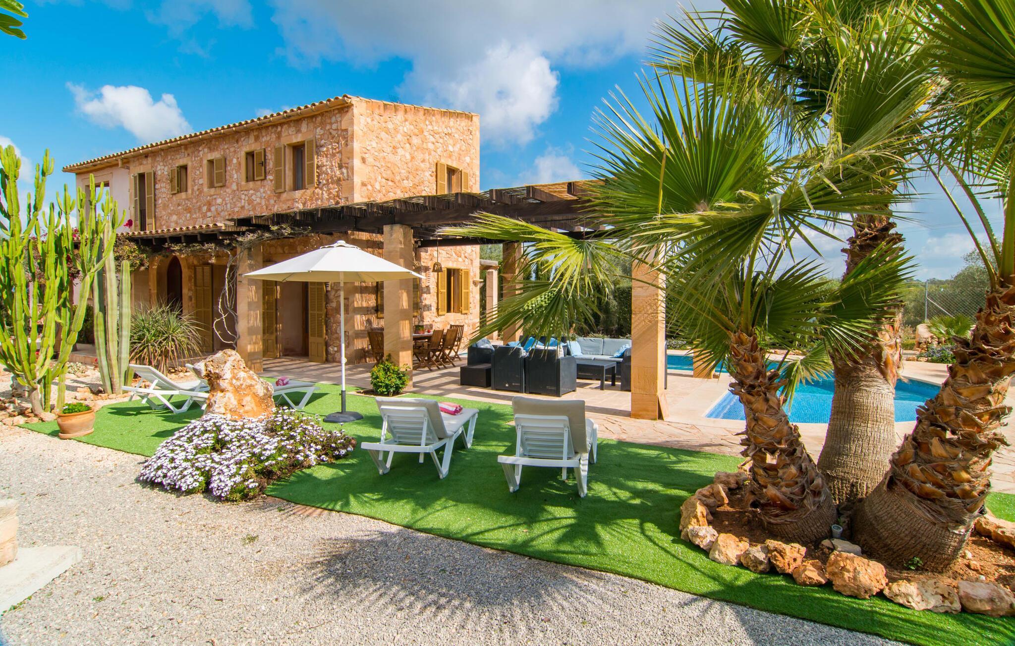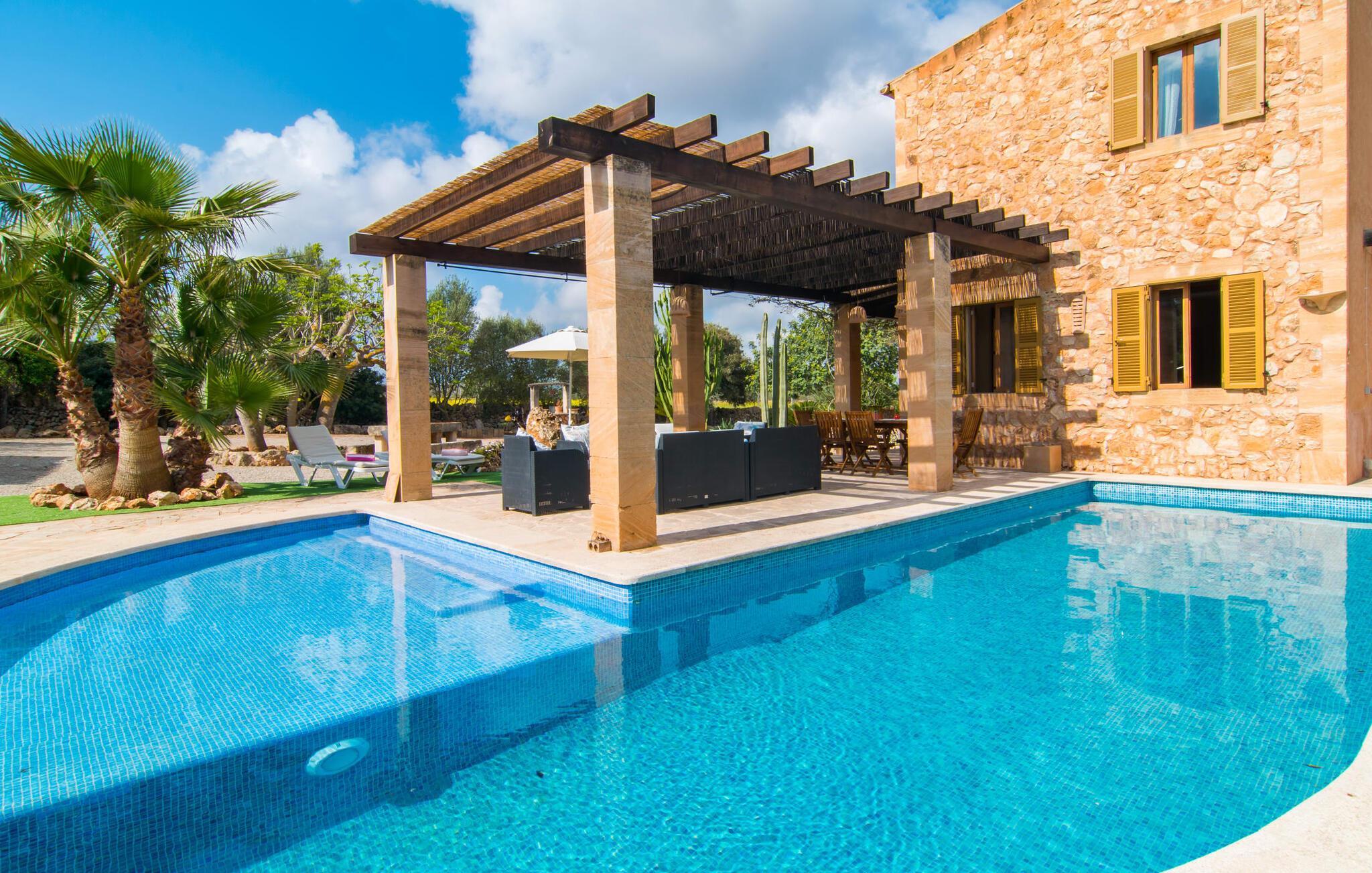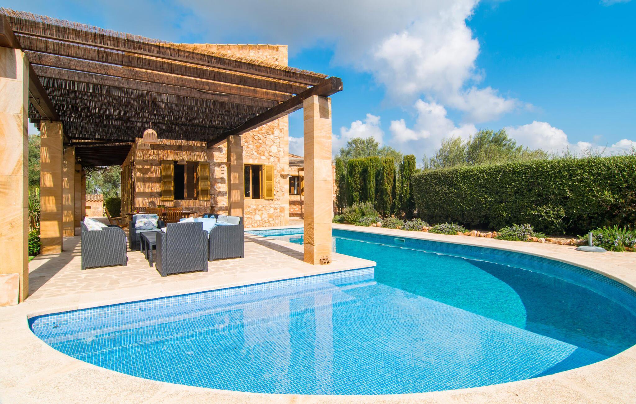 Man könnte fast glauben, dass dieses safrangelbe mediterrane Villenanwesen mit seinen Oliven-, Feigen- und Johannisbrotbäumen, seinen Palmen, Zypressen und Kakteen aus der fruchtbaren Erde von Campos selbst entstanden sei. Neu erbaut im Jahr 2015, so ehrlich, unkompliziert und sonnengereift wie ein guter Wein, stellenweise etwas prickelnd und voller Charakter, schon der erste Vorgeschmack macht Lust auf mehr. Ein einzigartiger halbmondförmiger Pool rund um die überdachte Terrasse bietet alles Wasser, das Sie für Ihr tägliches Bad benötigen – ein echter Hingucker! Hier können Sie den Tag gemütlich ausklingen lassen – bei einem späten Frühstück, einer Zeitschrift oder einem Glas Wein – während die Kinder sicher um Sie herum planschen. Man könnte fast von einem Urlaub im Schwimmbad statt am Pool sprechen und könnte in Versuchung geraten, direkt aus einem der Fenster direkt ins kühle Nass zu springen (aber bitte nicht – das ist leichtsinnig und man verletzt sich). )...aber „Ca Na Carmen“ sorgt dafür, dass Sie nicht den Kopf verlieren.