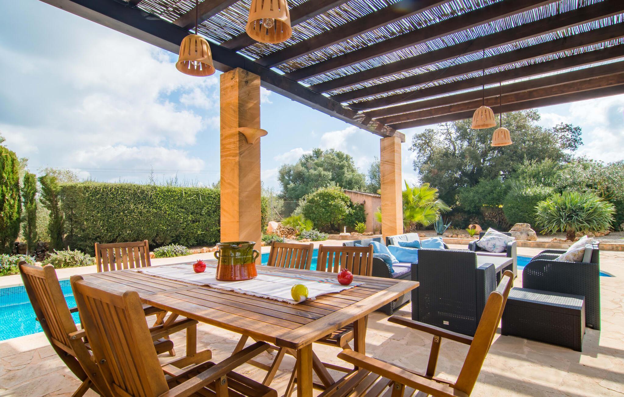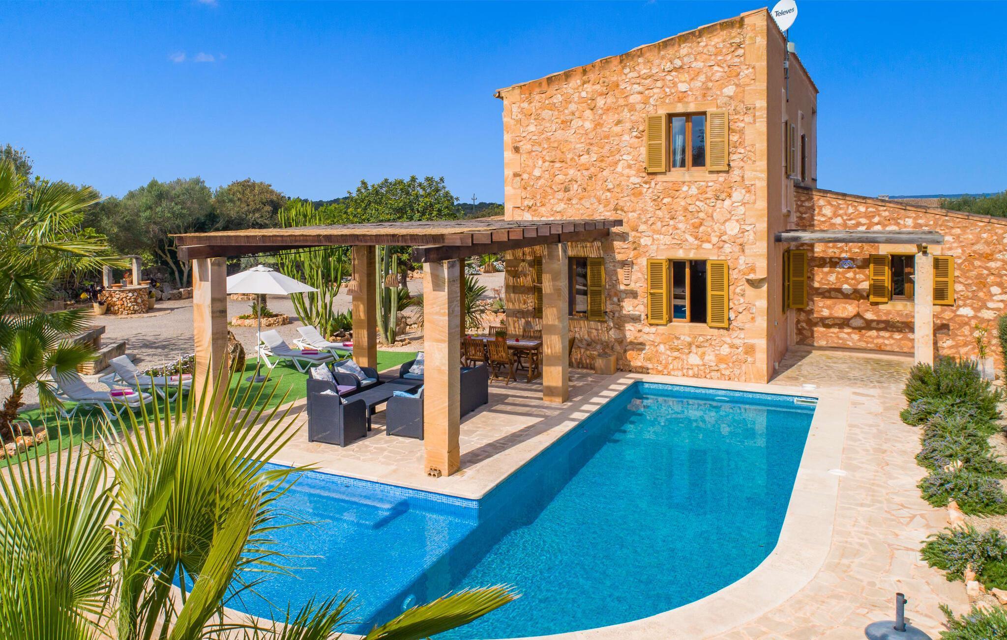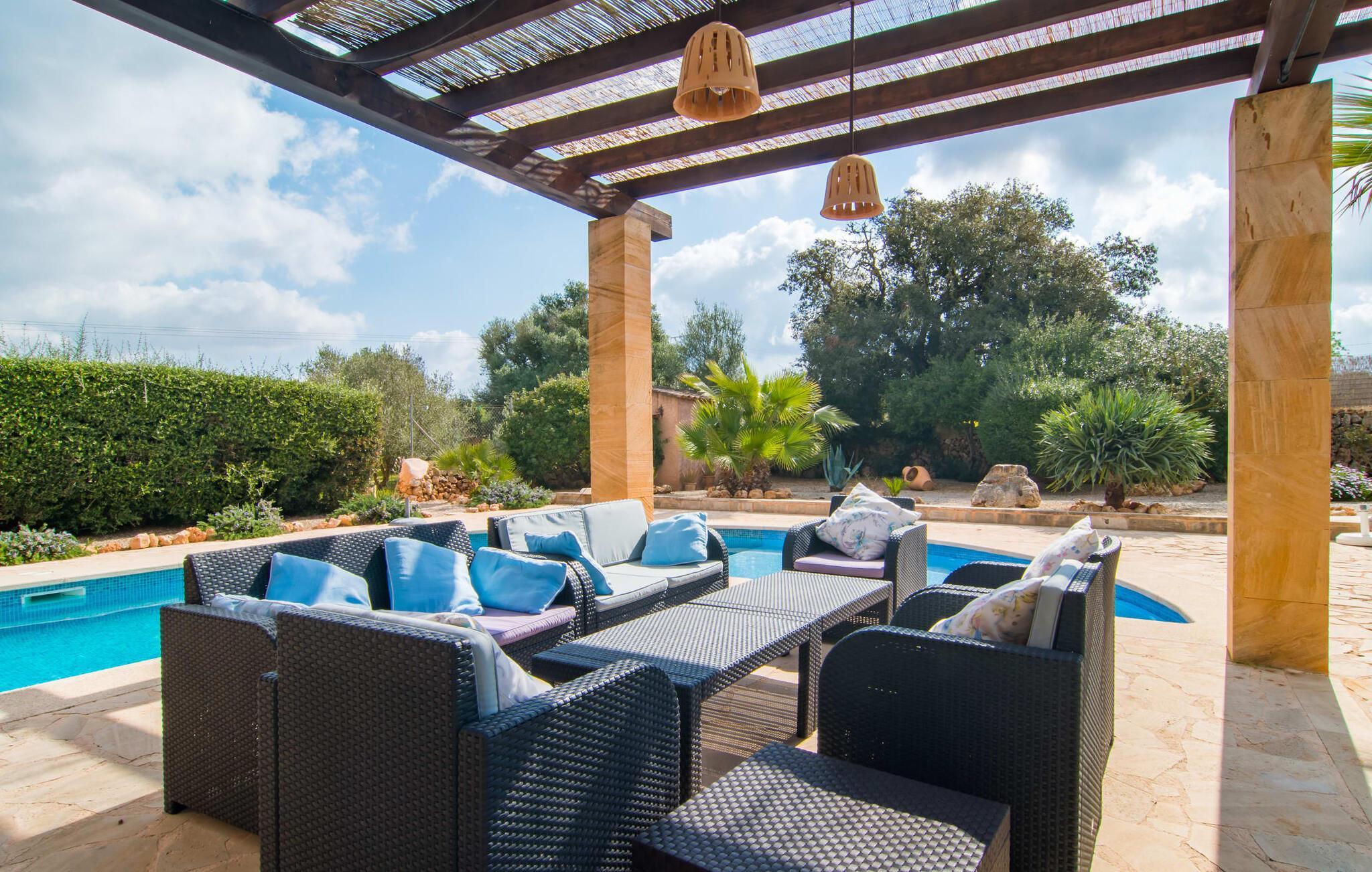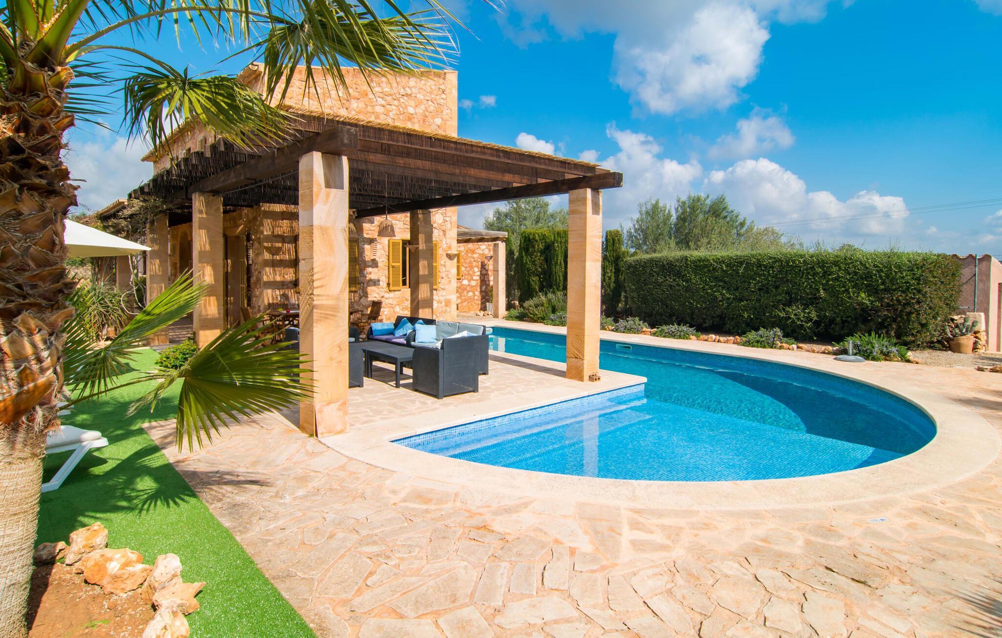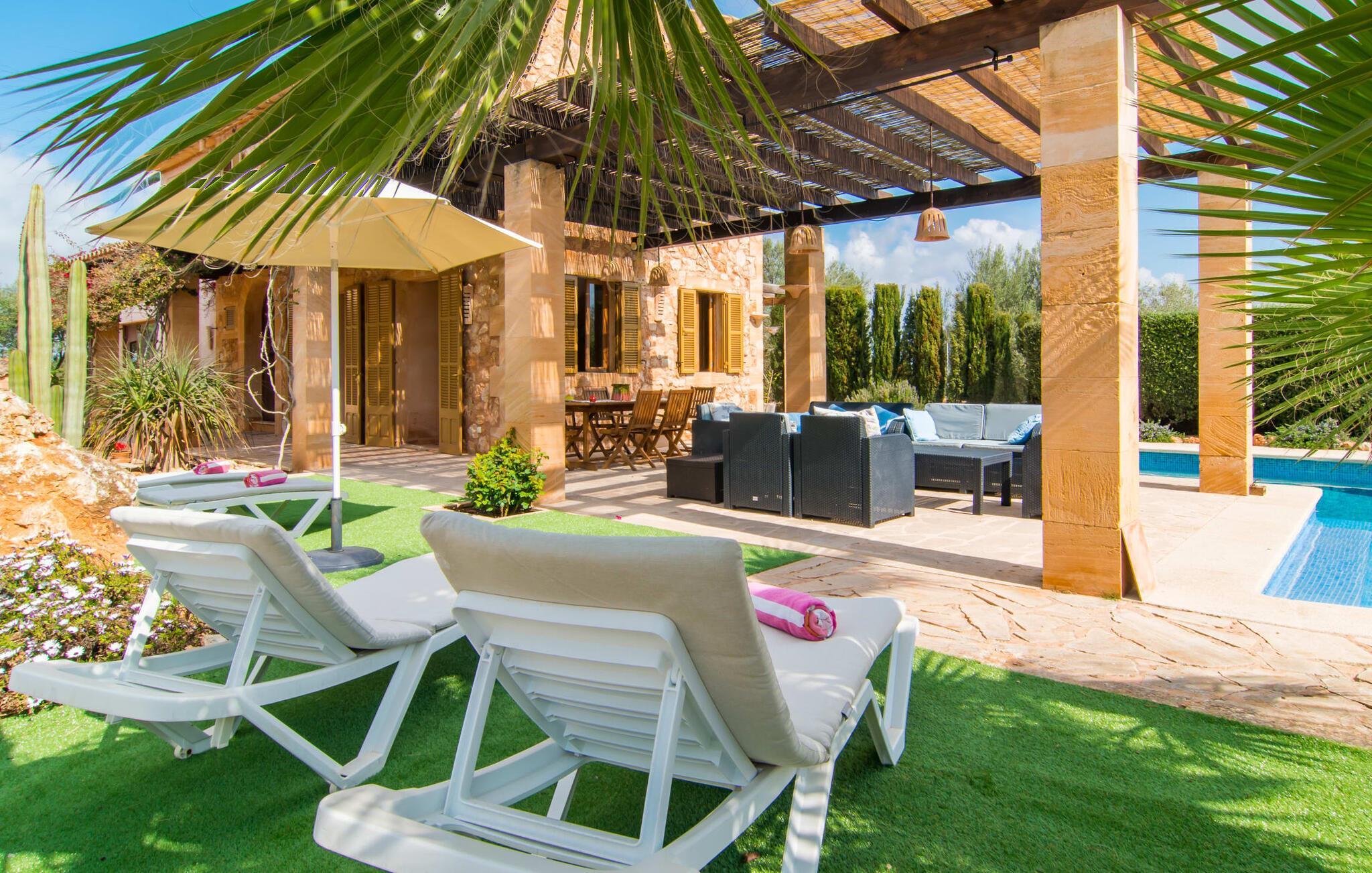 Man könnte fast glauben, dass dieses safrangelbe mediterrane Villenanwesen mit seinen Oliven-, Feigen- und Johannisbrotbäumen, seinen Palmen, Zypressen und Kakteen aus der fruchtbaren Erde von Campos selbst entstanden sei. Neu erbaut im Jahr 2015, so ehrlich, unkompliziert und sonnengereift wie ein guter Wein, stellenweise etwas prickelnd und voller Charakter, schon der erste Vorgeschmack macht Lust auf mehr. Ein einzigartiger halbmondförmiger Pool rund um die überdachte Terrasse bietet alles Wasser, das Sie für Ihr tägliches Bad benötigen – ein echter Hingucker! Hier können Sie den Tag gemütlich ausklingen lassen – bei einem späten Frühstück, einer Zeitschrift oder einem Glas Wein – während die Kinder sicher um Sie herum planschen. Man könnte fast von einem Urlaub im Schwimmbad statt am Pool sprechen und könnte in Versuchung geraten, direkt aus einem der Fenster direkt ins kühle Nass zu springen (aber bitte nicht – das ist leichtsinnig und man verletzt sich). )...aber „Ca Na Carmen“ sorgt dafür, dass Sie nicht den Kopf verlieren.
