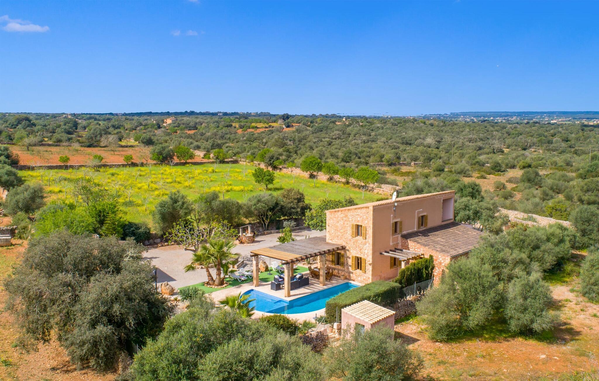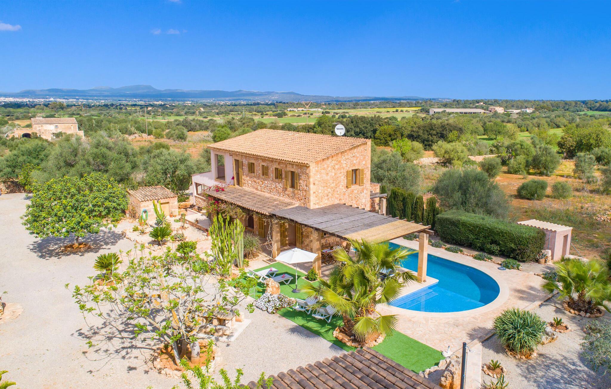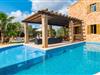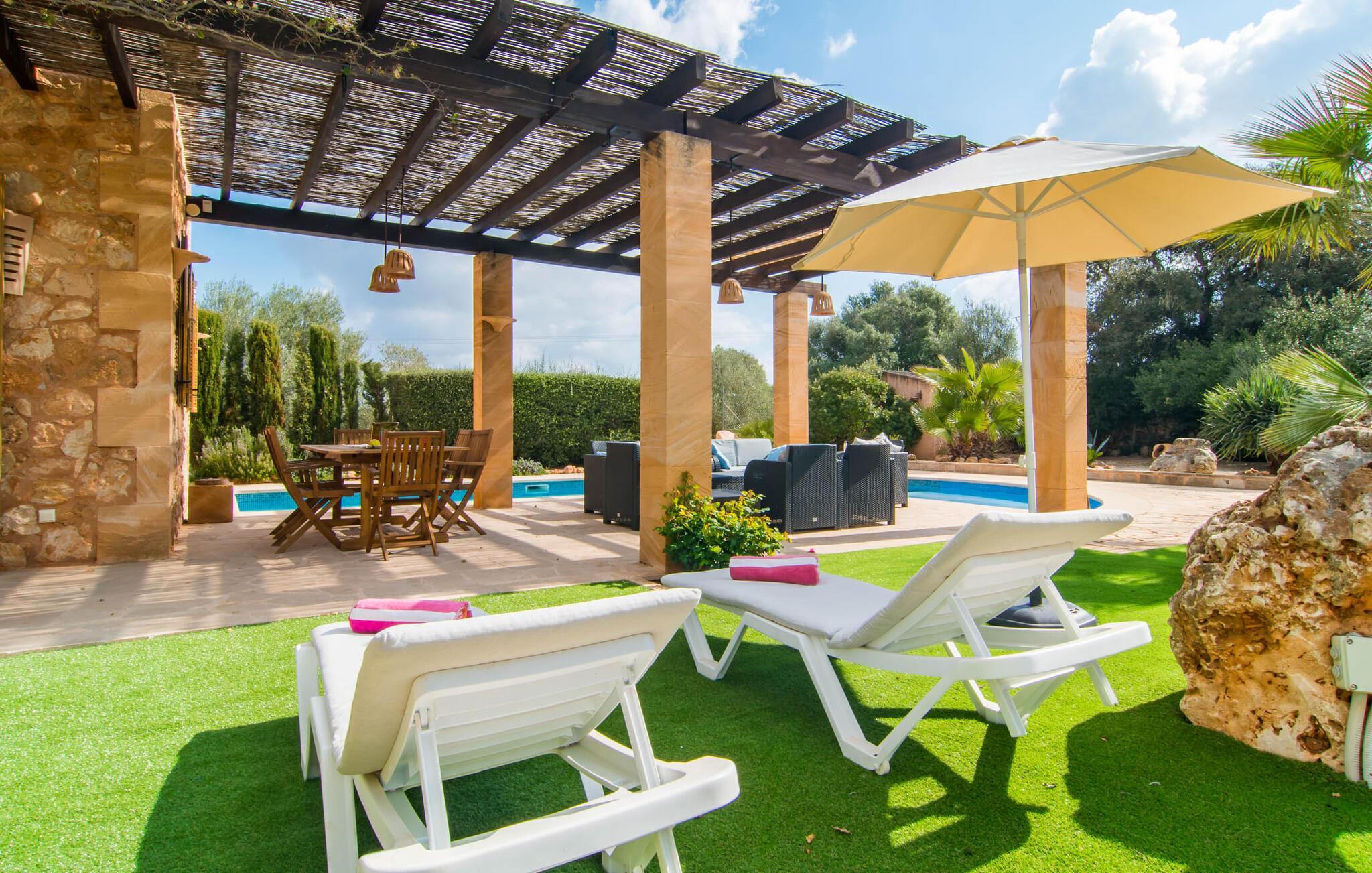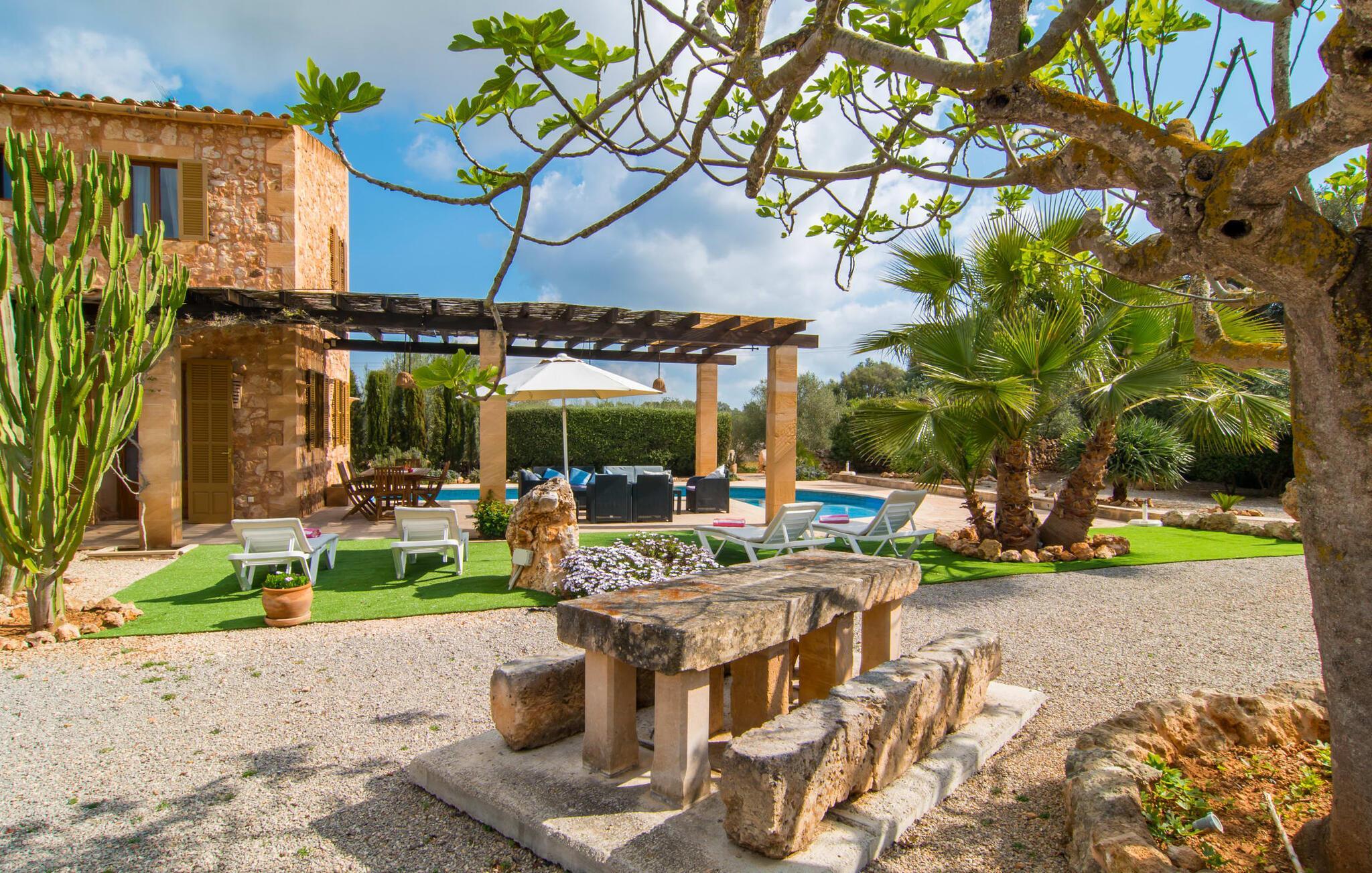Man könnte fast glauben, dass dieses safrangelbe mediterrane Villenanwesen mit seinen Oliven-, Feigen- und Johannisbrotbäumen, seinen Palmen, Zypressen und Kakteen aus der fruchtbaren Erde von Campos selbst entstanden sei. Neu erbaut im Jahr 2015, so ehrlich, unkompliziert und sonnengereift wie ein guter Wein, stellenweise etwas prickelnd und voller Charakter, schon der erste Vorgeschmack macht Lust auf mehr. Ein einzigartiger halbmondförmiger Pool rund um die überdachte Terrasse bietet alles Wasser, das Sie für Ihr tägliches Bad benötigen – ein echter Hingucker! Hier können Sie den Tag gemütlich ausklingen lassen – bei einem späten Frühstück, einer Zeitschrift oder einem Glas Wein – während die Kinder sicher um Sie herum planschen. Man könnte fast von einem Urlaub im Schwimmbad statt am Pool sprechen und könnte in Versuchung geraten, direkt aus einem der Fenster direkt ins kühle Nass zu springen (aber bitte nicht – das ist leichtsinnig und man verletzt sich). )...aber „Ca Na Carmen“ sorgt dafür, dass Sie nicht den Kopf verlieren.