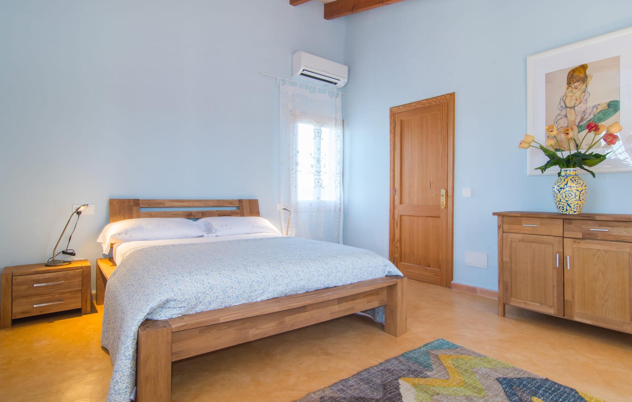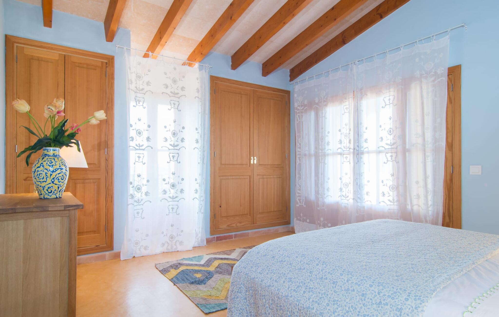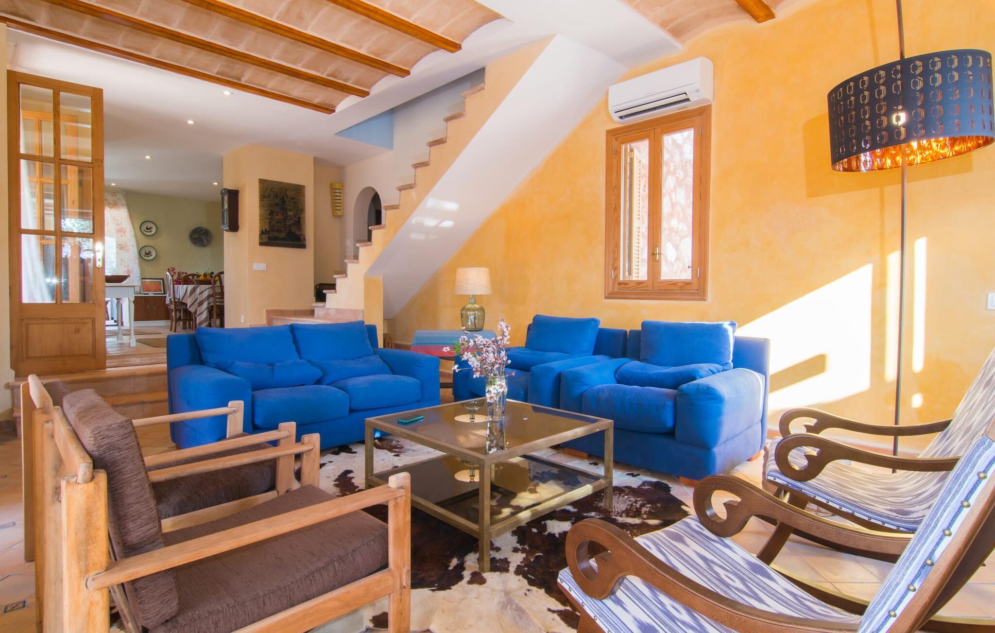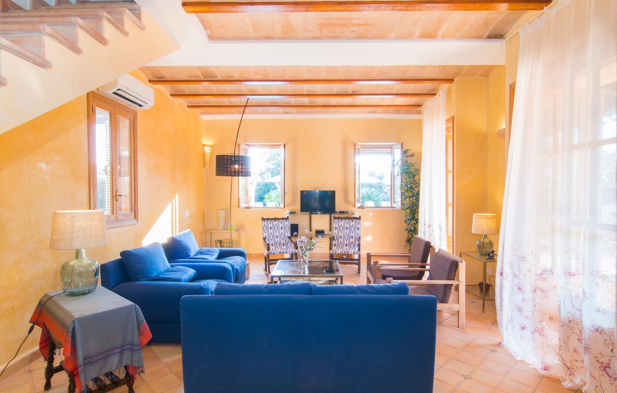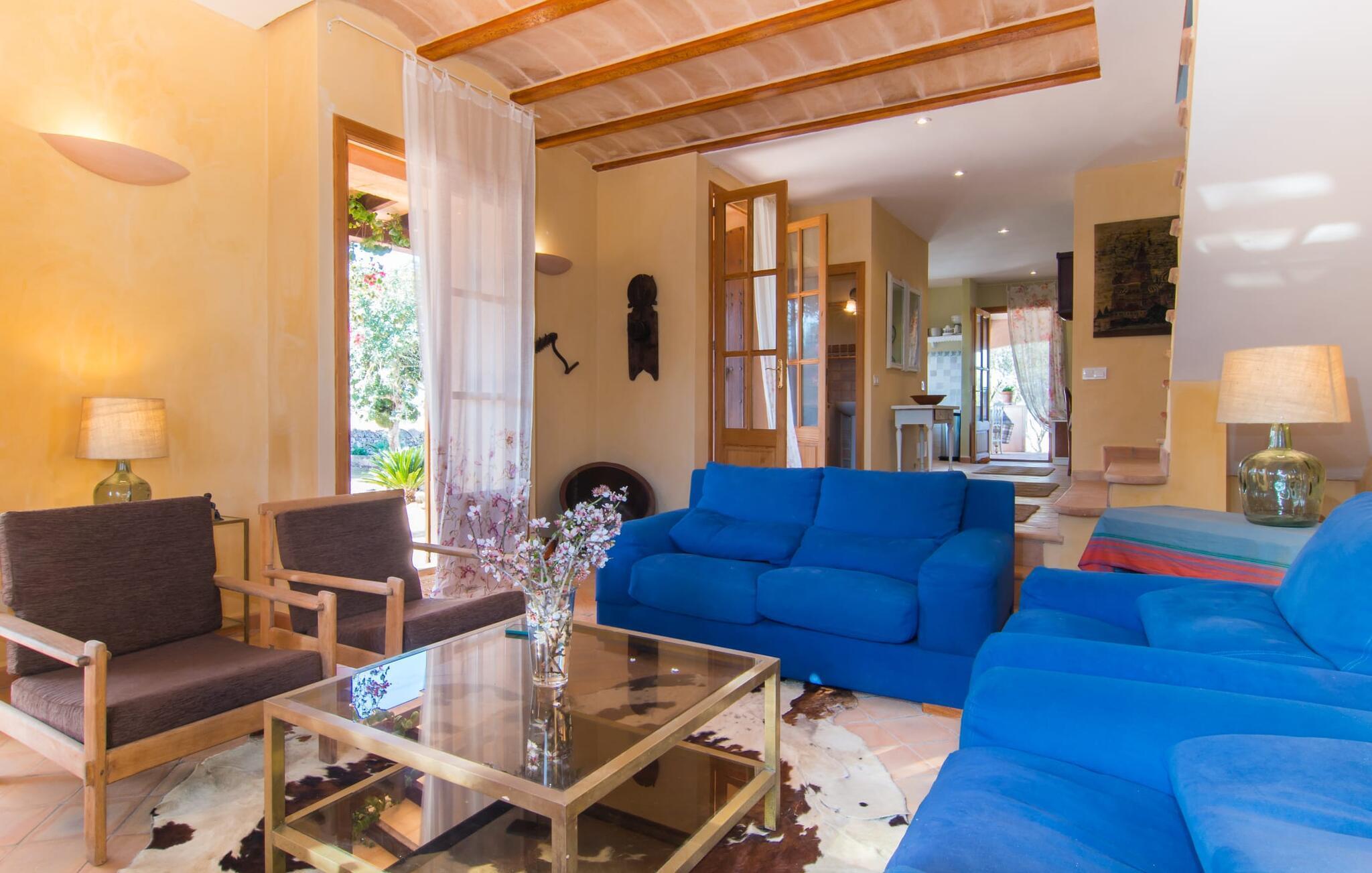 Wie eine Frucht, die hält, was ihre äußere Schale verspricht, enttäuscht auch das Innere nicht: mallorquinisch, bodenständig, sonnenhell und blumig. Eine frische Brise scheint durch das Haus zu wehen und luftige Vorhänge verleihen dem Raum eine leichte Note. Der großzügige, offene Wohn-, Koch- und Essbereich umgibt gemütlich leuchtend blaue Sofas, die zum Eintauchen in einen Filmabend einladen. Natürlich können Sie auch in den angenehm schlichten Schlafzimmern mit Massivholzbetten ins Reich der Träume abdriften; Die Schlafzimmer sind wahlweise mit dunkleren oder helleren Möbeln eingerichtet und eines der oberen Schlafzimmer verfügt über direkten Zugang zu einem geschützten Balkon mit herrlicher Aussicht über die Bäume bis zu den dahinter liegenden Bergen. Wer hier schläft, kann die Tür ruhig offen lassen. Die Badezimmer – eines im Erdgeschoss und eines im Obergeschoss – werden jeweils von zwei Schlafzimmern geteilt. Bleibt nur noch die moderne, gut ausgestattete Küche mit eigenem Plätzchen an der Sonne zu erwähnen, an deren Wänden knackig-frisches Gemüse vom Wochenmarkt in Campos appetitlich hängt: ein Paradies für Vegetarier und Rohkost-Fans – wenn das so wäre Da wäre nicht der fantastische gemauerte Grill direkt vor der Tür, der geradezu danach schreit, benutzt zu werden. Es wäre eine Schande, nicht... ¡Buen provencho!
