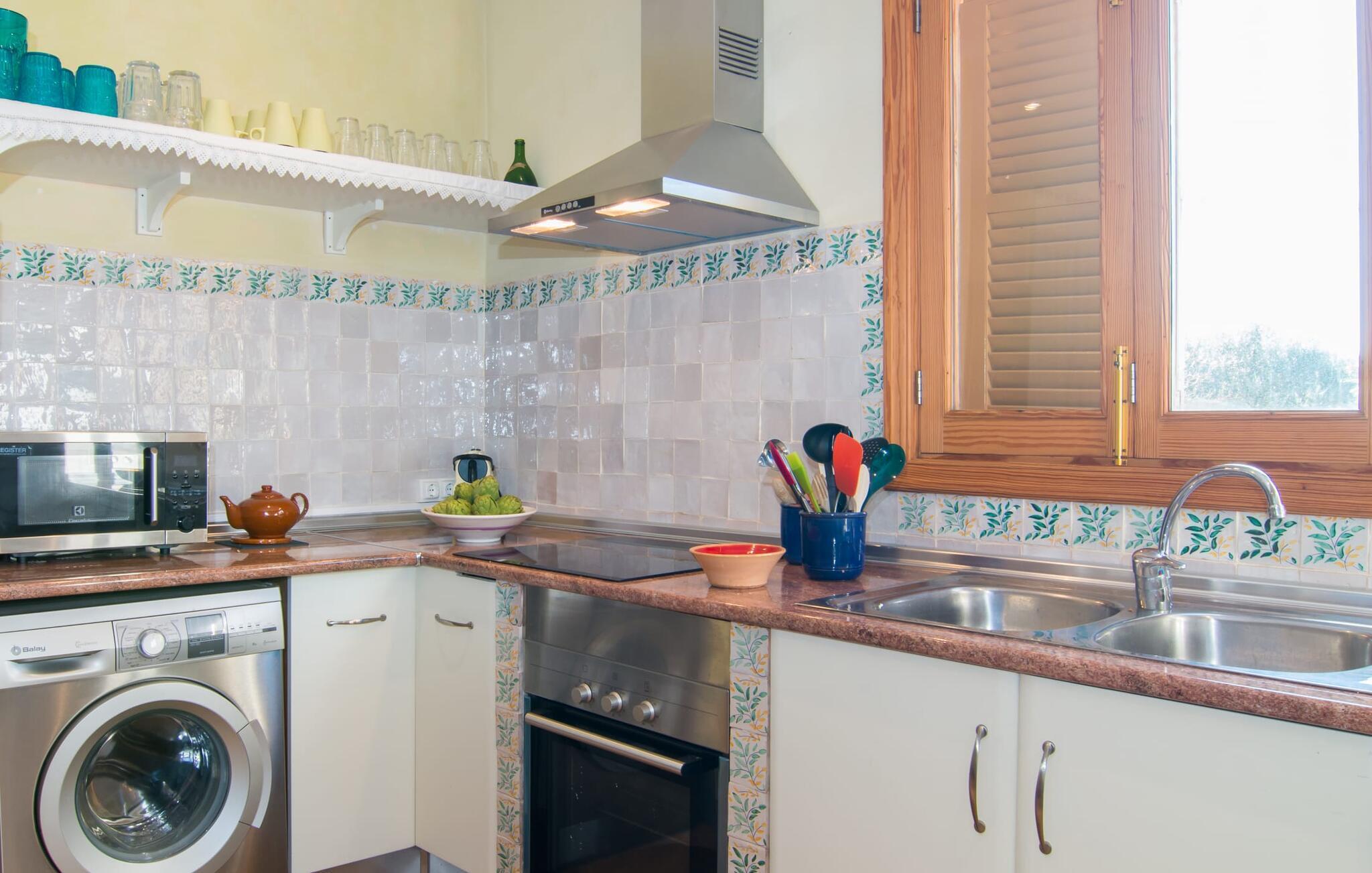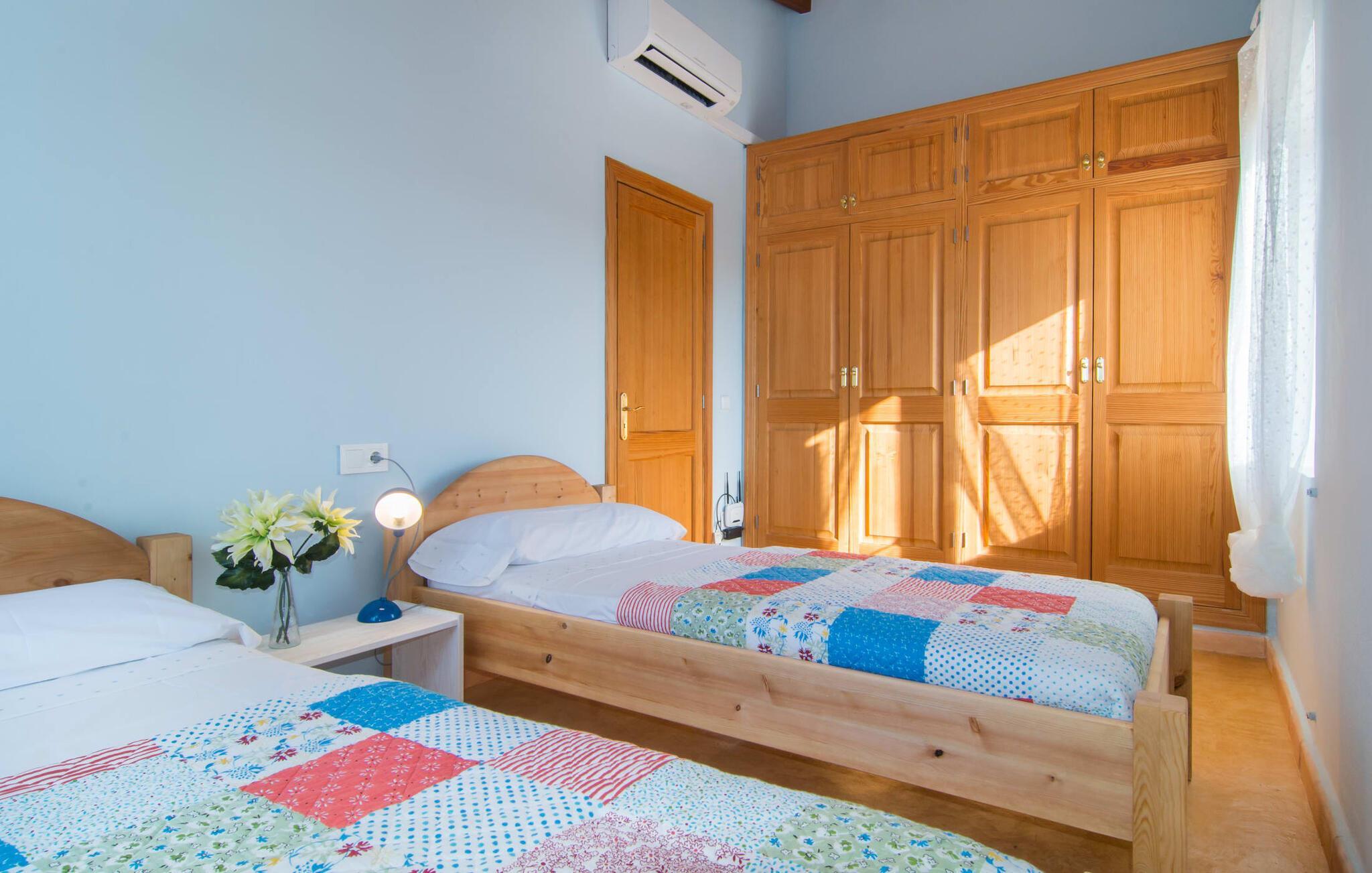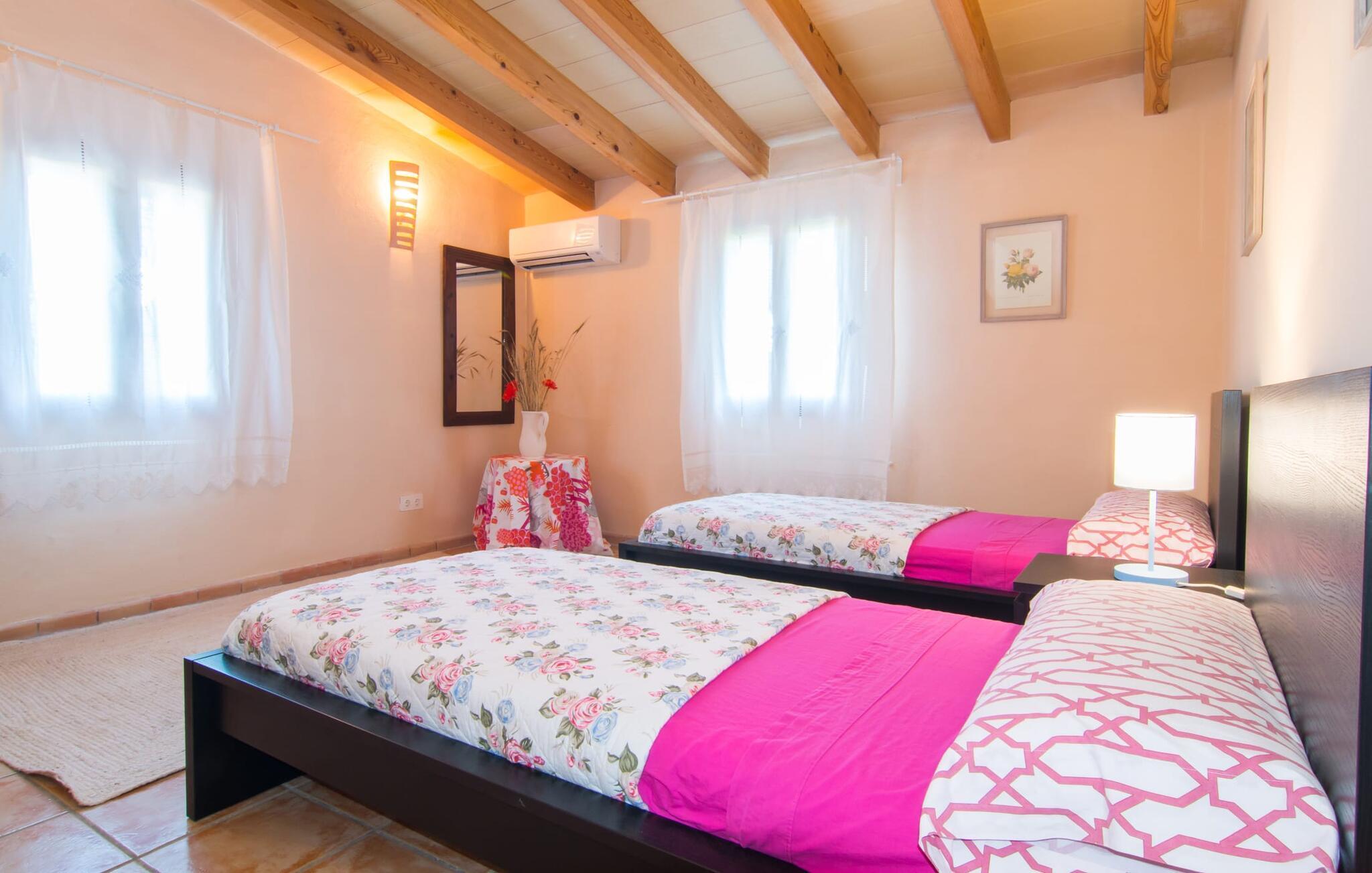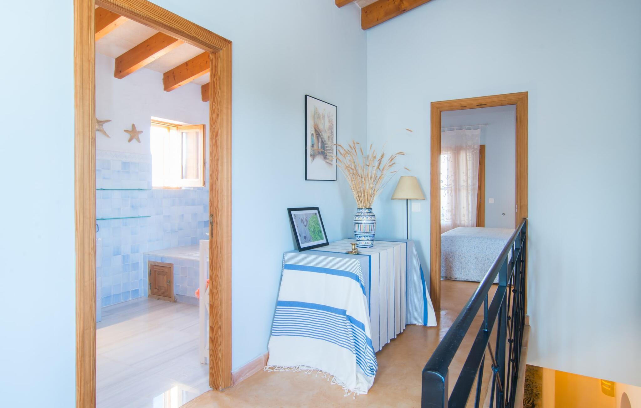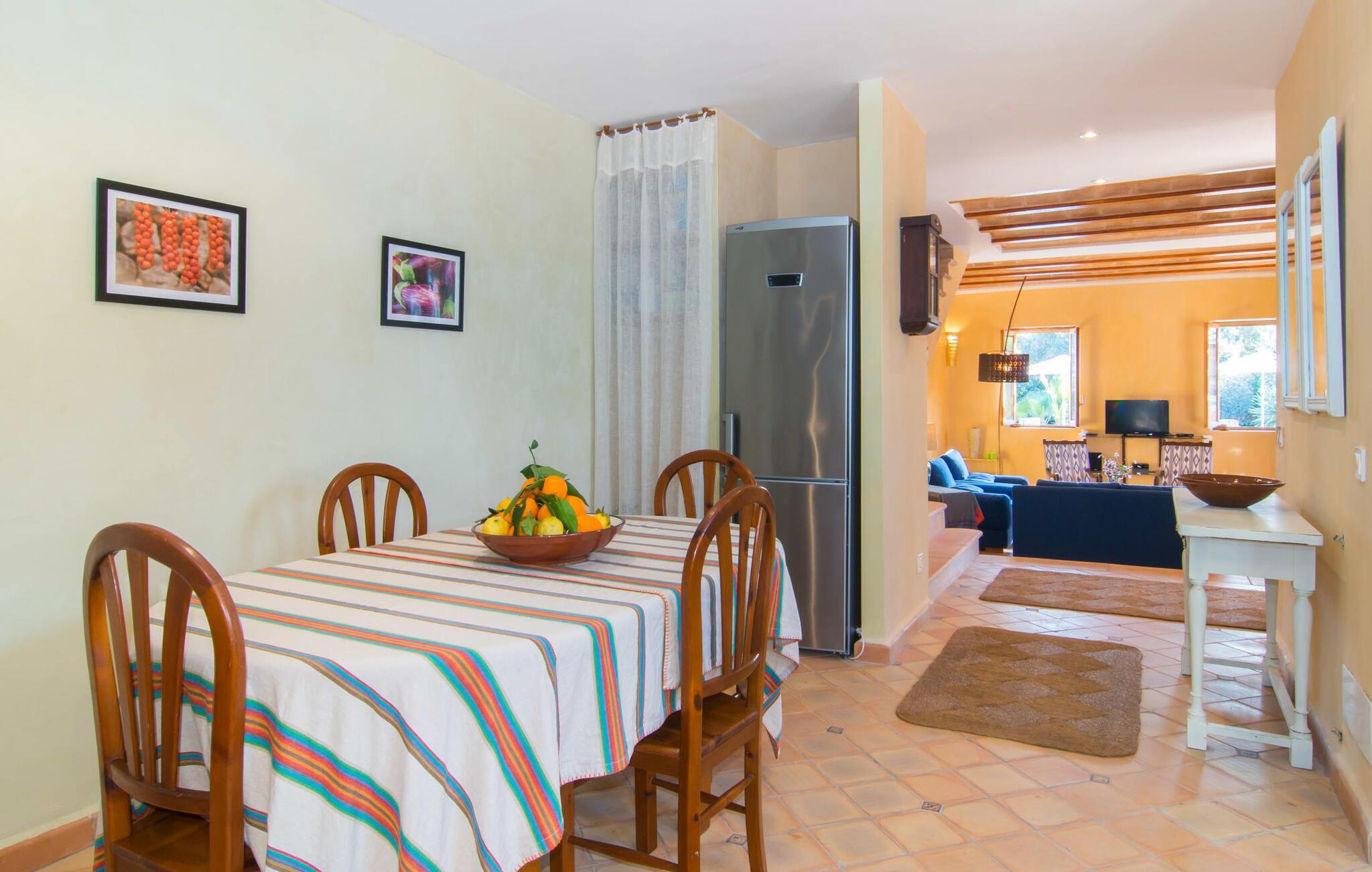 Wie eine Frucht, die hält, was ihre äußere Schale verspricht, enttäuscht auch das Innere nicht: mallorquinisch, bodenständig, sonnenhell und blumig. Eine frische Brise scheint durch das Haus zu wehen und luftige Vorhänge verleihen dem Raum eine leichte Note. Der großzügige, offene Wohn-, Koch- und Essbereich umgibt gemütlich leuchtend blaue Sofas, die zum Eintauchen in einen Filmabend einladen. Natürlich können Sie auch in den angenehm schlichten Schlafzimmern mit Massivholzbetten ins Reich der Träume abdriften; Die Schlafzimmer sind wahlweise mit dunkleren oder helleren Möbeln eingerichtet und eines der oberen Schlafzimmer verfügt über direkten Zugang zu einem geschützten Balkon mit herrlicher Aussicht über die Bäume bis zu den dahinter liegenden Bergen. Wer hier schläft, kann die Tür ruhig offen lassen. Die Badezimmer – eines im Erdgeschoss und eines im Obergeschoss – werden jeweils von zwei Schlafzimmern geteilt. Bleibt nur noch die moderne, gut ausgestattete Küche mit eigenem Plätzchen an der Sonne zu erwähnen, an deren Wänden knackig-frisches Gemüse vom Wochenmarkt in Campos appetitlich hängt: ein Paradies für Vegetarier und Rohkost-Fans – wenn das so wäre Da wäre nicht der fantastische gemauerte Grill direkt vor der Tür, der geradezu danach schreit, benutzt zu werden. Es wäre eine Schande, nicht... ¡Buen provencho!