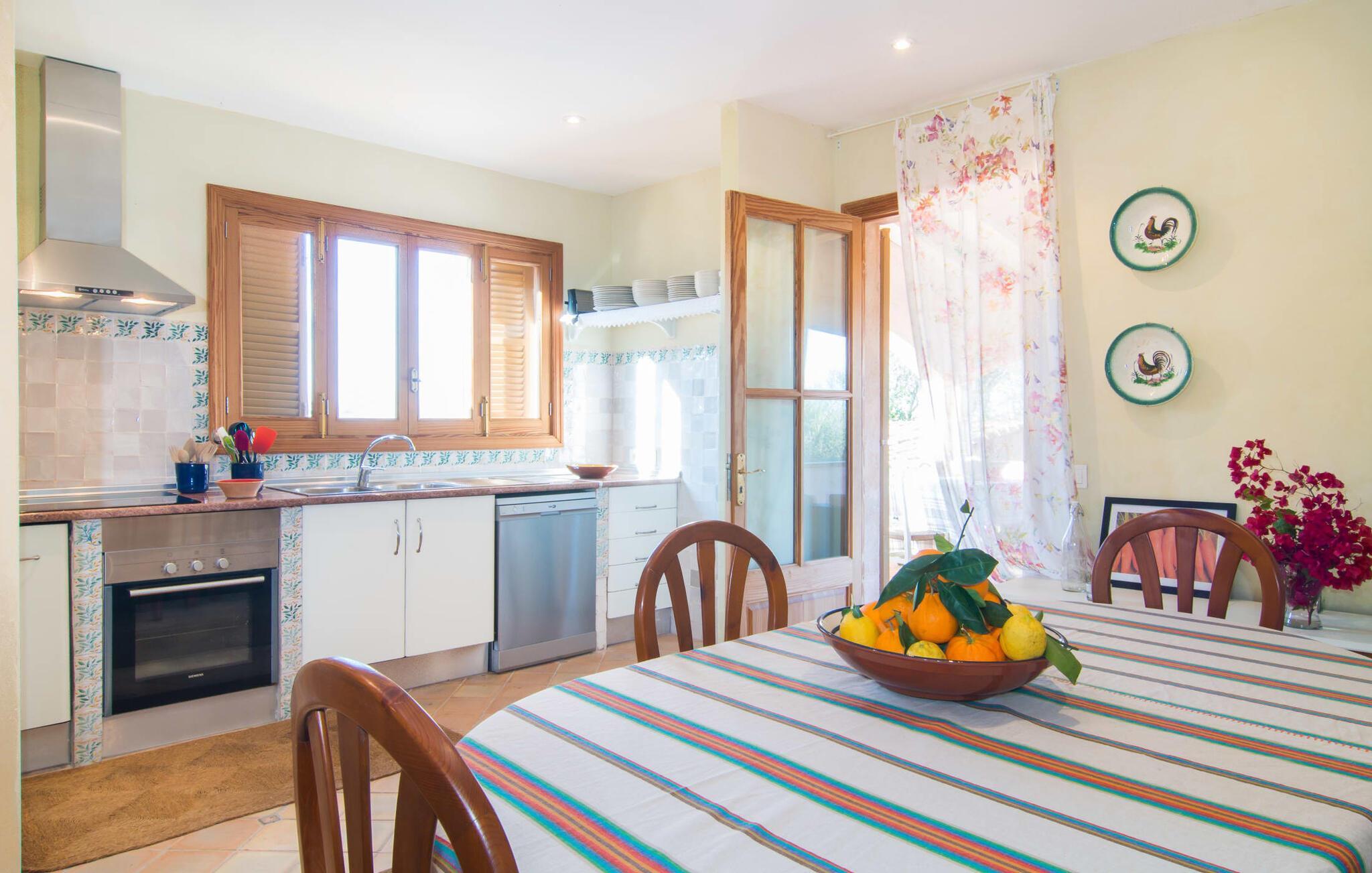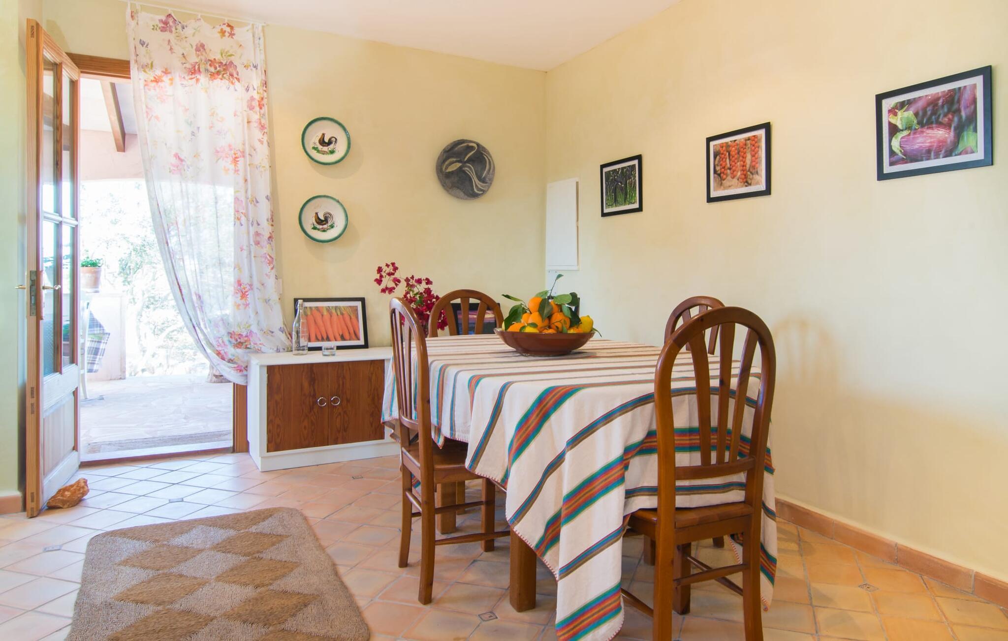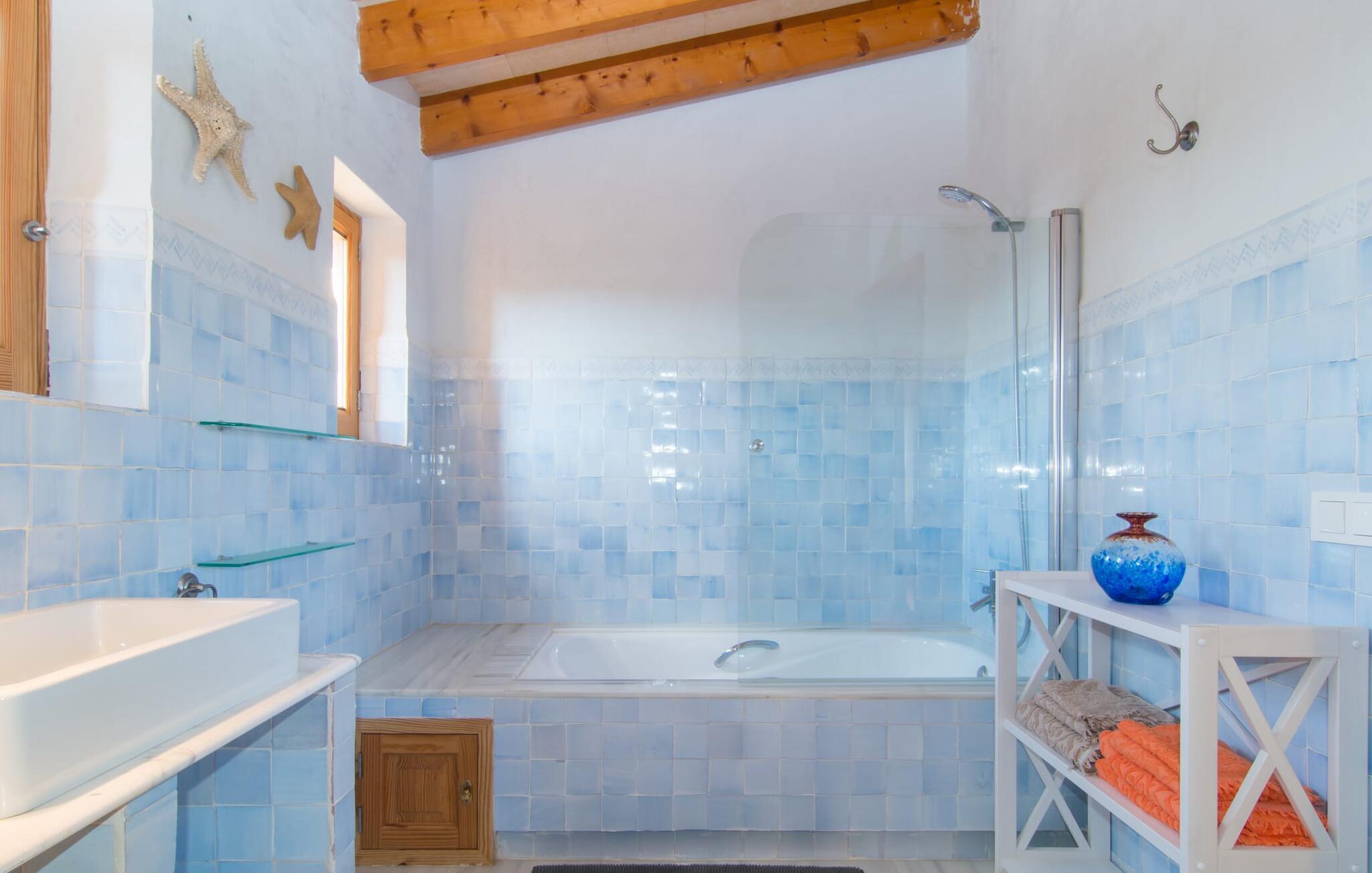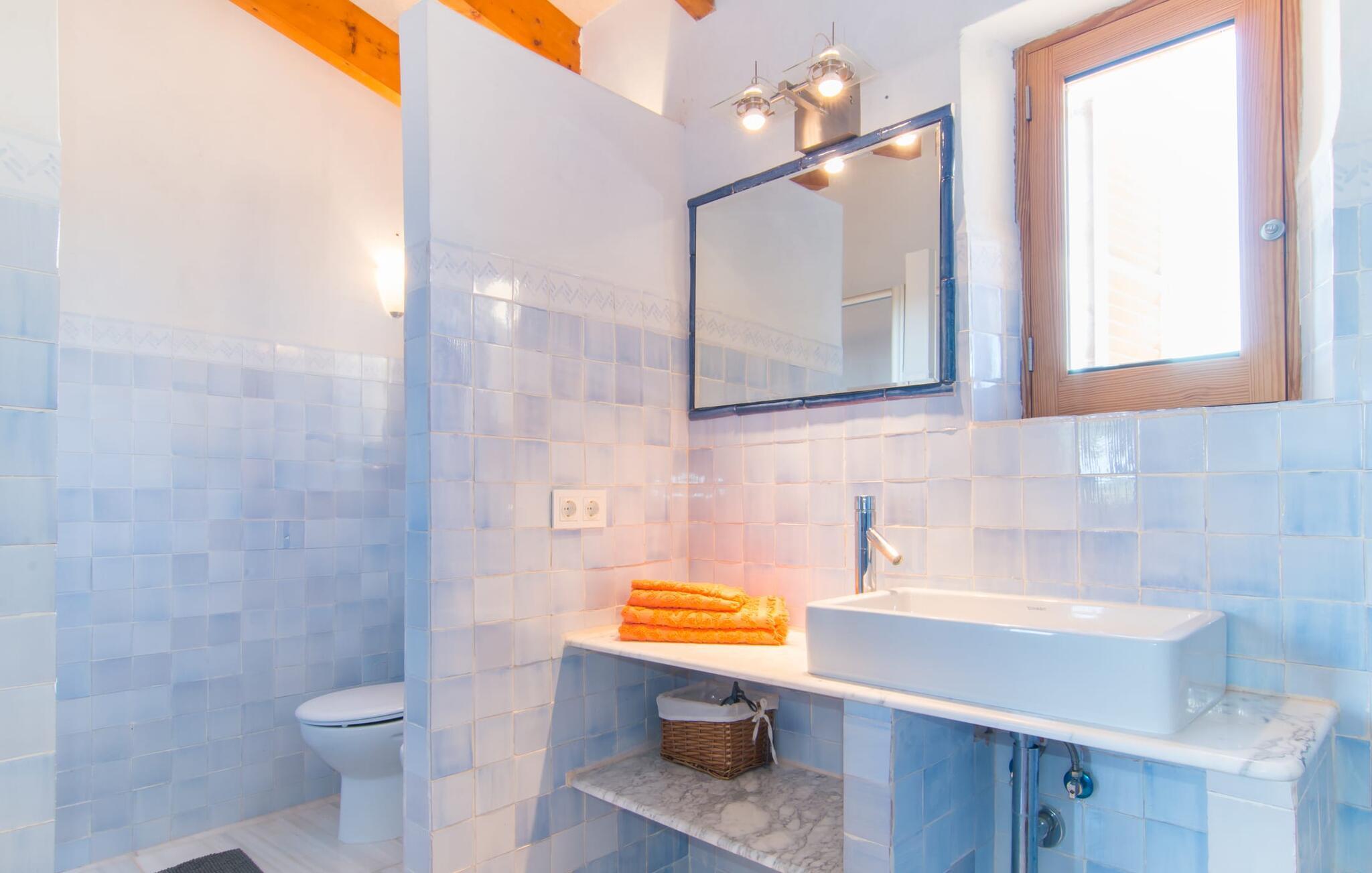 Wie eine Frucht, die hält, was ihre äußere Schale verspricht, enttäuscht auch das Innere nicht: mallorquinisch, bodenständig, sonnenhell und blumig. Eine frische Brise scheint durch das Haus zu wehen und luftige Vorhänge verleihen dem Raum eine leichte Note. Der großzügige, offene Wohn-, Koch- und Essbereich umgibt gemütlich leuchtend blaue Sofas, die zum Eintauchen in einen Filmabend einladen. Natürlich können Sie auch in den angenehm schlichten Schlafzimmern mit Massivholzbetten ins Reich der Träume abdriften; Die Schlafzimmer sind wahlweise mit dunkleren oder helleren Möbeln eingerichtet und eines der oberen Schlafzimmer verfügt über direkten Zugang zu einem geschützten Balkon mit herrlicher Aussicht über die Bäume bis zu den dahinter liegenden Bergen. Wer hier schläft, kann die Tür ruhig offen lassen. Die Badezimmer – eines im Erdgeschoss und eines im Obergeschoss – werden jeweils von zwei Schlafzimmern geteilt. Bleibt nur noch die moderne, gut ausgestattete Küche mit eigenem Plätzchen an der Sonne zu erwähnen, an deren Wänden knackig-frisches Gemüse vom Wochenmarkt in Campos appetitlich hängt: ein Paradies für Vegetarier und Rohkost-Fans – wenn das so wäre Da wäre nicht der fantastische gemauerte Grill direkt vor der Tür, der geradezu danach schreit, benutzt zu werden. Es wäre eine Schande, nicht... ¡Buen provencho!