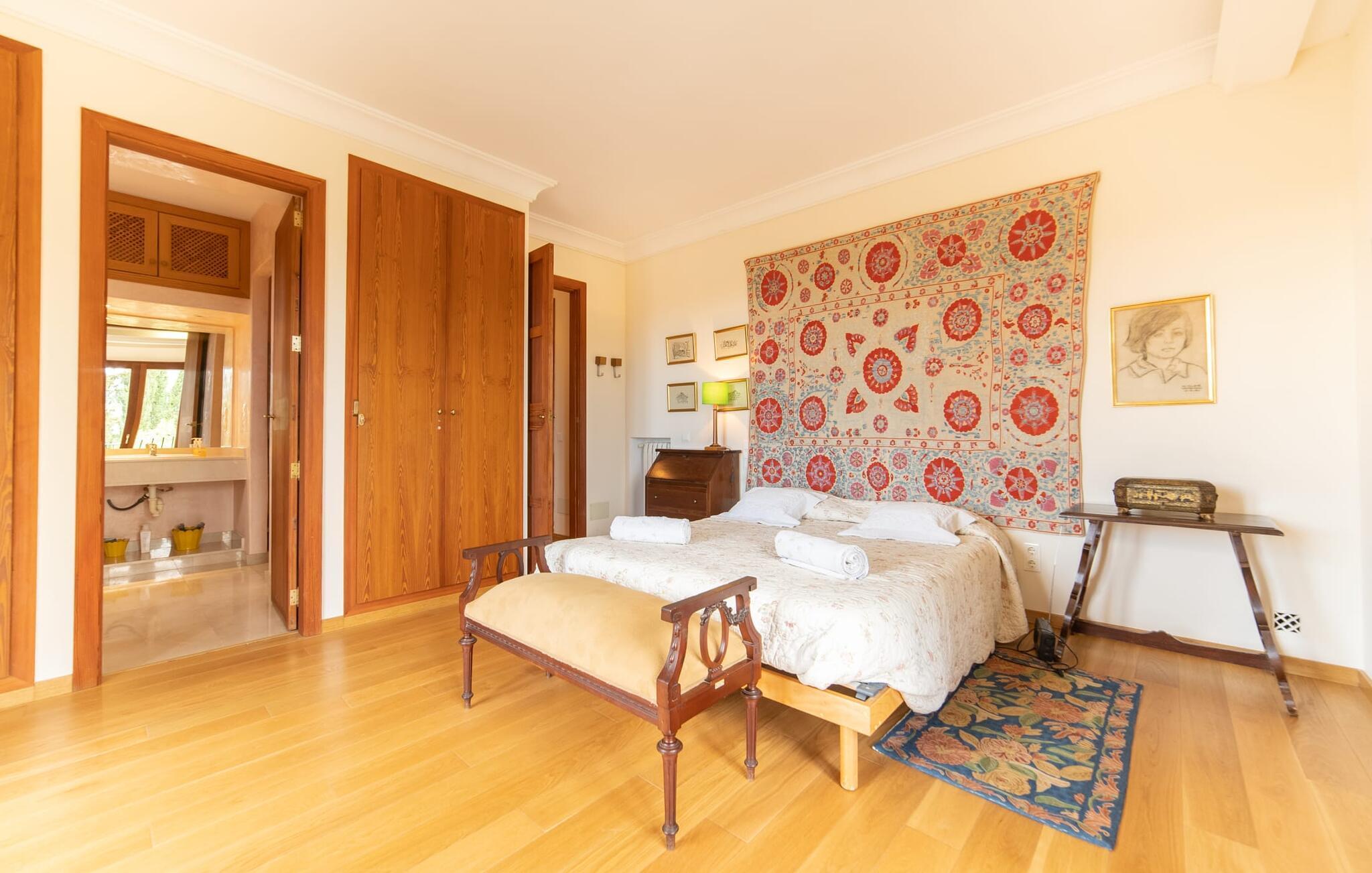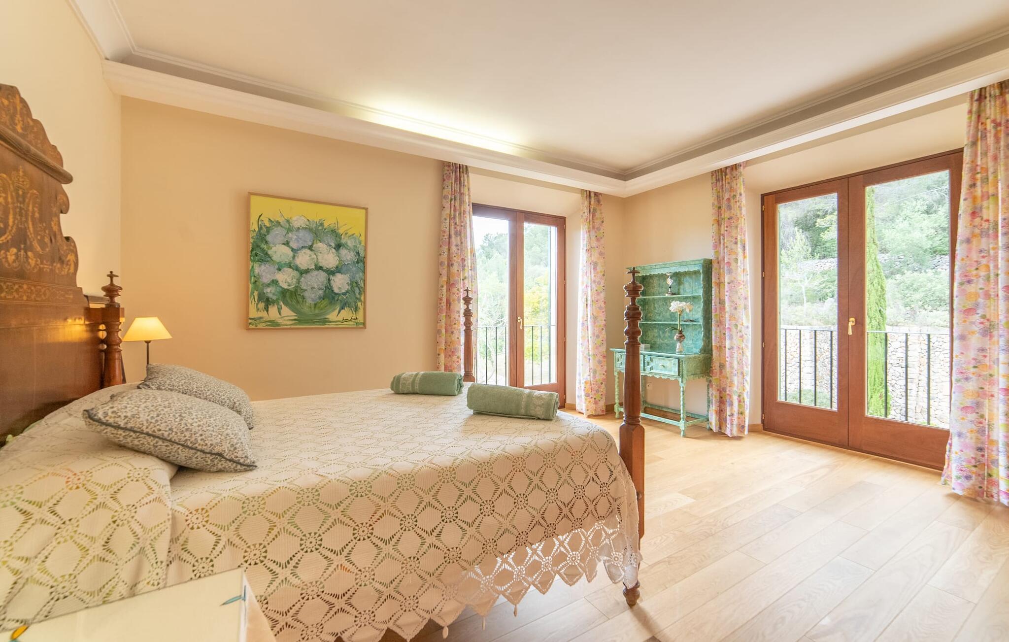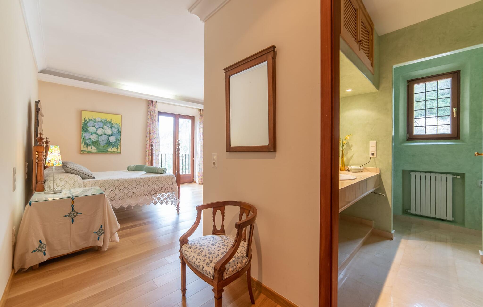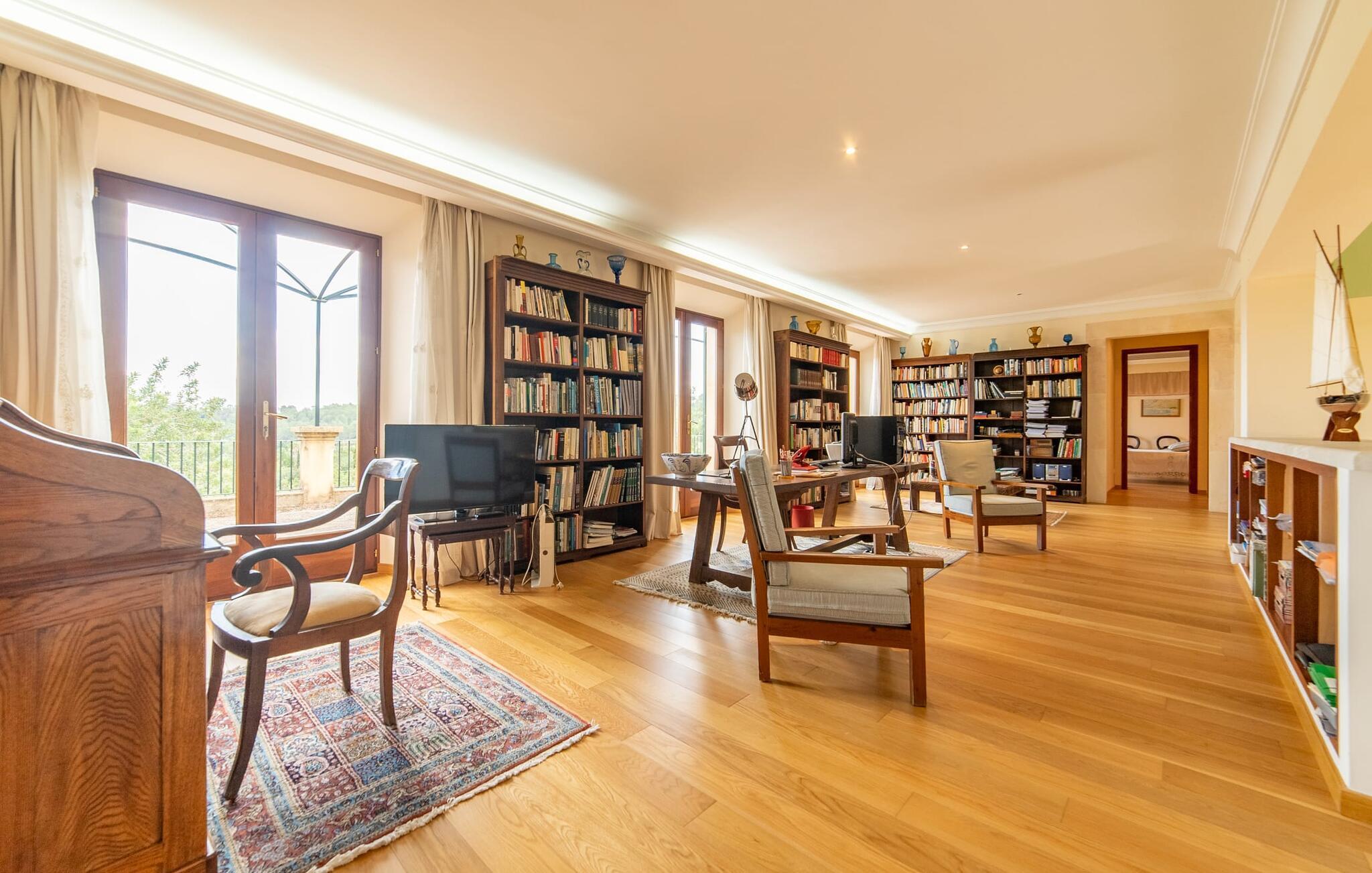 Von hier aus gelangt man direkt in das stilvolle und sehr großzügige Innere des Hauses. Der großzügige Wohnraum erstreckt sich über zwei Wohnebenen. Im Erdgeschoss gibt es ein großes Esszimmer und ein gemütliches Wohnzimmer mit Kamin und Klimaanlage. Auf dieser Etage befindet sich außerdem eine voll ausgestattete Küche, die ebenfalls viel Platz bietet, sowie ein gemütliches Schlafzimmer mit Doppelbett. Im Obergeschoss dieses Bauernhauses auf Mallorca befindet sich eine schöne Bibliothek. Außerdem gibt es noch die angenehmen vier Doppelzimmer, jeweils mit eigenem Bad. Im Obergeschoss gibt es außerdem eine große Terrasse, von der aus Sie eine spektakuläre Aussicht genießen können. „Ca Nostra de Esporlas“ – ein tolles Domizil für Naturliebhaber, Ruhesuchende und Individualisten!