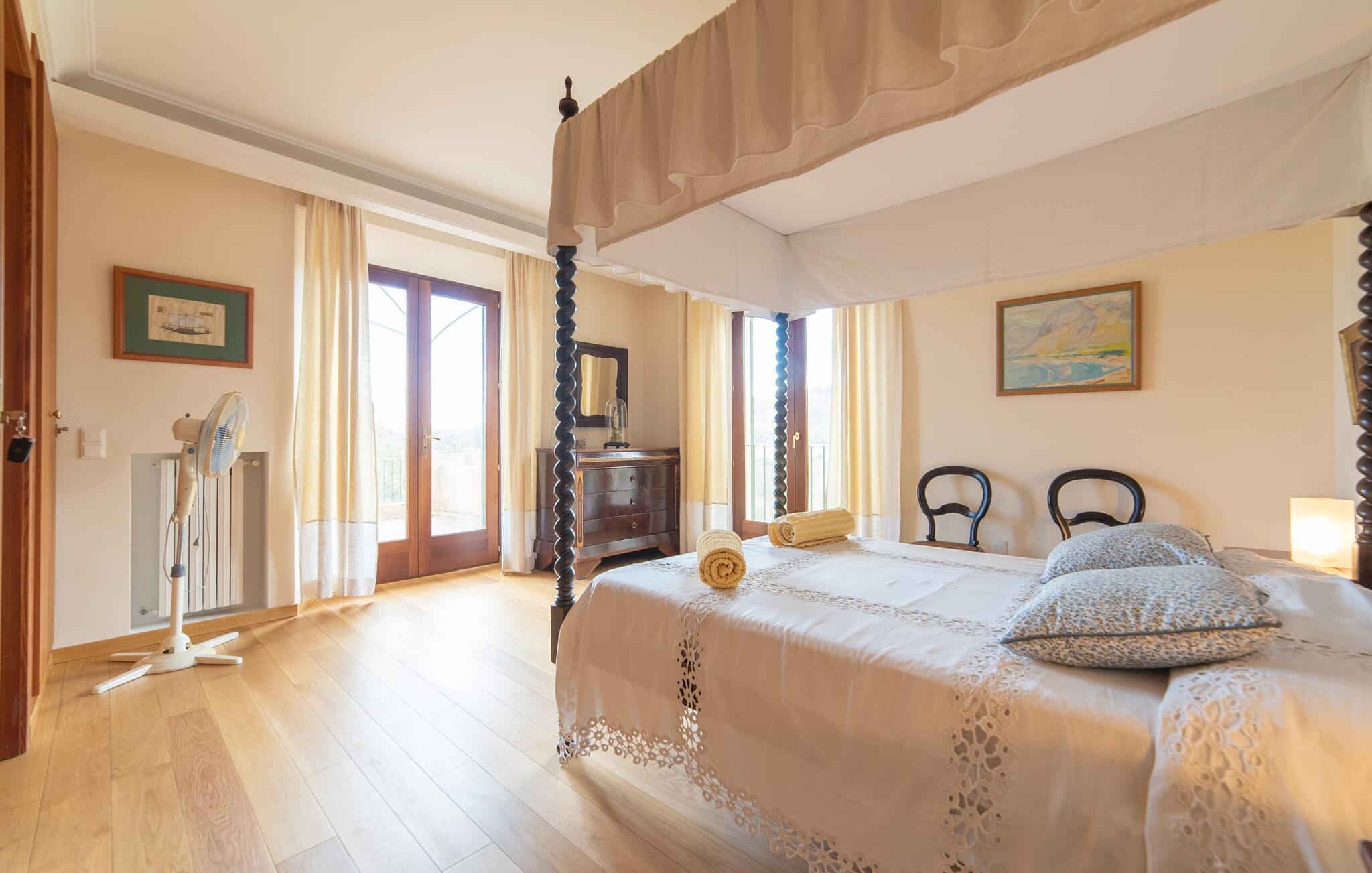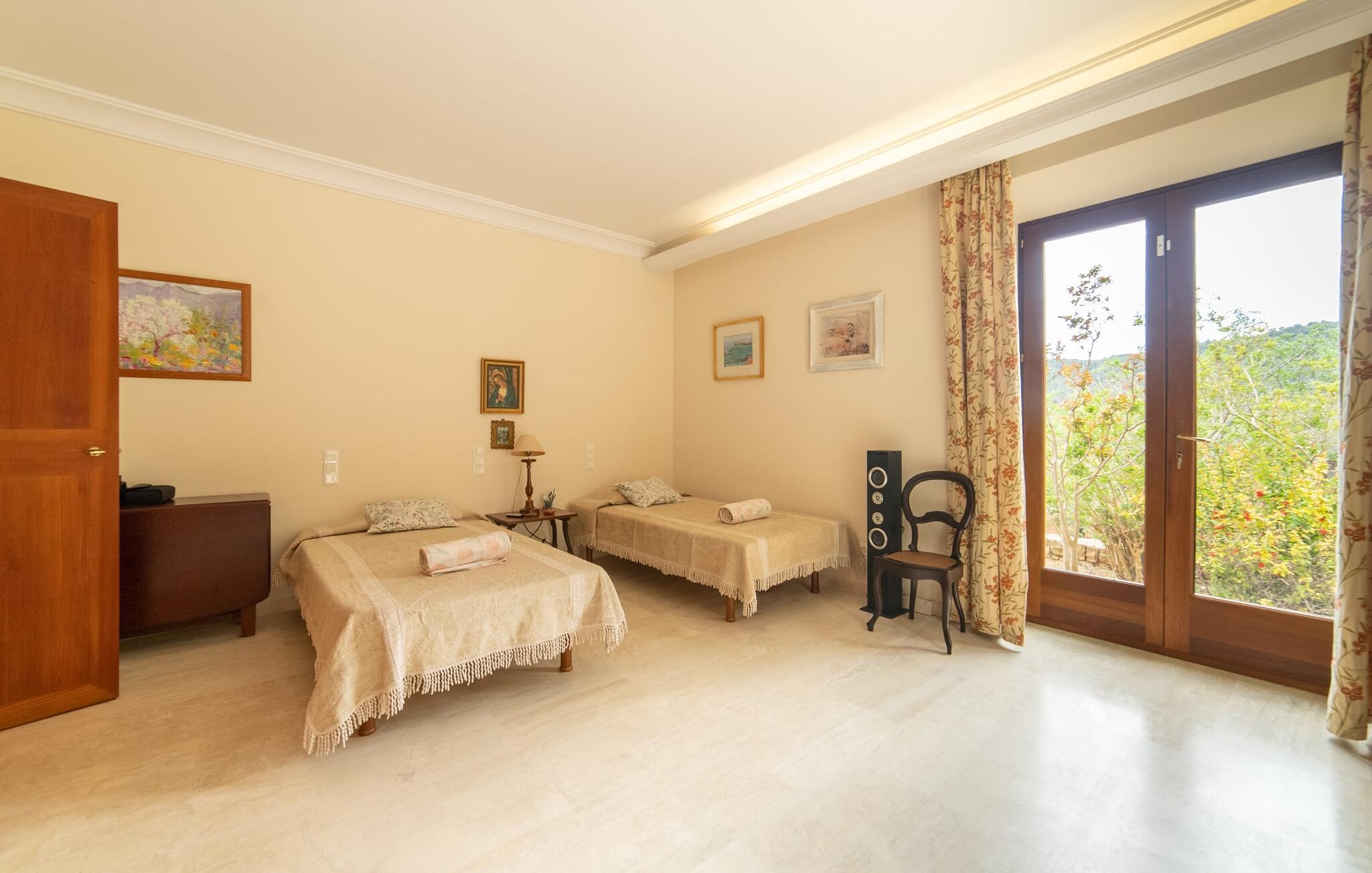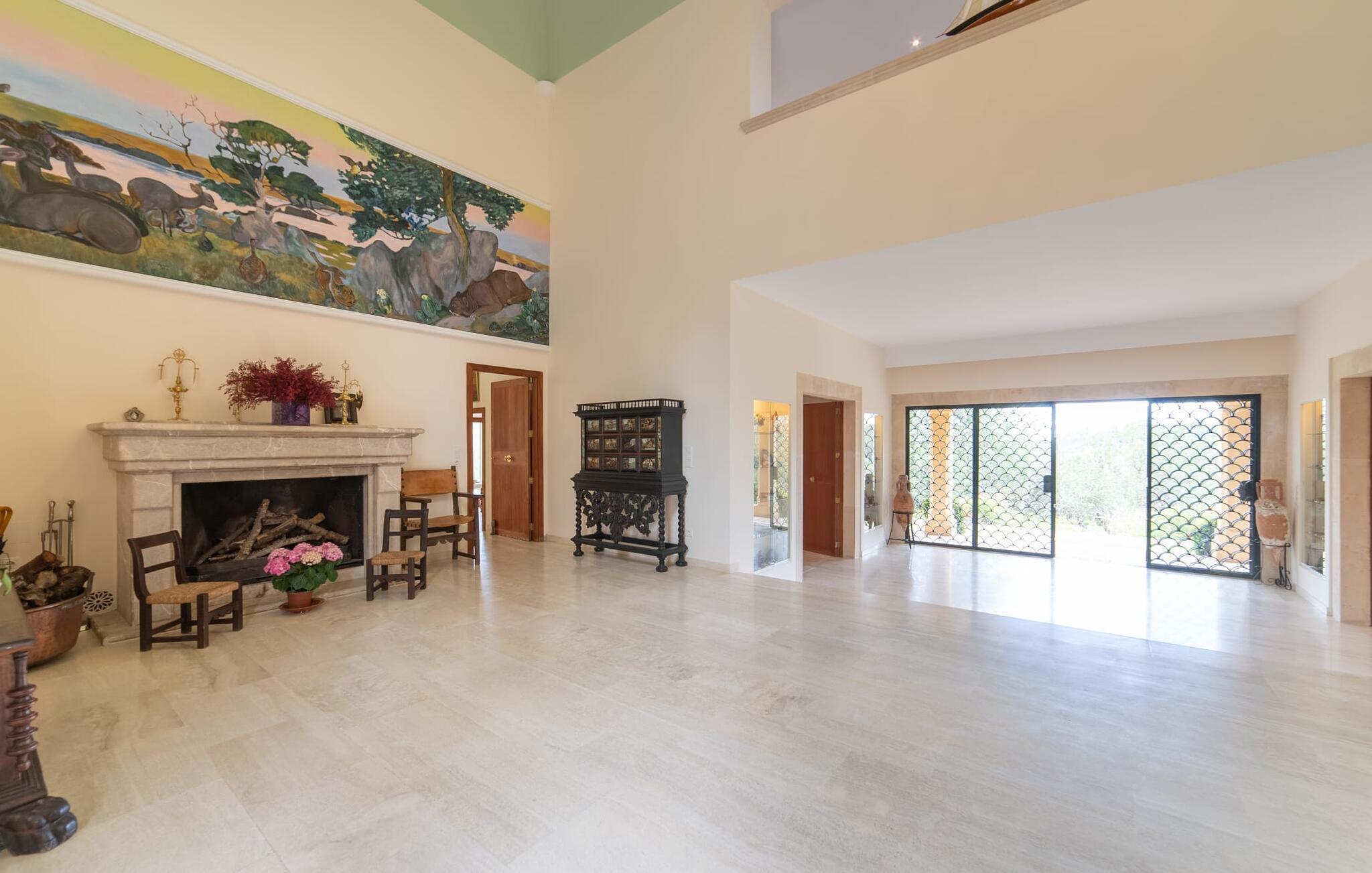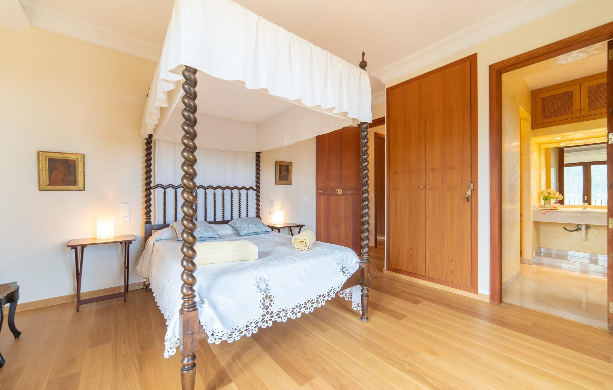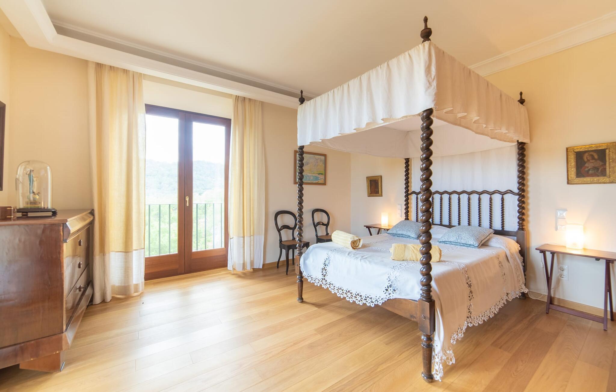 Von hier aus gelangt man direkt in das stilvolle und sehr großzügige Innere des Hauses. Der großzügige Wohnraum erstreckt sich über zwei Wohnebenen. Im Erdgeschoss gibt es ein großes Esszimmer und ein gemütliches Wohnzimmer mit Kamin und Klimaanlage. Auf dieser Etage befindet sich außerdem eine voll ausgestattete Küche, die ebenfalls viel Platz bietet, sowie ein gemütliches Schlafzimmer mit Doppelbett. Im Obergeschoss dieses Bauernhauses auf Mallorca befindet sich eine schöne Bibliothek. Außerdem gibt es noch die angenehmen vier Doppelzimmer, jeweils mit eigenem Bad. Im Obergeschoss gibt es außerdem eine große Terrasse, von der aus Sie eine spektakuläre Aussicht genießen können. „Ca Nostra de Esporlas“ – ein tolles Domizil für Naturliebhaber, Ruhesuchende und Individualisten!