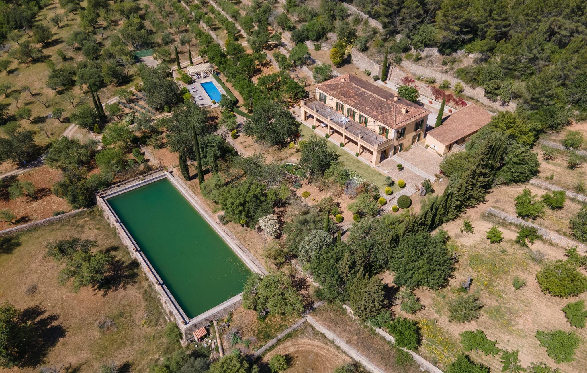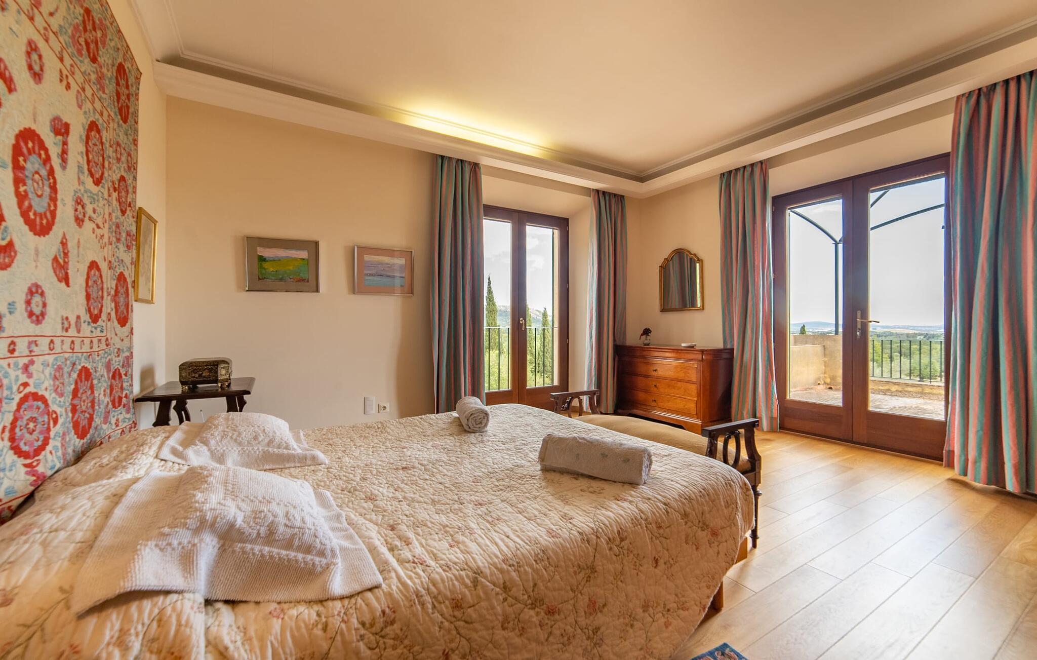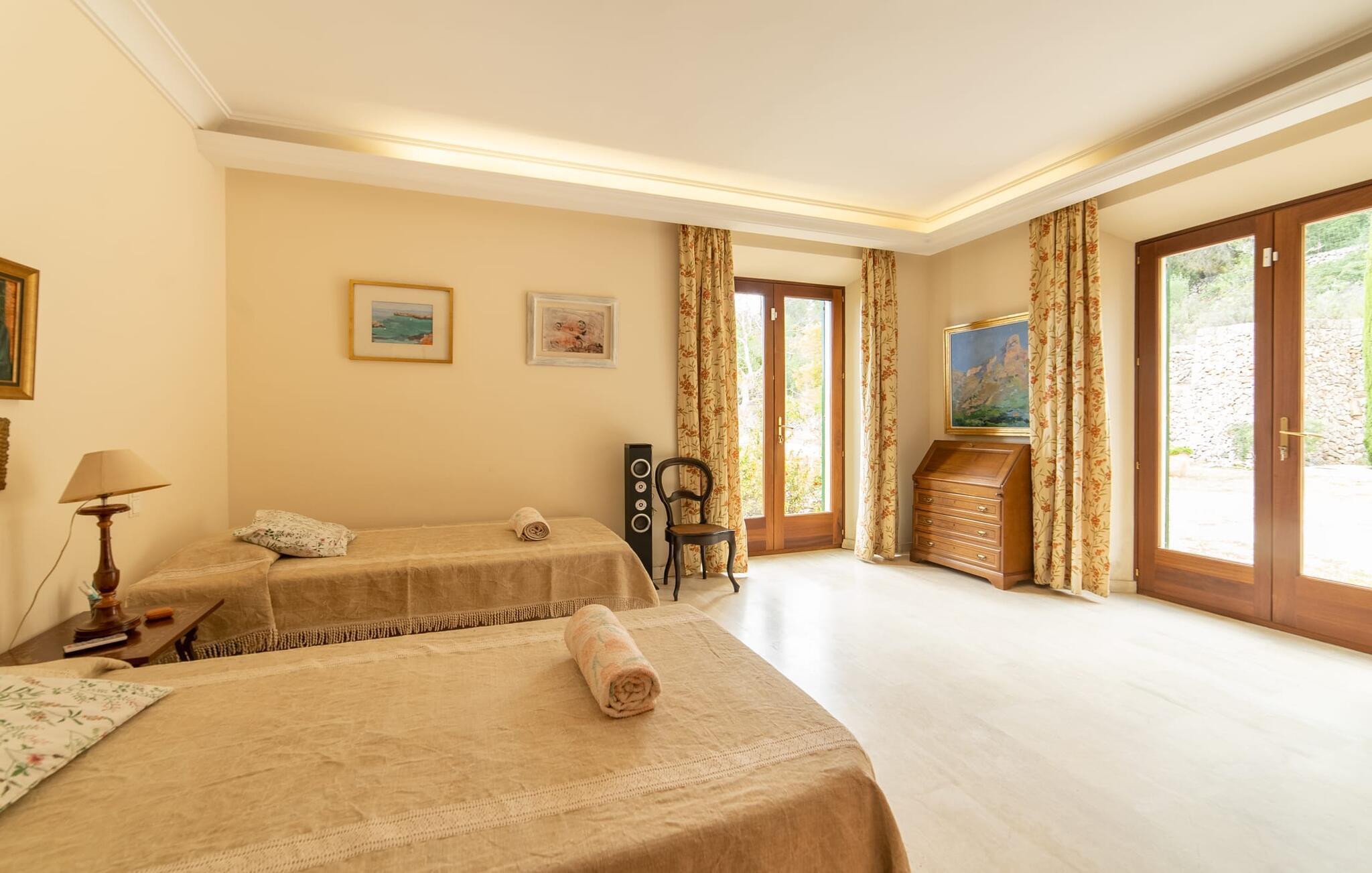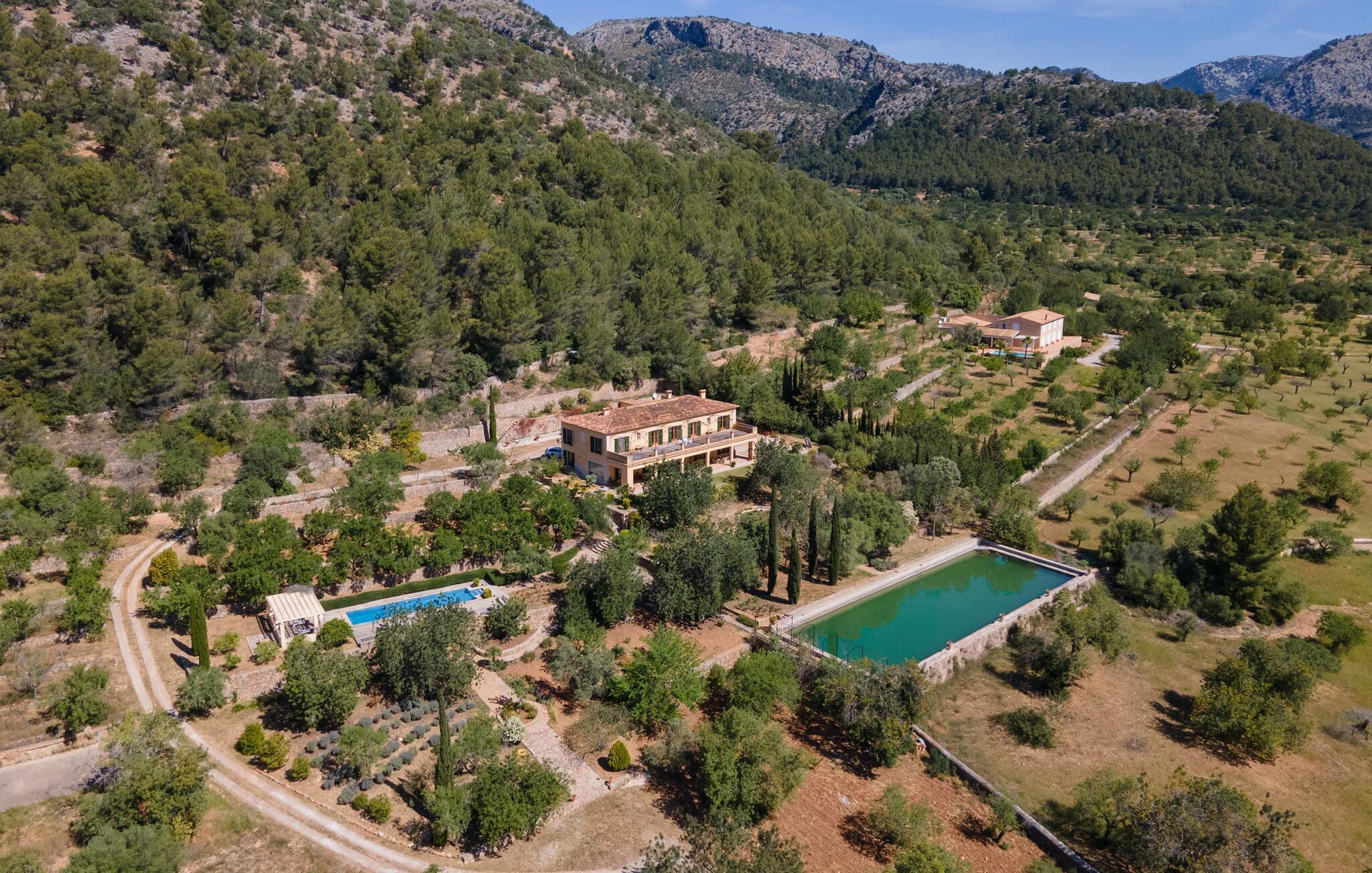 Von hier aus gelangt man direkt in das stilvolle und sehr großzügige Innere des Hauses. Der großzügige Wohnraum erstreckt sich über zwei Wohnebenen. Im Erdgeschoss gibt es ein großes Esszimmer und ein gemütliches Wohnzimmer mit Kamin und Klimaanlage. Auf dieser Etage befindet sich außerdem eine voll ausgestattete Küche, die ebenfalls viel Platz bietet, sowie ein gemütliches Schlafzimmer mit Doppelbett. Im Obergeschoss dieses Bauernhauses auf Mallorca befindet sich eine schöne Bibliothek. Außerdem gibt es noch die angenehmen vier Doppelzimmer, jeweils mit eigenem Bad. Im Obergeschoss gibt es außerdem eine große Terrasse, von der aus Sie eine spektakuläre Aussicht genießen können. „Ca Nostra de Esporlas“ – ein tolles Domizil für Naturliebhaber, Ruhesuchende und Individualisten!