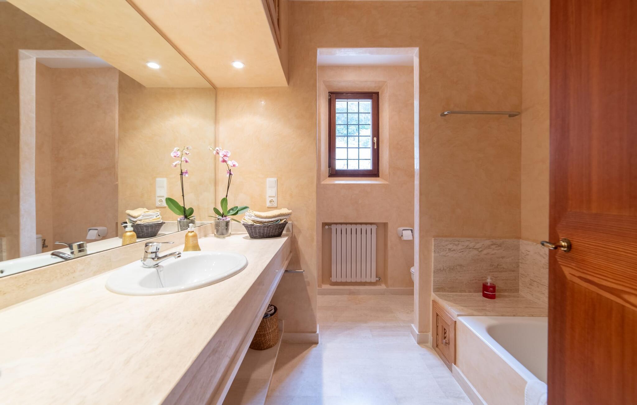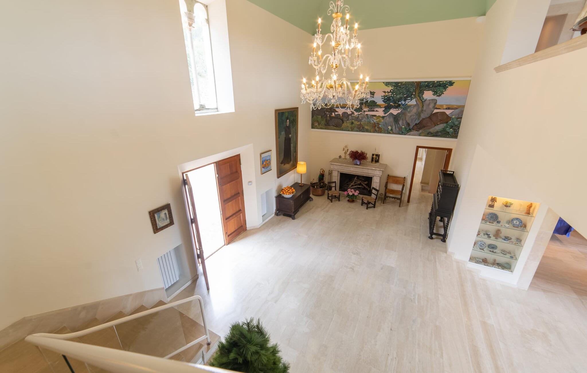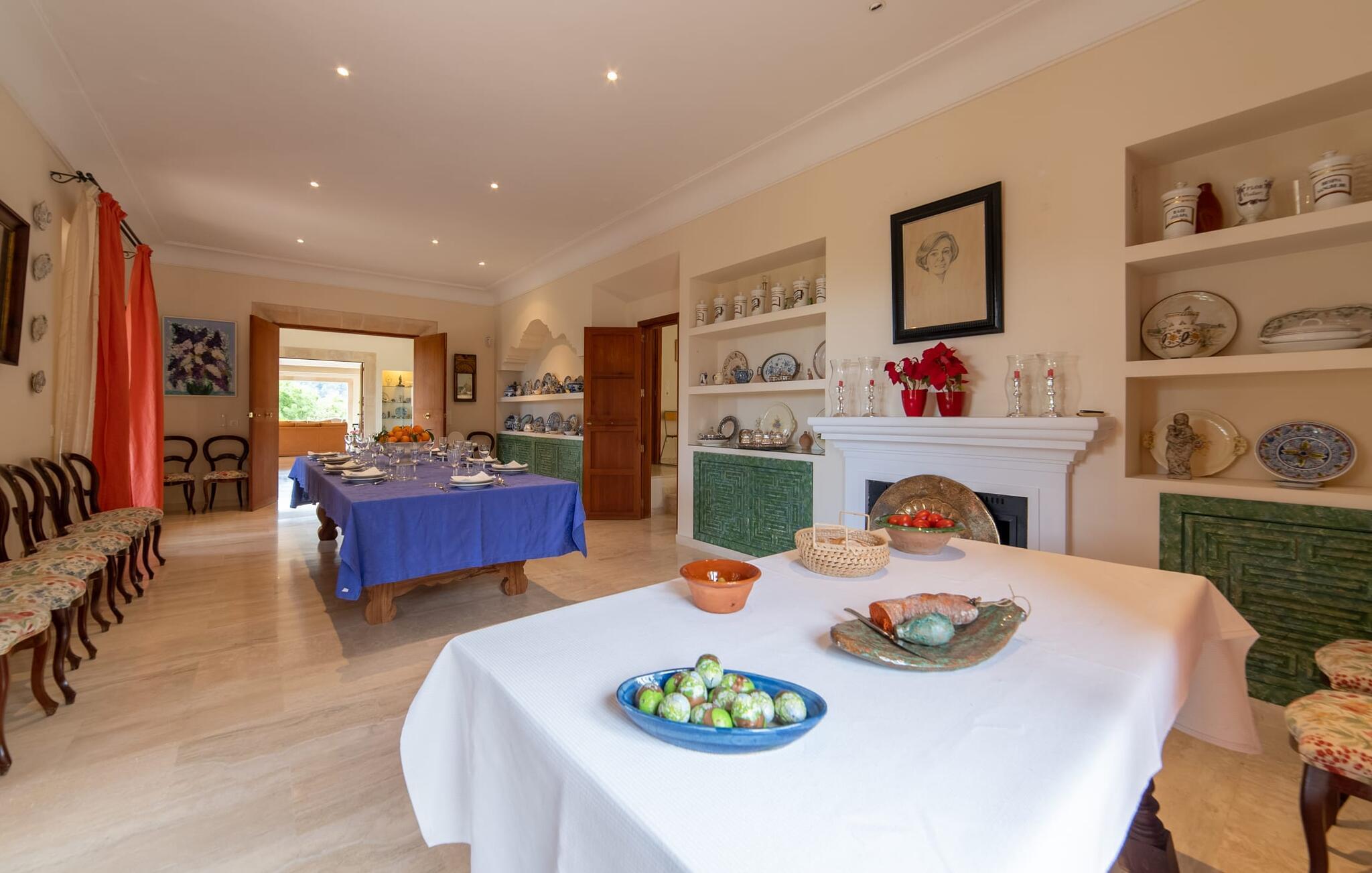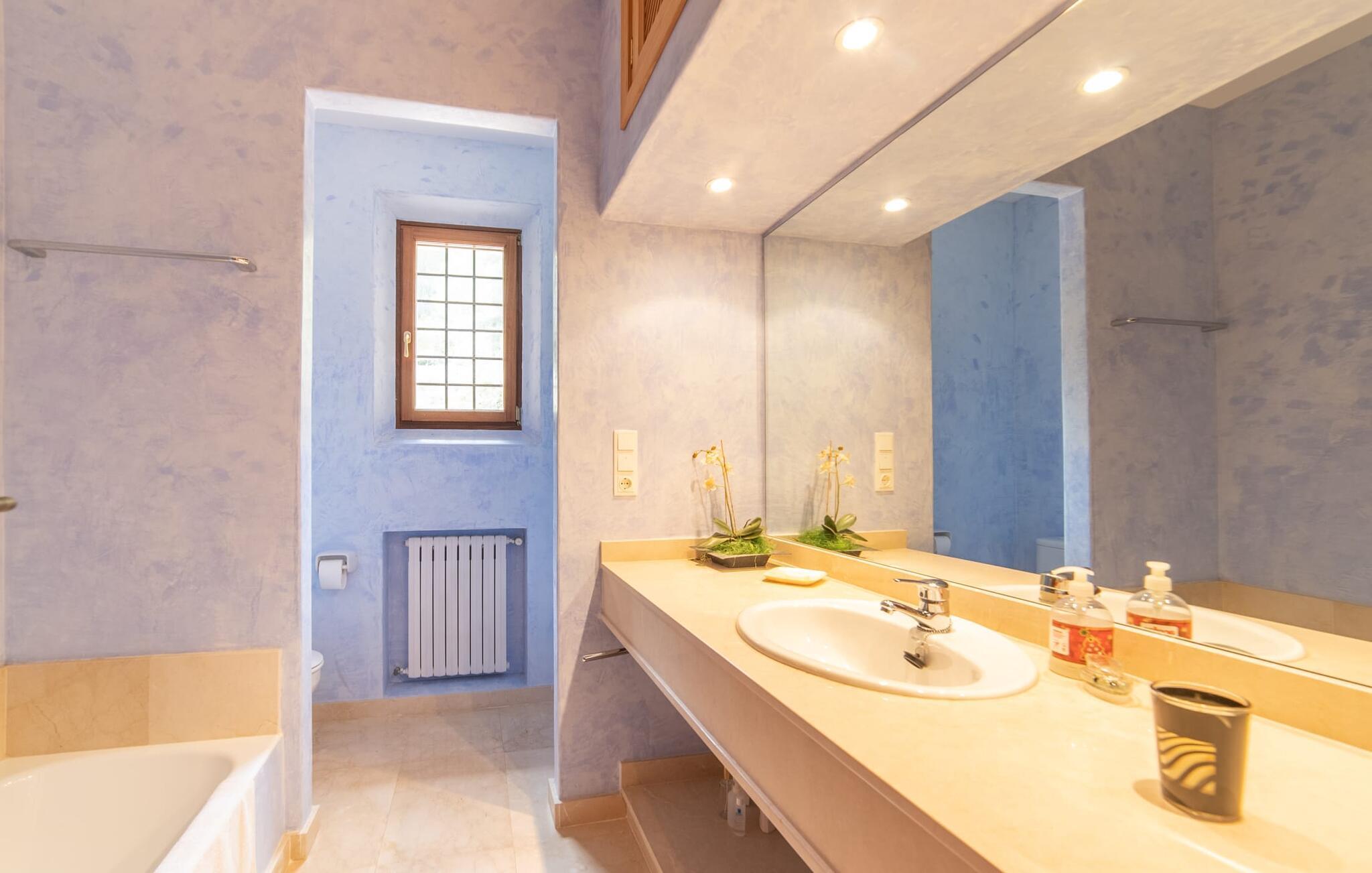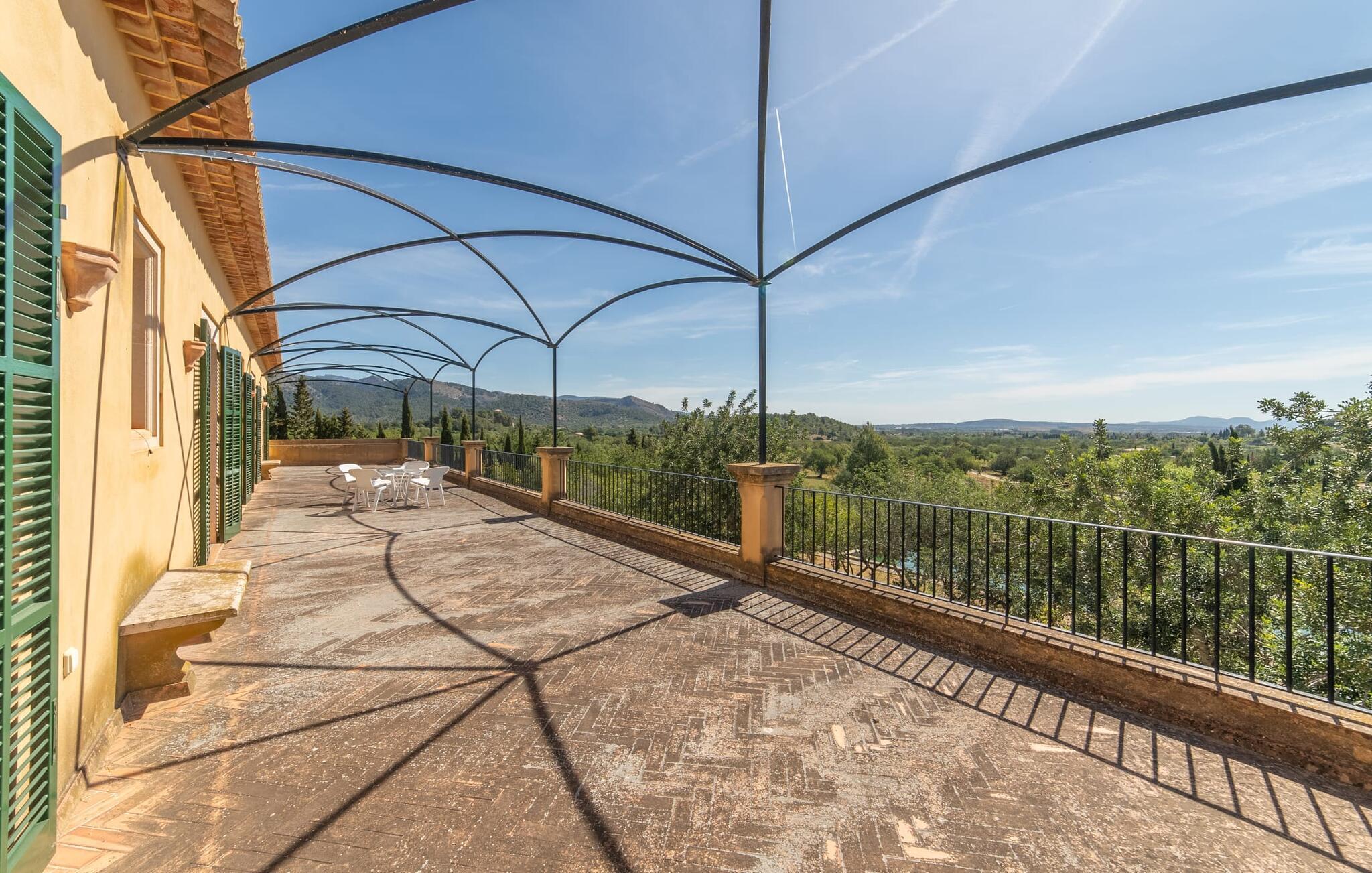Von hier aus gelangt man direkt in das stilvolle und sehr großzügige Innere des Hauses. Der großzügige Wohnraum erstreckt sich über zwei Wohnebenen. Im Erdgeschoss gibt es ein großes Esszimmer und ein gemütliches Wohnzimmer mit Kamin und Klimaanlage. Auf dieser Etage befindet sich außerdem eine voll ausgestattete Küche, die ebenfalls viel Platz bietet, sowie ein gemütliches Schlafzimmer mit Doppelbett. Im Obergeschoss dieses Bauernhauses auf Mallorca befindet sich eine schöne Bibliothek. Außerdem gibt es noch die angenehmen vier Doppelzimmer, jeweils mit eigenem Bad. Im Obergeschoss gibt es außerdem eine große Terrasse, von der aus Sie eine spektakuläre Aussicht genießen können. „Ca Nostra de Esporlas“ – ein tolles Domizil für Naturliebhaber, Ruhesuchende und Individualisten!