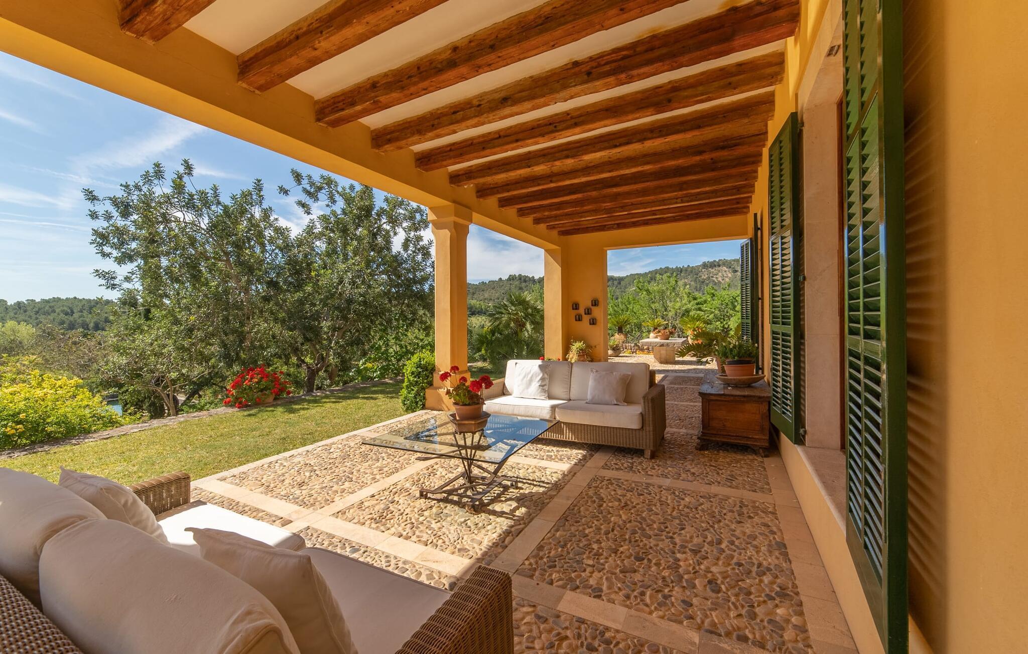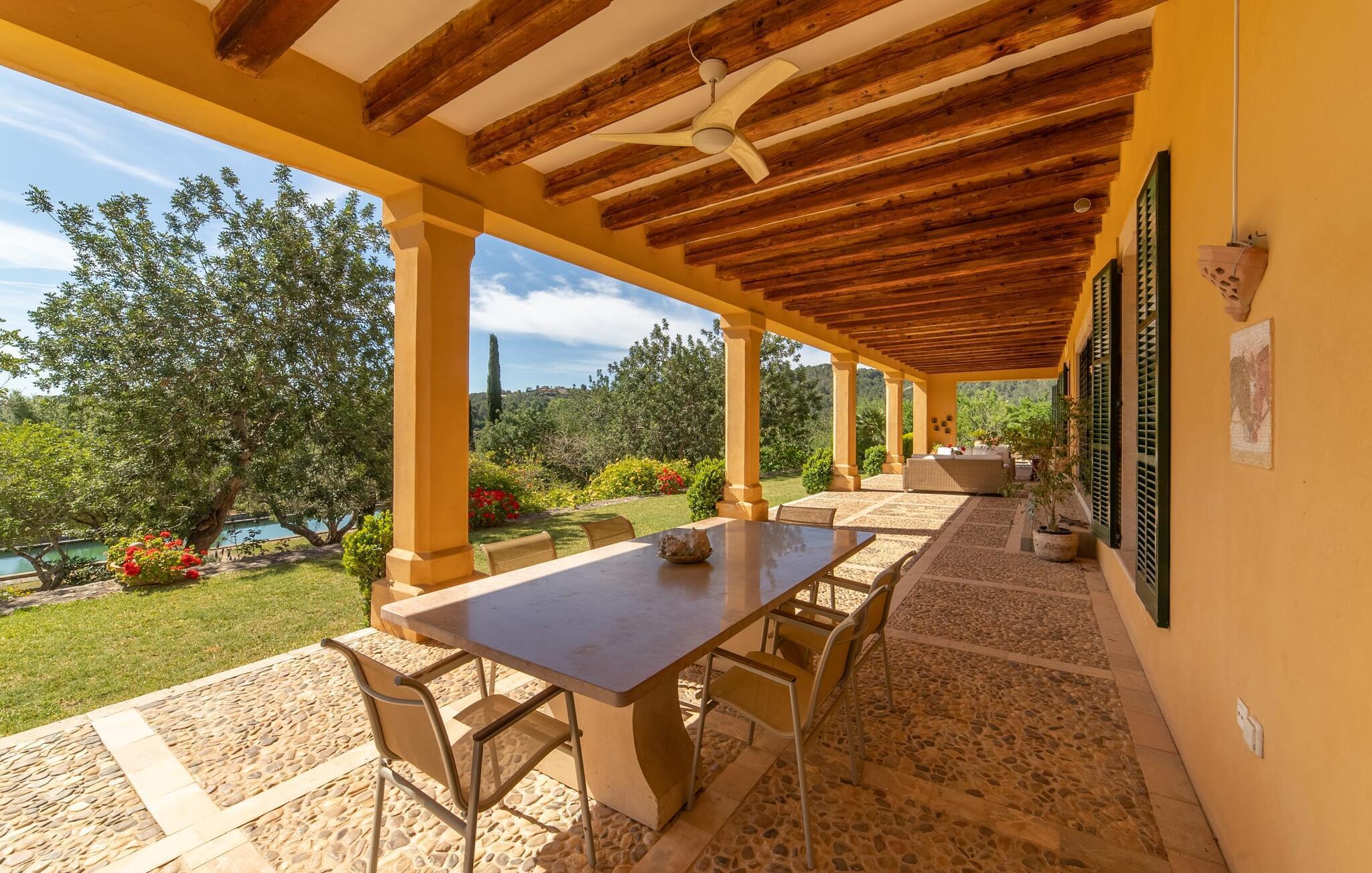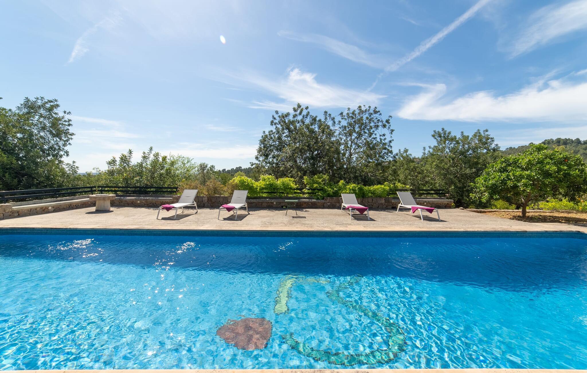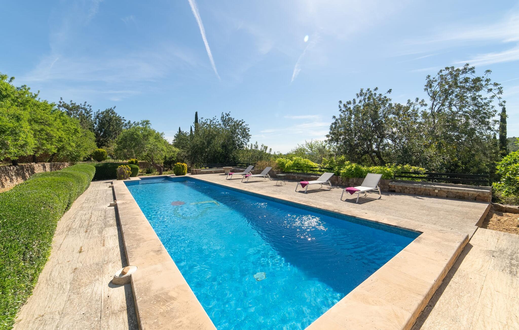 Dieses bezaubernde Ferienhaus auf Mallorca ist ein idealer Ort für Familien, gemeinsam reisende Paare oder Freunde, die ein paar Tage Abgeschiedenheit und Ruhe auf dem Land genießen möchten. Auf dem riesigen Gelände gibt es jede Menge Platz, um das alles in vollen Zügen genießen zu können. Mediterrane Vegetation, kleine Wege, Nischen und Mauern laden dazu ein, immer wieder nach neuen Orten zum Verweilen zu suchen. Für die Kleinen gibt es auch eine Schaukel. Auch am Pool können Sie angenehme Stunden genießen. Es ist nicht nur groß, sondern auch flach und verfügt über leicht zugängliche Stufen. Auf der Sonnenterrasse laden neben bequemen Liegen auch gemauerte Bänke zum Entspannen ein. Auf der überdachten, mit Flusskieseln bedeckten Terrasse direkt am Haus können Sie am Esstisch oder auch in der gemütlichen Lounge zusammensitzen. Aufgrund der natürlichen Lage kann es zu Ziegen in der Nähe kommen. Um zu verhindern, dass sie das Grundstück betreten, gibt es einen Wachhund, der in einem umzäunten Bereich an der Leine läuft.