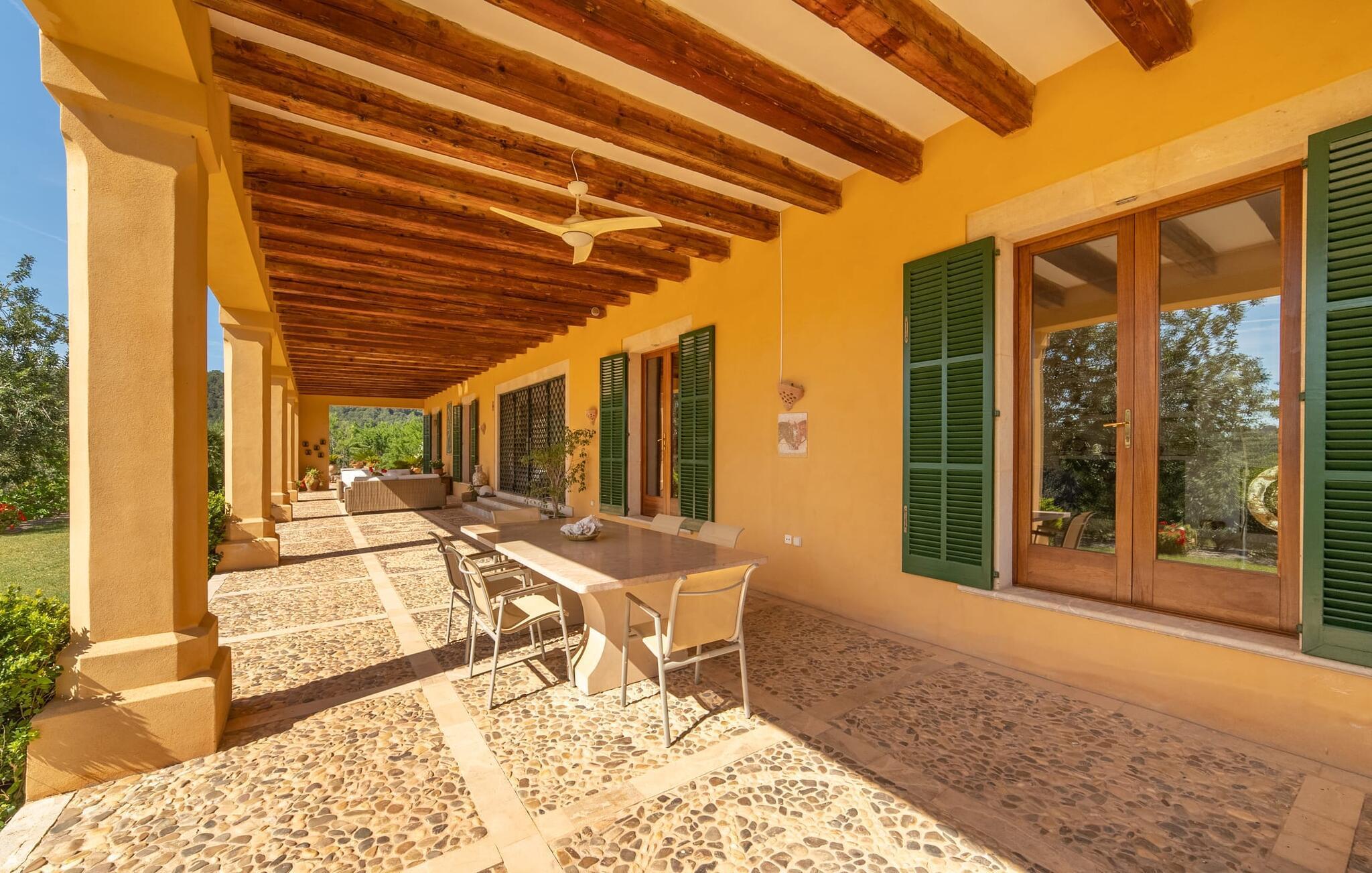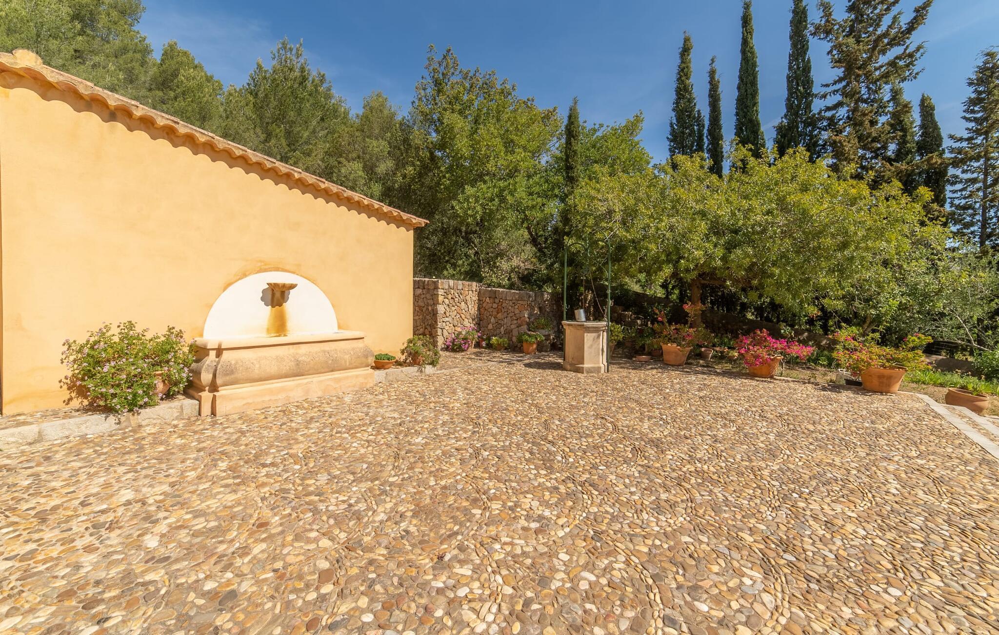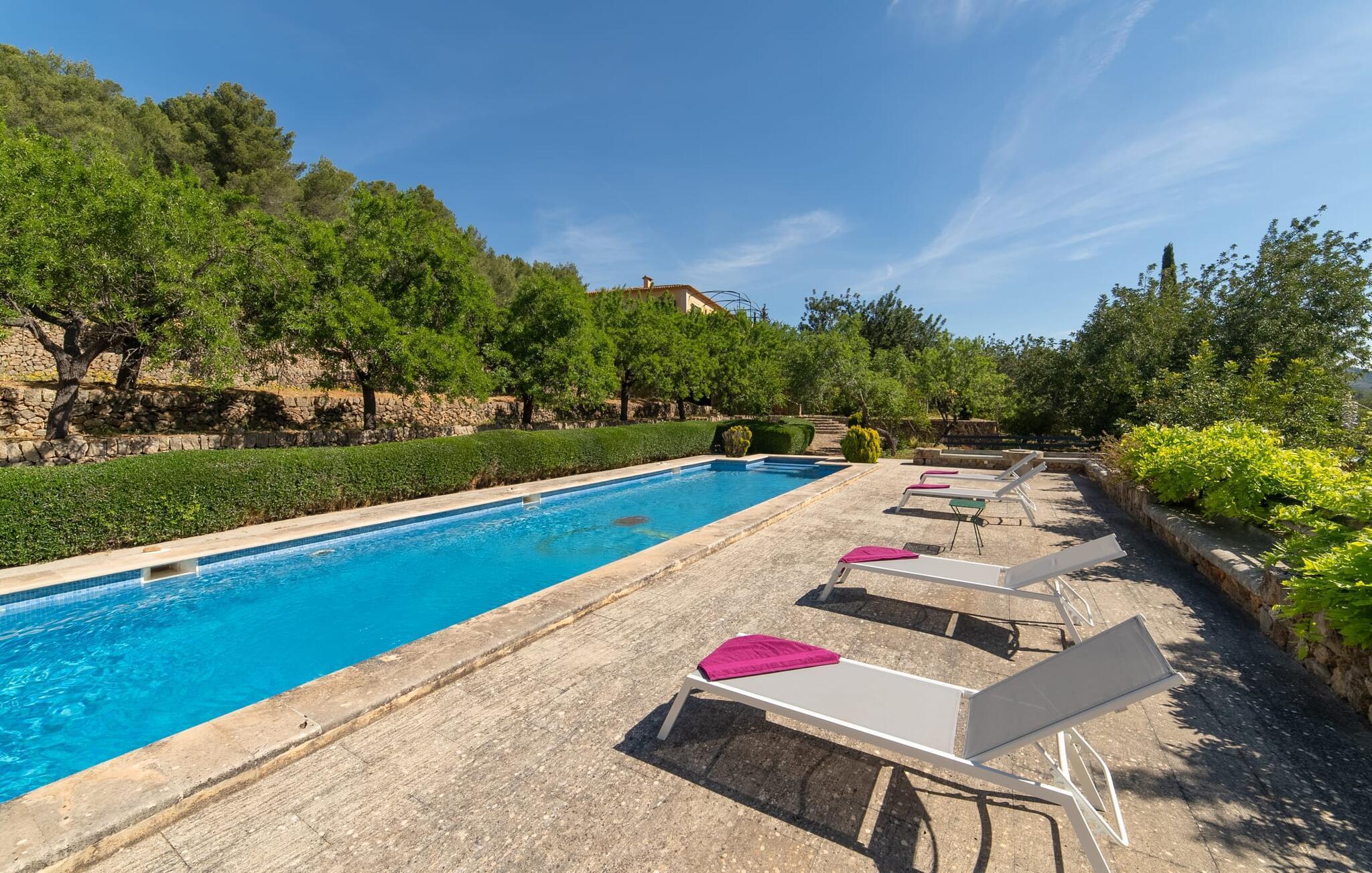 Dieses bezaubernde Ferienhaus auf Mallorca ist ein idealer Ort für Familien, gemeinsam reisende Paare oder Freunde, die ein paar Tage Abgeschiedenheit und Ruhe auf dem Land genießen möchten. Auf dem riesigen Gelände gibt es jede Menge Platz, um das alles in vollen Zügen genießen zu können. Mediterrane Vegetation, kleine Wege, Nischen und Mauern laden dazu ein, immer wieder nach neuen Orten zum Verweilen zu suchen. Für die Kleinen gibt es auch eine Schaukel. Auch am Pool können Sie angenehme Stunden genießen. Es ist nicht nur groß, sondern auch flach und verfügt über leicht zugängliche Stufen. Auf der Sonnenterrasse laden neben bequemen Liegen auch gemauerte Bänke zum Entspannen ein. Auf der überdachten, mit Flusskieseln bedeckten Terrasse direkt am Haus können Sie am Esstisch oder auch in der gemütlichen Lounge zusammensitzen. Aufgrund der natürlichen Lage kann es zu Ziegen in der Nähe kommen. Um zu verhindern, dass sie das Grundstück betreten, gibt es einen Wachhund, der in einem umzäunten Bereich an der Leine läuft.