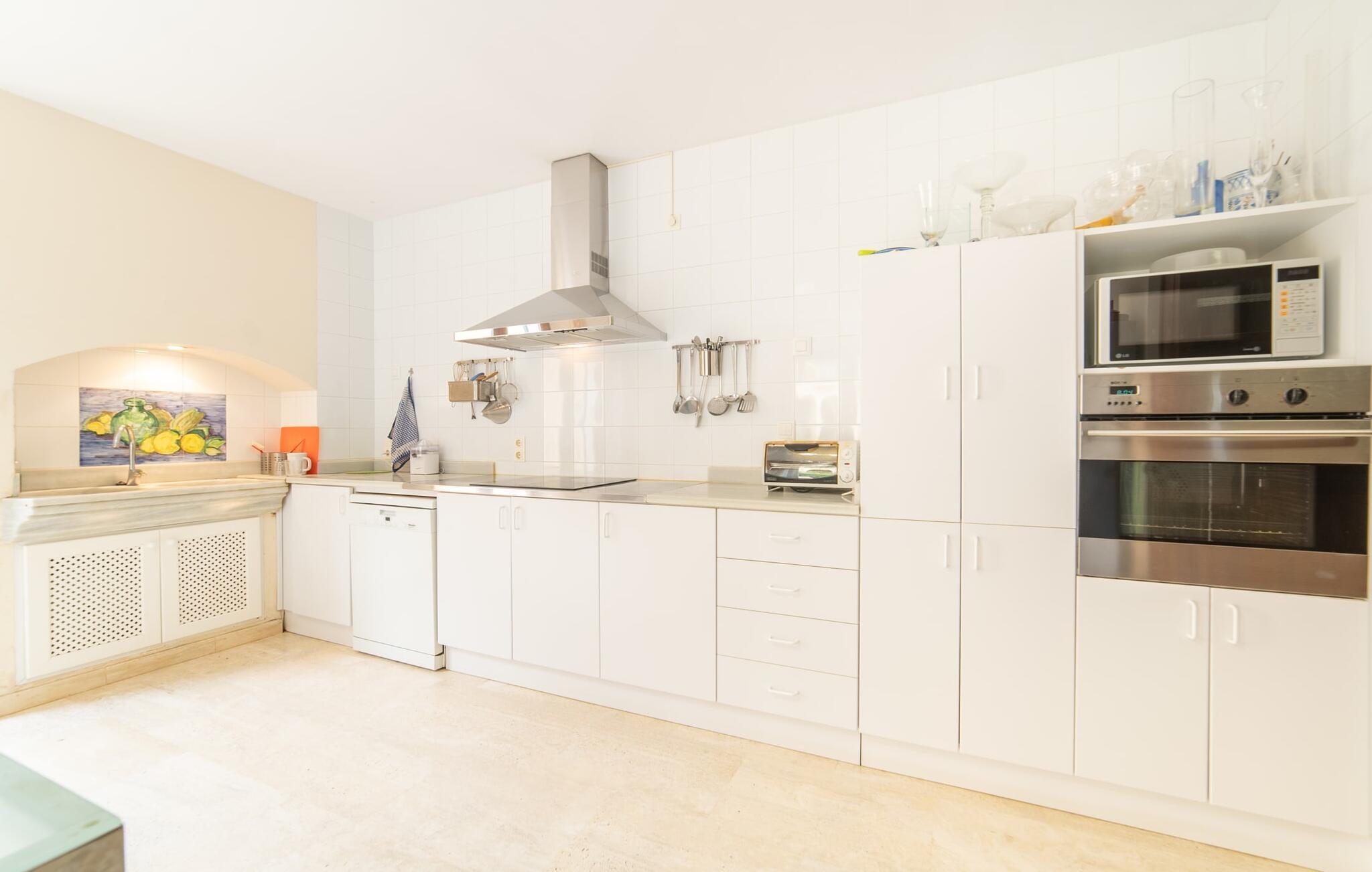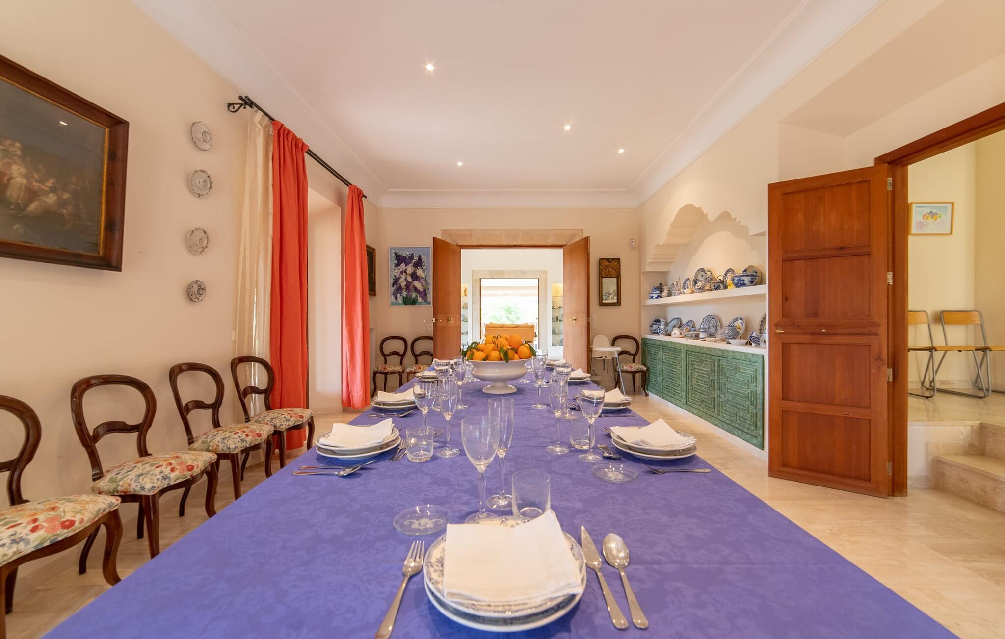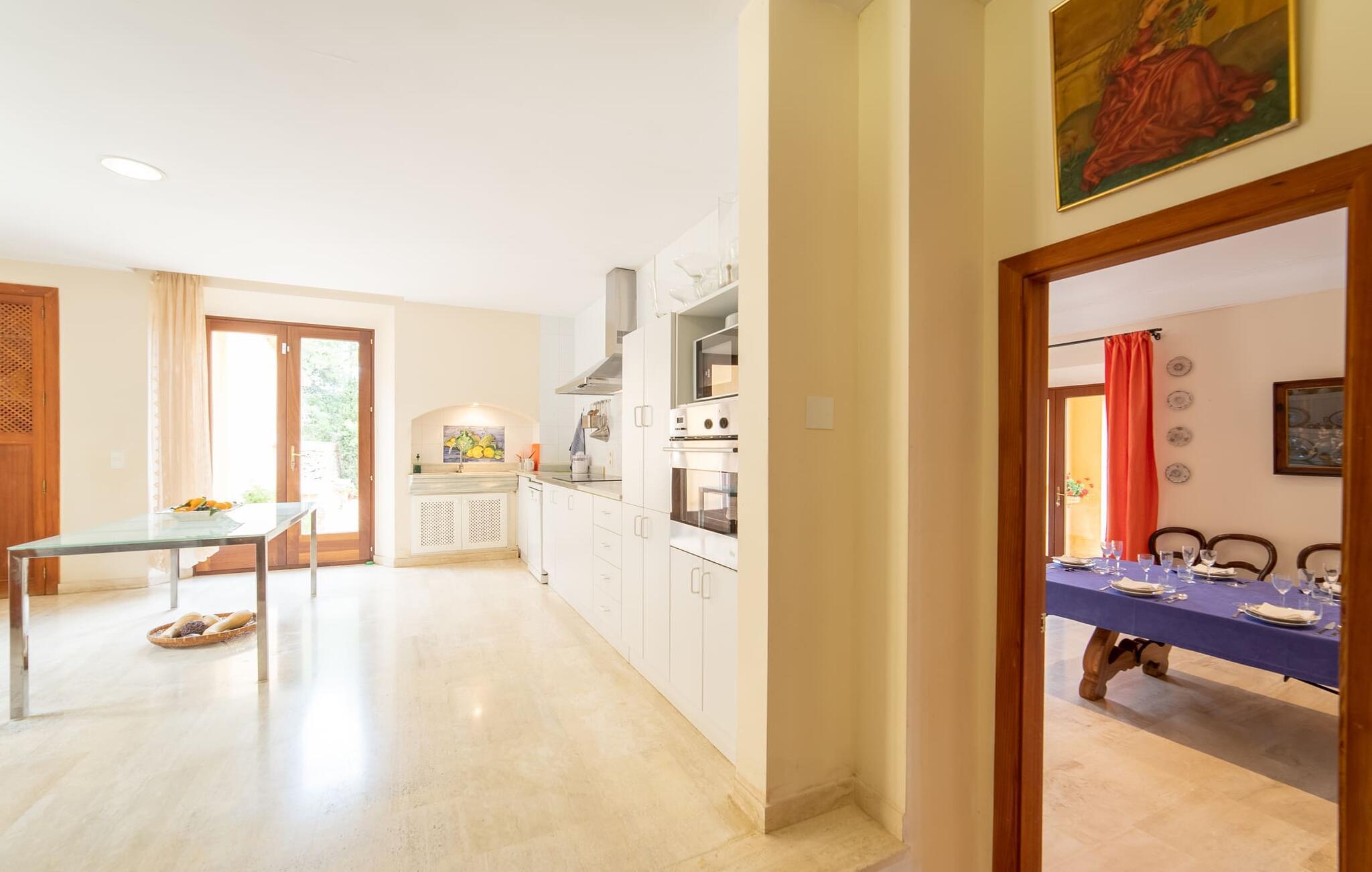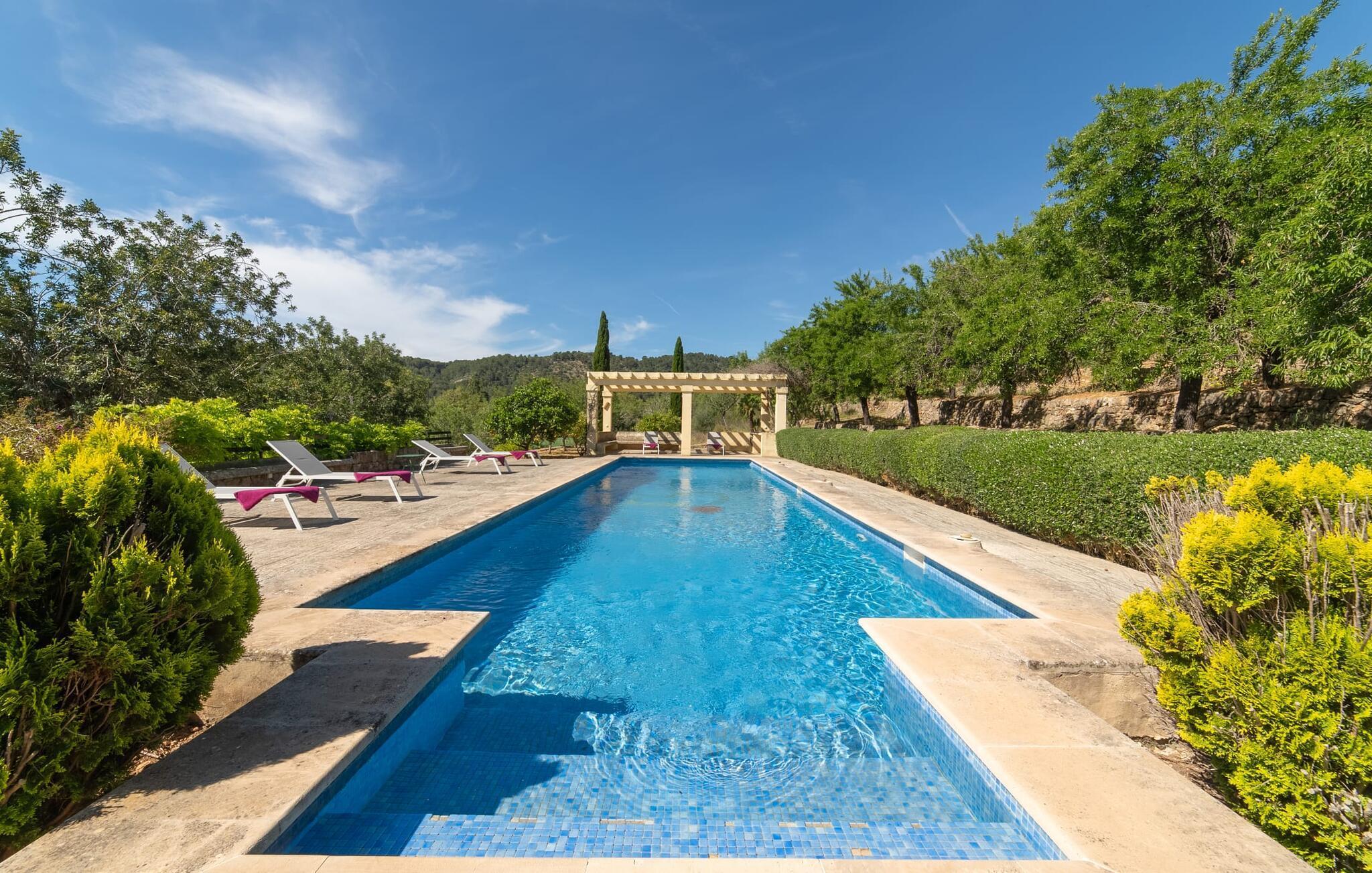 Dieses bezaubernde Ferienhaus auf Mallorca ist ein idealer Ort für Familien, gemeinsam reisende Paare oder Freunde, die ein paar Tage Abgeschiedenheit und Ruhe auf dem Land genießen möchten. Auf dem riesigen Gelände gibt es jede Menge Platz, um das alles in vollen Zügen genießen zu können. Mediterrane Vegetation, kleine Wege, Nischen und Mauern laden dazu ein, immer wieder nach neuen Orten zum Verweilen zu suchen. Für die Kleinen gibt es auch eine Schaukel. Auch am Pool können Sie angenehme Stunden genießen. Es ist nicht nur groß, sondern auch flach und verfügt über leicht zugängliche Stufen. Auf der Sonnenterrasse laden neben bequemen Liegen auch gemauerte Bänke zum Entspannen ein. Auf der überdachten, mit Flusskieseln bedeckten Terrasse direkt am Haus können Sie am Esstisch oder auch in der gemütlichen Lounge zusammensitzen. Aufgrund der natürlichen Lage kann es zu Ziegen in der Nähe kommen. Um zu verhindern, dass sie das Grundstück betreten, gibt es einen Wachhund, der in einem umzäunten Bereich an der Leine läuft.