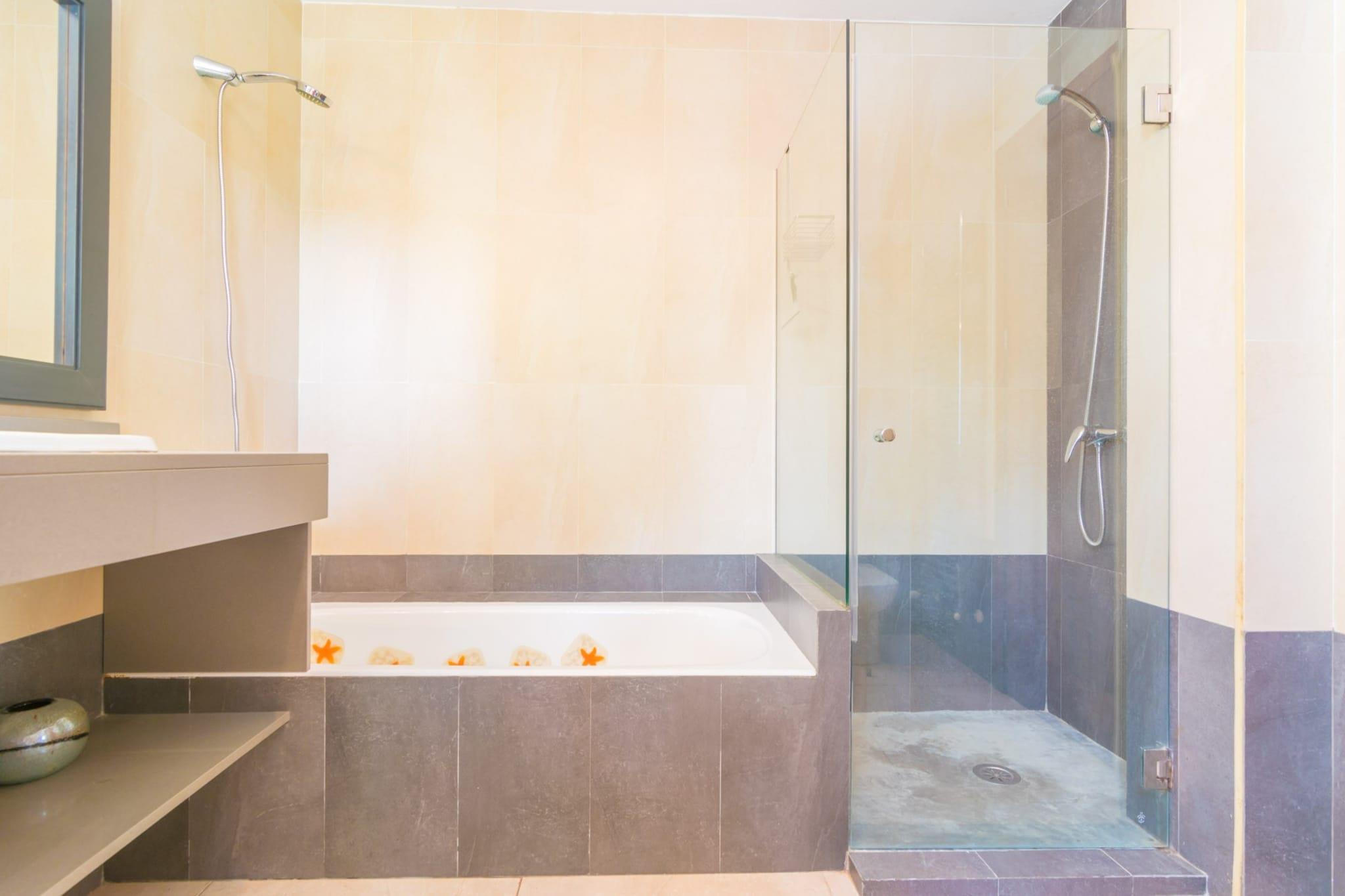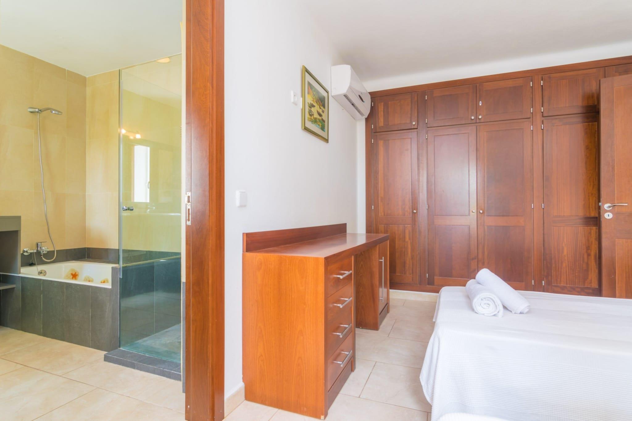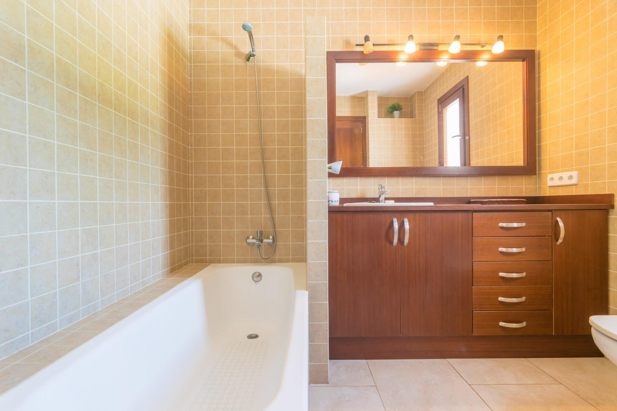 Ein kurzer Spaziergang trennt dieses Chalet vom Strand, was die Unterkunft ideal für Sonnenhungrige macht. Trotzdem muss man hier auf einen privaten Pool nicht verzichten! Das 7.5 x 4 Meter große Schwimmbad ist zwischen 1 und 1.8 Meter tief und wird mit Chlor sauber gehalten. Rundherum macht man es sich auf einer der 8 Gartenliegen gemütlich und lässt die Mittelmeersonne ihre Arbeit tun. Besonders praktisch sind das WC draußen sowie die Gartendusche. Zum Haus gehören gleich 2 Veranden, die beide auf den Pool blicken und sich perfekt zum Grillen unterm Sternenhimmel eignen. Das Grundstück ist umzäunt und es gibt direkte Nachbarn. Das Chalet bietet komfortables Wohnen auf 2 Etagen an. Die Veranda führt direkt in den hellen Wohn-Essbereich, wo man auf dem Sofa bei einem Film im Satellitenfernsehen entspannt oder für die Kinder eine selbst mitgebrachte DVD einlegt. Die Küche ist mit einem zweiten Esstisch, Cerankochfeld, Elektroofen und einigen Kochutensilien versehen, damit die Selbstversorgung im Urlaub ein Leichtes wird. Der Kamin in der Küche ist rein dekorativ und kann nicht befeuert werden; sorgt jedoch für jede Menge Charakter. Auch eine Waschküche mit Waschmaschine und Bügeleisen/Bügelbrett darf nicht fehlen. Im Erdgeschoss sind ein separates Duschbad sowie ein Schlafzimmer mit 2 Einzelbetten und en-suite Bad (mit Dusche und Wanne) vorhanden. Im 1. Stock ist ein weiteres Badezimmer mit Dusche und 3 Schlafzimmer. Das erste Zimmer oben bietet ein Doppelbett und en-suite Bad mit Badewanne, während die anderen beiden mit je 2 Einzelbetten ausgestattet sind. Alle Schlafzimmer sind mit Kleiderschrank und Klimaanlage ausgestattet und bieten Zugang zu einer Terrasse. Für unsere kleinen Gäste werden ein Set Babybettchen und Hochstuhl auf Anfrage bereit gestellt. Für den Winter ist die Unterkunft mit Zentralheizung versehen. Die Wohnsiedlung Cala D'Or gehört zur Gemeinde Santanyí und bietet einen wunderschönen Sandstrand. Das Haus befindet sich in einer wenig befahrenen Strasse und ist nur wenige Gehminuten vom Strand entfernt. Mit einem Mietwagen erreicht man Cala Mondragó in ca. 10 Autominuten; eine 30 minütige Autofahrt trennt Sie von Es Trenc und Colonia de Sant Jordi. Der nächste Golfplatz, Vall D'Or, liegt nur 9.3 km entfernt. In Cala D'Or gibt es viele Supermärkte und Geschäfte, sodass man leicht seine täglichen Besorgungen erledigen kann. Auch Santanyí bietet viele Einkaufsmöglichkeiten und Restaurants. Empfehlenswert ist ein Besuch der Hauptstadt Palma de Mallorca, die ein großes Angebot an Kultur bereithält. Die Nutzung der Heizung hat einen Aufpreis, bitte kontaktieren Sie den Anbieter für weitere Informationen. Eventuelle Nebenkosten müssen beim Anbieter nachgefragt werden. Haustiere sind verboten. Partys oder ähnliche Veranstaltungen sind nicht gestattet. Entfernungen Strand: 0.25 km - Cala Petita (Cala d'Or) Flughafen: 57 km - Son Sant Joan Golfplatz: 9.3 km - Golf Vall d'Or Ortsmitte: 0 km - Cala d'Or Bahnhof: 31.5 km - Estació de Manacor Bushaltestelle: 0.5 km - Av. d'en Fernando Tarragó, Cala d'Or Fähre: 61 km - Port de Palma Krankenhaus: 31 km - Hospital de Manacor Touristen Lizenz: ETV/3226Einheitsregister: ESFCTU00000700800110604500000000000000000000ETV/32265Bei der Anreise muss die Ecotasa (Touristensteuer der Balearen) bar bezahlt werden. Der zu zahlende Betrag beträgt zwischen 0.55EURO pro Nacht und Gast in der Nebensaison und 2.2EURO pro Nacht und Gast in der Hochsaison. Ab dem 9. Tag reduziert sich die Steuer um die Hälfte. Personen unter 16 Jahren sind davon ausgenommen. Heizung (November - März): 30 EUR/Nacht (optional)
