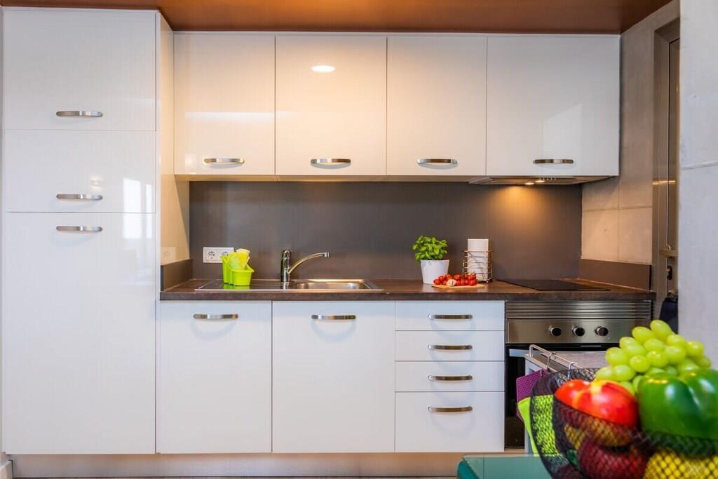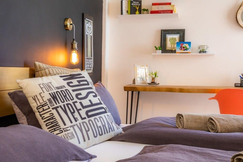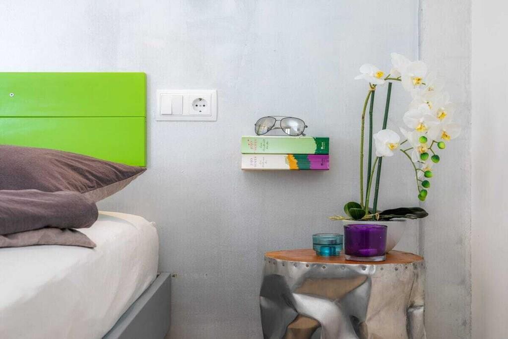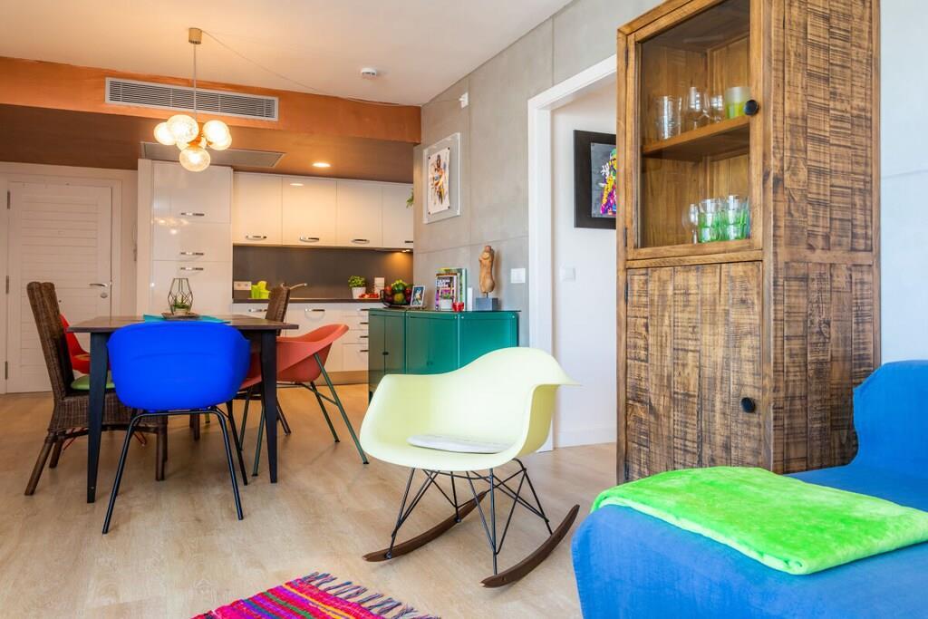Wohnen wie bei Freunden! Loft-Style Strandferienwohnung im 6. Stock mit majestätischem Blick aufs Meer in erster Linie . Zweiter, windstiller Westbalkon. Die 84 m² große Ferienwohnung im 6. Stock (Aufzug vorhanden) verfügt über 2 Schlafzimmer, Bad mit Dusche, einen großen Wohn-/Ess-/Küchenbereich, einen Abstellraum und 2 Balkone. Der 11 m² große, überdachte Balkon, der an den Wohnbereich anschließt, blickt nach Osten auf die Bucht von Cala Millor, fängt aber im hinteren Bereich auch die Abendsonne ein. Der 4 m² große, sonnige und windgeschützte Westbalkon, der an ein Schlafzimmer anschließt, blickt landeinwärts auf die Berge. Die helle Ferienwohnung ist stilvoll-kreativ und mit viel Liebe zum Detail nach dem Motto 'Heavy metal meets funky colors' eingerichtet. Beide Schlafzimmer bieten ein 180 x 200cm großes Doppelbett (getrennte Federkernmatratzen) und die Wohnzimmer-Couch ist ausziehbar (ca. 150 x 200 cm) - so bietet das Apartment Raum für 5 Personen. Die Ferienwohnung bietet zudem Bücher (deutsch, englisch), DVDs, Spiele, Stereoanlage, Astra-Satellitenreceiver, Flachbild-TV und kostenloses WiFi.