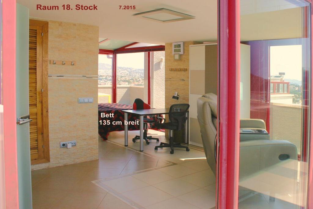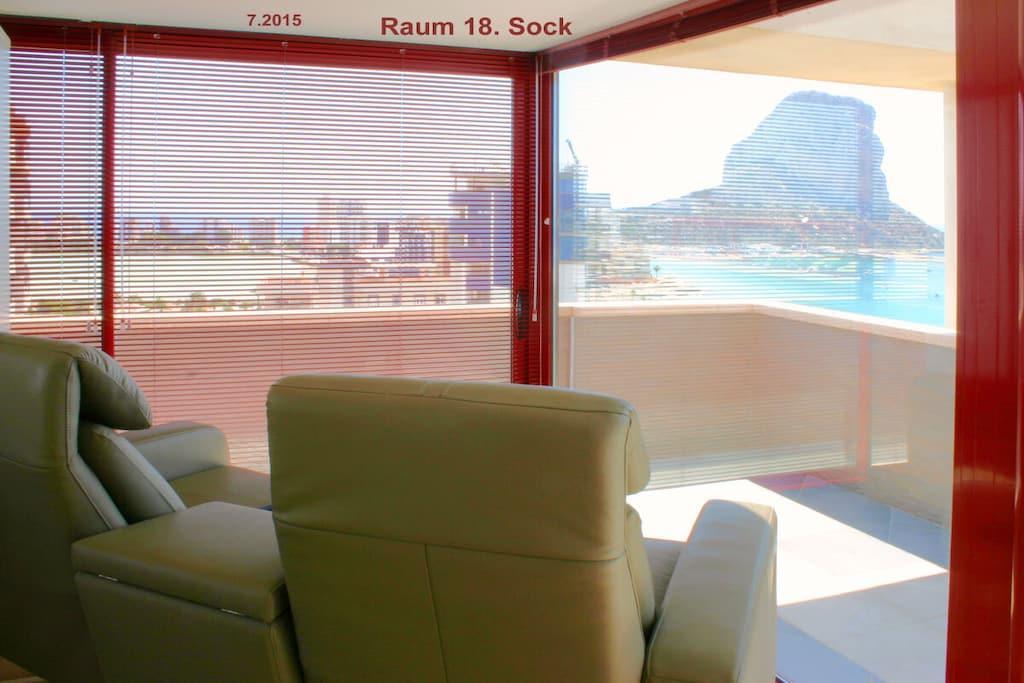 CALPE DIEM (Abgeleitet aus „Carpe Diem“ = Genieße den Tag!). 1. Tauchen Sie ein in das tiefe Blau des Mittelmeers und verlängern Sie dann das ozeanische Gefühl in einer großzügigen Wohnung, wo Sie nicht anders können, als nur zufrieden sein. 2. Der weite Blick über die Bucht wird eingerahmt von zwei wuchtigen Felsformationen und in der Höhe des 17. und 18. Stockwerks lässt der angenehme Wind die Sonne nie als zu heiß empfinden. 3. Die Bucht von Calpe besticht durch klares sauberes Wasser, einen breiten und flach ins Wasser verlaufenden Sandstrand - ideal für Kinder und Genuss-Schwimmer. Nur 50 m vom Haus entfernt. Keine Straße dazwischen. 4. Die Wege am Ufer sind mehr als eine reine Strandpromenade, sie sind wie eine kreative Entdeckungsreise zum gewaltigen Felsen „Ifach“ auf der einen und heiter-buntem Strand- und Stadtleben auf der anderen Seite. 5. Die Wohnung selber mit ihrem 2. Stockwerk als Penthouse verwöhnt nicht nur durch die atemberaubenden Blicke, sondern auch durch eine moderne geschmackvolle Einrichtung, die praktisch keine Wünsche offen lässt. 6. Neben Kühl- und Gefrierschrank, Waschmaschine, Geschirrspülmaschine, Mikrowelle, Induktions-Kochplatte etc. gibt es auch einen herrlich großen Grillplatz direkt auf dem Dach, der für Sommerparties genutzt werden will. (Nur über 18. Stock erreichbar). Das Wohnzimmer mit vollverglaster Südwand lässt sich durch große Schiebetüren mit der Terrasse verbinden. Der Raum im 18. Stock ist nur vom Wohnraum des 17. Stocks zu erreichen. Er ist sowohl als Schlafzimmer als auch als Büro nutzbar. ( Tisch mit Bürostühlen, WLAN-Empfang gratis). Er ist dreiseitig verglast und an diesen 3 Seiten von einer großen Terrasse umgeben. Hier haben Sie einen ungestörten 270° Panoramablick auf den Strand, das Meer, die Stadt und die Berge. Hier finden Sie zu jeder Tageszeit einen Sonnen- oder Schattenplatz nach Wunsch. Einkaufen, Essen: Viele Restaurants und Läden am Strand, der nächste Supermarkt ist nur ca. 200 m entfernt. Es gibt auch Aldi (deutsches Brot etc.) und Lidl, von der Wohnung aus sichtbar. Auf Wunsch (Aufpreis) steht eine verschließbare Einzelgarage im Tiefgeschoss (gleich vorn an der Garagen-Einfahrt) zur Verfügung. Satelliten-TV: Alle deutschen Sender. Sowie über 900 weitere Sender in vielen Sprachen. TV-Gerät 3D-fähig, CD/DVD-Spieler vorhanden. 3D-Filme auf Blue-Ray vorhanden.