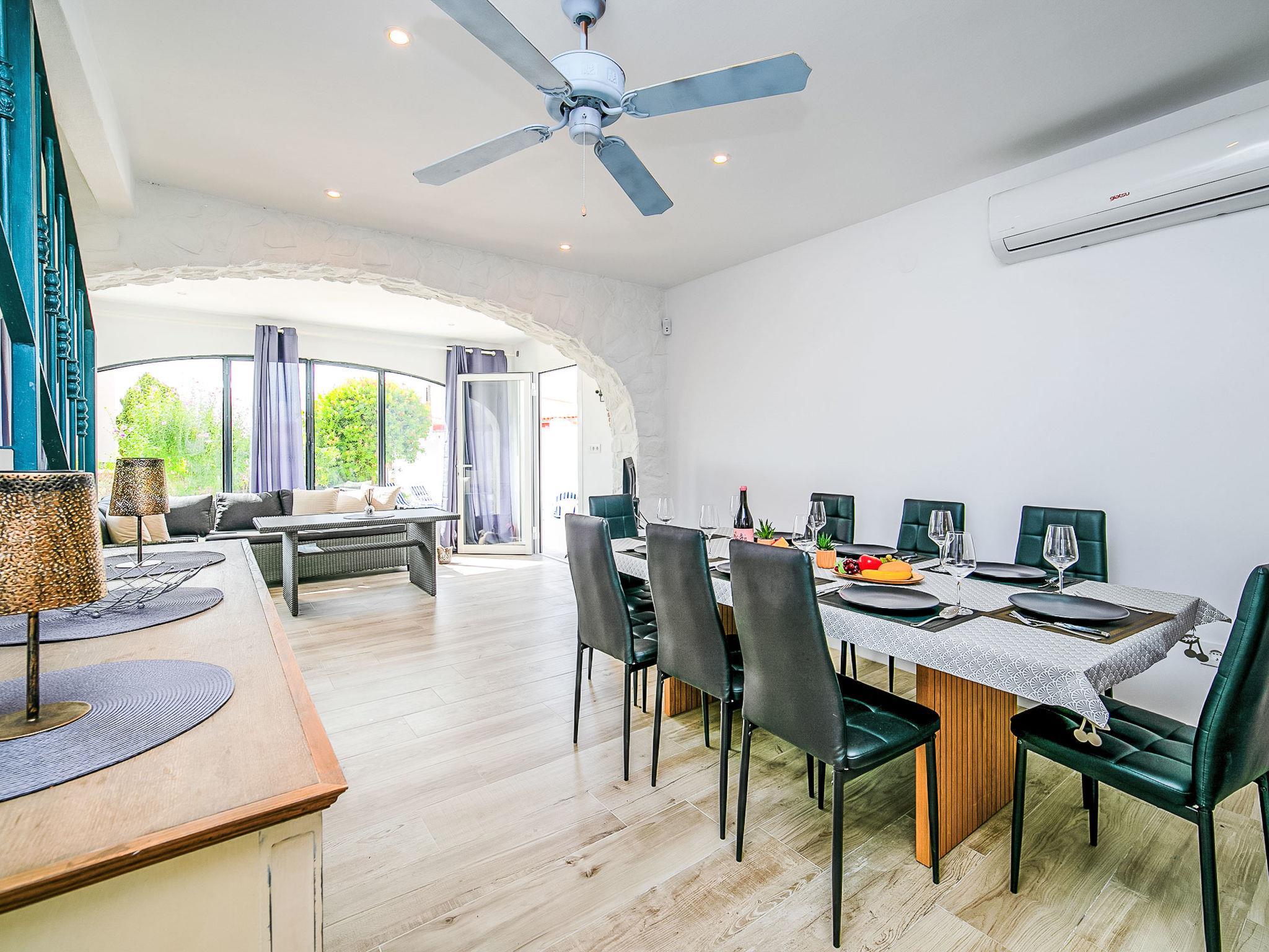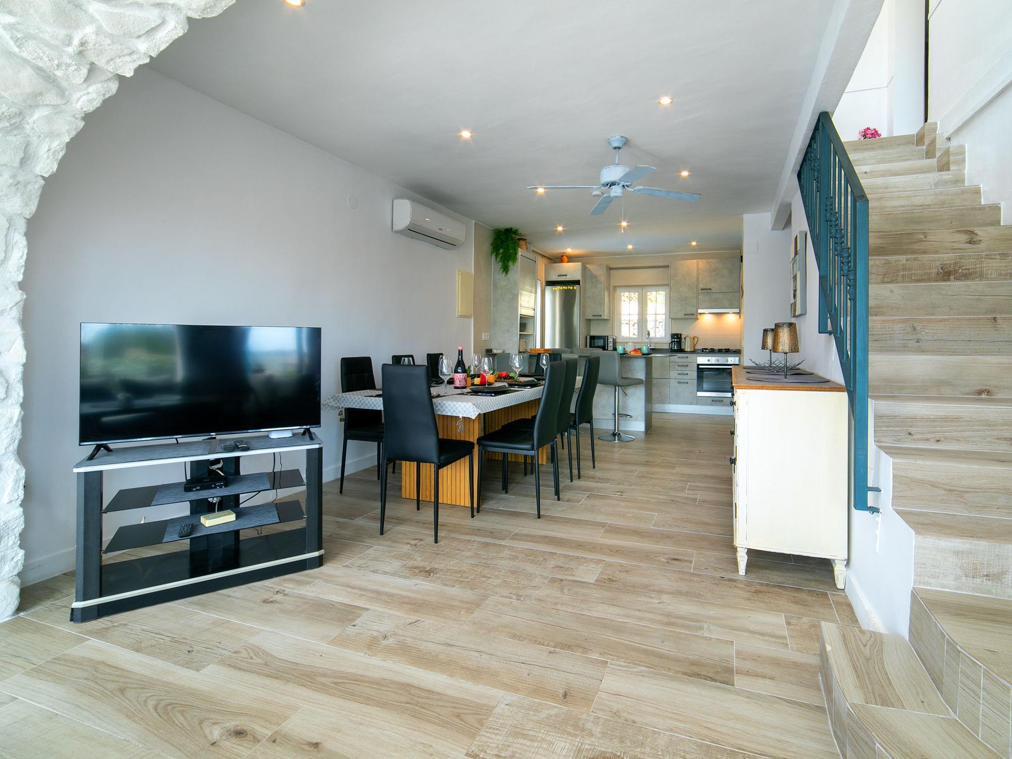 "Hagios", 6-Zimmer-Haus 165 m2 auf 2 Stockwerken. Geräumig und hell, komfortabel und schön eingerichtet: offenes Wohn-/Esszimmer mit Sat-TV, Klimaanlage, Ventilator und Warmluftheizung. Ausgang zur Terrasse, zum Schwimmbad. 1 Zimmer mit 1 franz. Bett (1 x 160 cm, Länge 200 cm), Klimaanlage und Warmluftheizung. 1 Zimmer mit 1 Doppelbett (2 x 80 cm, Länge 200 cm), Klimaanlage und Warmluftheizung. Offene Küche (Geschirrspüler, 4 Flammen, Toaster, Wasserkocher, Mikrowelle, elektrische Kaffeemaschine). Dusche/WC. Obergeschoss: Wohnzimmer. Ausgang zur Terrasse. 2 Zimmer, jedes Zimmer mit 1 franz. Bett (1 x 160 cm, Länge 200 cm), Klimaanlage, Ventilator und Warmluftheizung. Bad/WC, Dusche/WC. Terrassenmöbel, Gartengrill, Liegestühle. Sicht auf die Ortschaft und das Städtchen. Zur Verfügung: Waschmaschine, Bügeleisen, Kinderhochstuhl, Babybett bis 2 Jahre, Haartrockner. Internet (WLAN, gratis). Parkplatz (2 Autos). Bitte beachten: Nichtraucher-Haus. CV-VUT0478360-A // Reg. Nr.: ESFCTU0000030290002756110000000000000000VUT0478360-A3