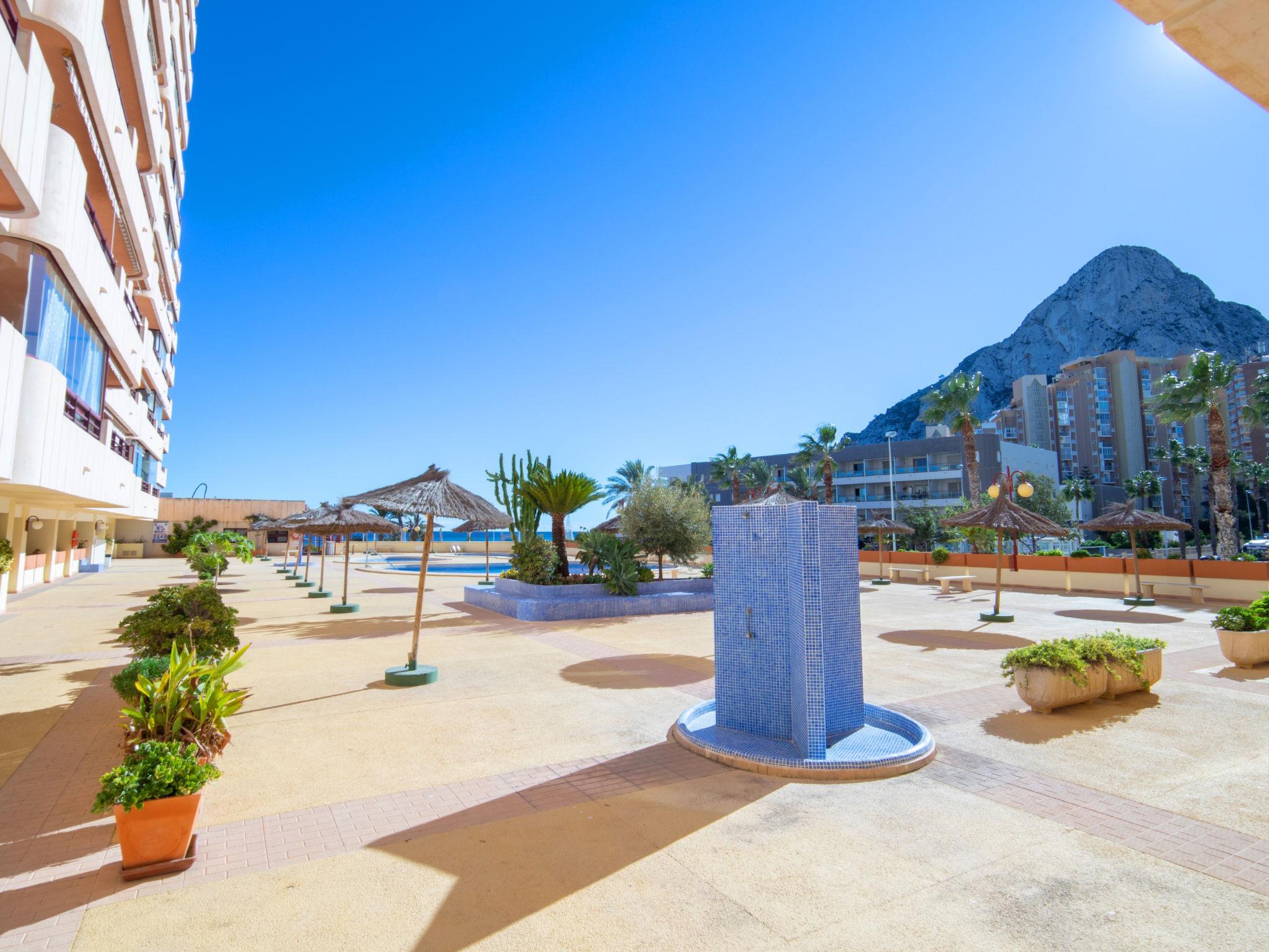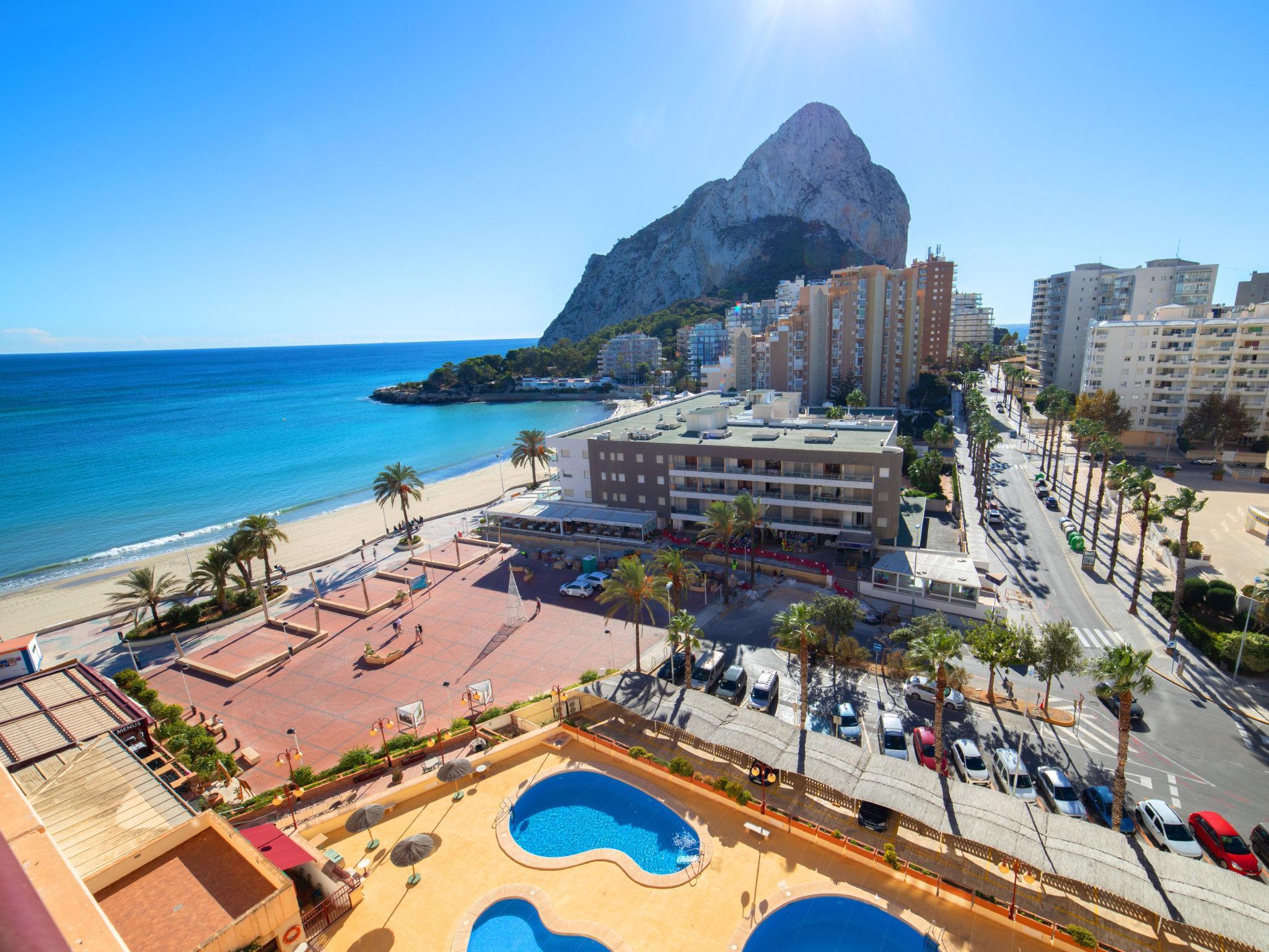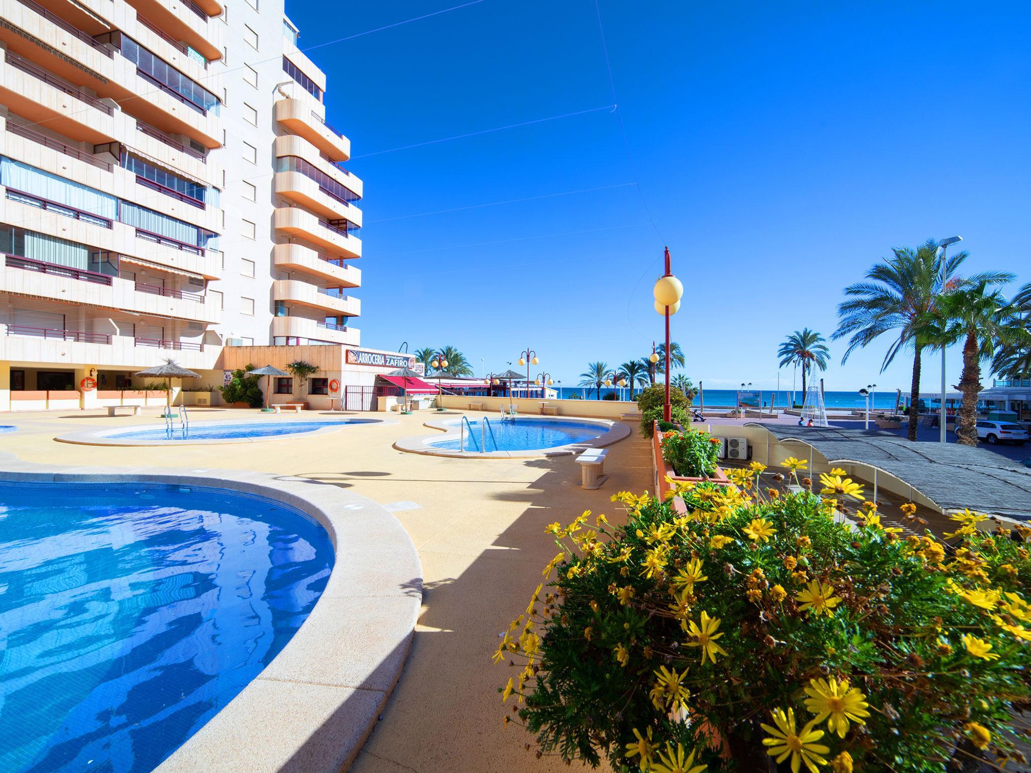 Playa Levante: Grosses, schönes Appartementhaus "Zafiro". 1.8 km vom Zentrum von Calpe, sonnige Lage, 50 m vom Meer, 50 m vom Strand, direkter Zugang zum Strand. Zur Mitbenutzung: Grundstück (eingezäunt), 3 Schwimmbäder (40 - 180 cm tief, saisonale Verfügbarkeit: 01.Jan. - 31.Dez.). Kinderbecken, Aussendusche, Terrasse. Zur Alleinbenutzung: Terrasse. In der Anlage: Fahrstuhl. Supermarkt 100 m, Restaurant, Bar 10 m, Bushaltestelle 300 m. Golfplatz (9 Loch) 12 km, Tennis 2 km. Nahe gelegene Sehenswürdigkeiten: Aqualandia, Mundomar, Terra Mítica, Terra Natura, Benidorm Palace (Benidorm). Wandergebiete: Peñon de Ifach 700 m.