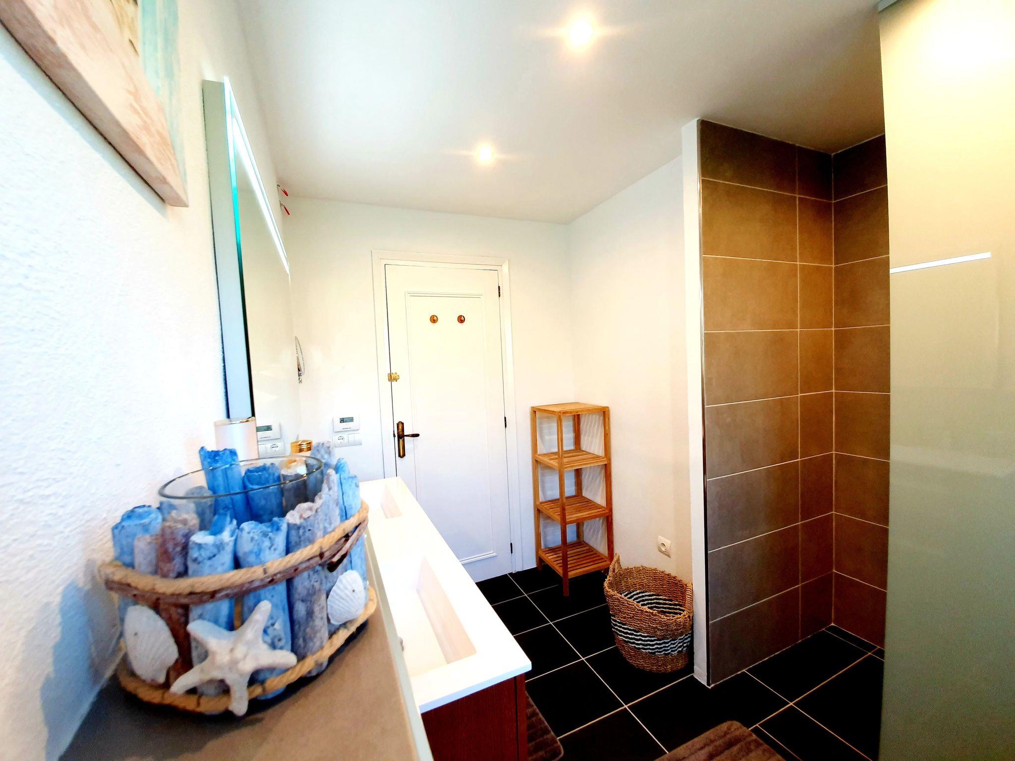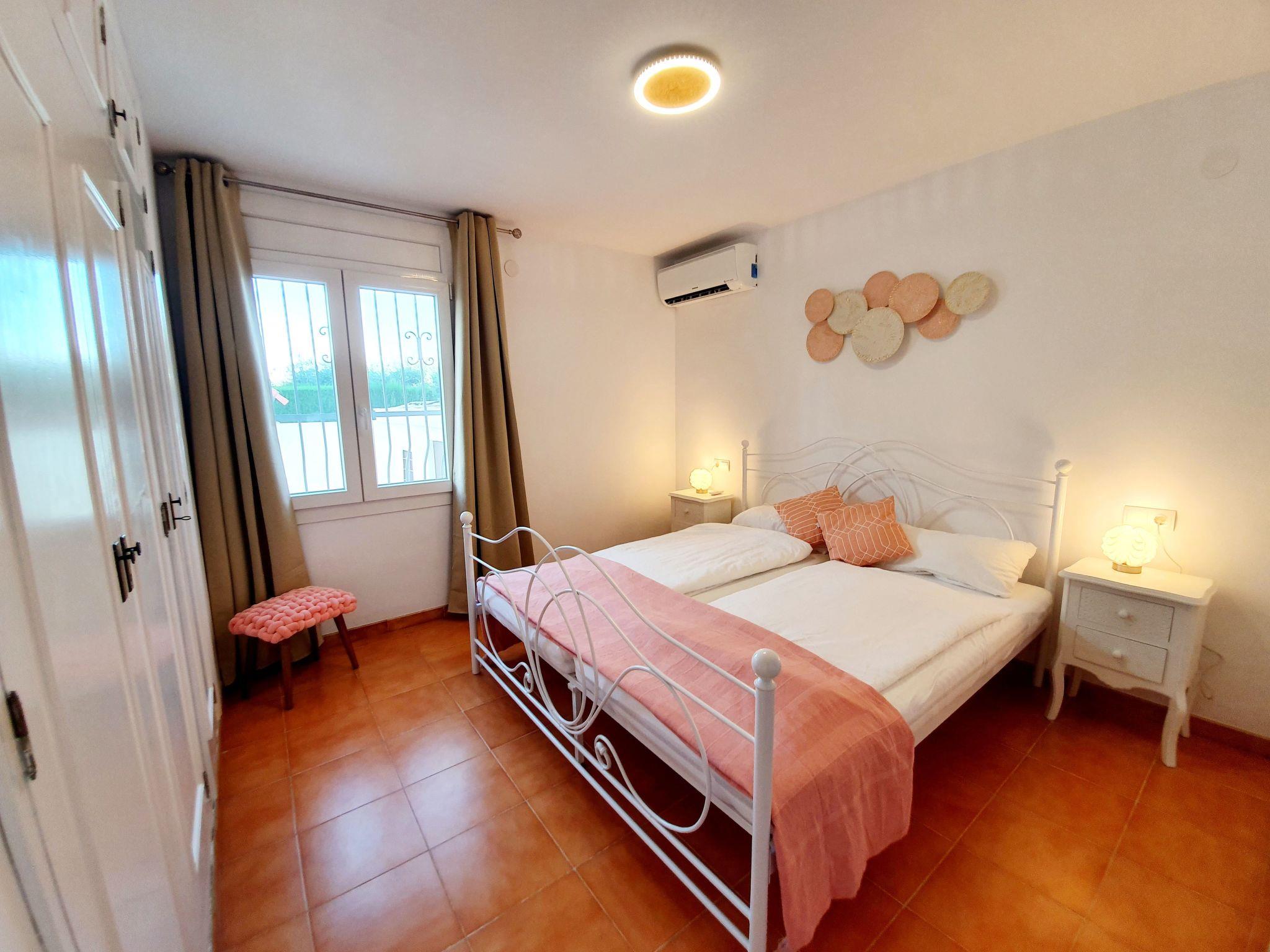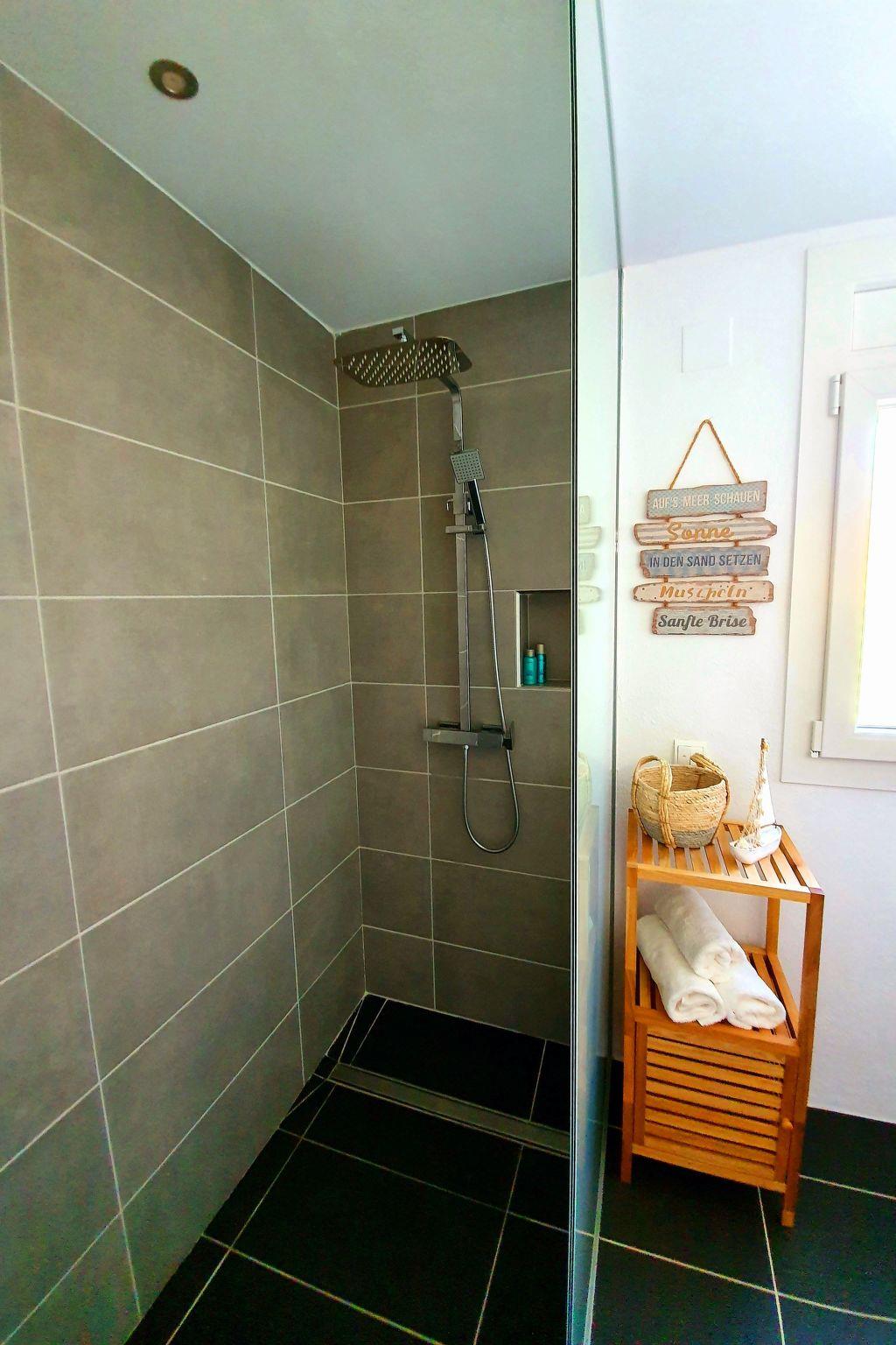 Das Ferienhaus hat 3 Schlafzimmer, 2 Badezimmer mit Dusche (mit Fußbodenheizung), 1 großes Wohnzimmer mit Kamin sowie 1 große Wohnküche, verteilt auf einer Etage. Alle Schlafzimmer und das Wohnzimmer sind mit modernsten Klimageräten ausgestattet, welche auch bei hohen Außentemperaturen im Sommer, angenehme Temperaturen erzeugen und eine erholsame Nachtruhe ermöglichen. Im Mittelpunkt des Hauses steht der großzügige, Licht durchflutete Wohnbereich mit offenem Kaminofen und dem Zugang zur überdachten Außenterrasse. Ebenfalls auf dieser Ebene befindet sich die neue Küche und der modern gestaltete Essbereich. Die neue Küche verfügt über höchsten Komfort, eine umfangreiche Ausstattung an Elektrogeräten und sinnvolle Küchenutensilien.