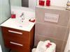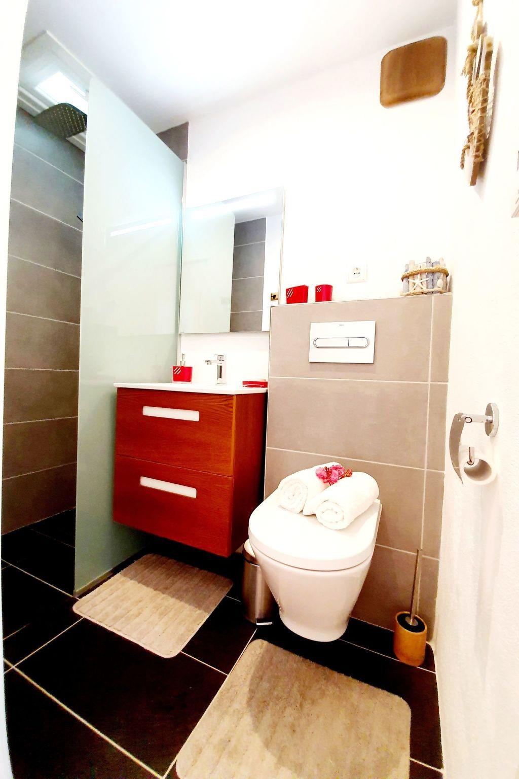 • 1 Badezimmer mit 2 Einzelwaschbecken, Dusche, Toilette, Fön