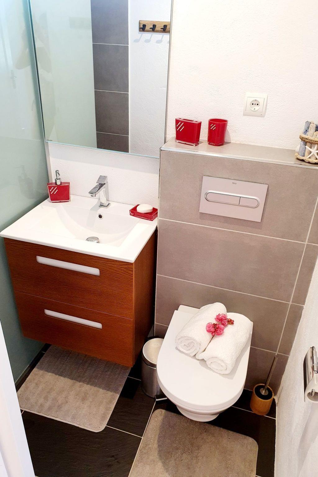 • 1 Badezimmer mit Einzelwaschbecken, Dusche, Toilette, Fön