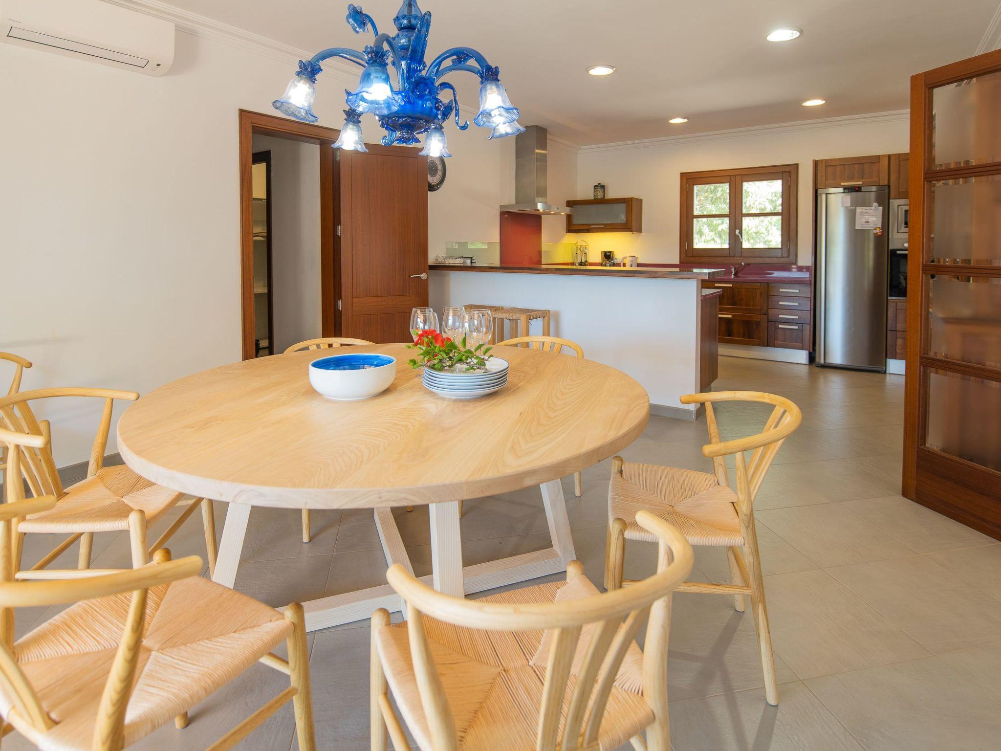 Im Inneren ist das Haus über zwei helle Etagen verteilt. Im Erdgeschoss empfängt Sie eine einladende Eingangshalle, die zu einer voll ausgestatteten Küche, einem geräumigen Wohnzimmer, einem Schlafzimmer mit Doppelbett und einem Badezimmer führt. Im Obergeschoss befinden sich drei Doppelschlafzimmer, eines davon mit eigenem Bad, die alle über eine eigene Terrasse mit herrlichem Blick verfügen. Um einen angenehmen Aufenthalt zu gewährleisten, verfügt das Haus über eine Klimaanlage in der Küche und in den oberen Zimmern, wobei eine warme Brise durch alle Räume weht.
