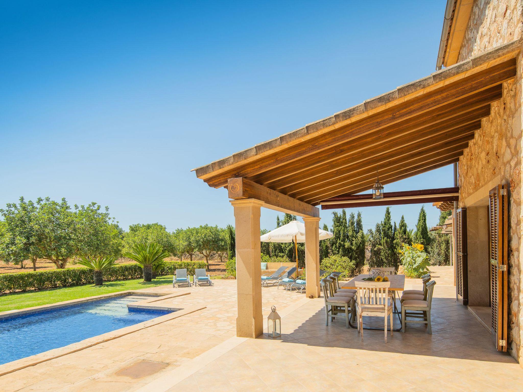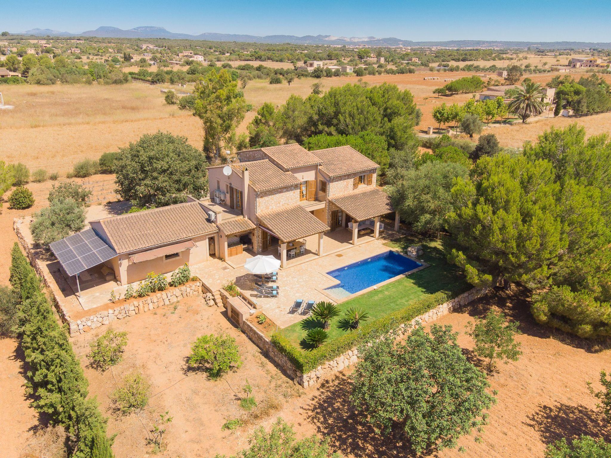 Draußen umarmt Sie die Natur auf einem 14.100 m2 großen, vollständig umzäunten Grundstück, wo Privatsphäre und Entspannung an erster Stelle stehen. Die überdachten und offenen Terrassen sowie der 4x8 m große Swimmingpool bieten den perfekten Rahmen für sonnige Tage. Sechs Liegestühle laden zum Entspannen im Schatten eines typisch mallorquinischen Hains mit Johannisbrot- und Feigenbäumen ein, während der Rasen ein idealer Ort für Kinder zum Spielen ist.