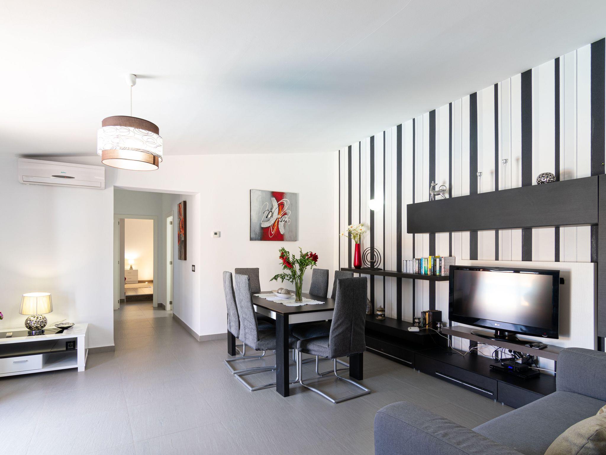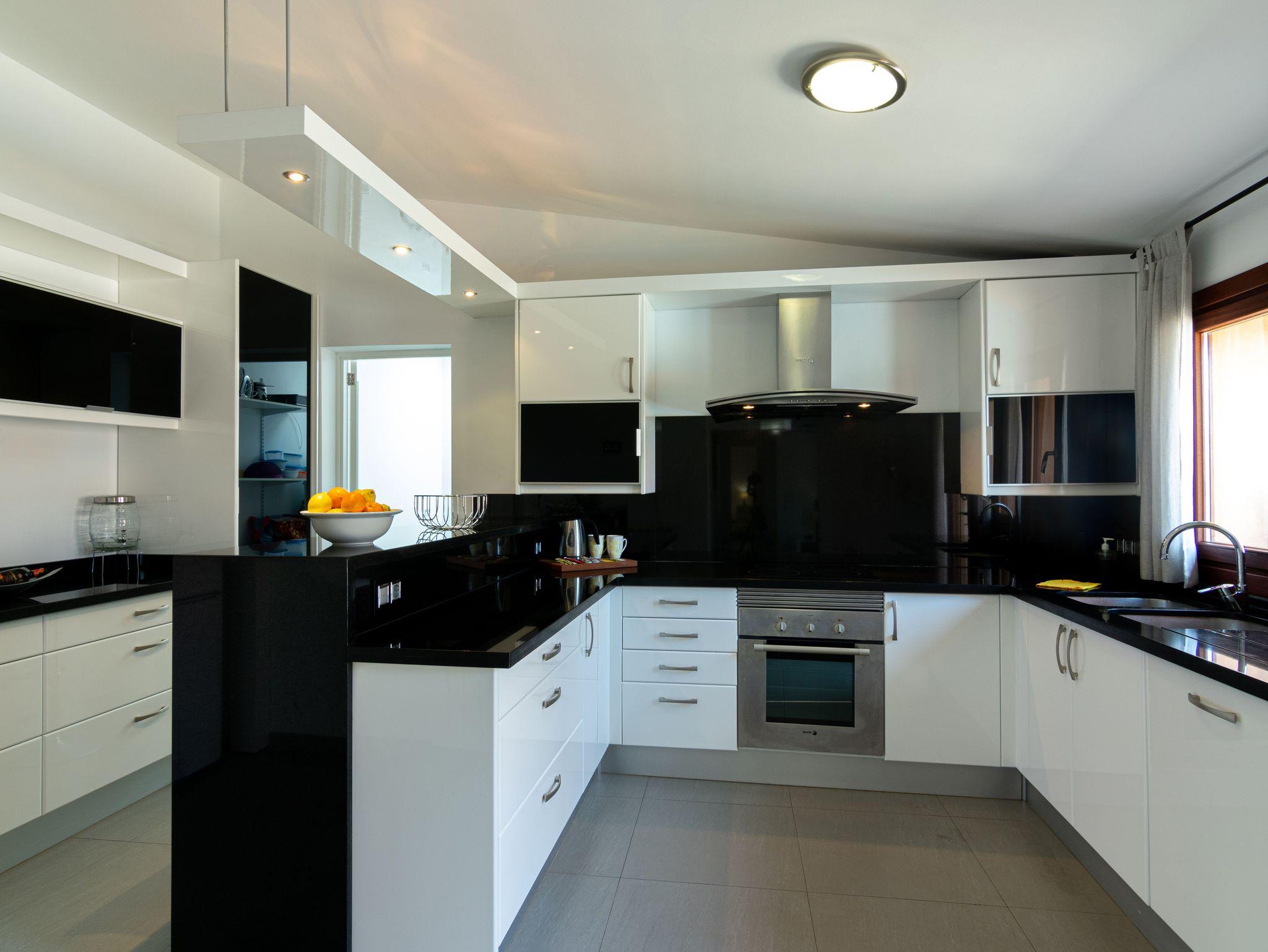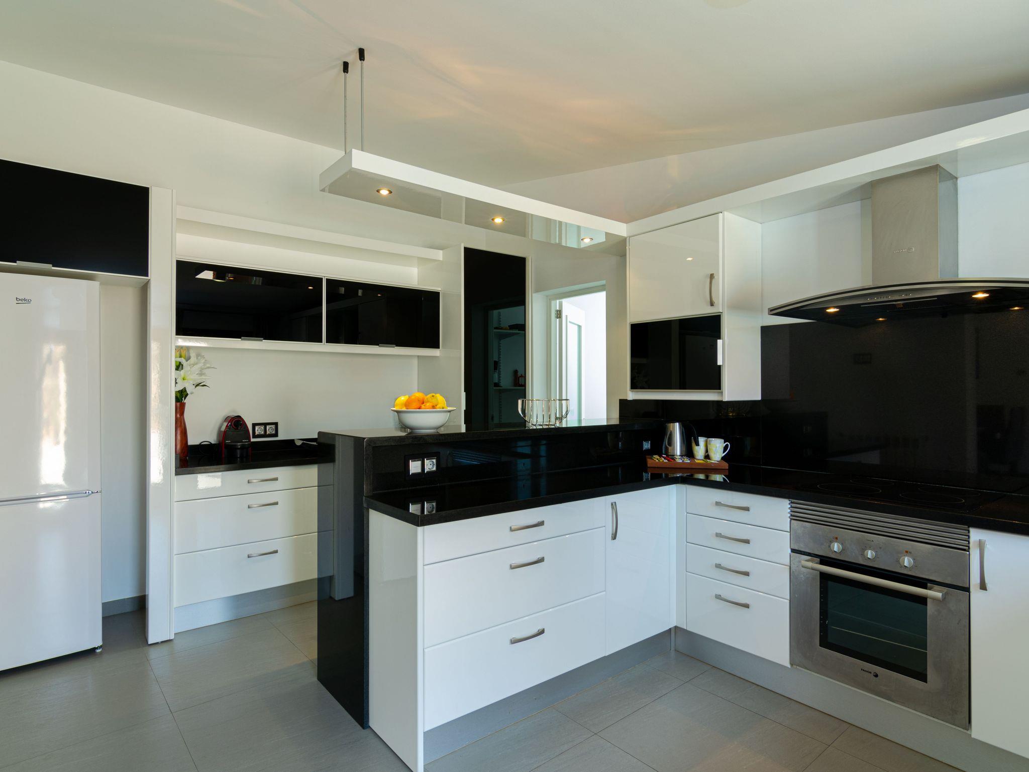 Im Inneren überrascht der Hauptwohnbereich mit einem modernen Schwarz-Weiß-Design. Wohnzimmer und Küche teilen sich einen offenen, hellen und einladenden Raum ? ideal zum Entspannen, Plaudern oder Planen von Ausflügen. Zwei komfortable Schlafzimmer und ein elegantes Badezimmer vervollständigen diesen Teil des Hauses.