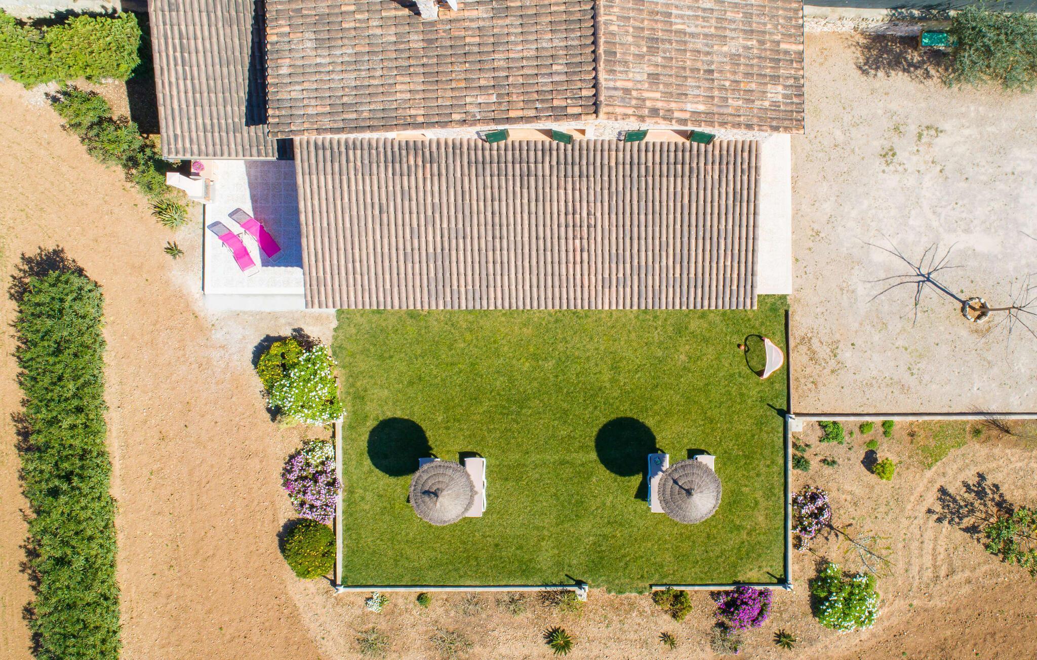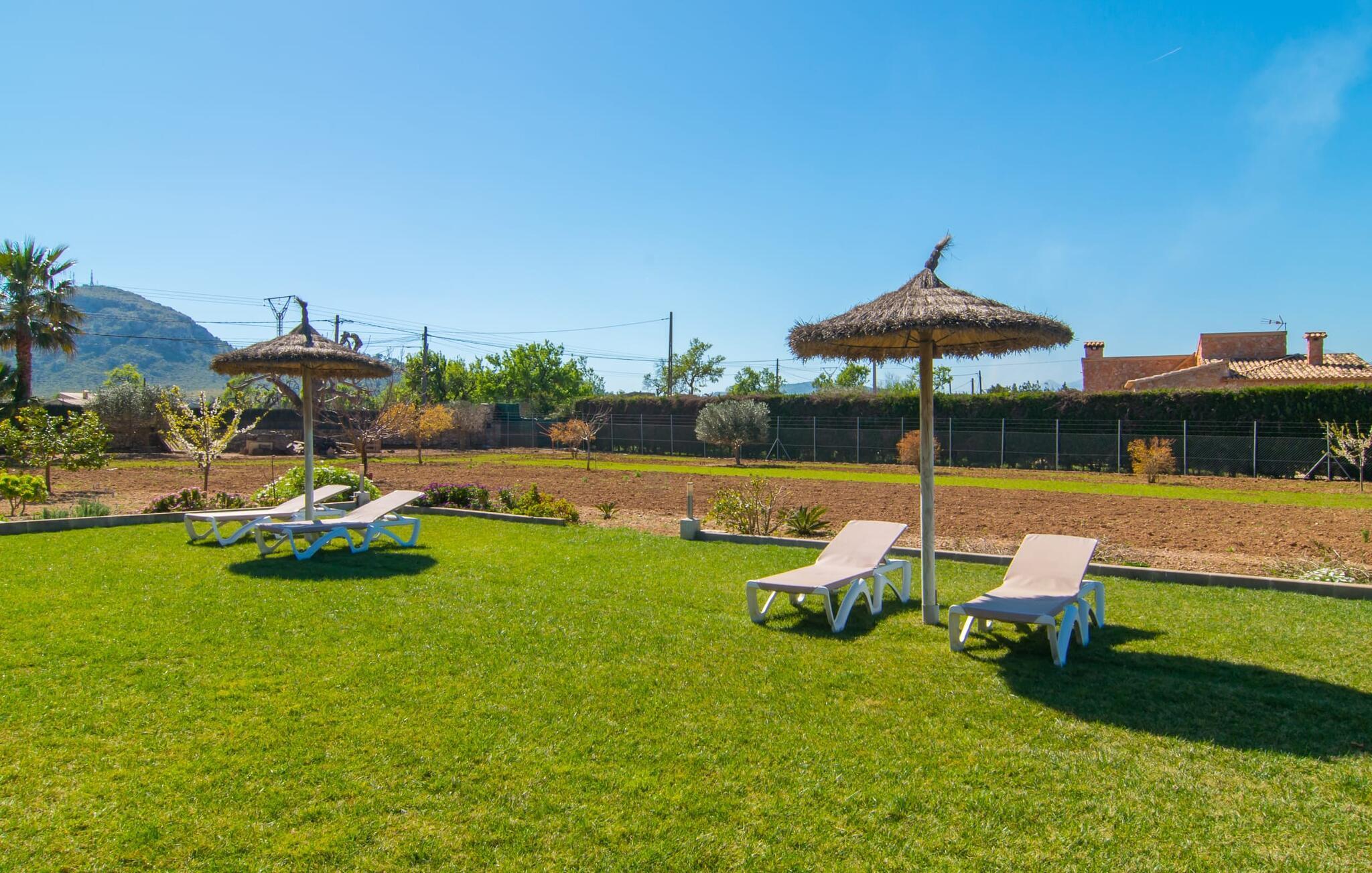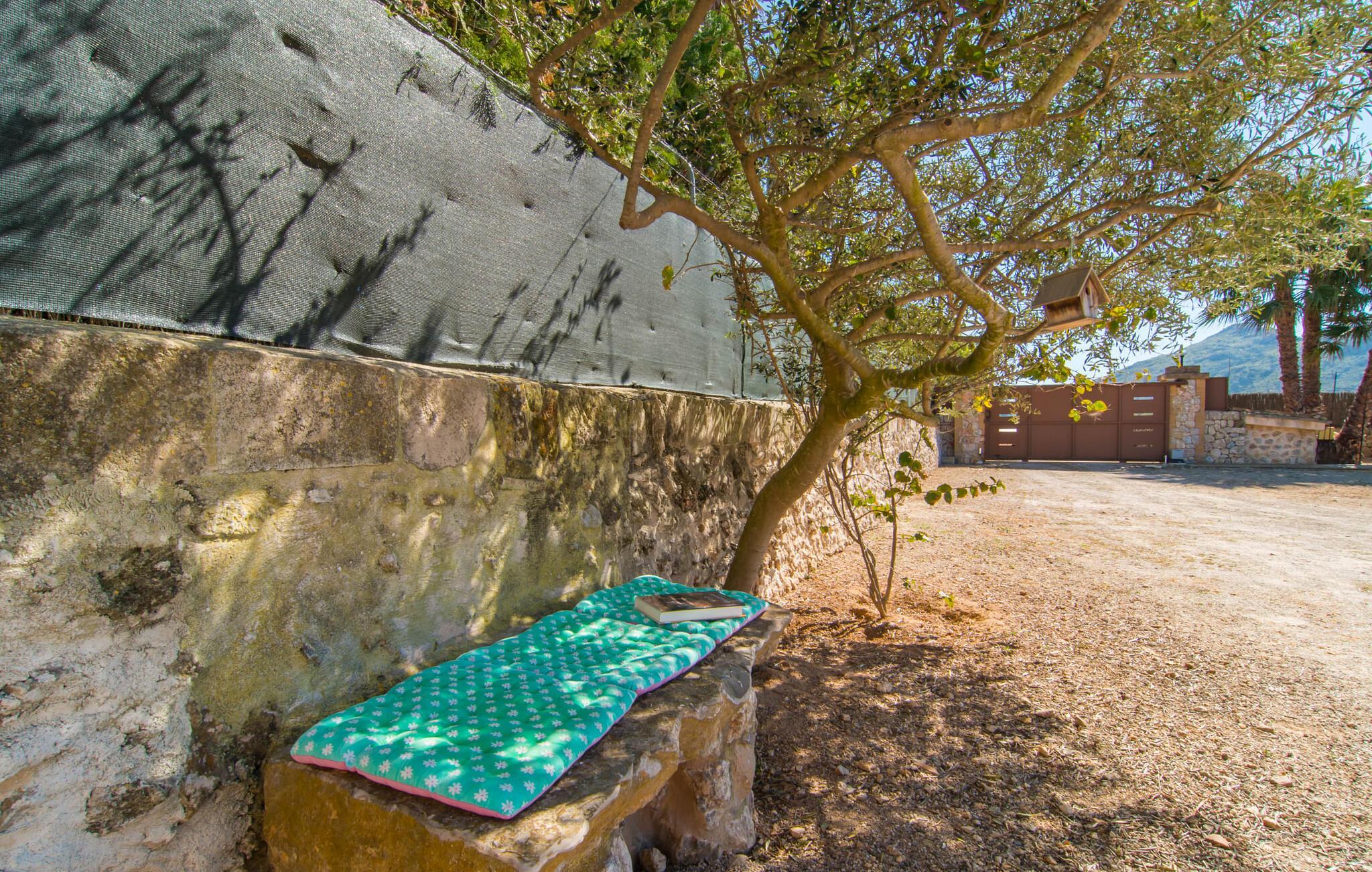 Der schön angelegte Außenbereich mit einer großen Terrasse von 100 m2 bietet einen ruhigen Rückzugsort mit herrlichem Blick auf die Natur und den Garten, und Sie können auch ein herzhaftes Frühstück oder eine gute Mahlzeit in guter Gesellschaft genießen, mit Blick auf die Berge (Sierra de Tramuntana). Eine Besonderheit für Familien: Kinder können die Hühner im Garten füttern, die sich in der Villa befinden, und frische Eier sind auf Anfrage erhältlich. Radfahrer werden die Lage der Finca zu schätzen wissen, da sie an der bekanntesten Radtouristenroute Camí d'es Brasals liegt, der Straße, die Alcúdia mit Pollença verbindet.