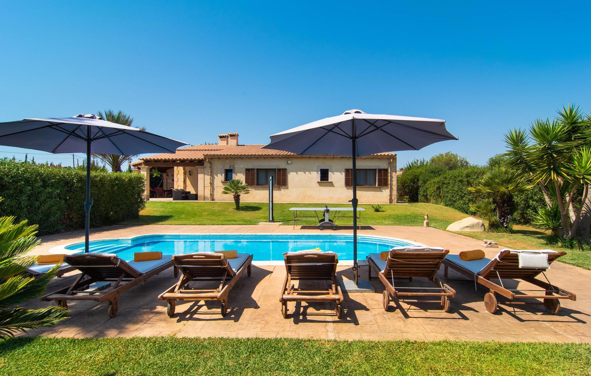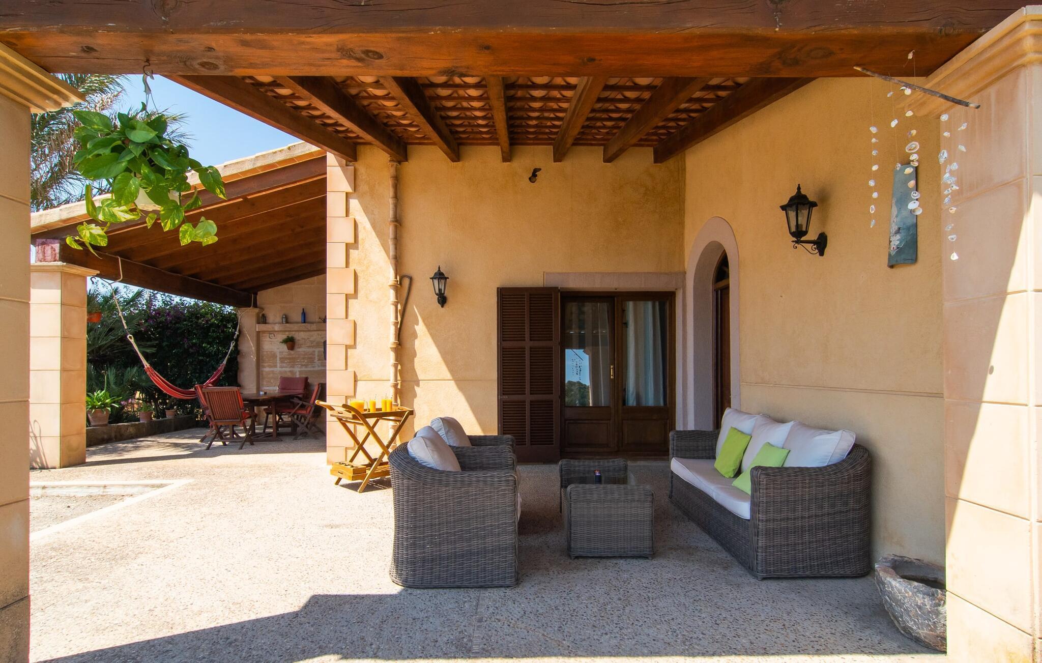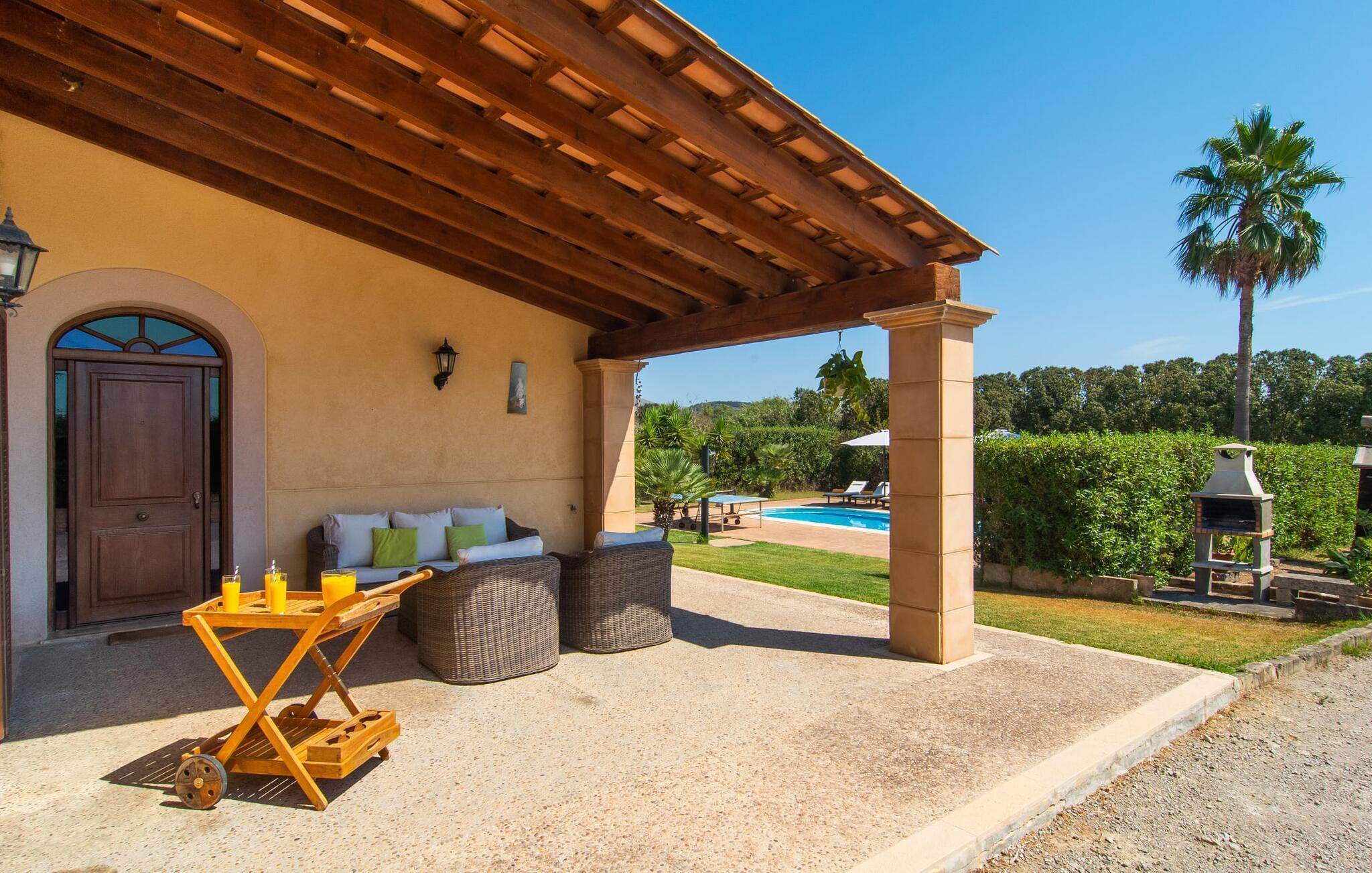 Dieser gepflegte Rückzugsort bietet einen einladenden Außenbereich, der sich perfekt für gemütliche Spaziergänge oder Sonnenbäder eignet. Zwei der drei Terrassen sind überdacht, ideal, um mediterrane Sommerabende zu genießen. Eine Terrasse blickt auf den Garten, mit üppigen Hecken und unberührten Rasenflächen, die den leicht zugänglichen Pool umgeben. Die zweite überdachte Terrasse verfügt über einen gemauerten Grill und einen Essbereich im Freien mit direktem Zugang zur Küche. Obwohl Sie sich eine Mauer mit dem Nachbargrundstück "Kelly" teilen, bleiben Ihre Privatsphäre, Ihre Einfahrt und Ihr exklusiver Poolzugang erhalten. "Can Siurell" ist auch perfekt für Radsportbegeisterte, da es an einer landschaftlich reizvollen Route liegt, die sich durch die hügeligen Landschaften der Serra de Llevant schlängelt.