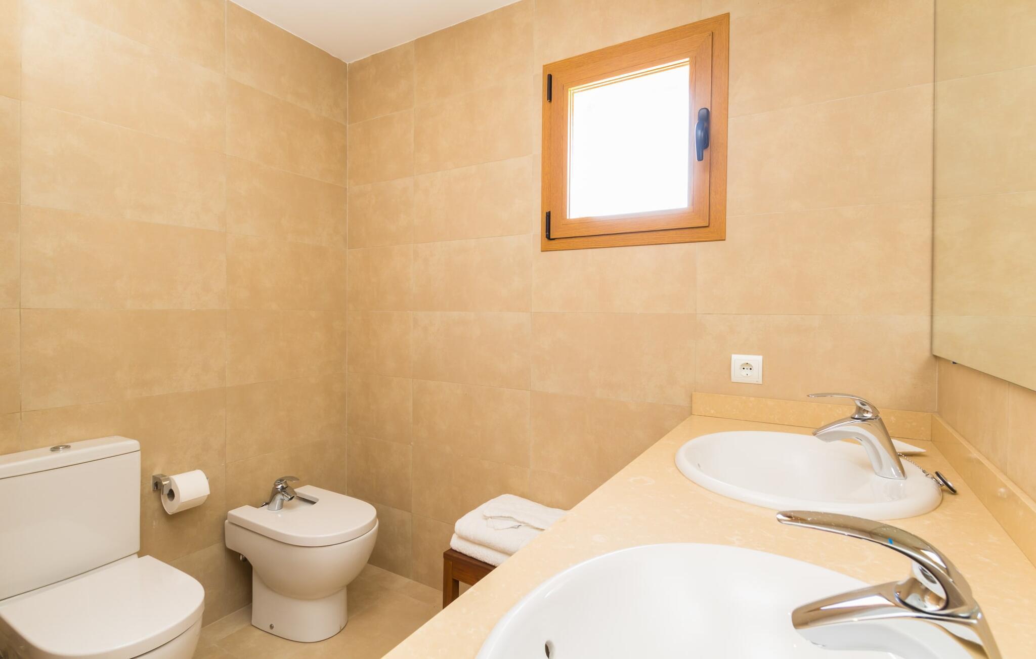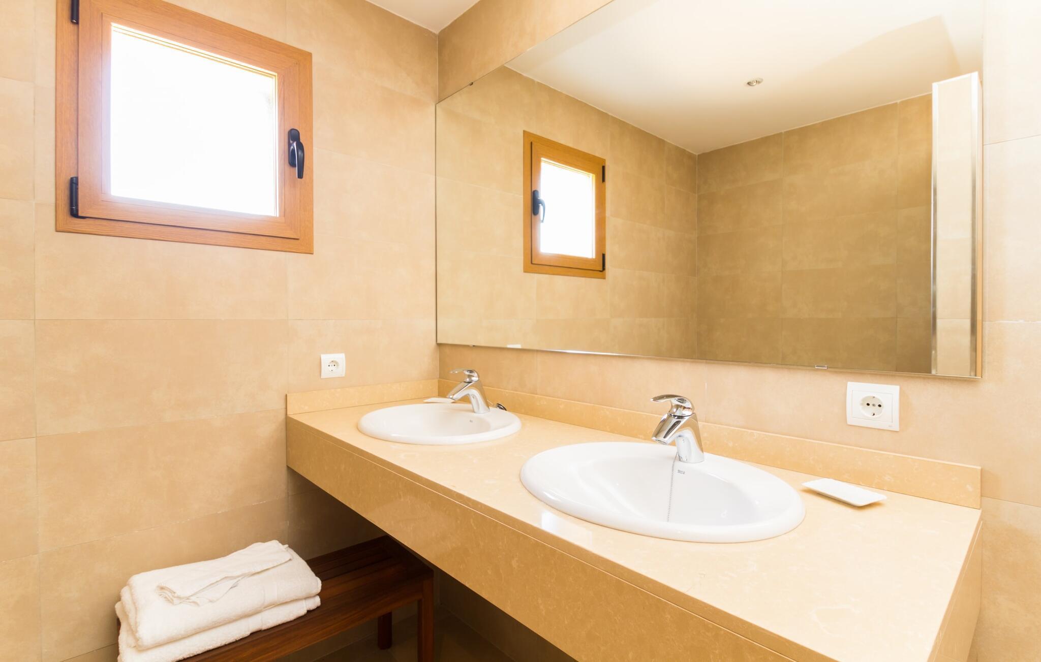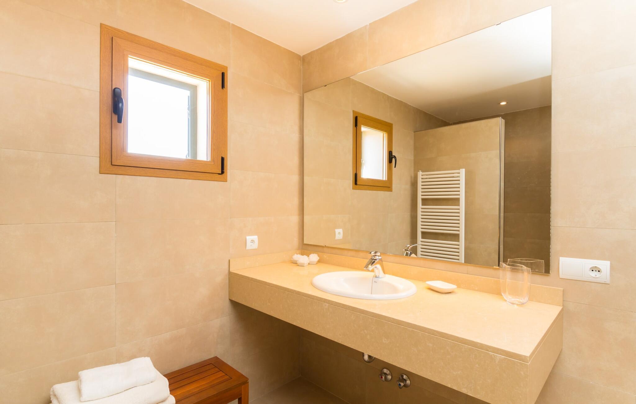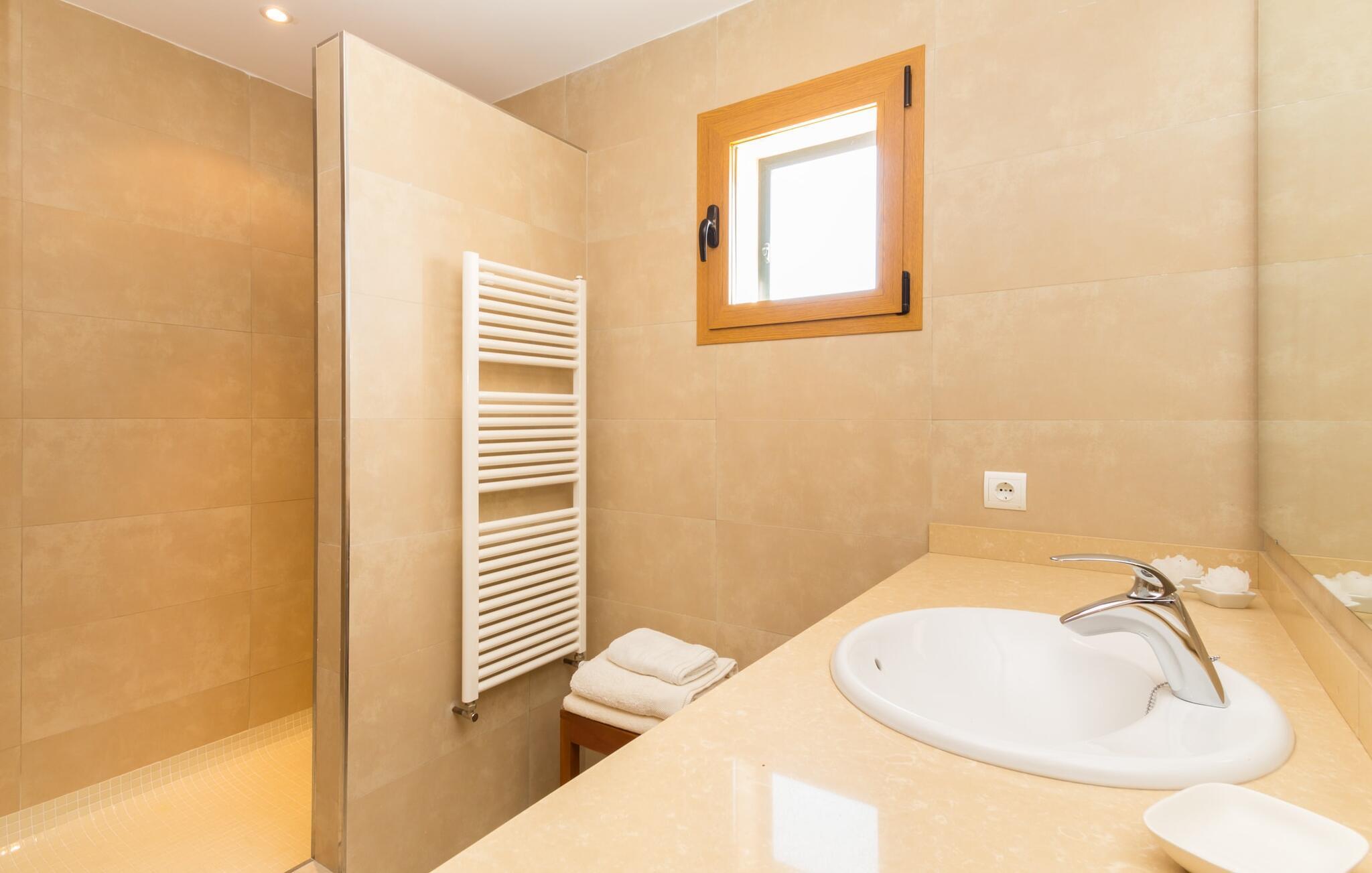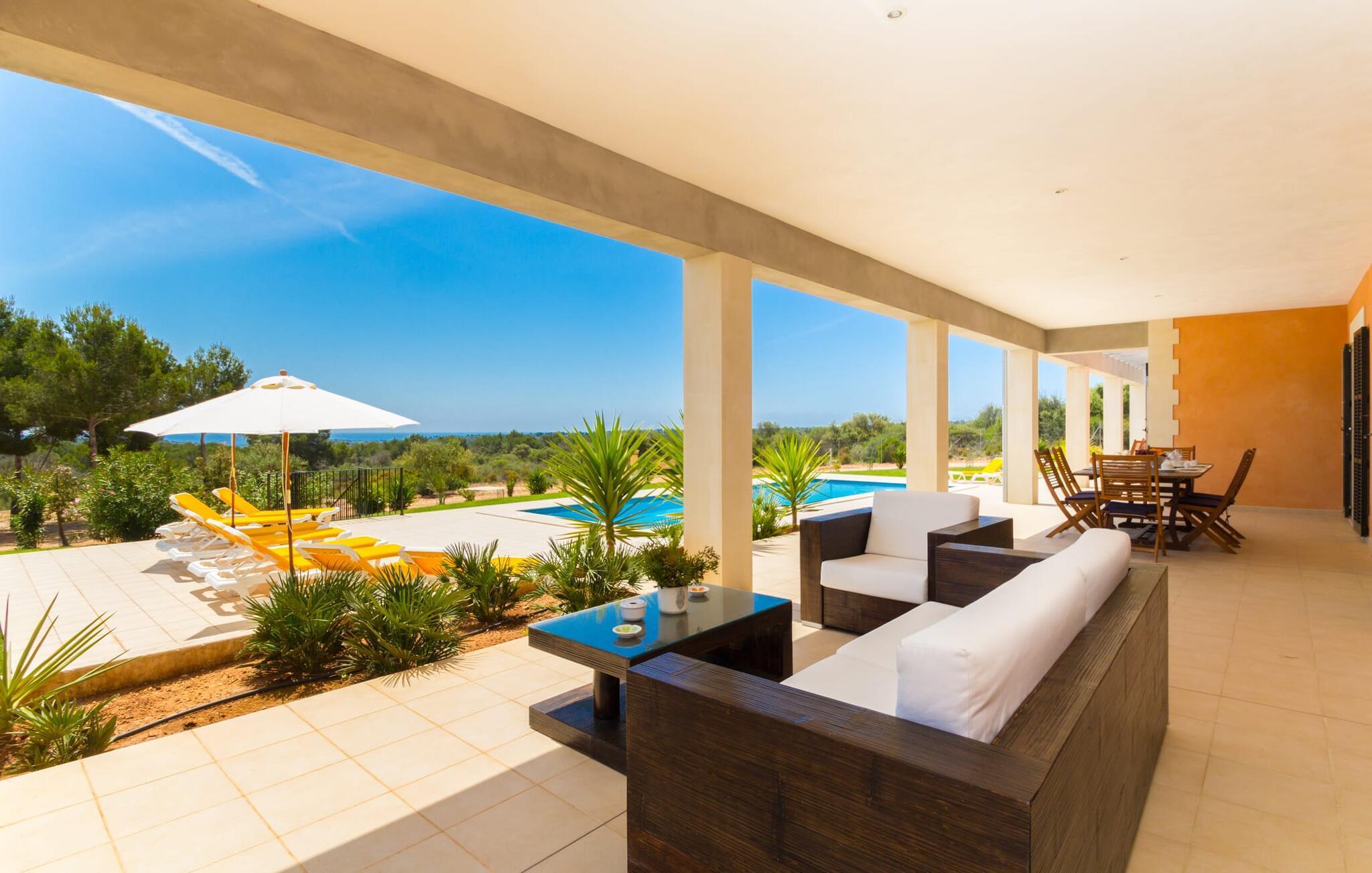Urlauber sollten auf dieses Objekt achten, wenn sie besonderen Wert auf ein modernes, gepflegtes Ferienhaus legen und einen unverbaubaren Meerblick lieben. Auf einer unglaublichen Fläche von 355.500 Quadratmetern ragt die Villa „Can Tem“ wie ein kleines, prächtiges Anwesen aus der Landschaft hervor. Das Grundstück in der Nähe des Hauses verfügt über Rasenflächen und Terrassenflächen und ist von junger mediterraner Vegetation gesäumt, die noch lange einen freien Blick auf die umliegende Landschaft und den Blick darüber hinaus auf das Meer ermöglicht. Im Zentrum des Gartens befindet sich der elegante Pool, der über einen sehr bequemen Stufenzugang verfügt und daneben eine großzügige Sonnenterrasse. Auf den bequemen Liegestühlen kann man in der Sonne faulenzen und die traumhafte Kulisse dieser Ferienvilla genießen. Wenn die Sonne zu stark scheint, stehen Ihnen drei Sonnenschirme zum Schutz zur Verfügung. Ebenso können Sie den luftigen Schatten der großen Veranda nutzen, die sich drei Stufen über dem Pool befindet: Mit ihrer gelb gestrichenen Fassade wirkt sie äußerst fröhlich und einladend. Hier können Sie ein geselliges Abendessen am großen Esstisch genießen und dabei die herrliche Aussicht genießen oder sich stilvoll in der hochmodernen Lounge entspannen. Ein toller Raum für den eleganten Beginn und Ausklang des Tages: Am Abend können Sie beispielsweise ein kulinarisches Barbecue veranstalten. Die Erweiterung der Veranda bietet weitere teilweise schattige Plätze, an denen Sie sich in kleinen Gruppen zusammenschließen oder ganz nach Belieben auch alleine bleiben können. Sie können auch unter den Olivenbäumen in der Nähe der beiden Nebengebäude sitzen und vielleicht ein gutes Buch lesen. Die Möglichkeiten, Ihren ganz persönlichen Lieblingsplatz zu finden, sind vielfältig.
