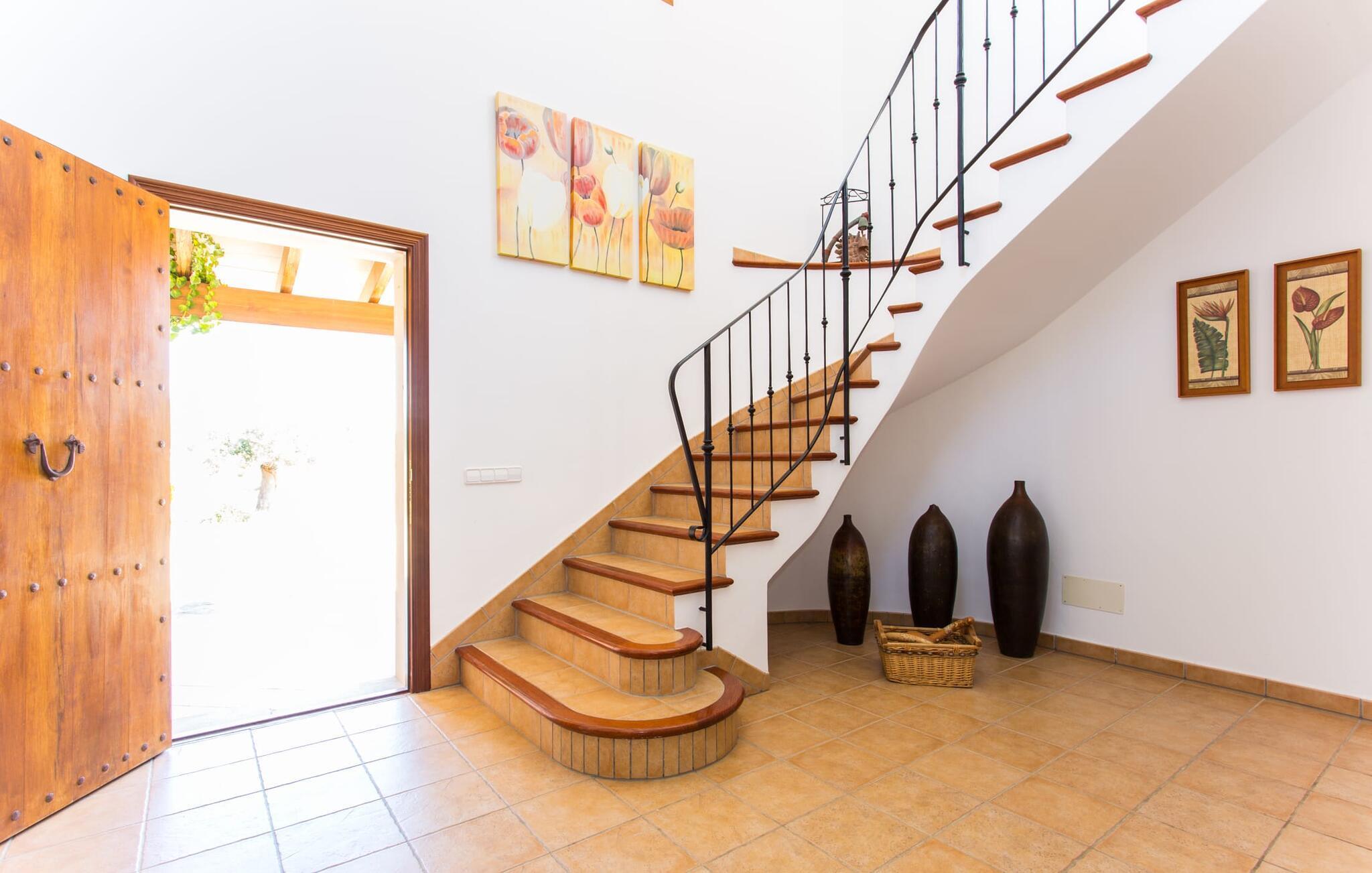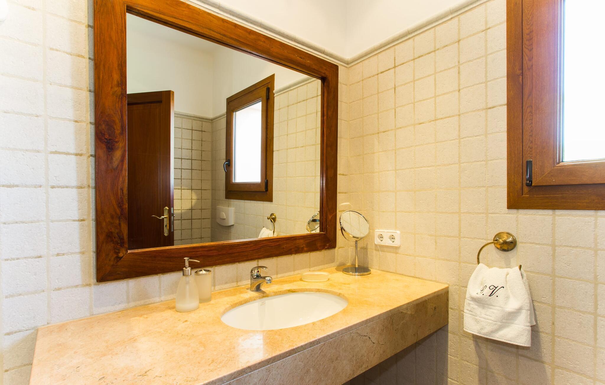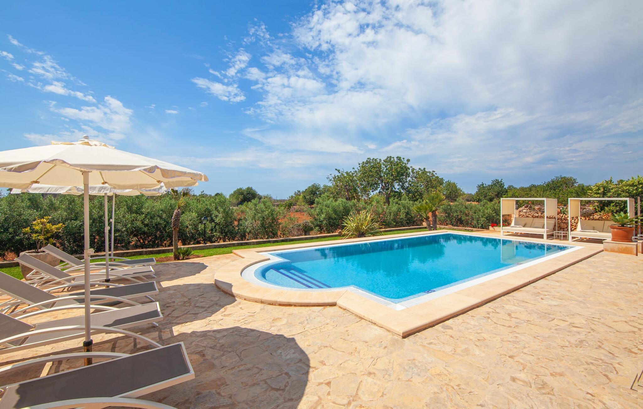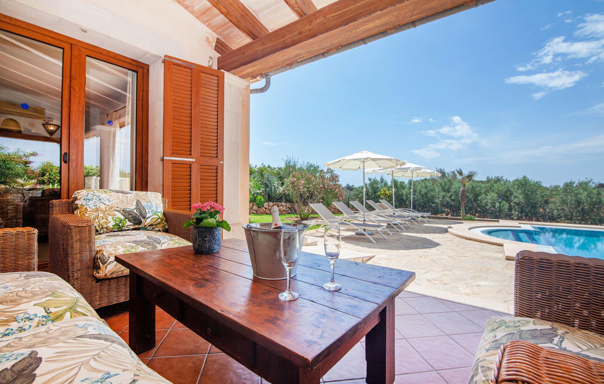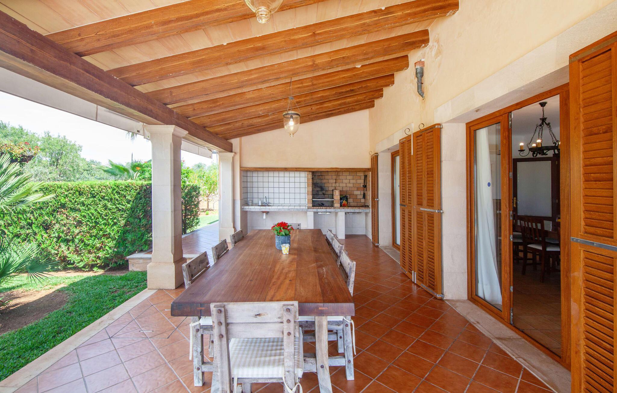 An einem strahlend sonnigen Tag machen wir uns auf den Weg zur Villa „Cas Fidever“, nachdem wir vom Eigentümer Miquel zu einer Besichtigungstour eingeladen wurden. Nach einer schönen Fahrt durch die Landschaft rund um die Villa sind wir neugierig auf das Anwesen und werden mit einem herzlichen Empfang begrüßt. Es ist ein äußerst schönes Ferienhaus und es scheint sehr gepflegt zu sein. Das erste, was uns Miquel zeigt, ist der unglaublich vielseitige Außenbereich. Das Anwesen ist von üppigem mediterranem Grün umgeben und verfügt über einige spektakuläre Bereiche, in denen man den ganzen Tag im Freien verbringen kann und die wir uns unbedingt genauer ansehen müssen. Zwischen dem Haus und dem Pool befindet sich eine große überdachte Terrasse, die einen Teil des Gebäudes umgibt. Es liegt leicht erhöht und bietet einen fantastischen Blick auf den Pool und den Garten. Auf der einen Seite der Terrasse steht ein großer, rustikaler Esstisch, auf der anderen Seite gibt es eine Sitzecke mit einigen sehr bequem aussehenden Rattanstühlen. Beide Bereiche laden auf ihre Art ein, je nachdem, ob Sie gemütlich im Freien essen oder bei einem kühlen Getränk entspannen möchten. In der Nähe des Esstisches befindet sich außerdem eine kleine Außenküche mit gemauertem Grill, auf der Sie abends köstliche Mahlzeiten zubereiten können. Draußen im Garten gibt es noch einen luftigen, überdachten, pavillonartigen Bereich – hier können Sie Tischtennis spielen. Nach einem intensiven Tischtennisspiel können Sie sich unter der praktischen Außendusche abspülen und dann direkt in den luxuriösen Swimmingpool springen, der mit seinen kunstvoll gefliesten Stufen und dunkelblauen Verzierungen ein wahrer Anblick ist. Die Tiefe des Beckens variiert zwischen 1,20 m und 1,85 m. Wenn Sie zum Entspannen bereit sind, können Sie es sich auf dem Rasen oder auf den etwas bequemeren Liegestühlen am Beckenrand gemütlich machen, bei Bedarf auch mit Sonnenschirmen. Und wahrscheinlich müssen Sie einen Weg finden, zu entscheiden, wer auf dem schönen Tagesbett im Freien liegen darf, das attraktiv vor einer breiten Natursteinmauer platziert ist.