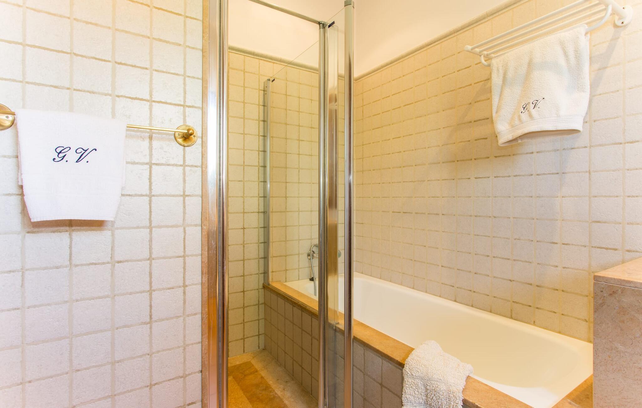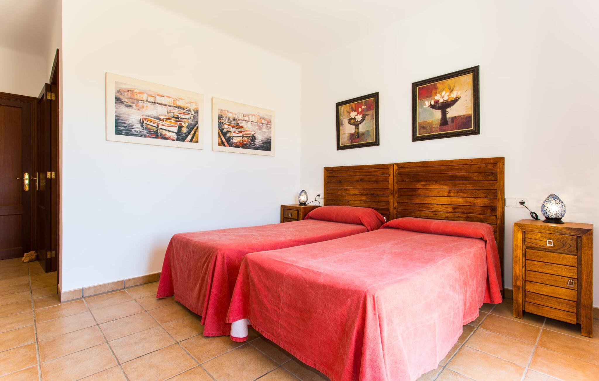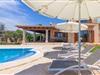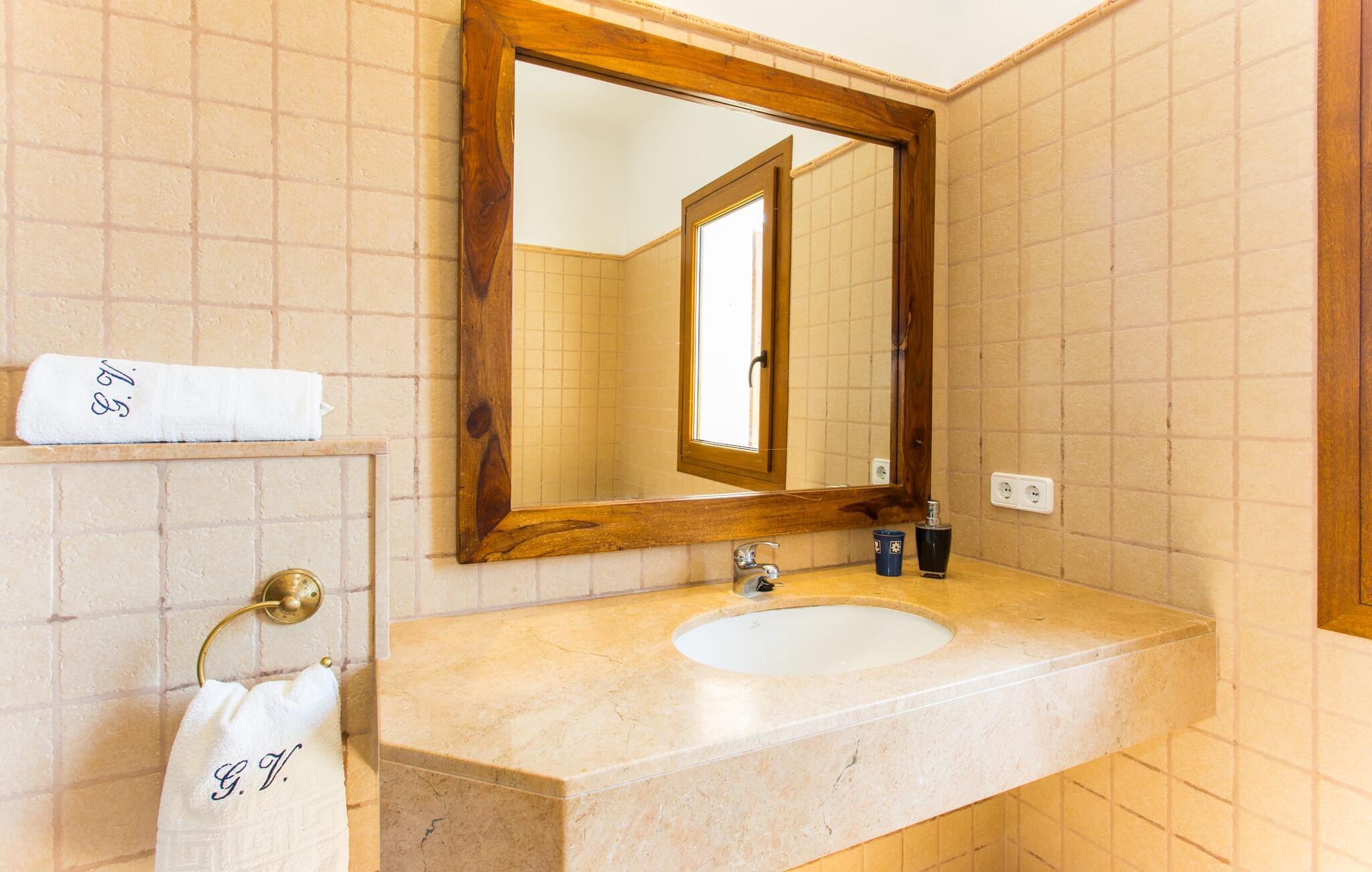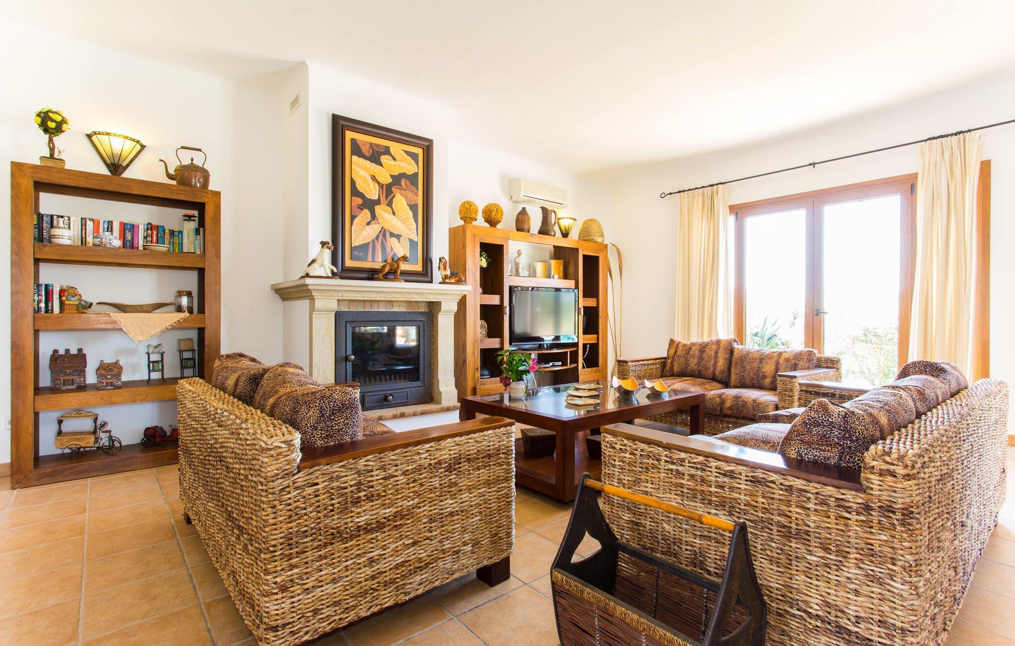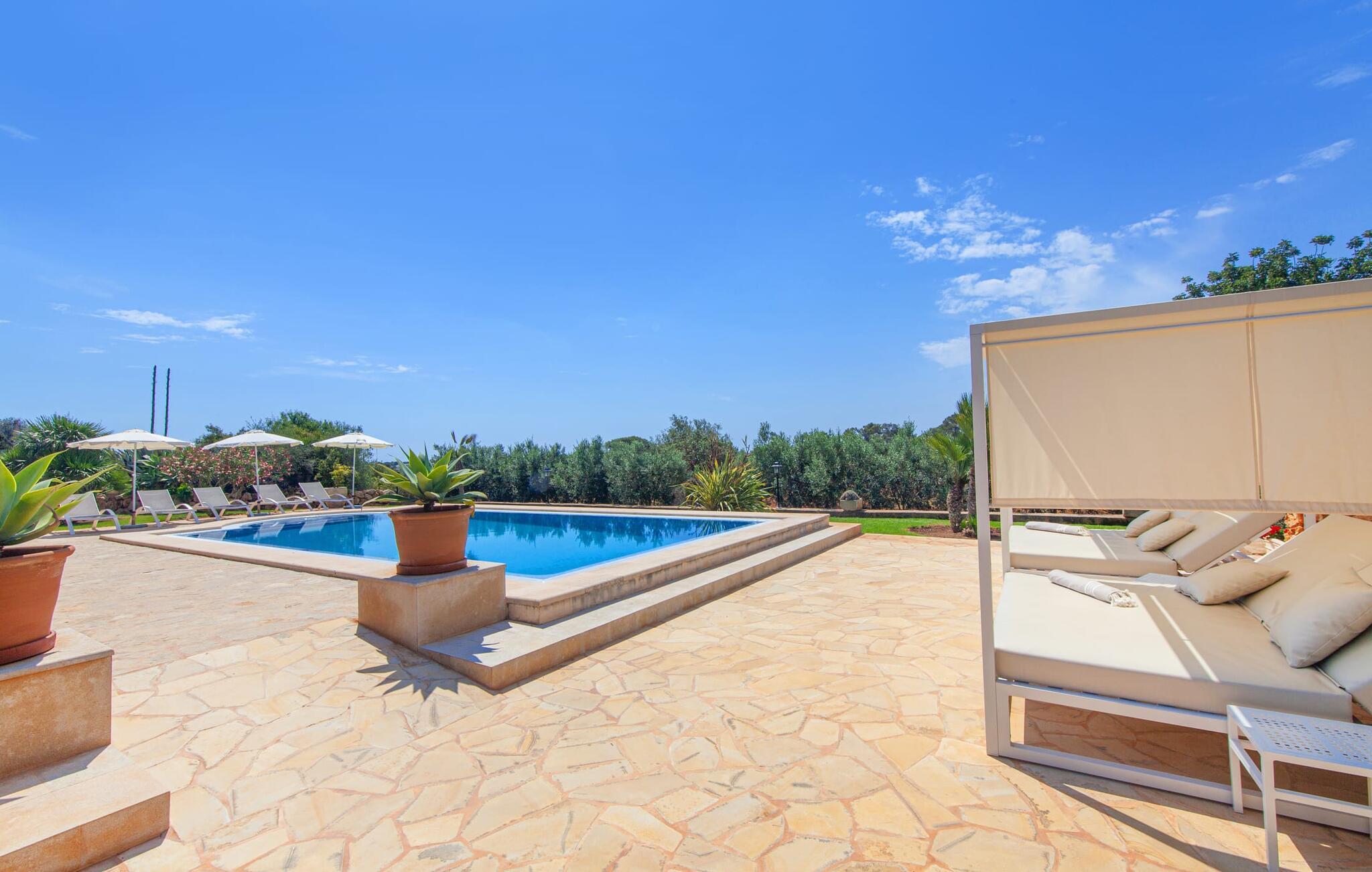 An einem strahlend sonnigen Tag machen wir uns auf den Weg zur Villa „Cas Fidever“, nachdem wir vom Eigentümer Miquel zu einer Besichtigungstour eingeladen wurden. Nach einer schönen Fahrt durch die Landschaft rund um die Villa sind wir neugierig auf das Anwesen und werden mit einem herzlichen Empfang begrüßt. Es ist ein äußerst schönes Ferienhaus und es scheint sehr gepflegt zu sein. Das erste, was uns Miquel zeigt, ist der unglaublich vielseitige Außenbereich. Das Anwesen ist von üppigem mediterranem Grün umgeben und verfügt über einige spektakuläre Bereiche, in denen man den ganzen Tag im Freien verbringen kann und die wir uns unbedingt genauer ansehen müssen. Zwischen dem Haus und dem Pool befindet sich eine große überdachte Terrasse, die einen Teil des Gebäudes umgibt. Es liegt leicht erhöht und bietet einen fantastischen Blick auf den Pool und den Garten. Auf der einen Seite der Terrasse steht ein großer, rustikaler Esstisch, auf der anderen Seite gibt es eine Sitzecke mit einigen sehr bequem aussehenden Rattanstühlen. Beide Bereiche laden auf ihre Art ein, je nachdem, ob Sie gemütlich im Freien essen oder bei einem kühlen Getränk entspannen möchten. In der Nähe des Esstisches befindet sich außerdem eine kleine Außenküche mit gemauertem Grill, auf der Sie abends köstliche Mahlzeiten zubereiten können. Draußen im Garten gibt es noch einen luftigen, überdachten, pavillonartigen Bereich – hier können Sie Tischtennis spielen. Nach einem intensiven Tischtennisspiel können Sie sich unter der praktischen Außendusche abspülen und dann direkt in den luxuriösen Swimmingpool springen, der mit seinen kunstvoll gefliesten Stufen und dunkelblauen Verzierungen ein wahrer Anblick ist. Die Tiefe des Beckens variiert zwischen 1,20 m und 1,85 m. Wenn Sie zum Entspannen bereit sind, können Sie es sich auf dem Rasen oder auf den etwas bequemeren Liegestühlen am Beckenrand gemütlich machen, bei Bedarf auch mit Sonnenschirmen. Und wahrscheinlich müssen Sie einen Weg finden, zu entscheiden, wer auf dem schönen Tagesbett im Freien liegen darf, das attraktiv vor einer breiten Natursteinmauer platziert ist.