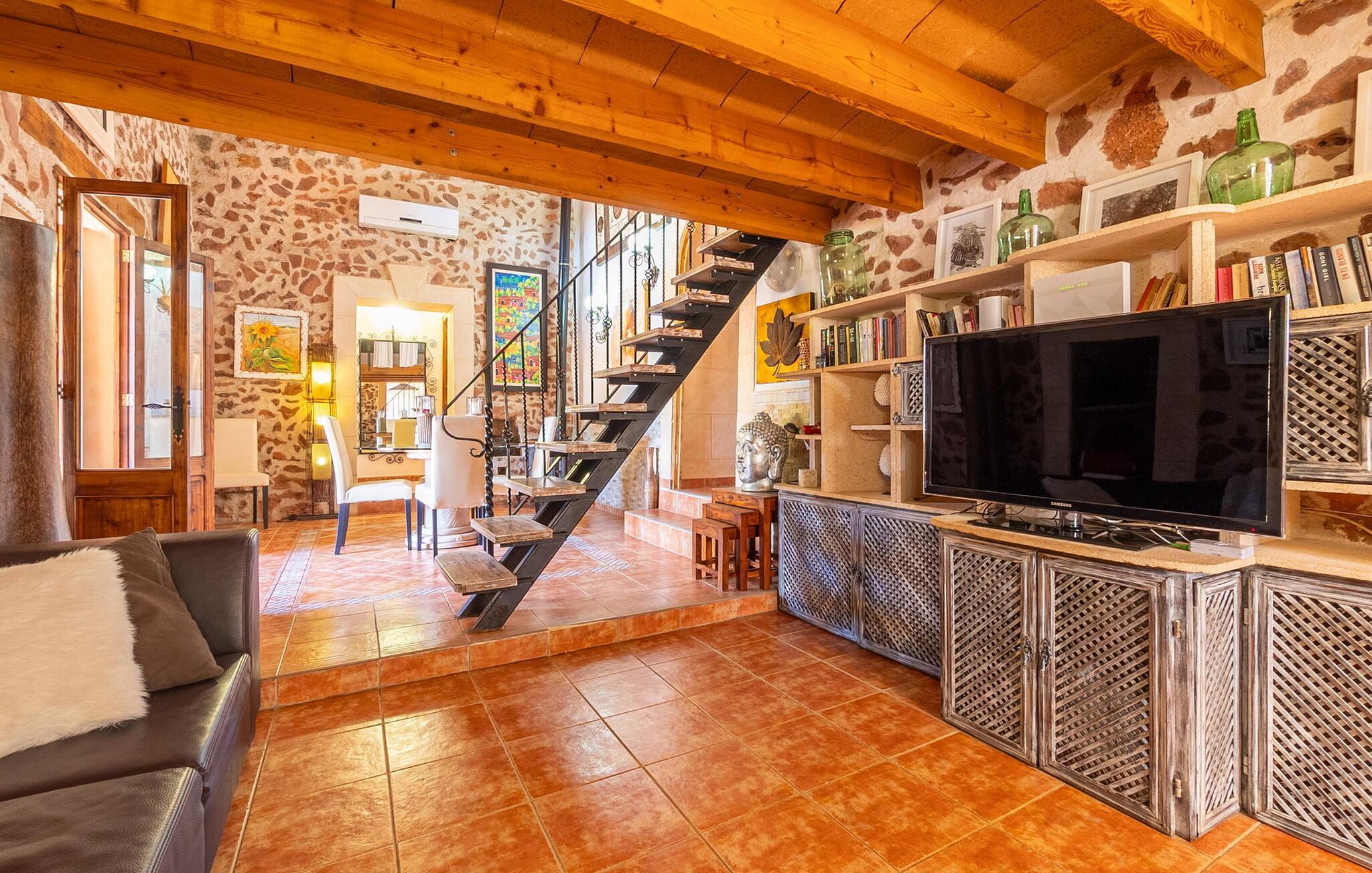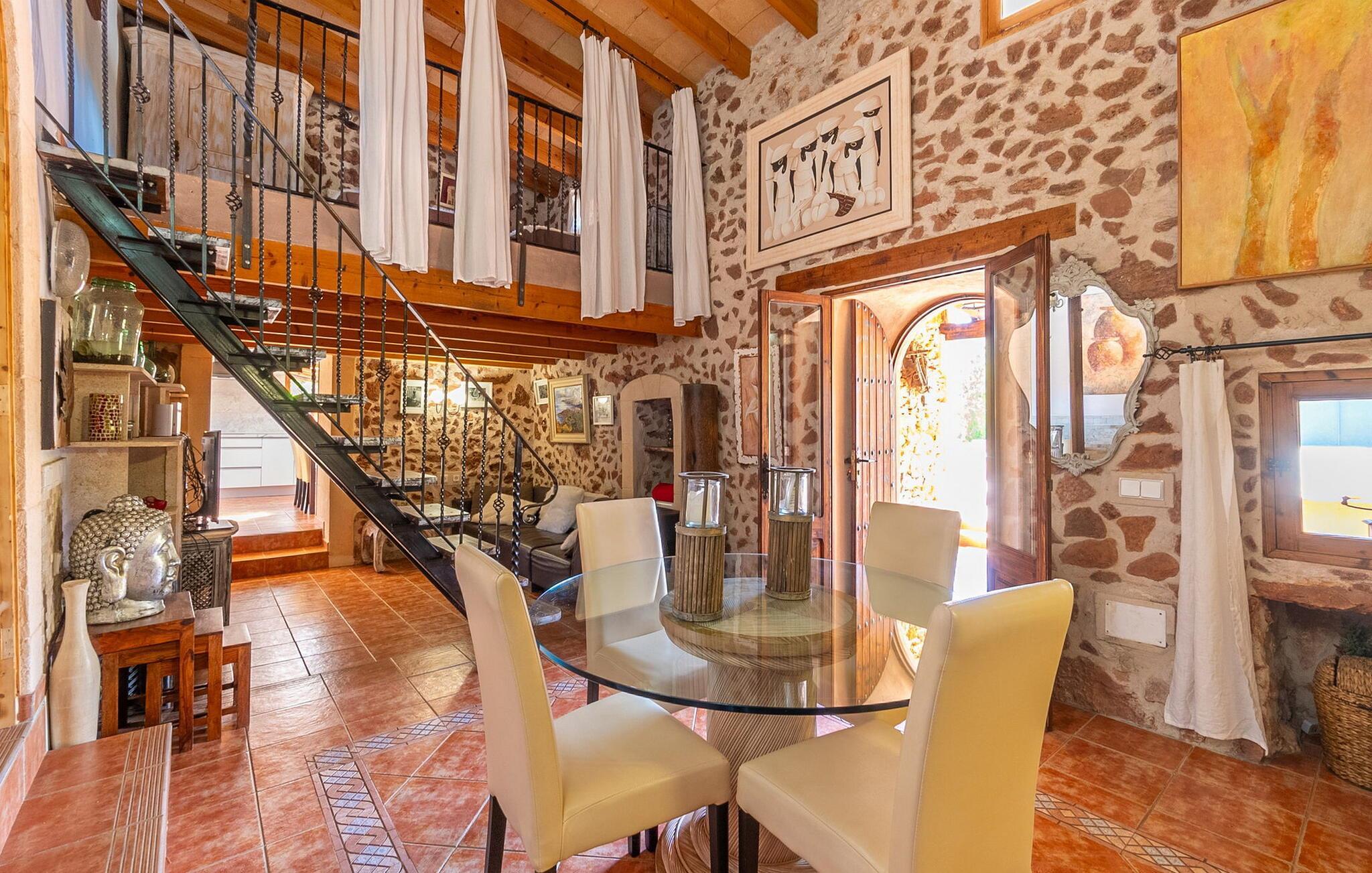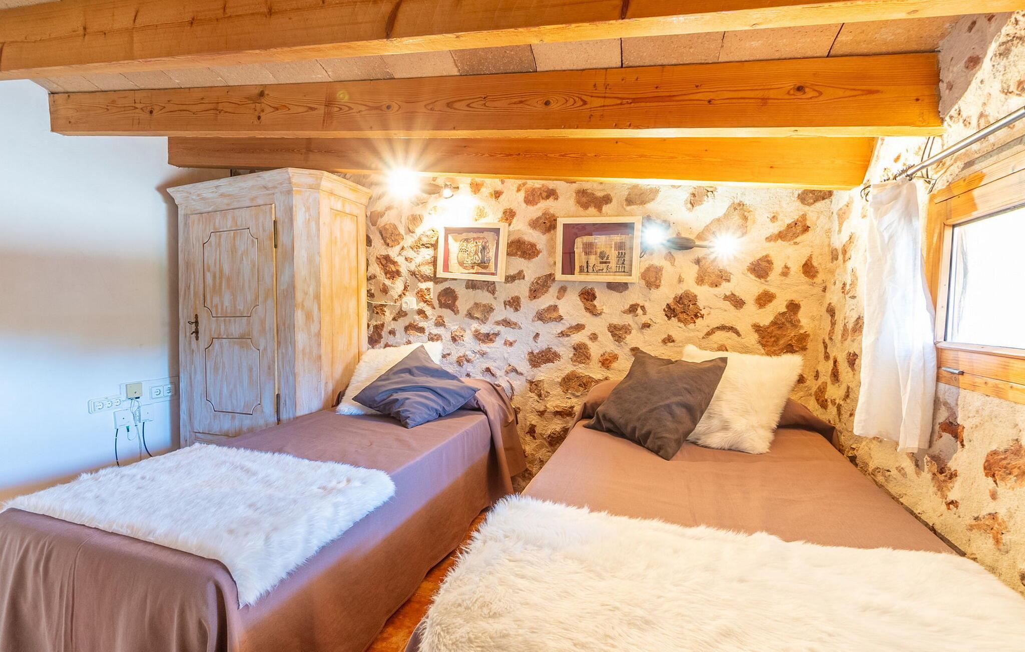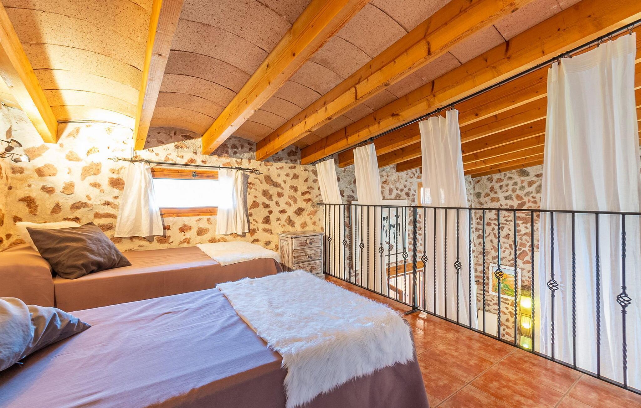Nun zum Inneren des Hauses: Wo soll man anfangen, wenn es so viel zu sehen gibt? Keine einfache Aufgabe. Wir empfehlen, alles langsam in Angriff zu nehmen und sich wirklich Zeit für die vielen Details zu nehmen. Absolut rustikale Natursteinwände bilden den Rahmen für alle Arten von Kunstwerken, Dekorationsstücken, Farben, Materialien und Formen. Viele der Unikate erzählen ihre eigene Geschichte und es lohnt sich, hier und da mal reinzuhören. Hier soll man sich wohlfühlen, entspannen, eine rundum erholsame Zeit verbringen! Sobald Sie das Haus betreten, präsentieren sich rechts und links zwei kleine Wohnbereiche in der offenen Architektur; eines mit Kamin, das andere mit großem Flachbildfernseher. Mehrere Sofas warten bereits auf Sie zum Faulenzen – eines davon kann auch als Schlafsofa (für ein bis zwei Personen) genutzt werden. Auf der linken Seite gibt es ein weiteres gemütliches Schlafzimmer und ein Badezimmer mit Dusche in einem atemberaubenden weiß-blauen Design. Die Küche befindet sich auf der rechten Seite. Es liegt zwei Stufen höher und versprüht typisch mallorquinisches Flair. Mit Ceranherd, Backofen, Kühl-/Gefrierkombination, Geschirrspüler, Mikrowelle, Wasserkocher und italienischer Kaffeemaschine ist eine gute Basis für unabhängige Selbstversorger gegeben. Am schönen Esstisch können Sie drinnen gemeinsam speisen. Auf dieser Etage befinden sich außerdem zwei gemütliche Schlafzimmer – ein Dreibett- und ein Zweibettzimmer – sowie drei weitere Badezimmer, eines davon en-suite. Mitten im Wohnzimmer führt eine Treppe nach oben, wo Sie eine Art Galerie finden, die mit zwei Einzelbetten ausgestattet ist. Weiße Materialien verleihen diesem Bereich eine romantische Atmosphäre. Genießen Sie wundervolle Nächte in Ruhe.