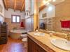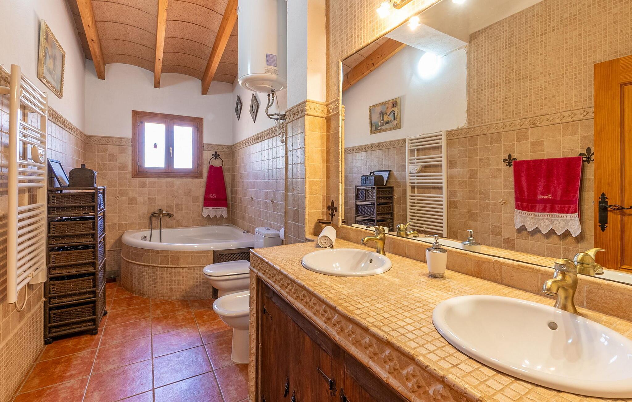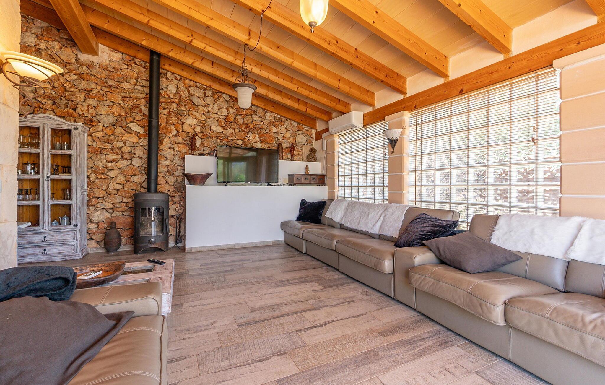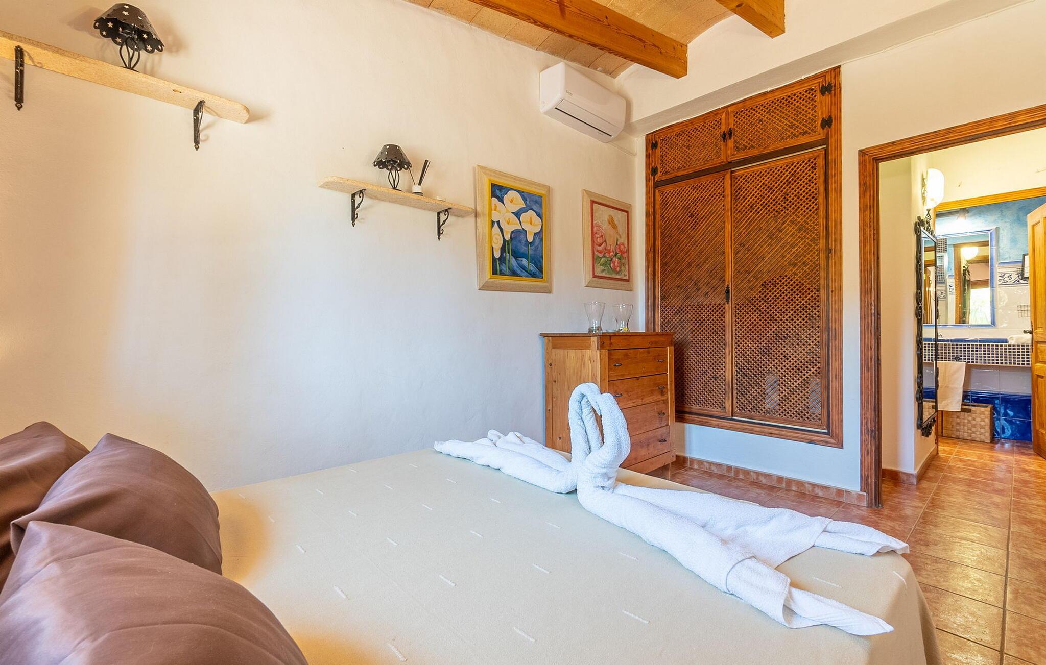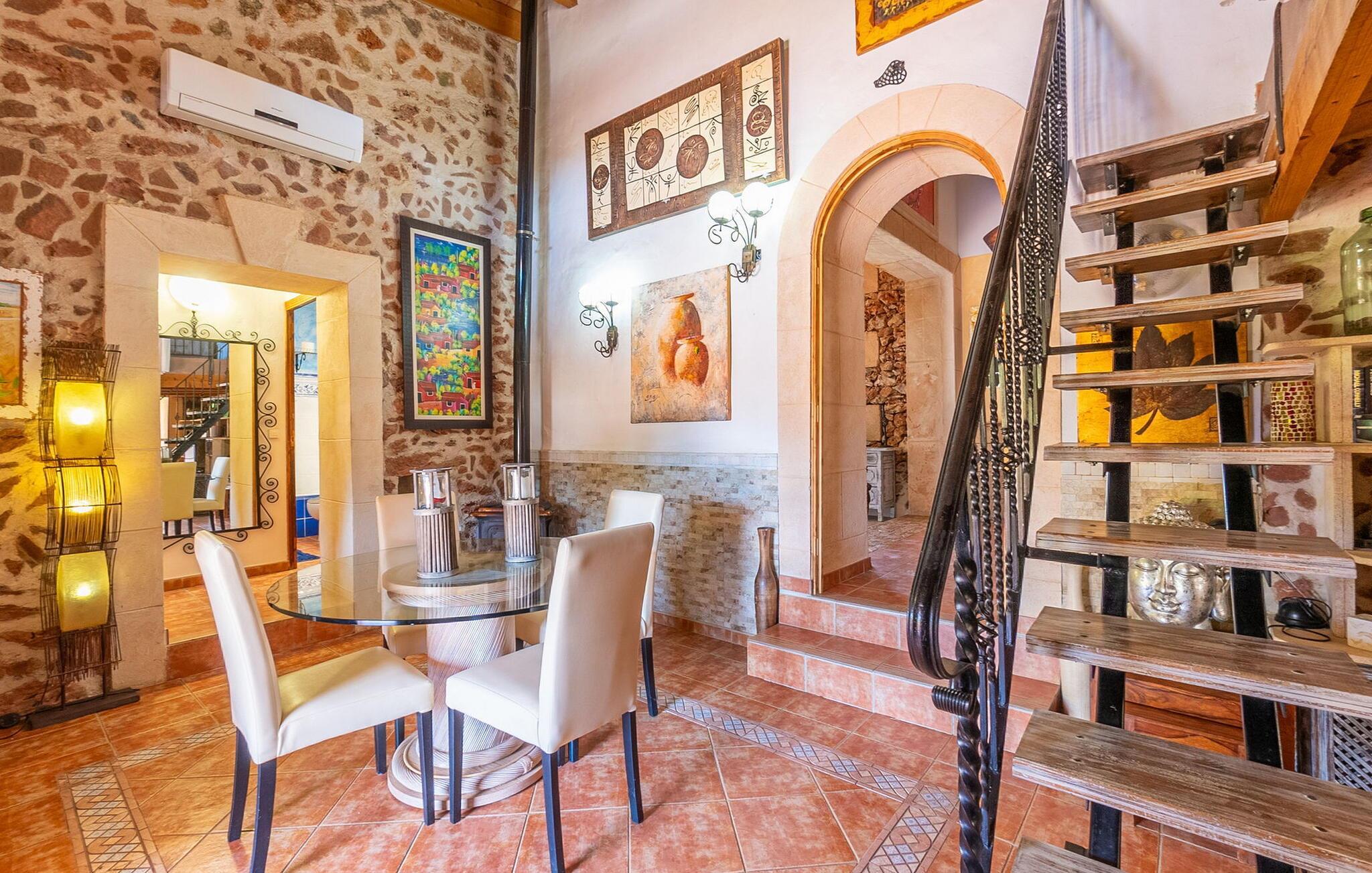 Nun zum Inneren des Hauses: Wo soll man anfangen, wenn es so viel zu sehen gibt? Keine einfache Aufgabe. Wir empfehlen, alles langsam in Angriff zu nehmen und sich wirklich Zeit für die vielen Details zu nehmen. Absolut rustikale Natursteinwände bilden den Rahmen für alle Arten von Kunstwerken, Dekorationsstücken, Farben, Materialien und Formen. Viele der Unikate erzählen ihre eigene Geschichte und es lohnt sich, hier und da mal reinzuhören. Hier soll man sich wohlfühlen, entspannen, eine rundum erholsame Zeit verbringen! Sobald Sie das Haus betreten, präsentieren sich rechts und links zwei kleine Wohnbereiche in der offenen Architektur; eines mit Kamin, das andere mit großem Flachbildfernseher. Mehrere Sofas warten bereits auf Sie zum Faulenzen – eines davon kann auch als Schlafsofa (für ein bis zwei Personen) genutzt werden. Auf der linken Seite gibt es ein weiteres gemütliches Schlafzimmer und ein Badezimmer mit Dusche in einem atemberaubenden weiß-blauen Design. Die Küche befindet sich auf der rechten Seite. Es liegt zwei Stufen höher und versprüht typisch mallorquinisches Flair. Mit Ceranherd, Backofen, Kühl-/Gefrierkombination, Geschirrspüler, Mikrowelle, Wasserkocher und italienischer Kaffeemaschine ist eine gute Basis für unabhängige Selbstversorger gegeben. Am schönen Esstisch können Sie drinnen gemeinsam speisen. Auf dieser Etage befinden sich außerdem zwei gemütliche Schlafzimmer – ein Dreibett- und ein Zweibettzimmer – sowie drei weitere Badezimmer, eines davon en-suite. Mitten im Wohnzimmer führt eine Treppe nach oben, wo Sie eine Art Galerie finden, die mit zwei Einzelbetten ausgestattet ist. Weiße Materialien verleihen diesem Bereich eine romantische Atmosphäre. Genießen Sie wundervolle Nächte in Ruhe.