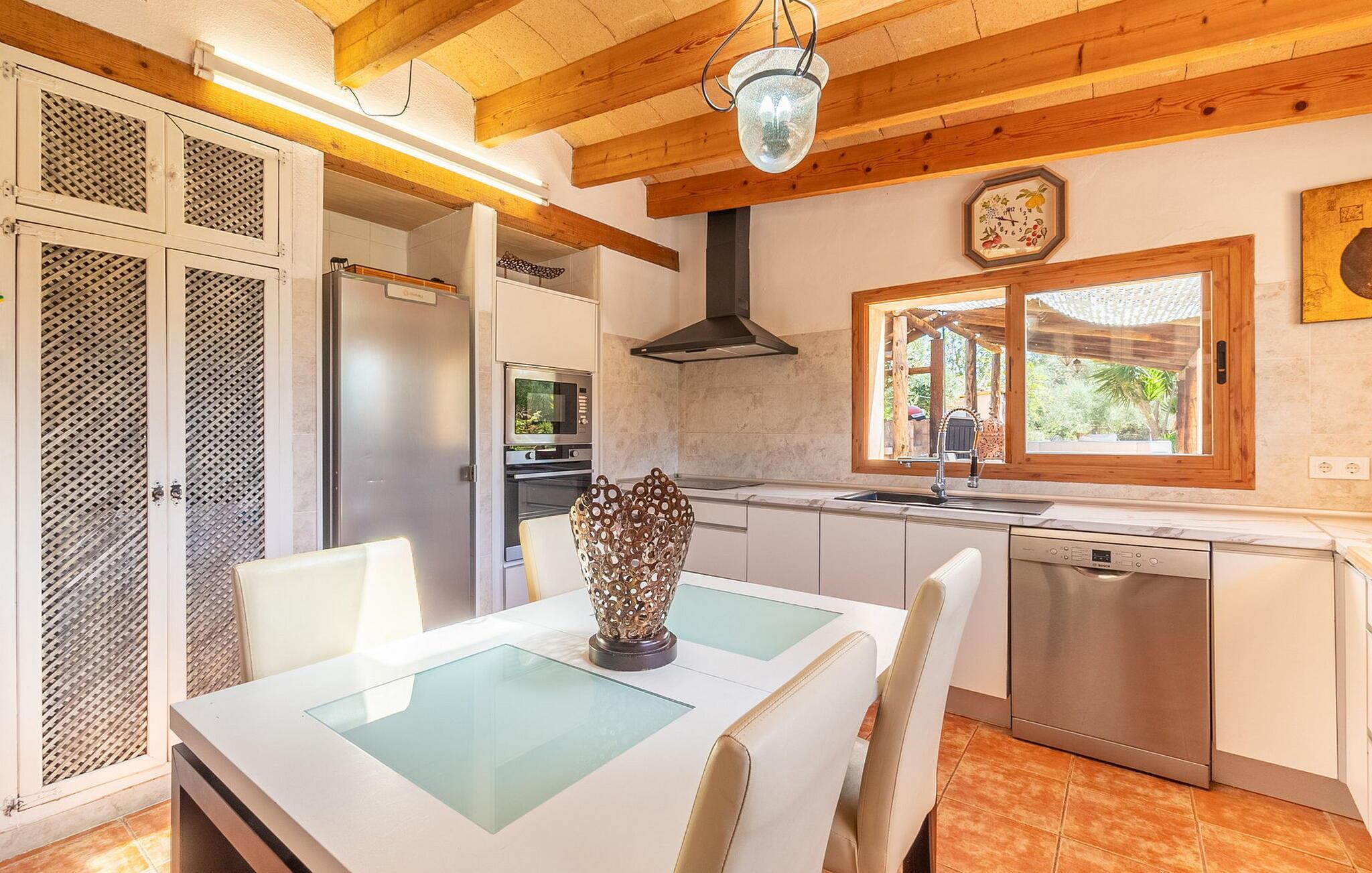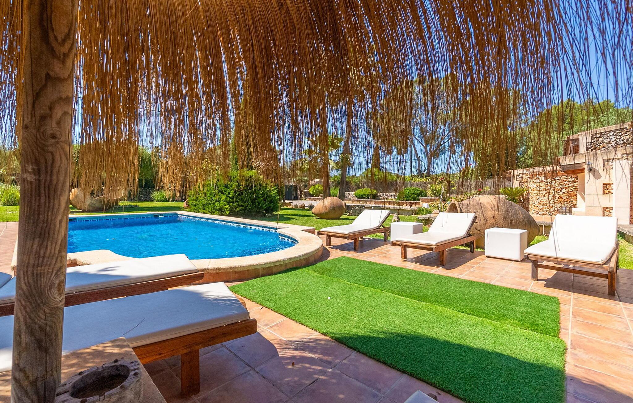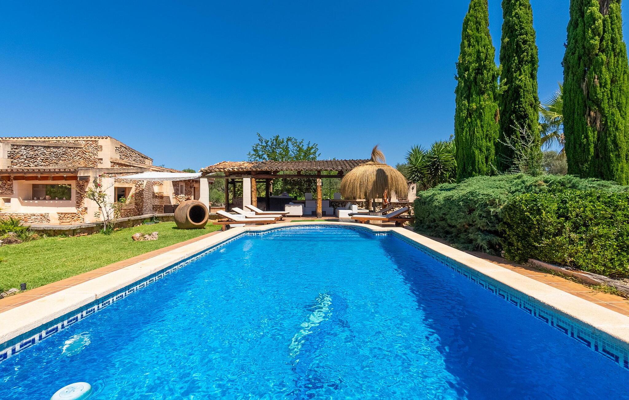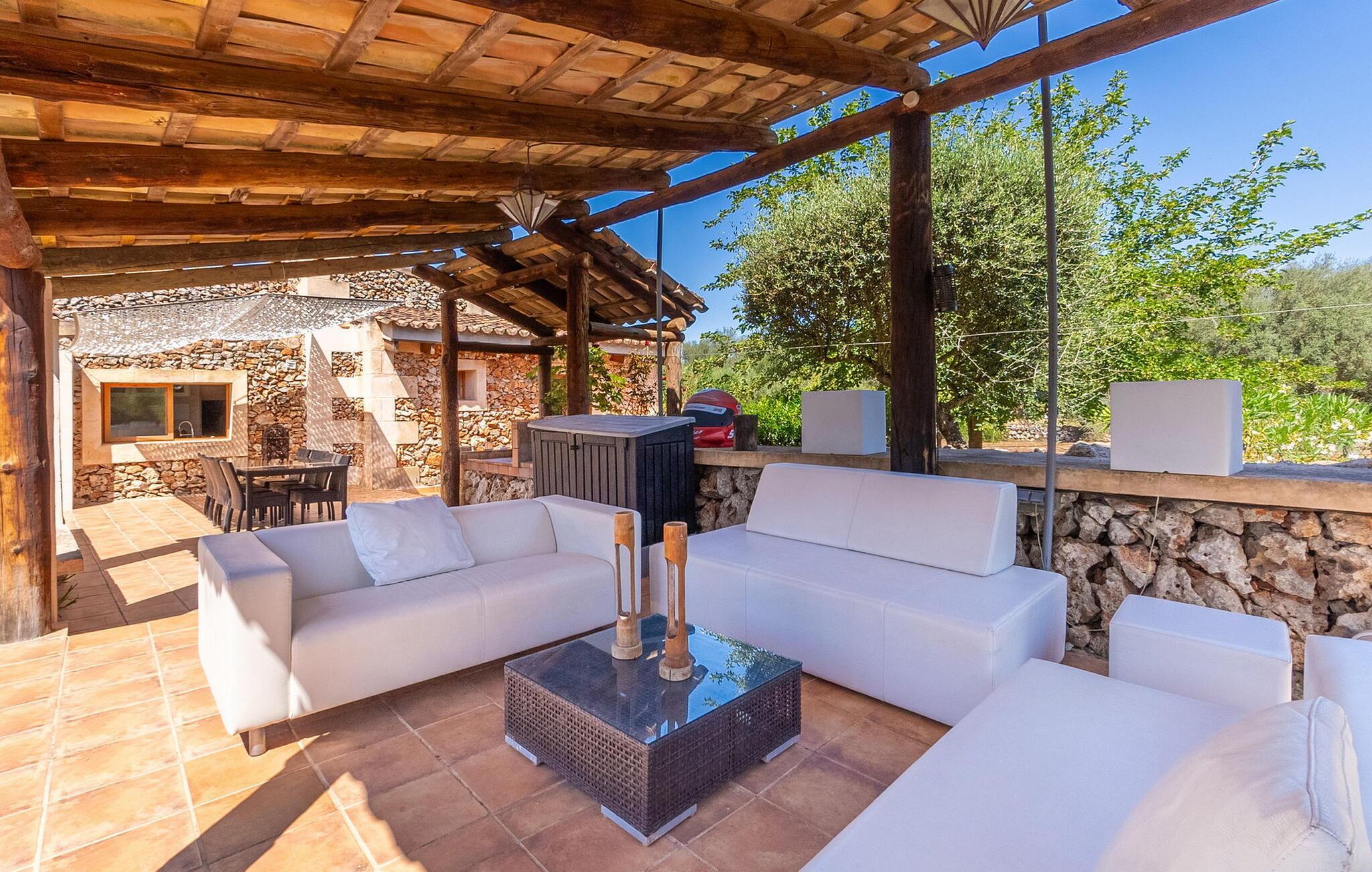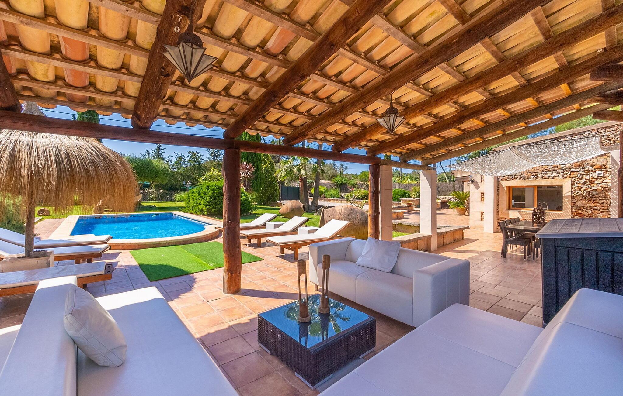 Sie haben ein Faible für schöne Gärten, möchten im Urlaub viel Zeit in Ihren eigenen Außenbereichen verbringen und freuen sich auf eine angenehme Idylle in einer herrlich ruhigen Umgebung? Dann sollten Sie zumindest einen zweiten Blick wagen! Auch wenn die Villa „Cas Mostaxet“ tatsächlich einige Highlights zu bieten hat – der Außenbereich ist sicherlich eine ihrer größten Stärken. Das Anwesen zeichnet sich durch grüne Rasenflächen, vielfältige mediterrane Blumen und Bäume sowie üppig drapierte Amphoren aus und bietet einen sehr schön dekorierten Empfang. Hier möchte man sofort einen kleinen Rundgang machen. Der Pool befindet sich rechts vom Haus. Der über eine römische Treppe erreichbare Pool ist flach und variiert in seiner Tiefe von 0,80 bis 1,90 m, sodass auch Kinder hier angenehm einsteigen können. Die teilweise mit Fliesen und teilweise mit Kunstrasen ausgelegte Umgebung lädt zum Entspannen unter der mallorquinischen Sonne ein. Direkt daneben befindet sich eine überdachte Terrasse, sodass Sie bequem zwischen den verschiedenen Standorten hin und her wechseln können. Ob auf der rustikalen Sitzbank oder am rustikalen Esstisch mit Bänken – hier finden Sie auf jeden Fall den perfekten Ort zum Entspannen und Genießen. Neben den bequemen Liegen am Pool gibt es auch attraktive (und überdachte) Sitzplätze direkt am Haus. Direkt am Gebäude befinden sich außerdem zwei Schattenplätze und weitere Begrünungsmöglichkeiten sowie ein weiteres Haus, das über einen eigenen Eingang und Garten verfügt und somit Ihre Privatsphäre nicht beeinträchtigt.